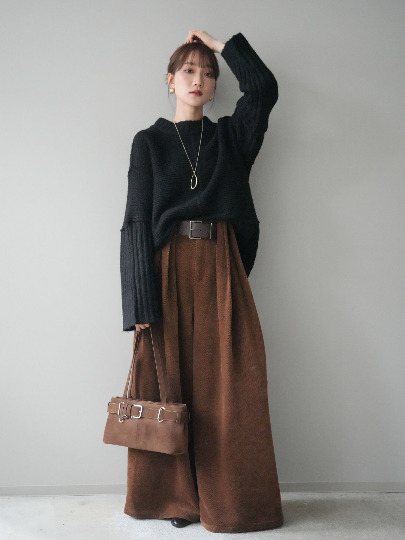 [SET]編み地切替ボトルネックニットプルオーバー+ベルトデザインループコールテンワイドパンツ(ベルト付き)(2set)