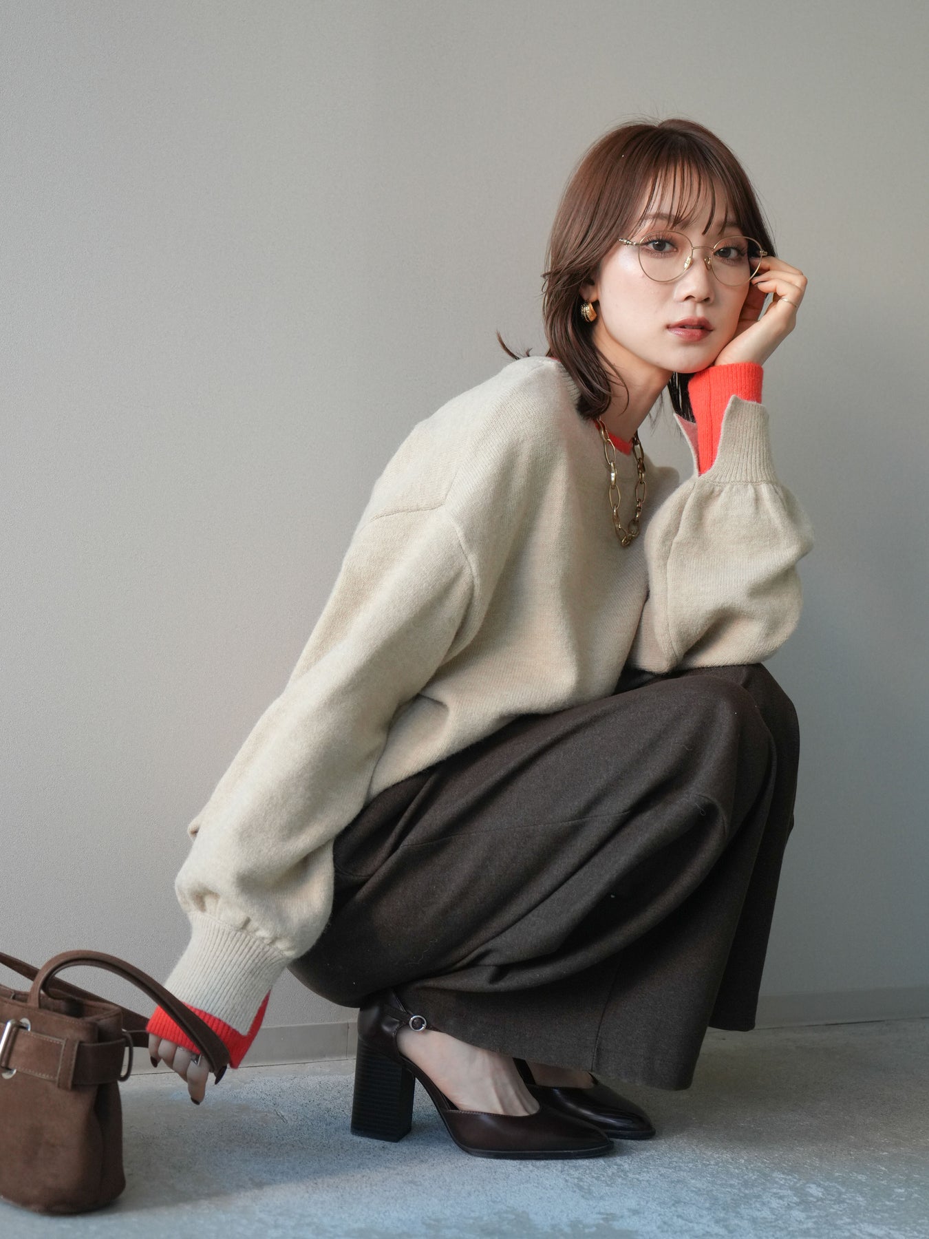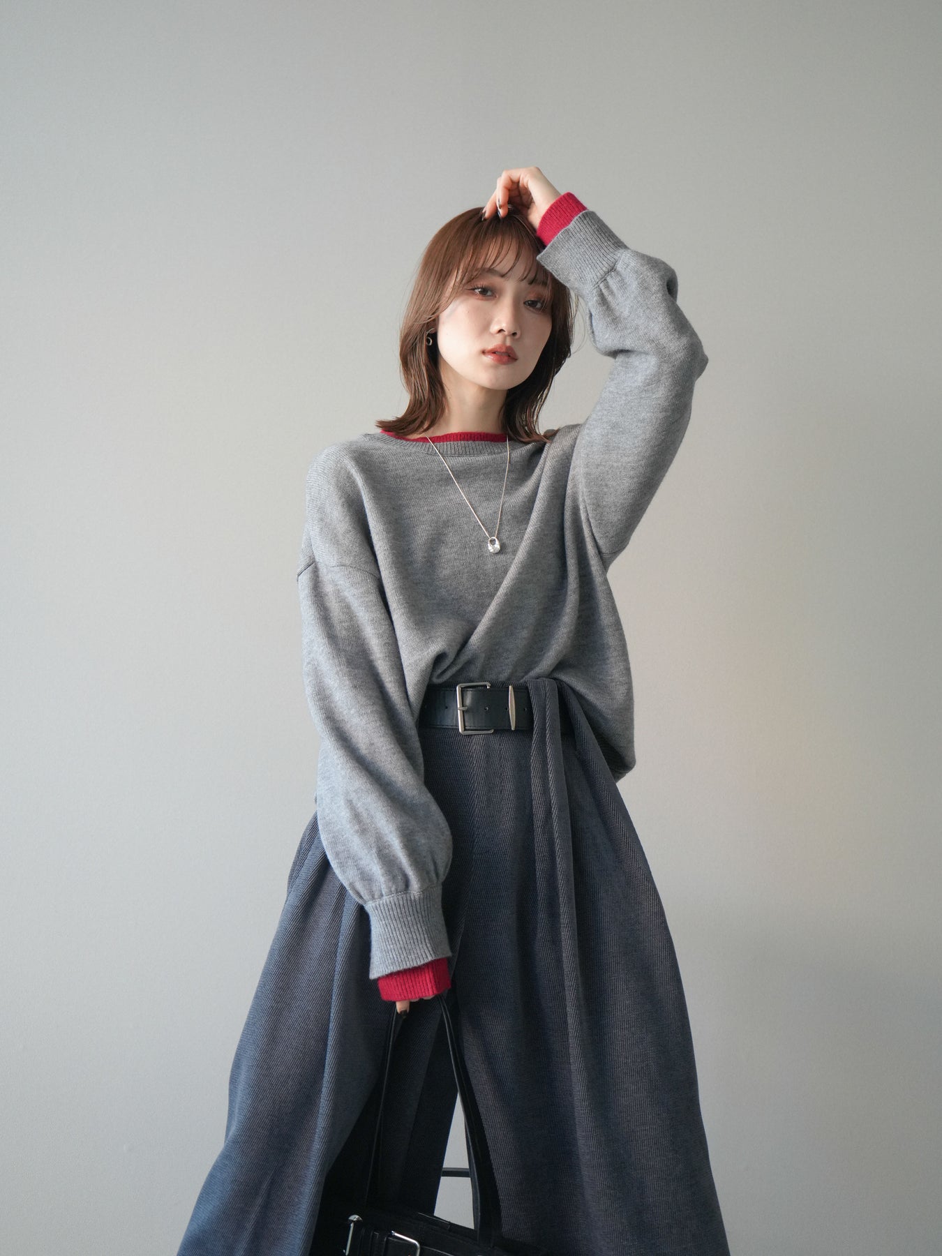 [SET]ヘンリーネック配色レイヤードニットプルオーバー+選べるアクセセット(2set)