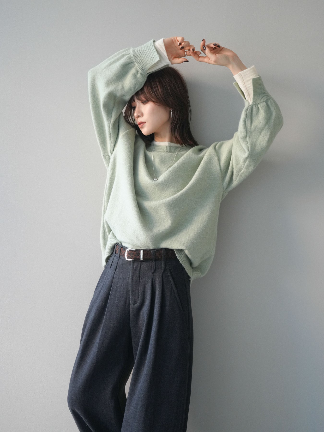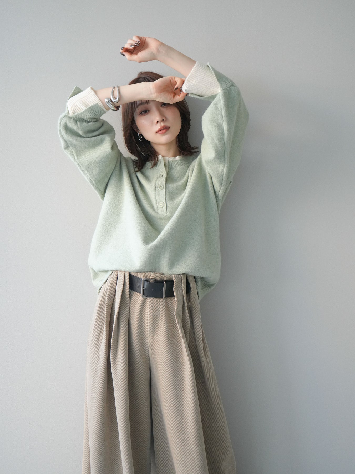 ヘンリーネックデザインのインナーを重ね着したように見える、配色レイヤード風のニットプルオーバー。首元と袖口からのぞく差し色がコーデ全体にリズムを与え、シンプルながらも抜け感のある着こなしを叶えます。ニットは柔らかな肌触りでゆったりとしたシルエットに仕上げ、デイリーに取り入れやすいリラクシーな着心地が魅力。パンツにもスカートにも合わせやすく、1枚でバランスよくスタイリングが決まる万能アイテムです。 ※ボトムス、キャミソール(インナー)以外の商品は一律でインナーは付属していません。