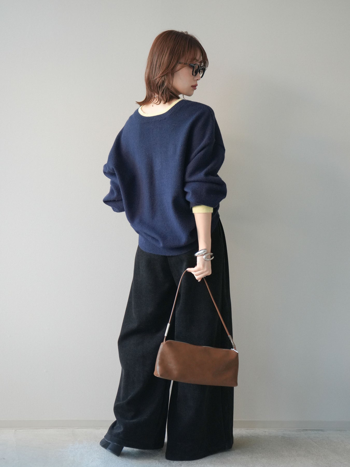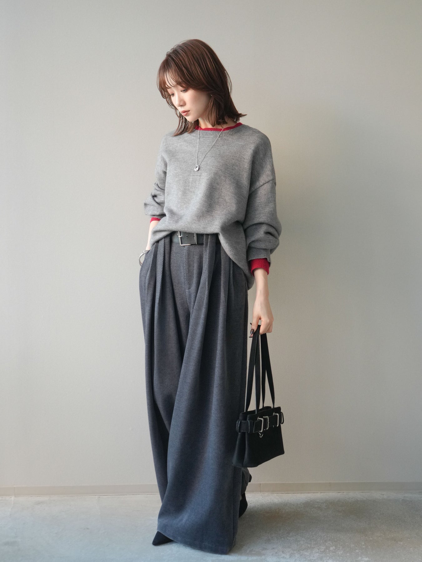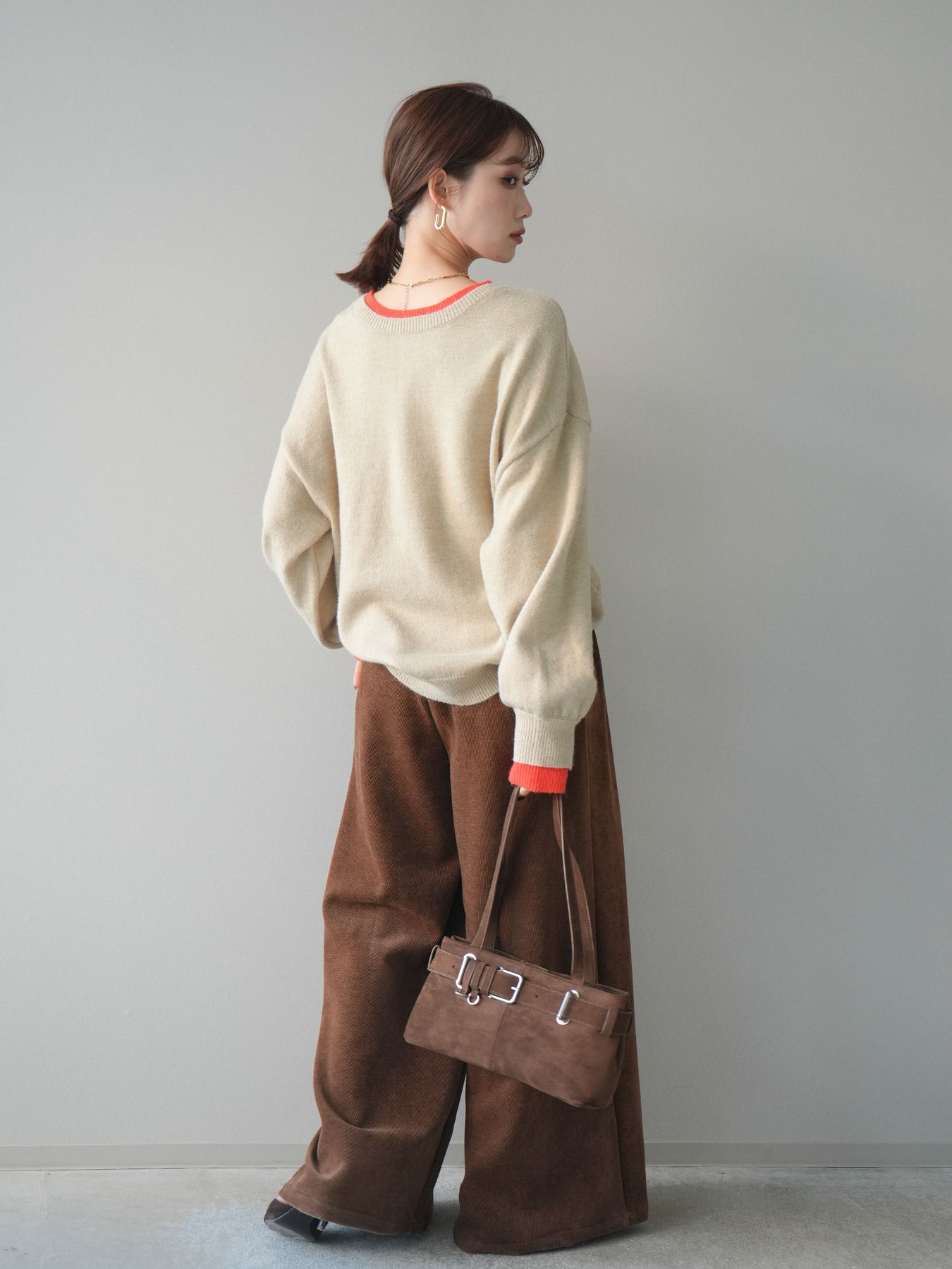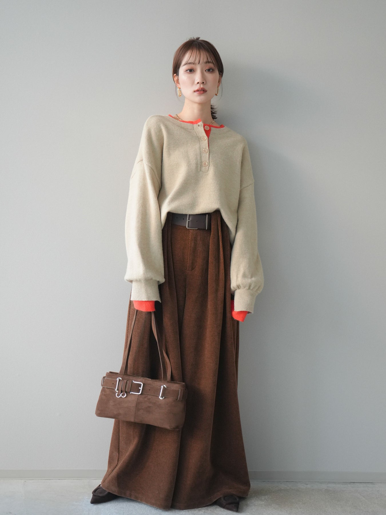 [SET]ヘンリーネック配色レイヤードニットプルオーバー+ベルトデザインループコールテンワイドパンツ(ベルト付き)(2set)