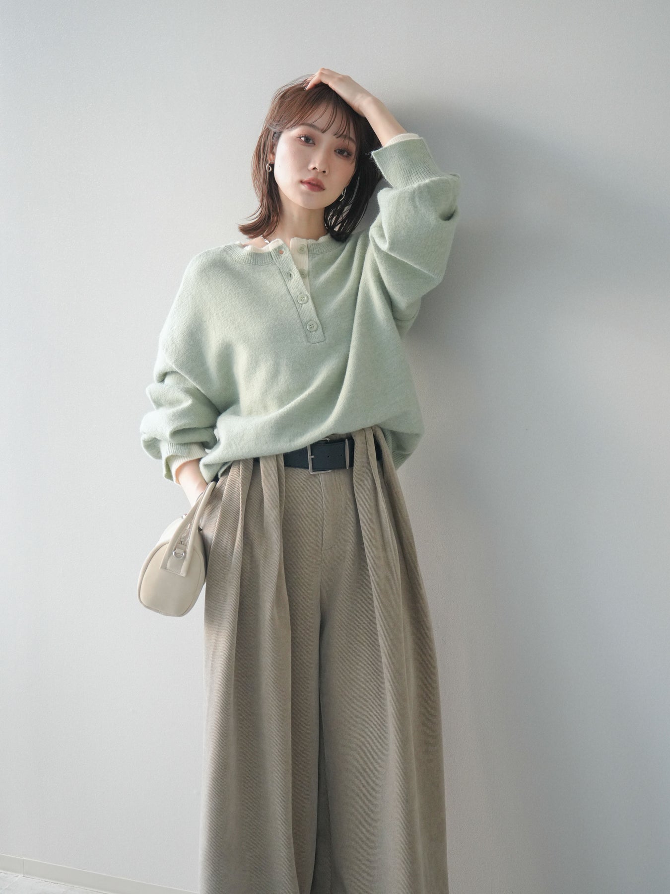 ヘンリーネックデザインのインナーを重ね着したように見える、配色レイヤード風のニットプルオーバー。首元と袖口からのぞく差し色がコーデ全体にリズムを与え、シンプルながらも抜け感のある着こなしを叶えます。ニットは柔らかな肌触りでゆったりとしたシルエットに仕上げ、デイリーに取り入れやすいリラクシーな着心地が魅力。パンツにもスカートにも合わせやすく、1枚でバランスよくスタイリングが決まる万能アイテムです。 ※ボトムス、キャミソール(インナー)以外の商品は一律でインナーは付属していません。