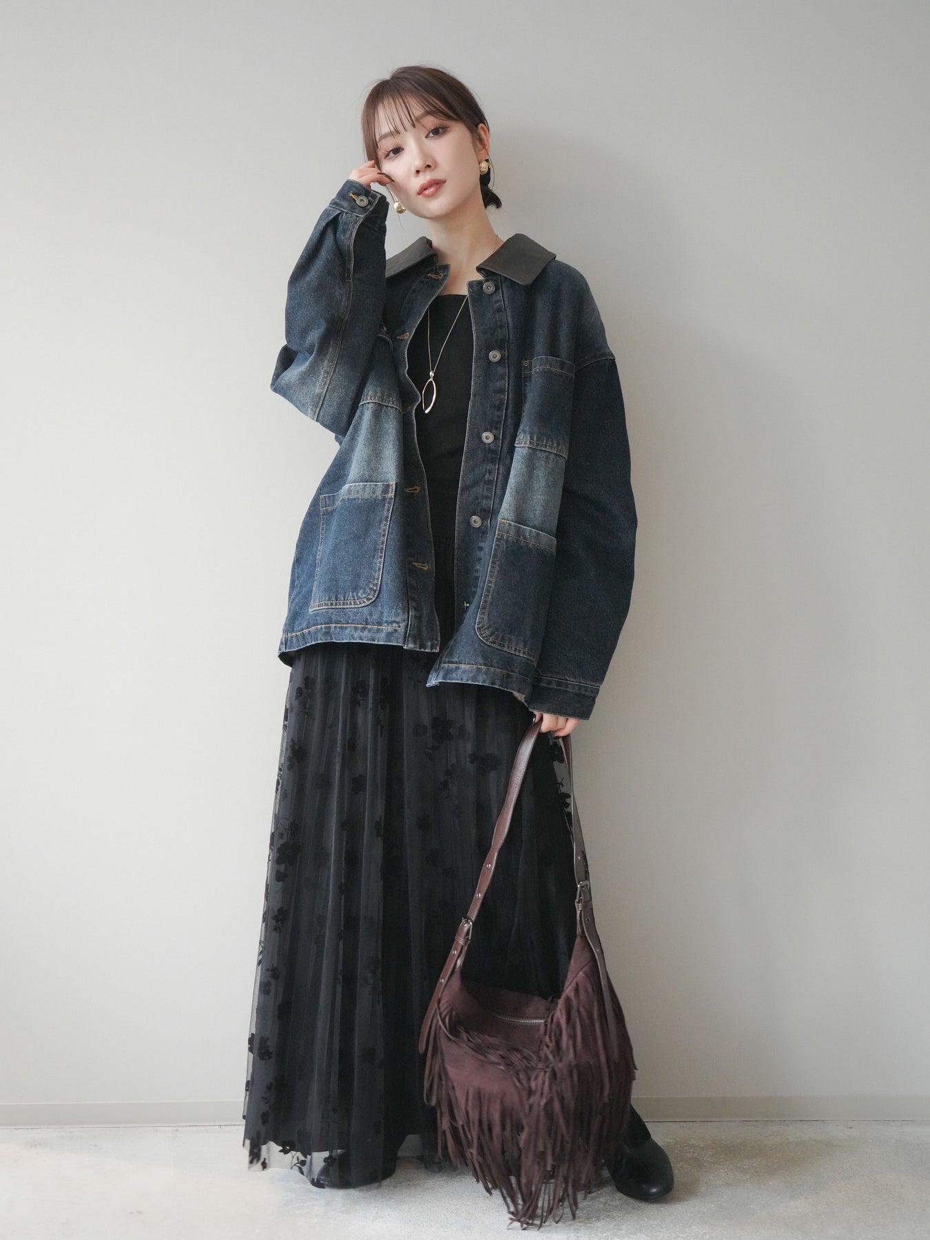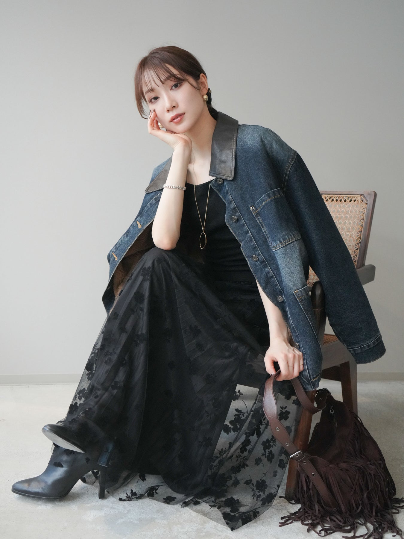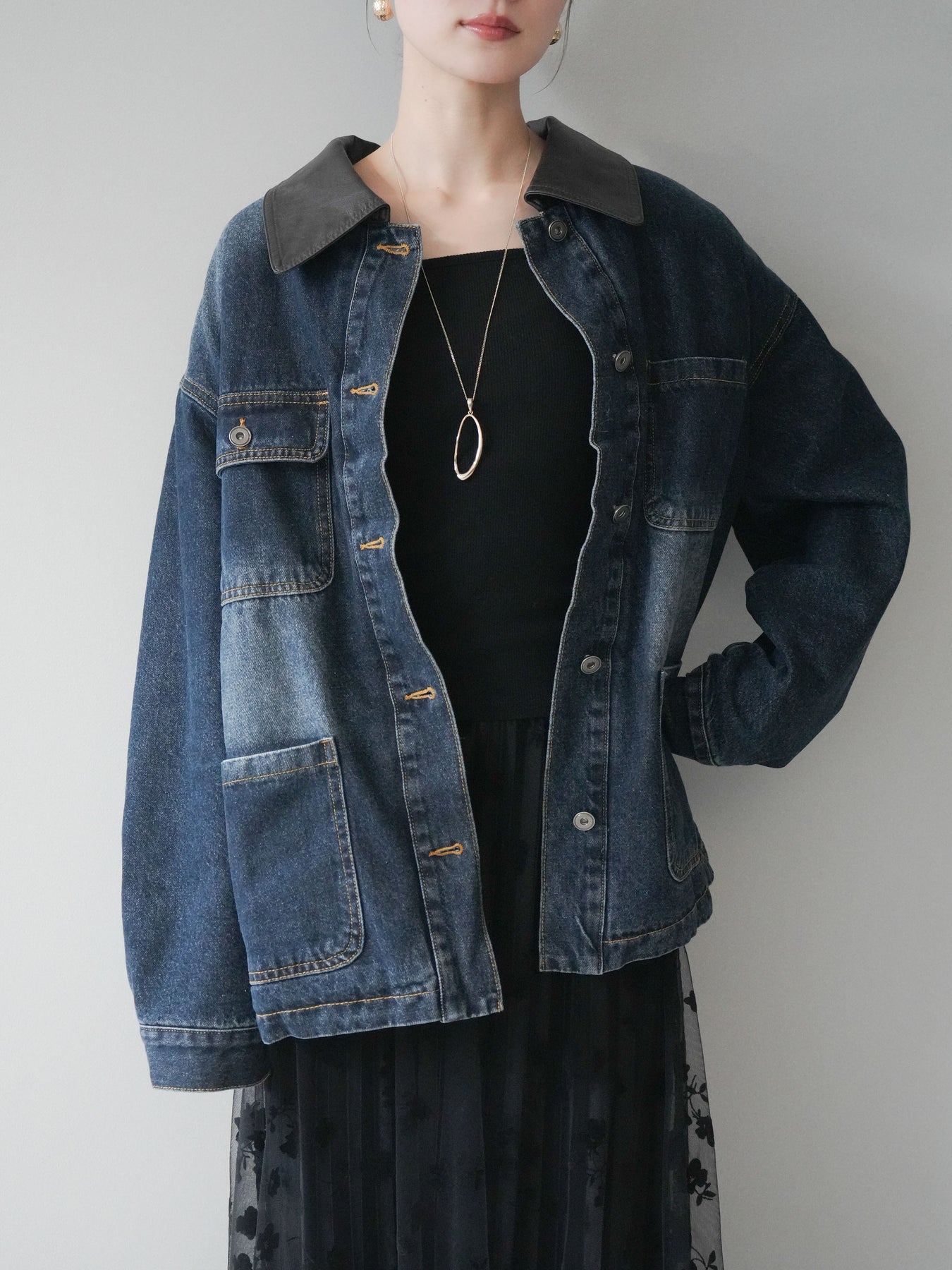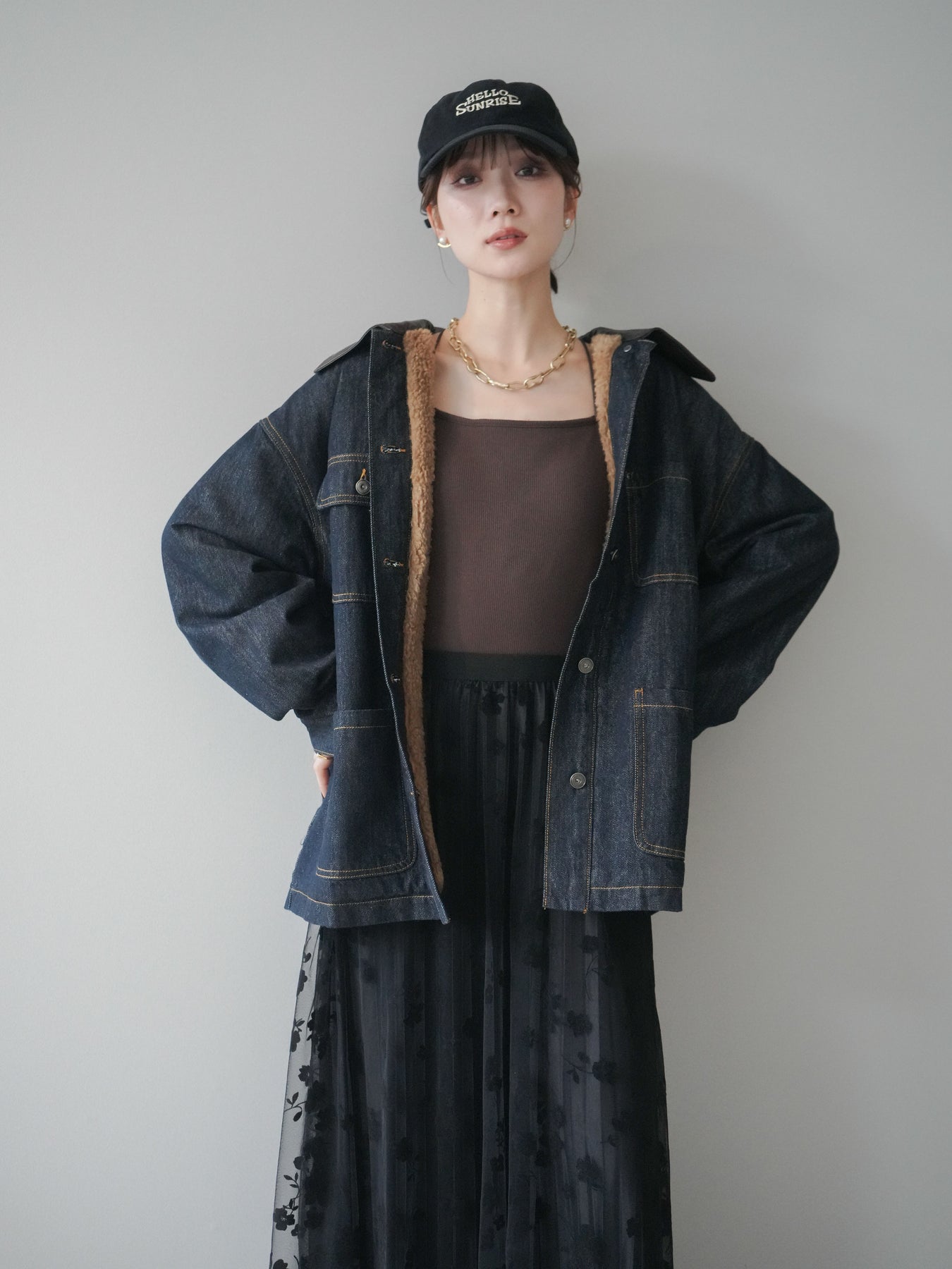 ヴィンテージライクなデニム素材を使用し、裏地にふわふわのファーを仕込んだフライトジャケット。外側はカジュアルなデニム、内側は暖かなファーの贅沢な組み合わせで、見た目以上の防寒性を発揮します。大きめの襟やポケットがアクセントになり、どこかレトロな雰囲気を漂わせつつも、トレンド感のあるシルエットに仕上げています。ゆとりのあるサイズ感でニットの上からも羽織りやすく、冬のデイリーコーデに頼れる一枚です。 ※ボトムス、キャミソール(インナー)以外の商品は一律でインナーは付属していません。
