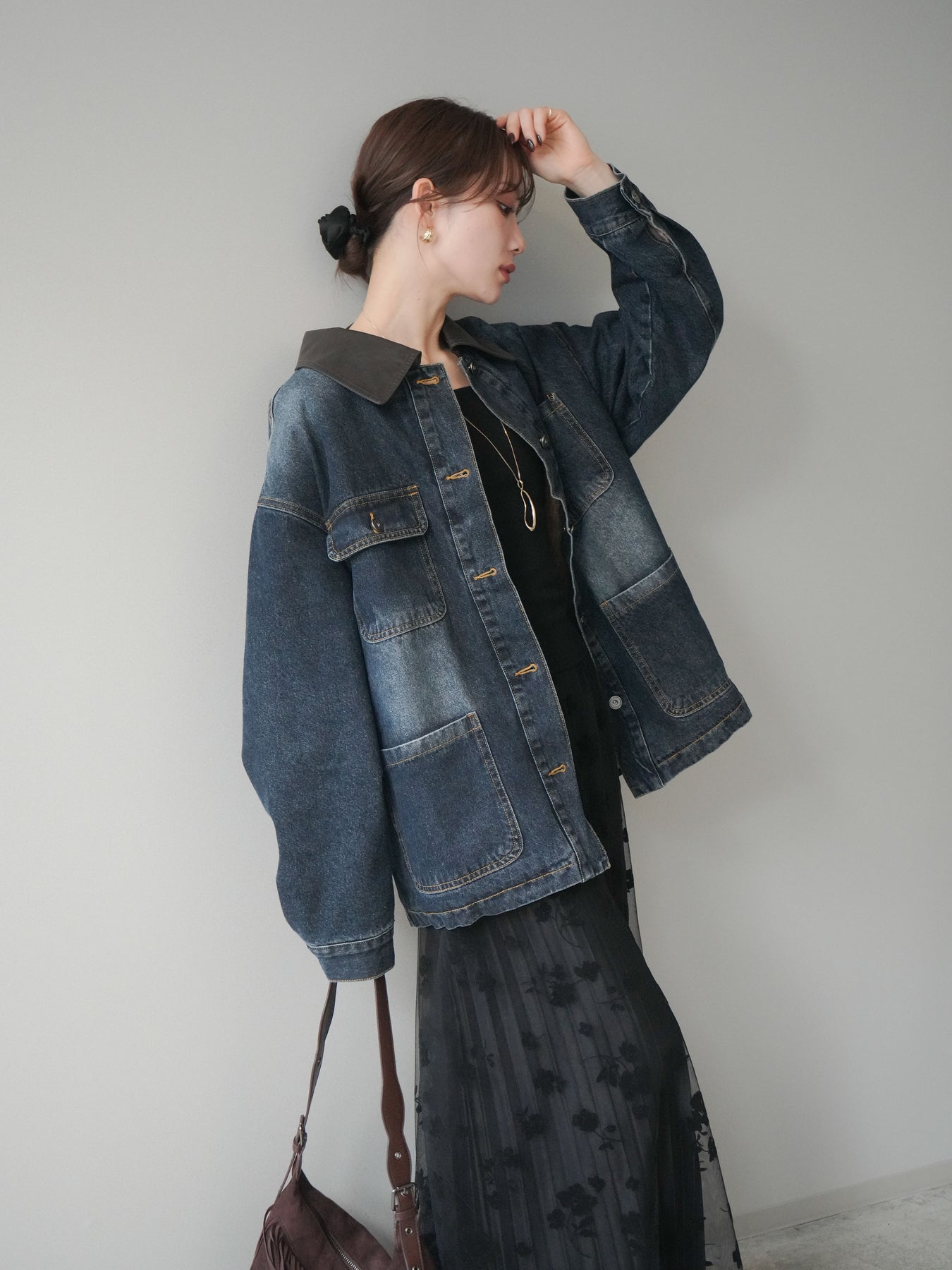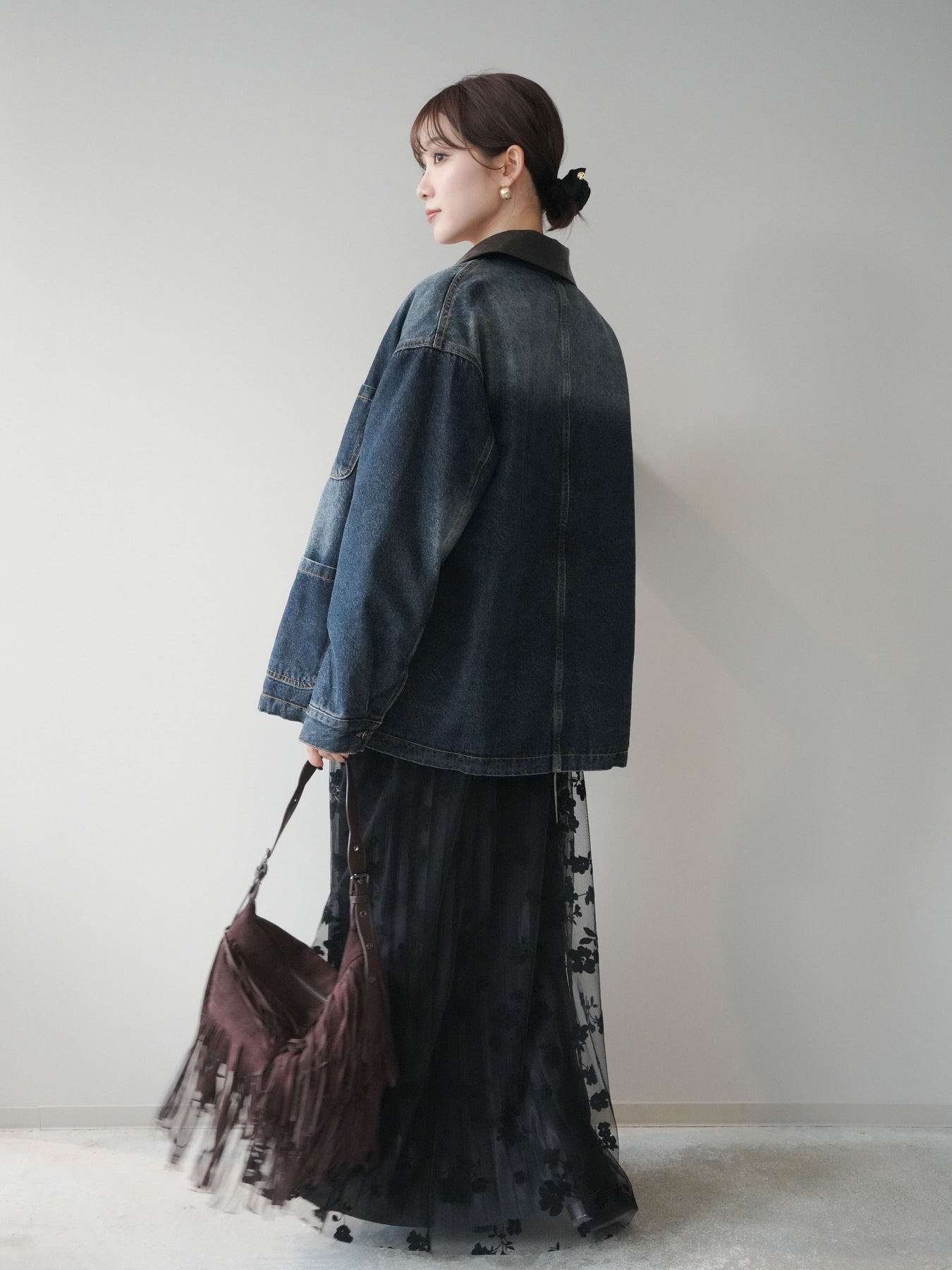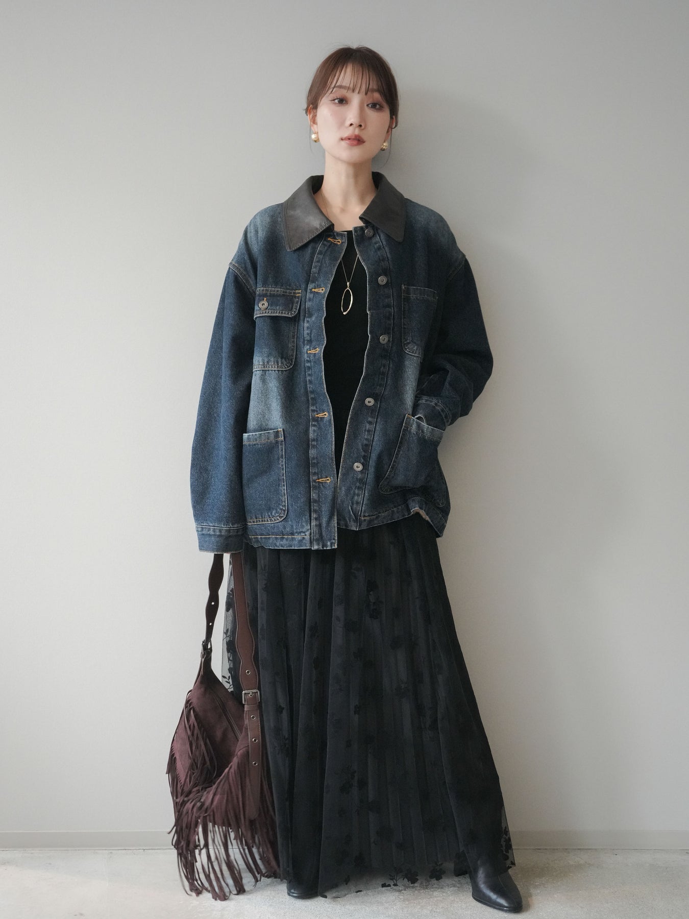 ヴィンテージライクなデニム素材を使用し、裏地にふわふわのファーを仕込んだフライトジャケット。外側はカジュアルなデニム、内側は暖かなファーの贅沢な組み合わせで、見た目以上の防寒性を発揮します。大きめの襟やポケットがアクセントになり、どこかレトロな雰囲気を漂わせつつも、トレンド感のあるシルエットに仕上げています。ゆとりのあるサイズ感でニットの上からも羽織りやすく、冬のデイリーコーデに頼れる一枚です。 ※ボトムス、キャミソール(インナー)以外の商品は一律でインナーは付属していません。