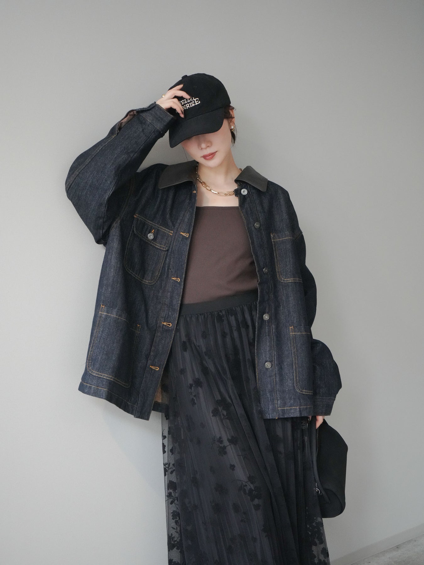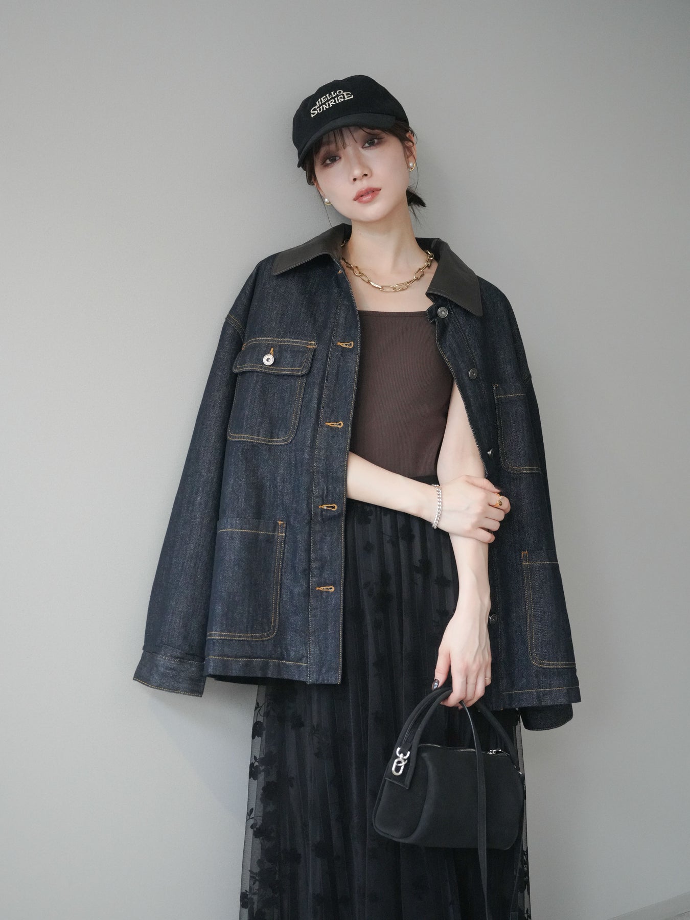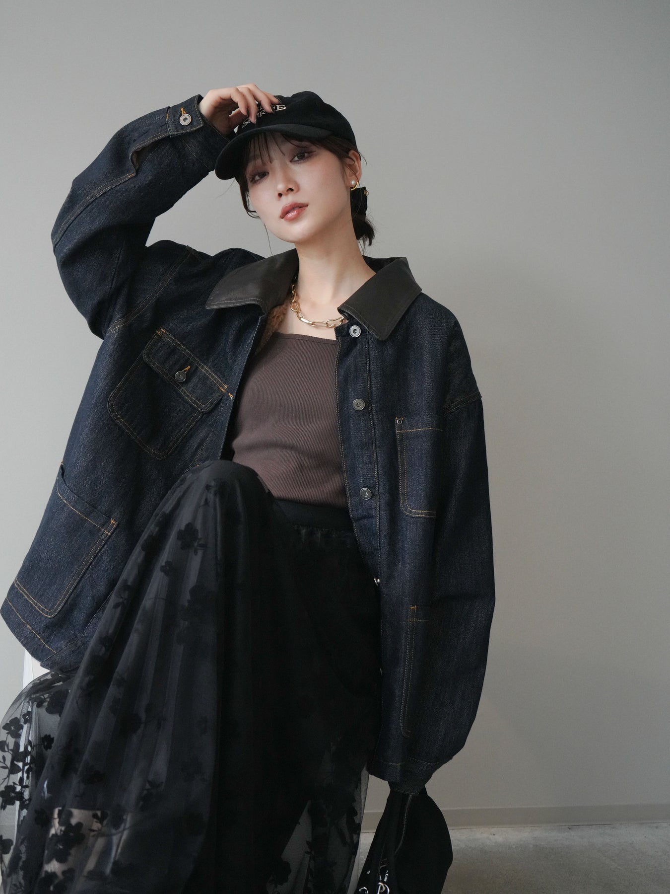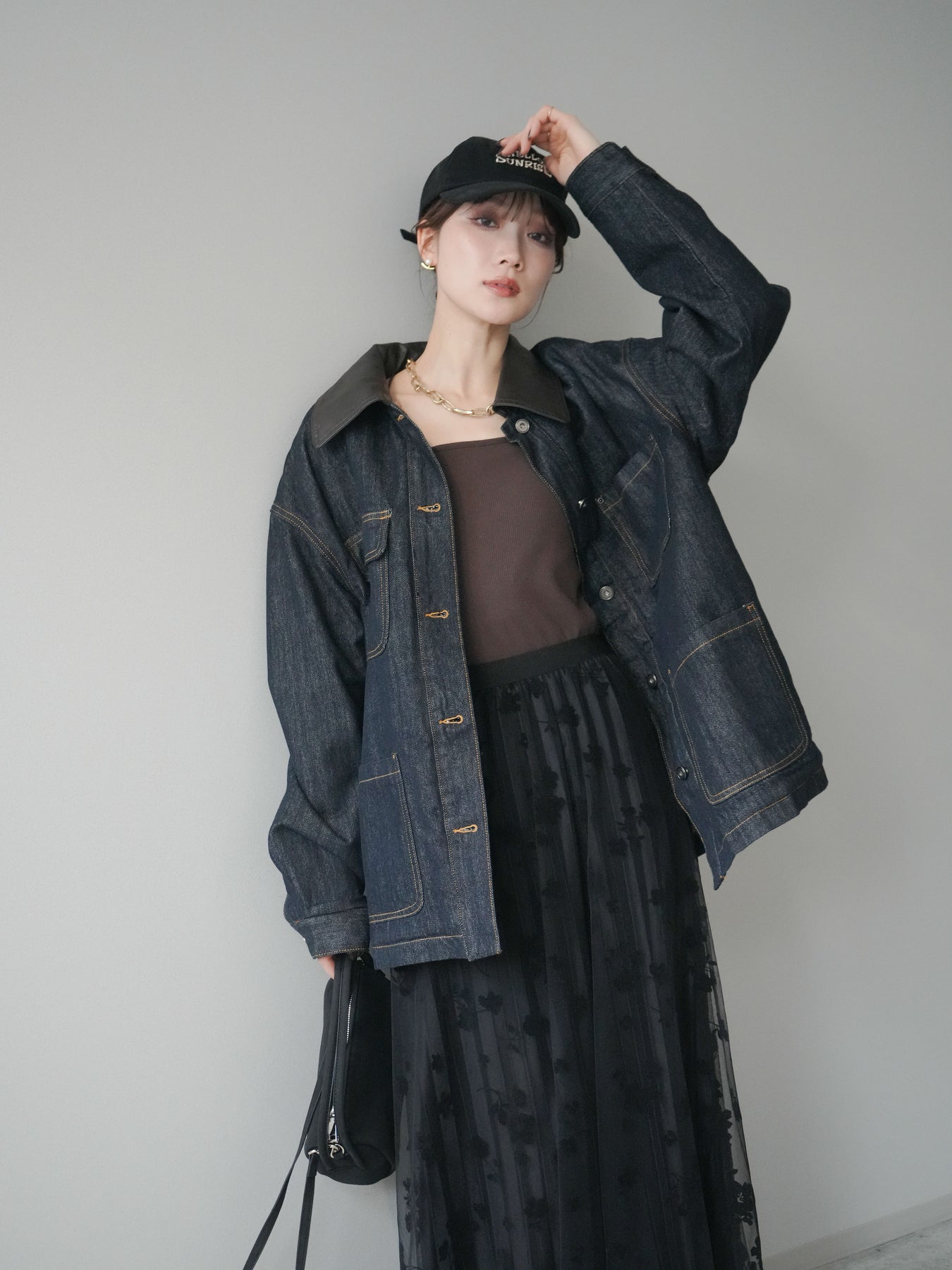 ヴィンテージライクなデニム素材を使用し、裏地にふわふわのファーを仕込んだフライトジャケット。外側はカジュアルなデニム、内側は暖かなファーの贅沢な組み合わせで、見た目以上の防寒性を発揮します。大きめの襟やポケットがアクセントになり、どこかレトロな雰囲気を漂わせつつも、トレンド感のあるシルエットに仕上げています。ゆとりのあるサイズ感でニットの上からも羽織りやすく、冬のデイリーコーデに頼れる一枚です。 ※ボトムス、キャミソール(インナー)以外の商品は一律でインナーは付属していません。