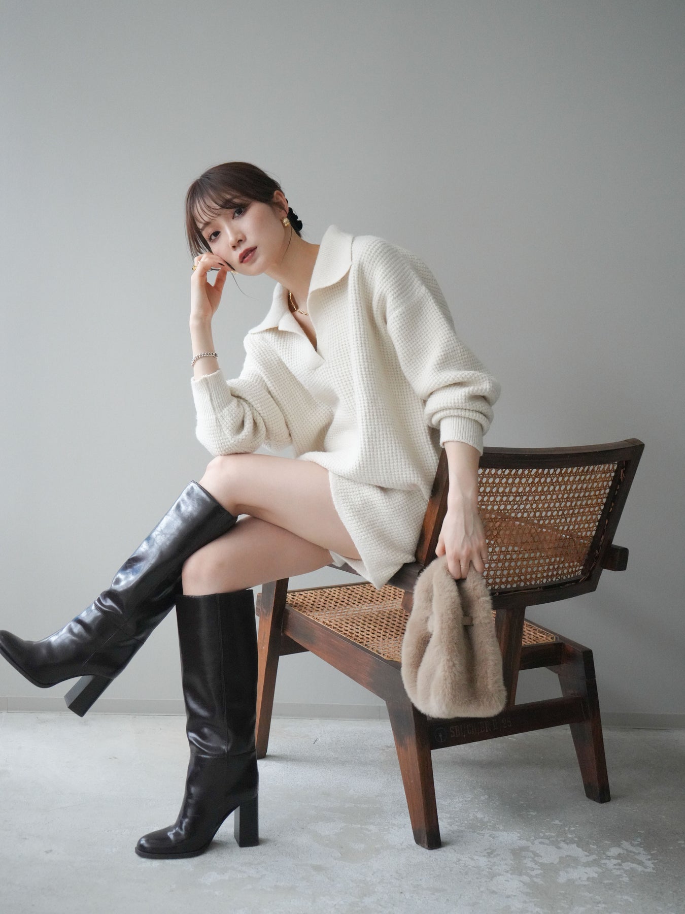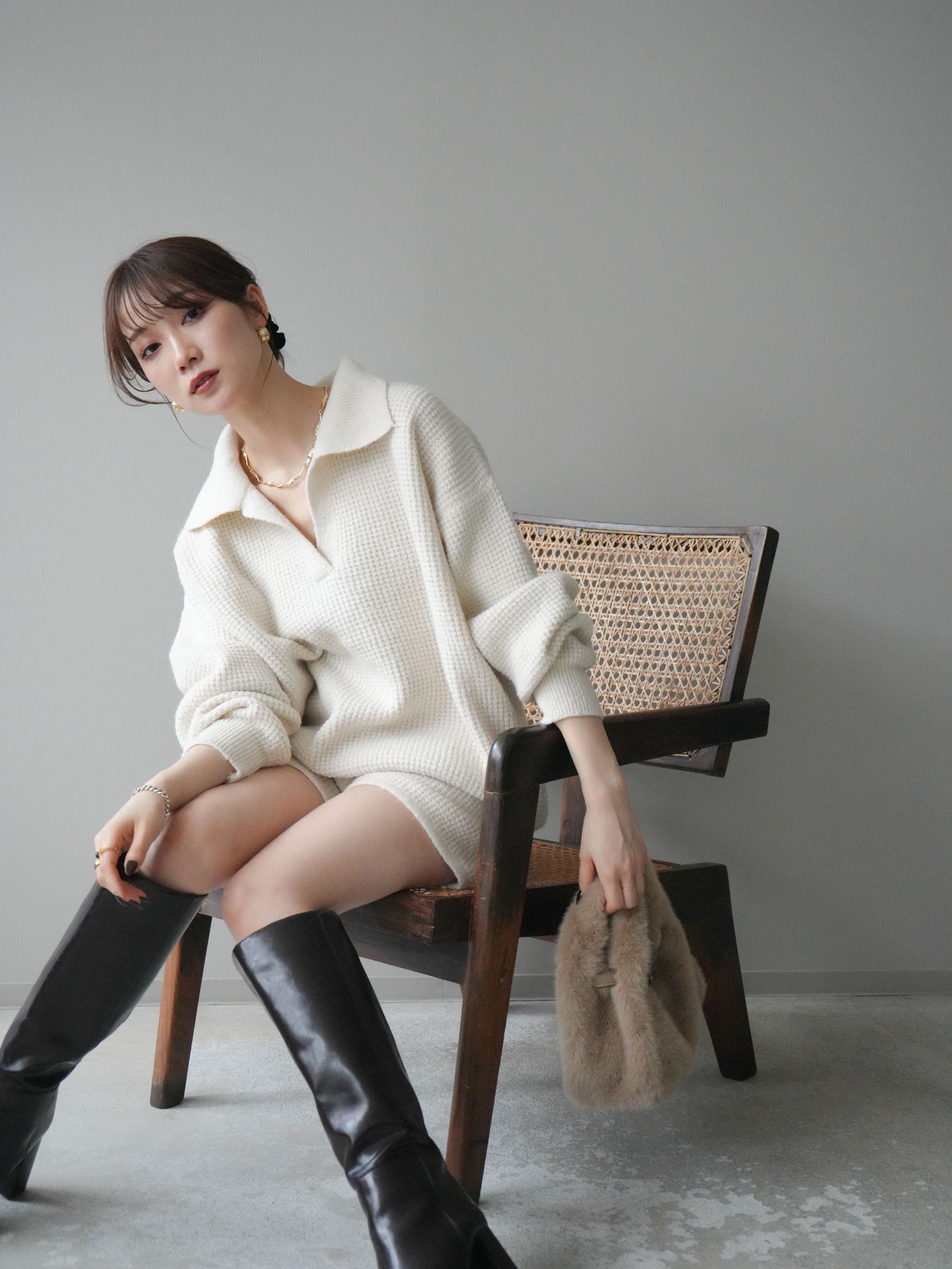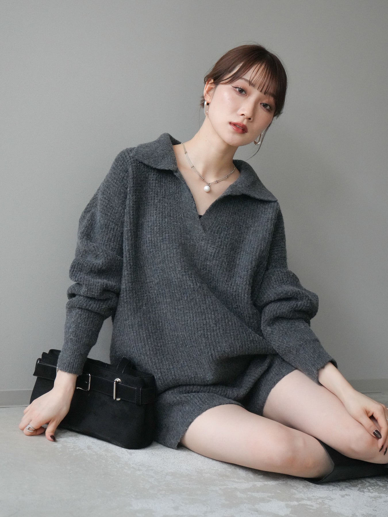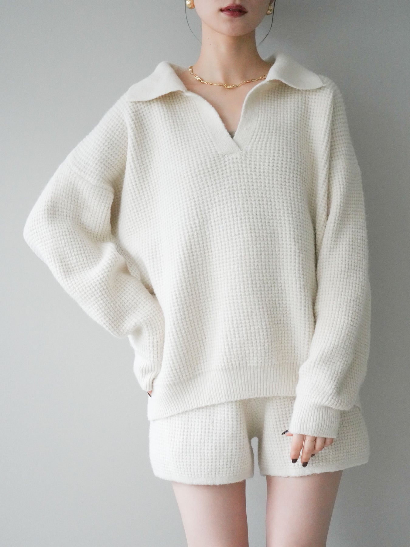 柔らかなニット素材で仕立てた、ポロニットプルオーバーとショートパンツのセットアイテム。ざっくりとした風合いとゆったりとしたシルエットがリラックス感を生み、抜け感のある大人カジュアルを楽しめます。トップスは深めのVネック×ポロカラーがこなれた印象を与え、ショートパンツはウエスト周りをすっきり見せながらも動きやすいデザインに。セット使いはもちろん、単品でも着回し力が高く、スタイリングの幅が広がる万能セットです。 ※ボトムス、キャミソール(インナー)以外の商品は一律でインナーは付属していません。