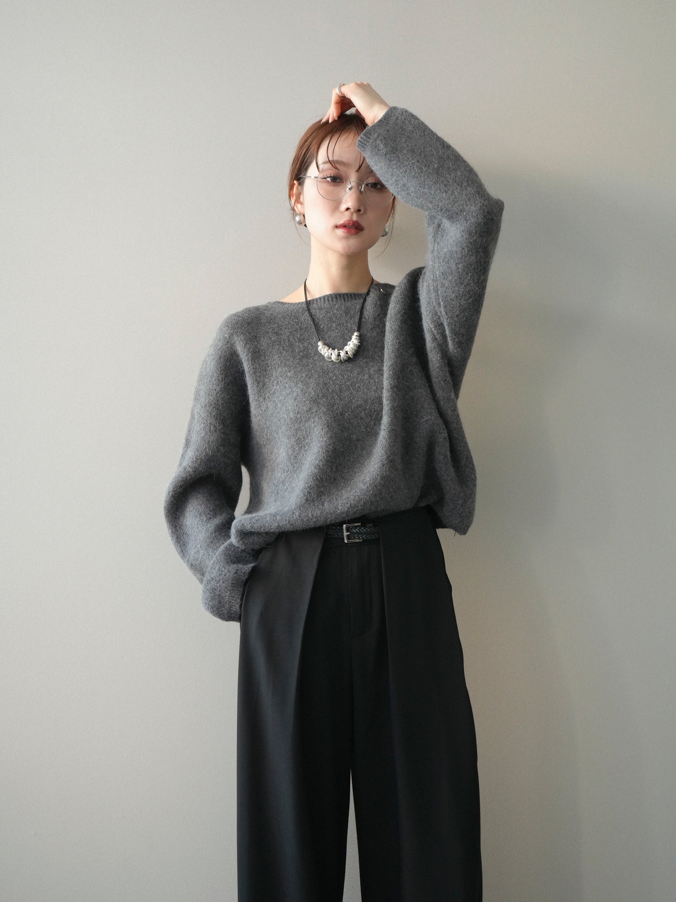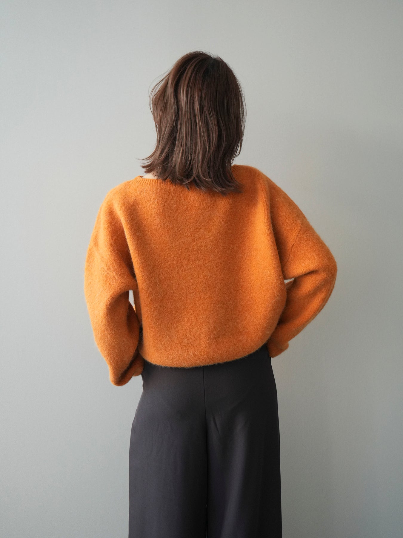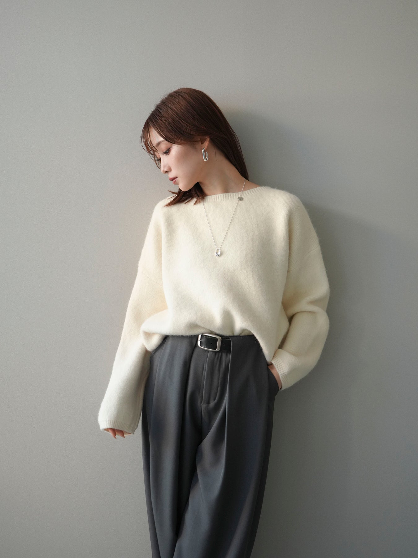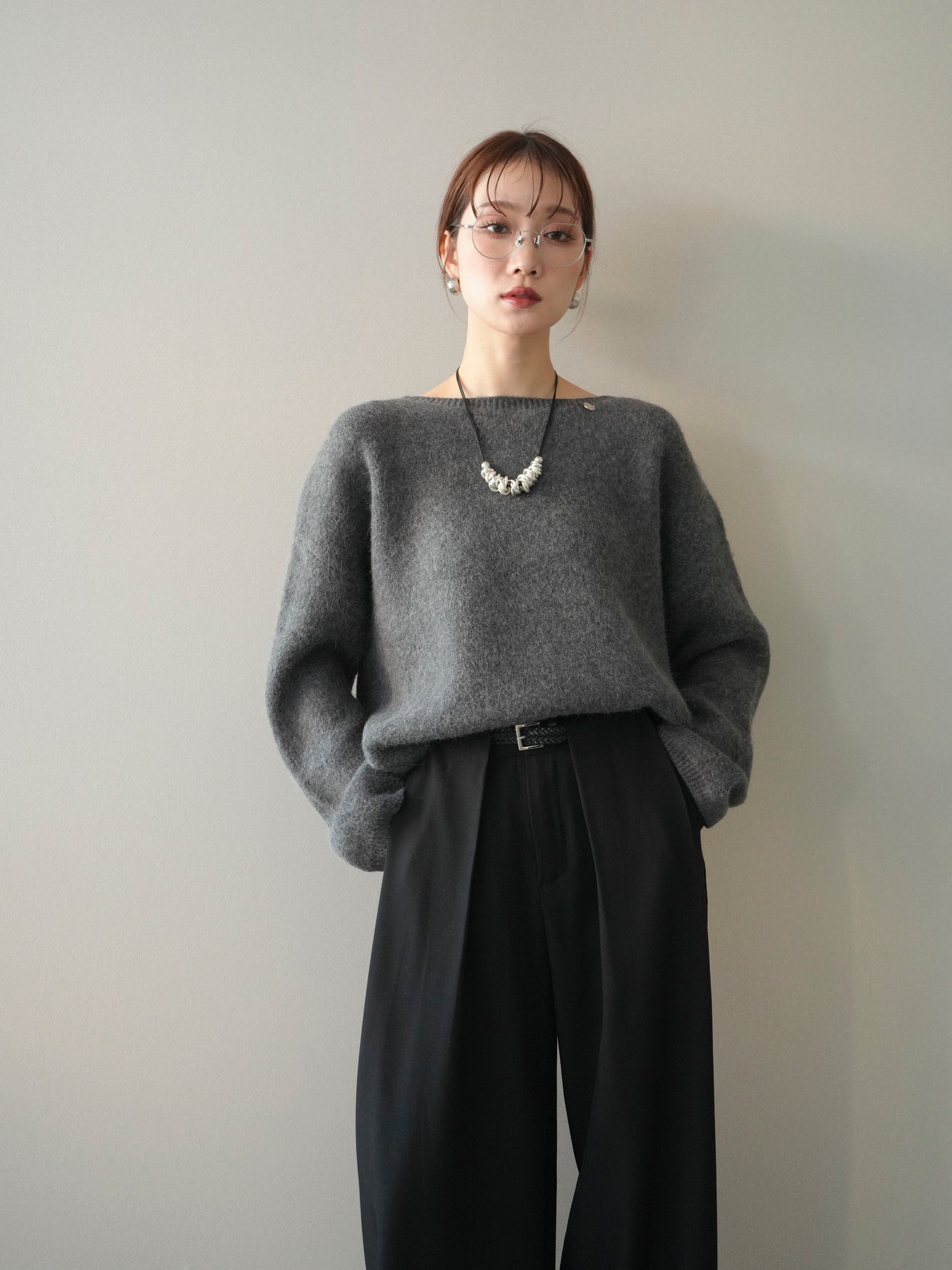 やわらかなアンゴラタッチの風合いが魅力のニットプルオーバー。 ふんわりとした起毛感が肌になじみ、シーズンムードを高めてくれる一着です。 首元をきれいに見せてくれるボートネックデザインが、程よい抜け感と上品さを演出。 コンパクトなクロップド丈でバランスが取りやすく、ハイウエストのボトムとも好相性です。 シンプルながらも素材感が引き立ち、デイリーからきれいめまで幅広く活躍します。