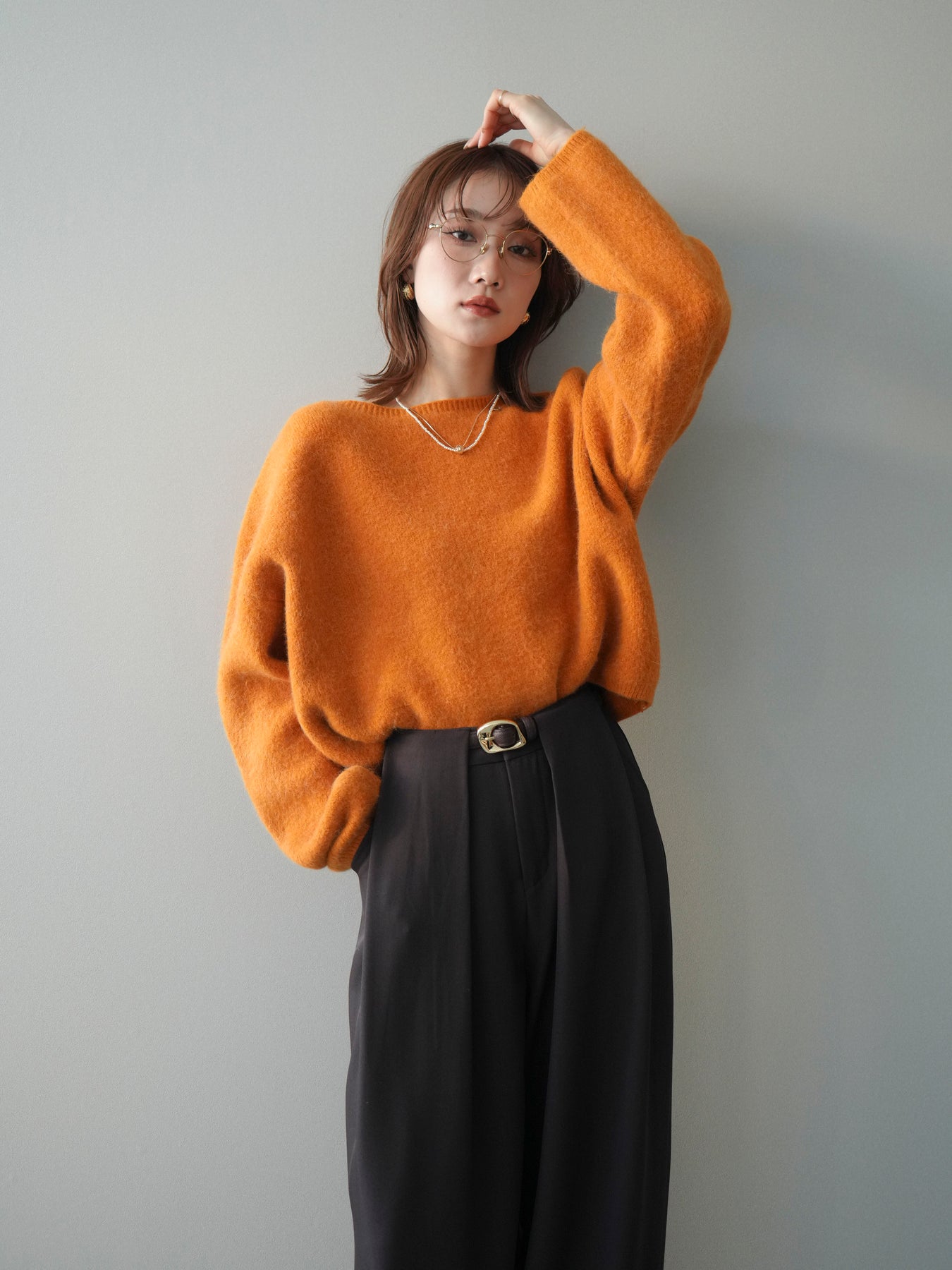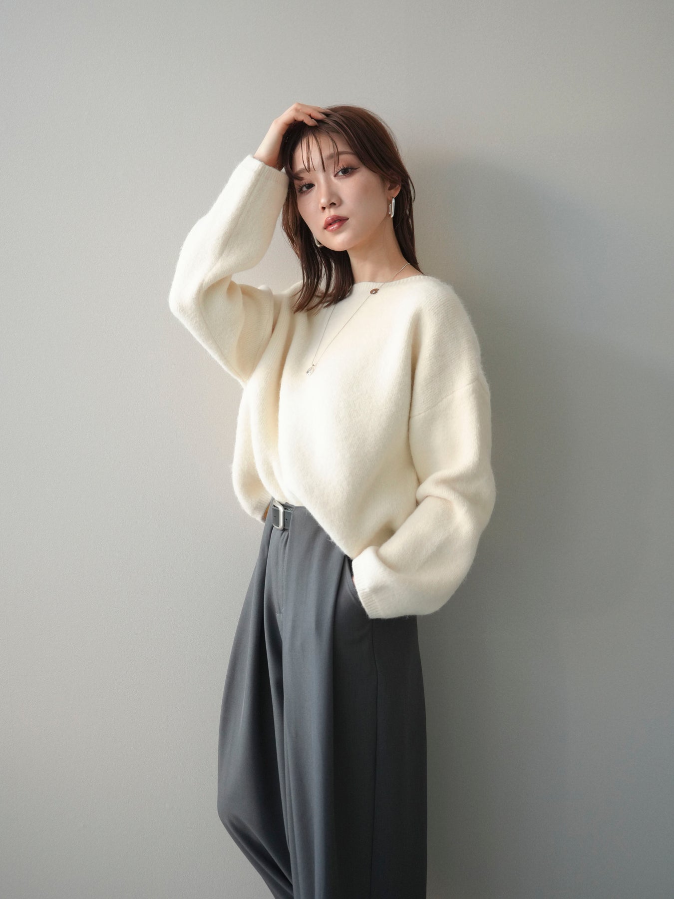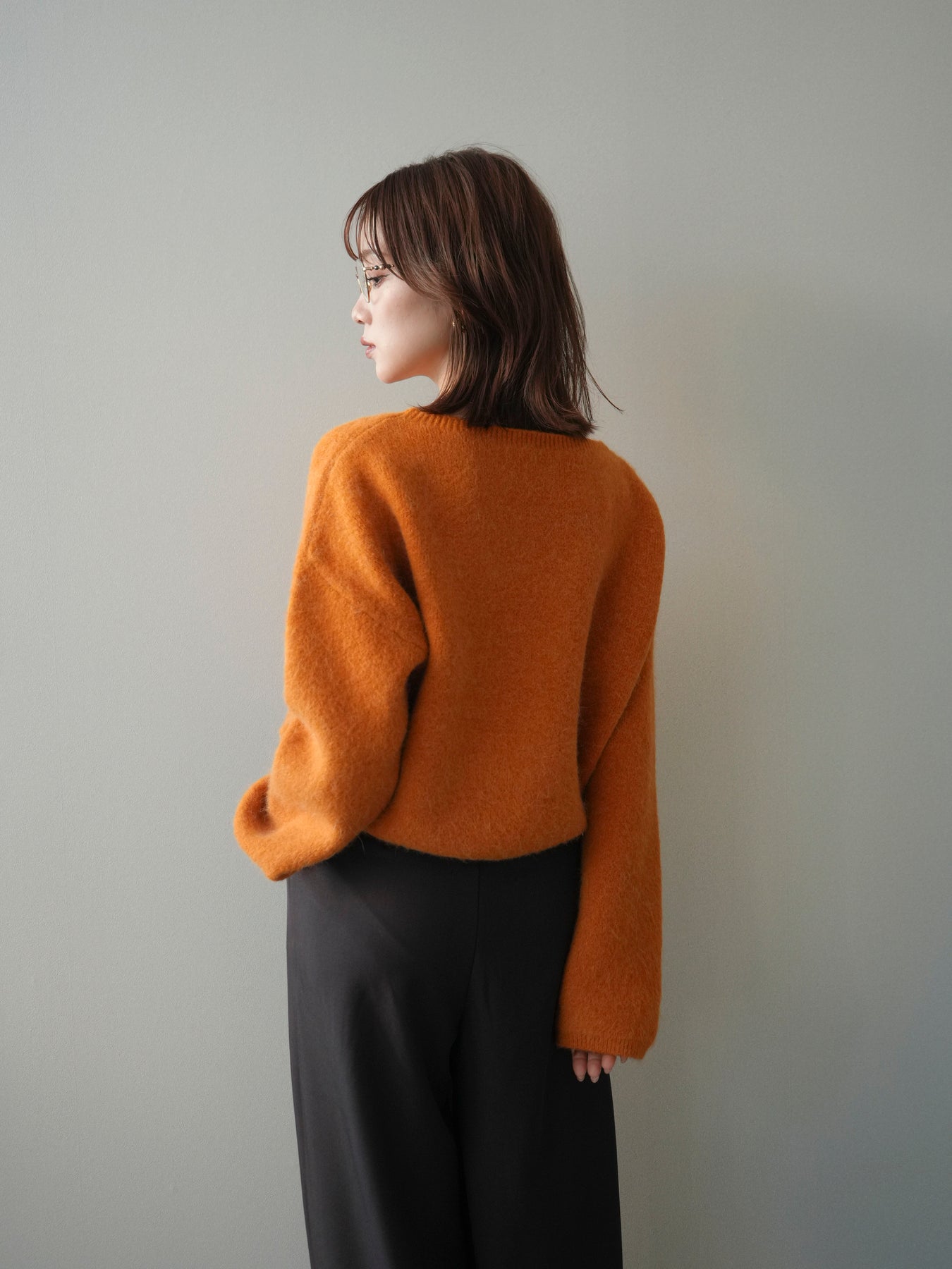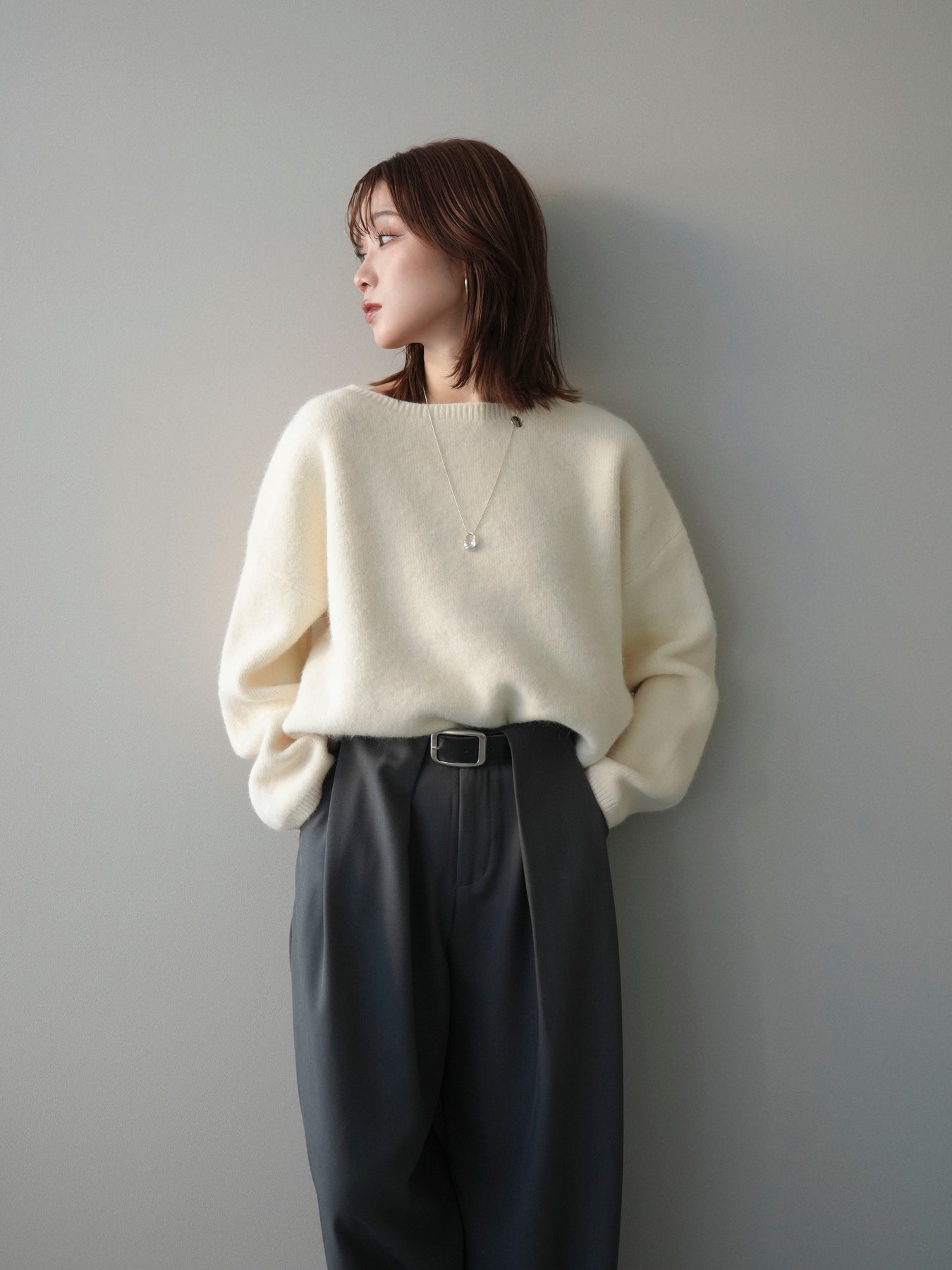 やわらかなアンゴラタッチの風合いが魅力のニットプルオーバー。 ふんわりとした起毛感が肌になじみ、シーズンムードを高めてくれる一着です。 首元をきれいに見せてくれるボートネックデザインが、程よい抜け感と上品さを演出。 コンパクトなクロップド丈でバランスが取りやすく、ハイウエストのボトムとも好相性です。 シンプルながらも素材感が引き立ち、デイリーからきれいめまで幅広く活躍します。