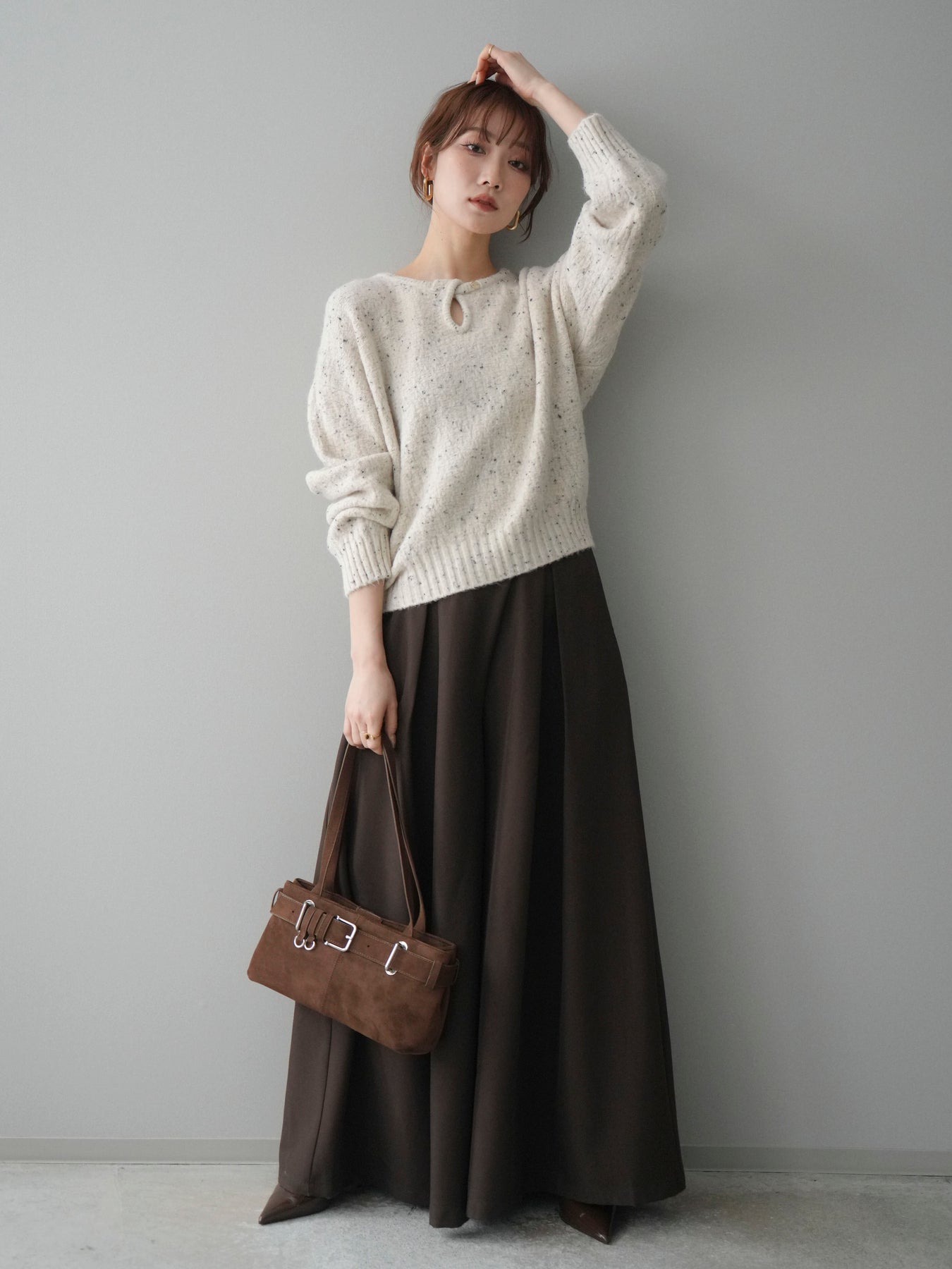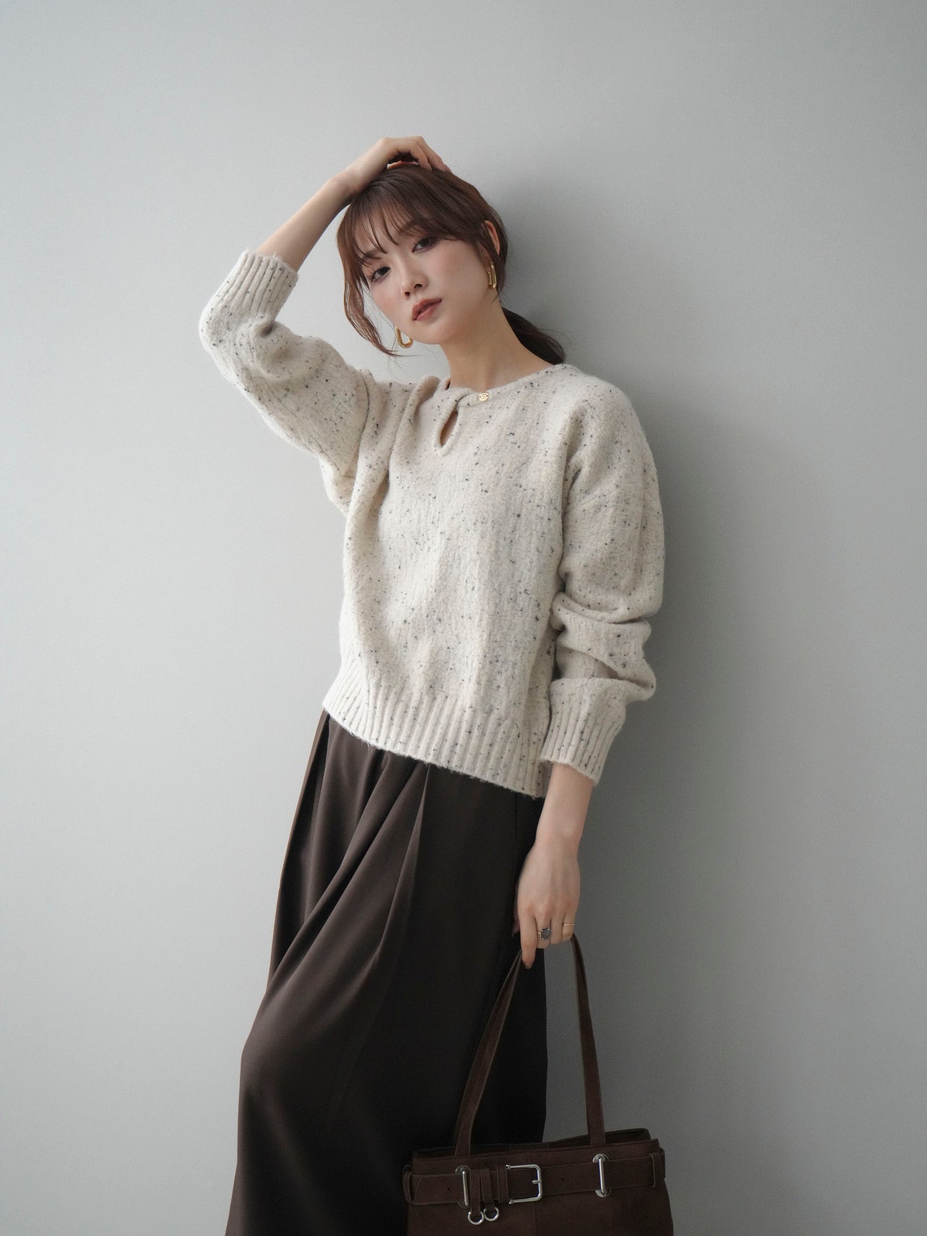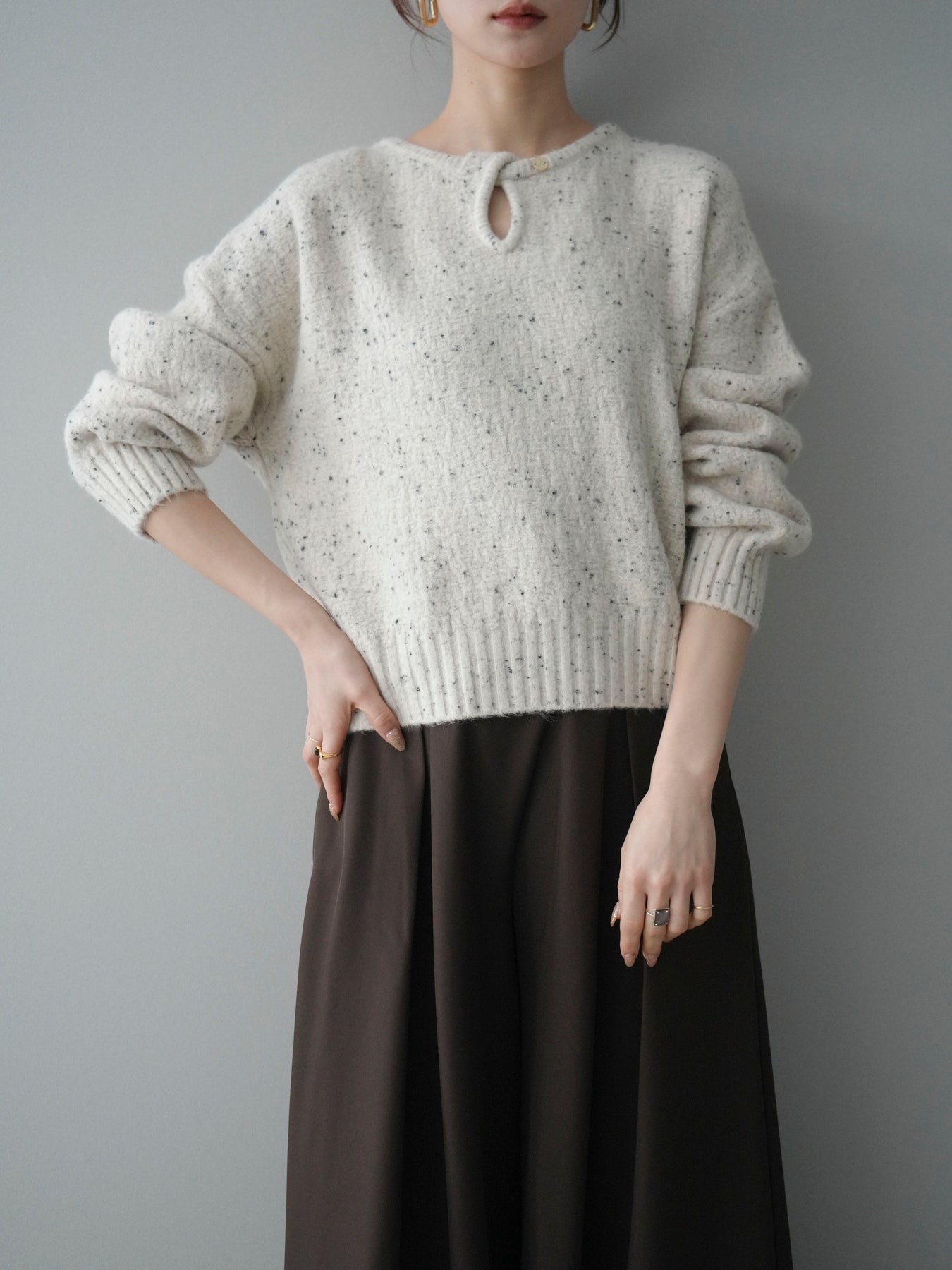 さりげなく輝くラメネップヤーンが上品な印象を与えるニットプルオーバー。 表情のある糸使いがシンプルなデザインに奥行きをプラスし、着るだけで華やかな雰囲気に仕上がります。 ツイストネックのデザインが首元のアクセントとなり、ほどよい抜け感と女性らしさを演出。 程よくゆとりのあるシルエットで、デイリーにも取り入れやすく、1枚で着映えするのが魅力です。 カジュアルからきれいめまで幅広いスタイリングに活躍する、存在感のある一着です。