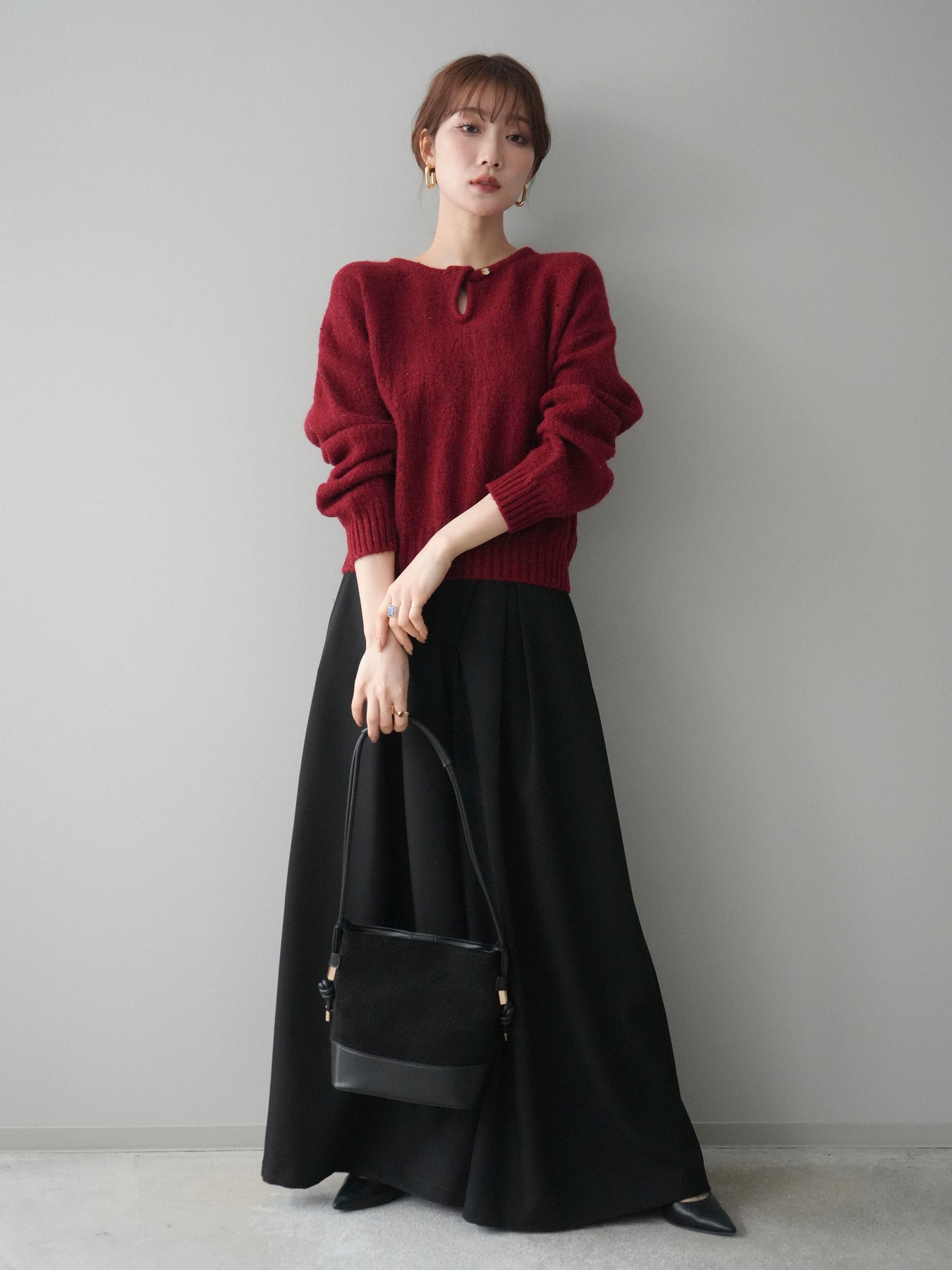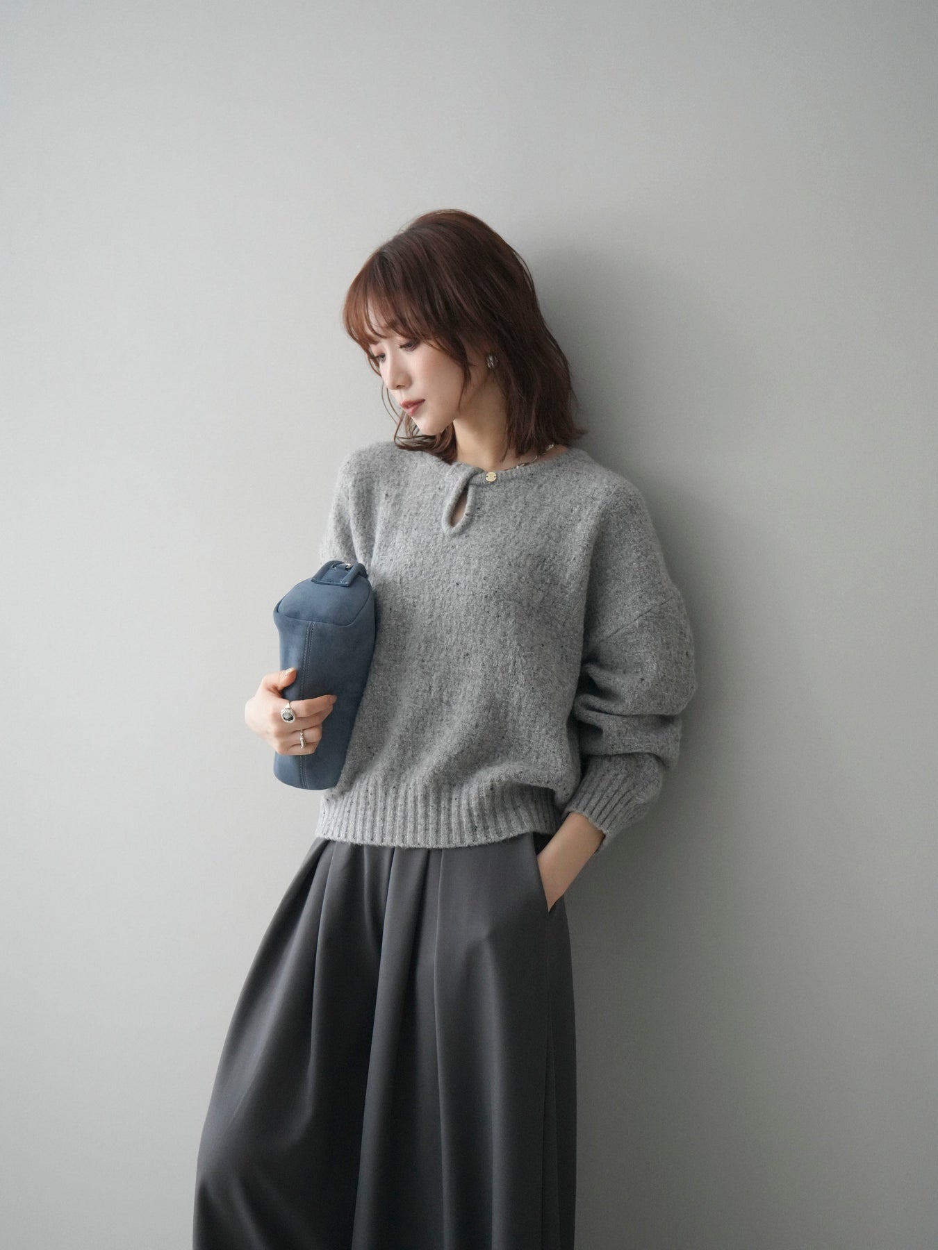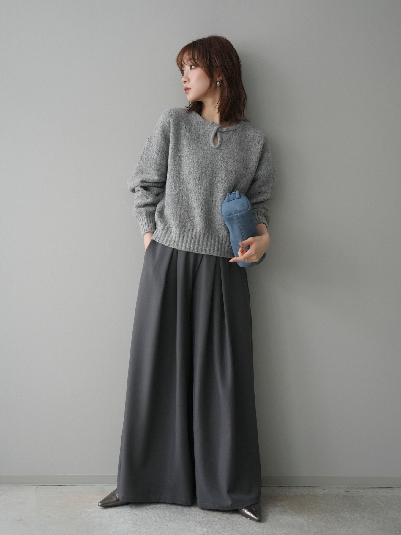 さりげなく輝くラメネップヤーンが上品な印象を与えるニットプルオーバー。 表情のある糸使いがシンプルなデザインに奥行きをプラスし、着るだけで華やかな雰囲気に仕上がります。 ツイストネックのデザインが首元のアクセントとなり、ほどよい抜け感と女性らしさを演出。 程よくゆとりのあるシルエットで、デイリーにも取り入れやすく、1枚で着映えするのが魅力です。 カジュアルからきれいめまで幅広いスタイリングに活躍する、存在感のある一着です。