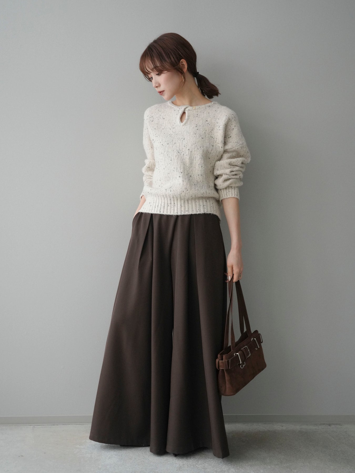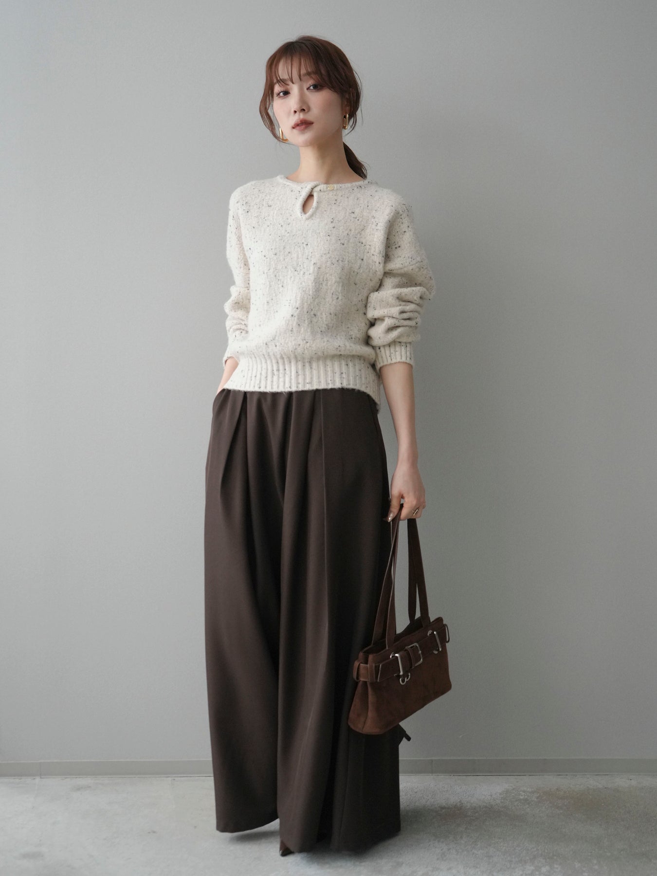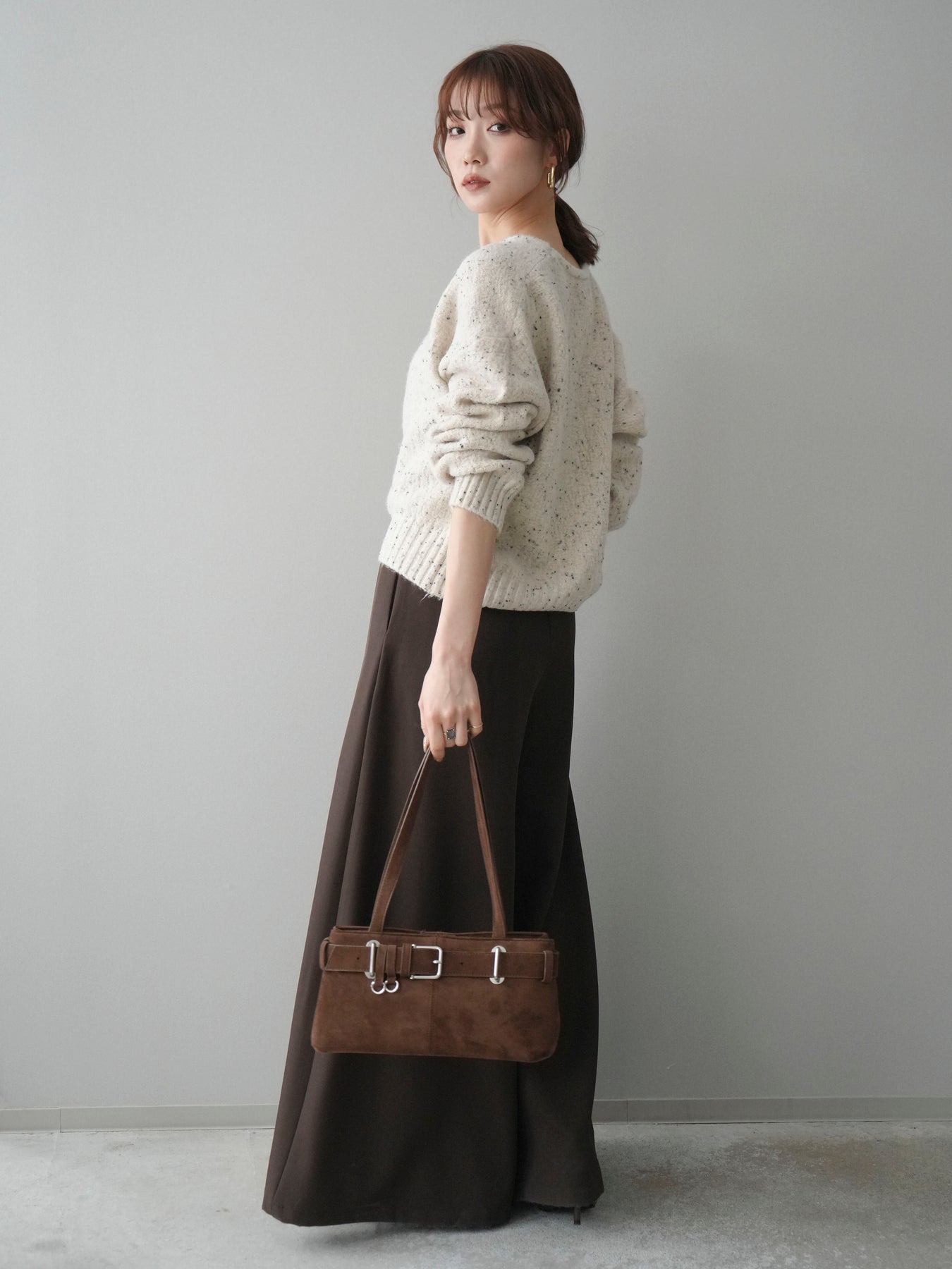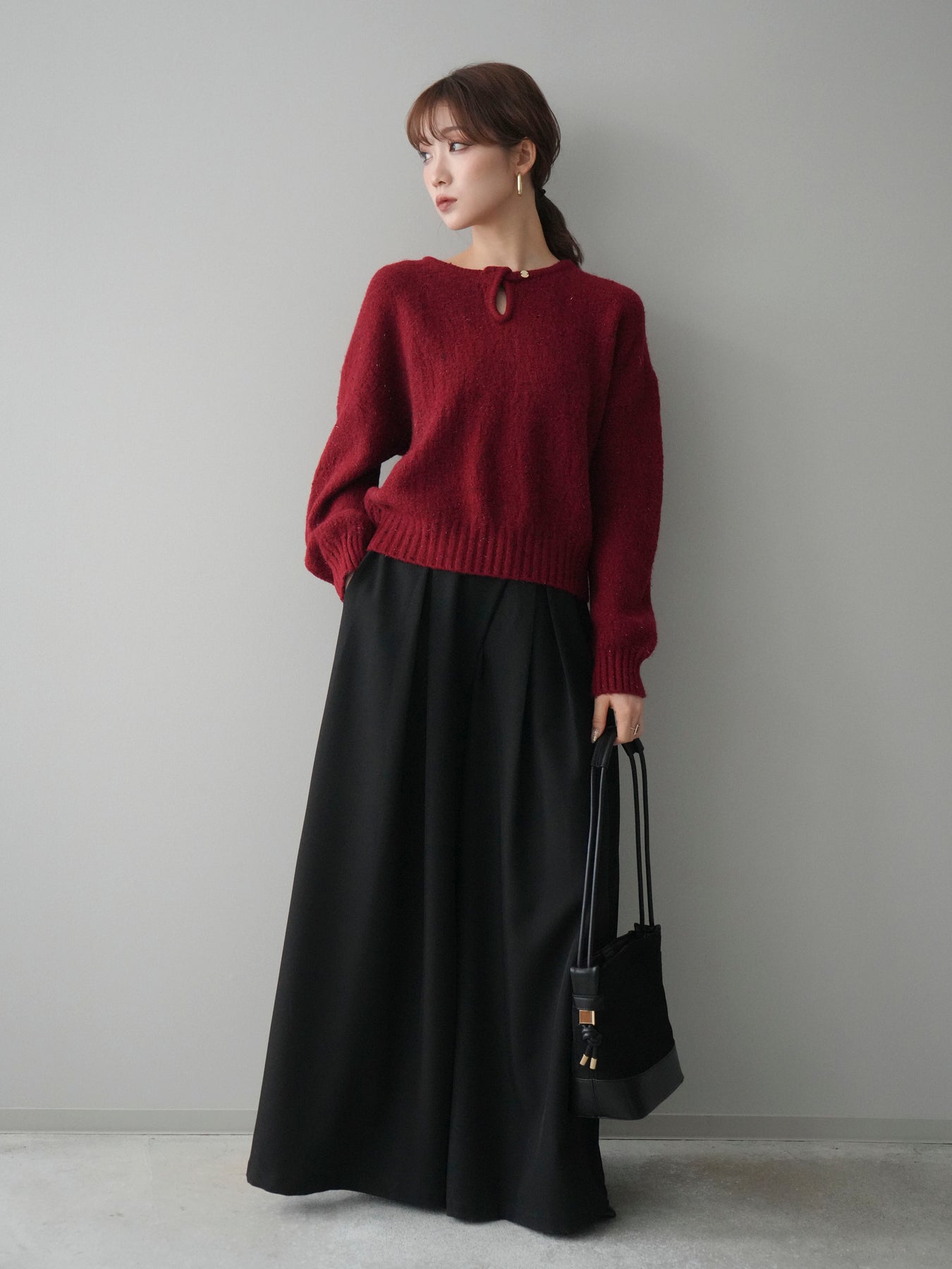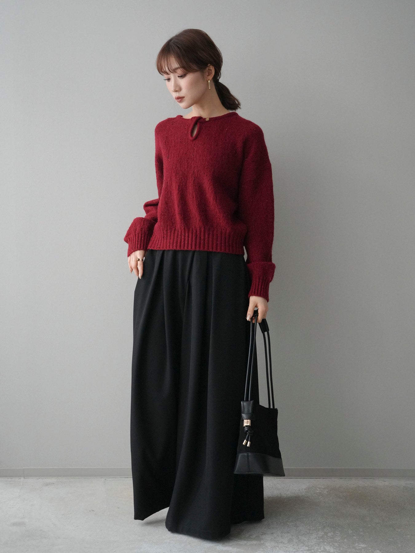 [SET]ツイストネックラメネップヤーンニットプルオーバー+テープベルトタックバギーパンツ(2set)