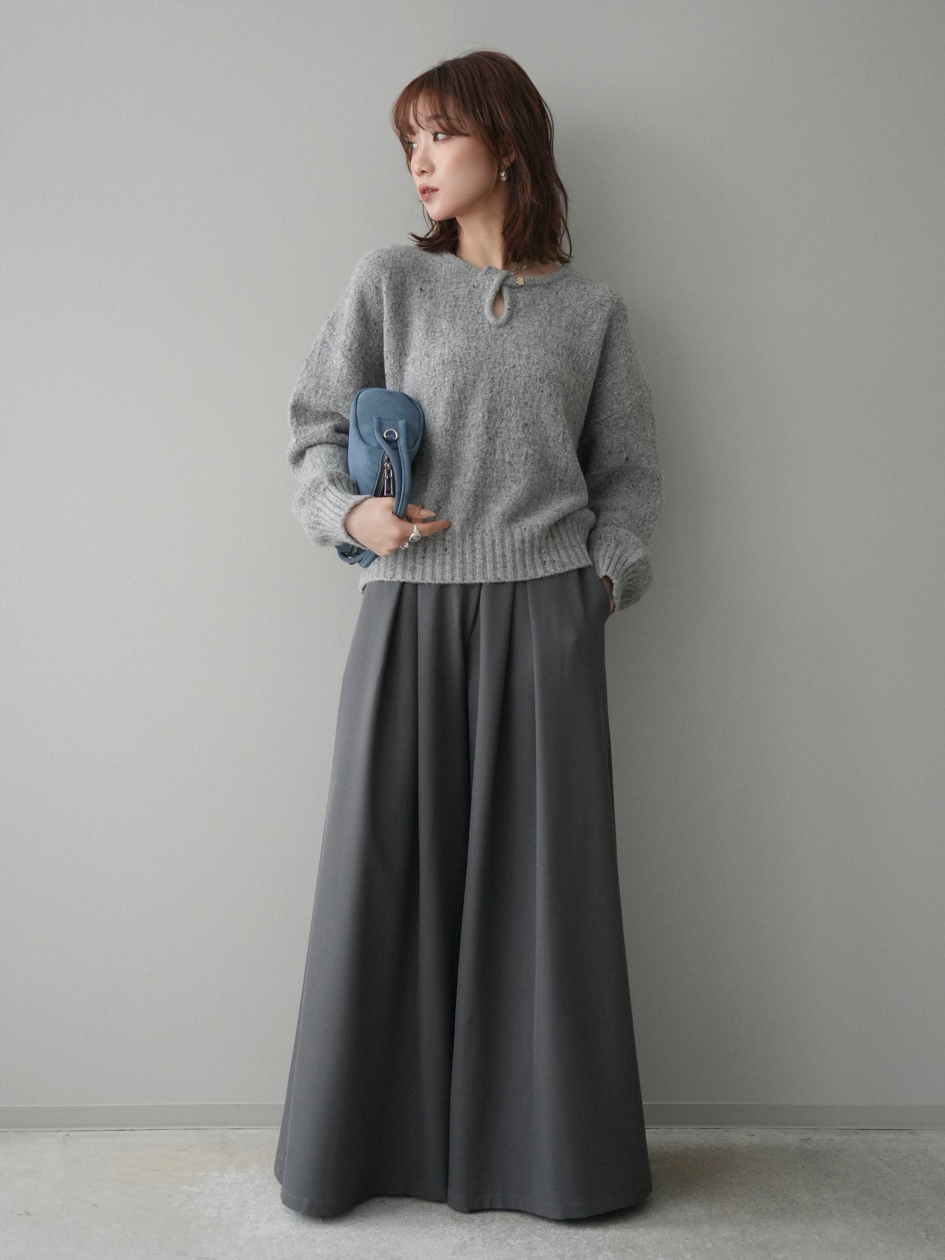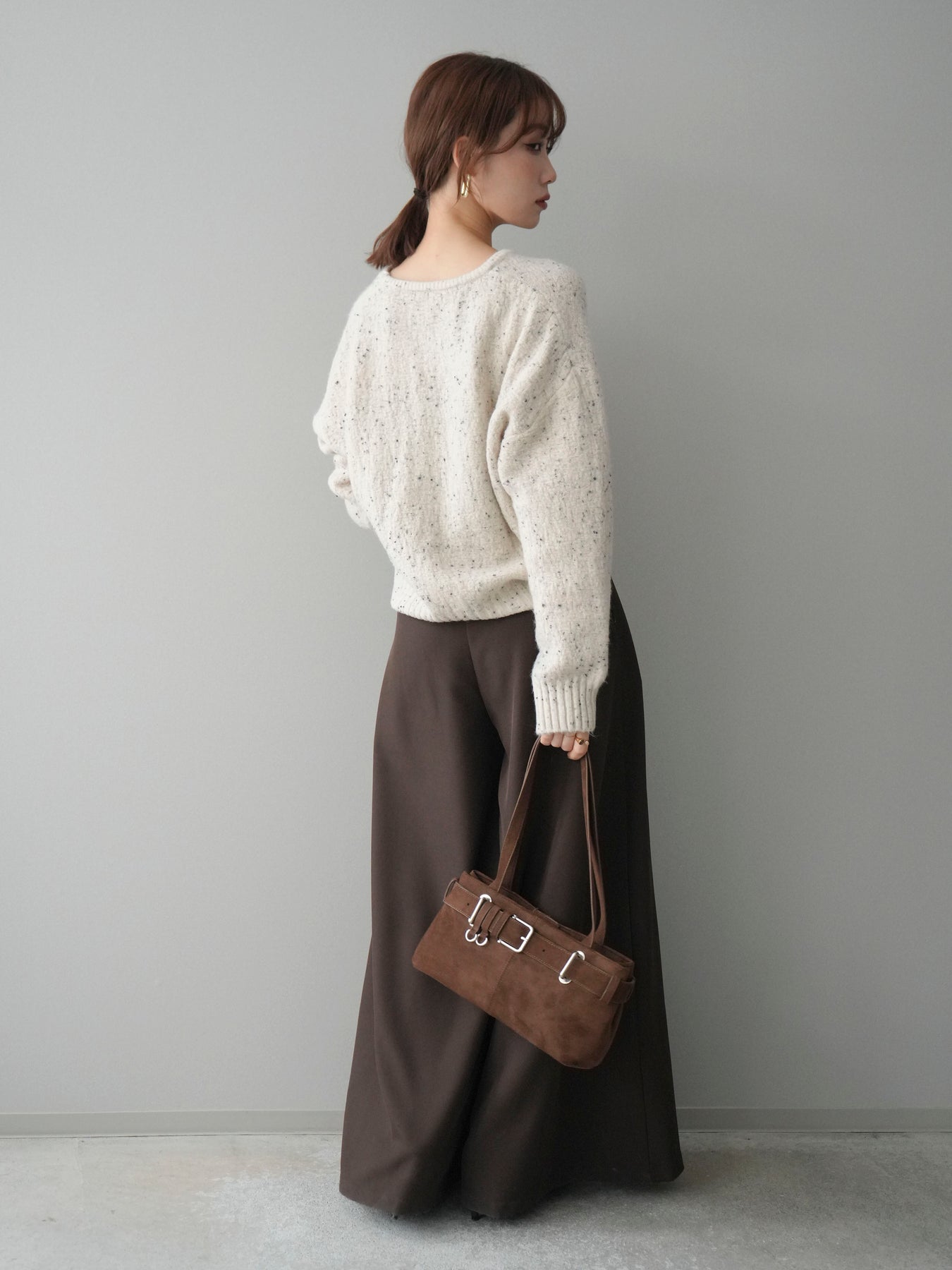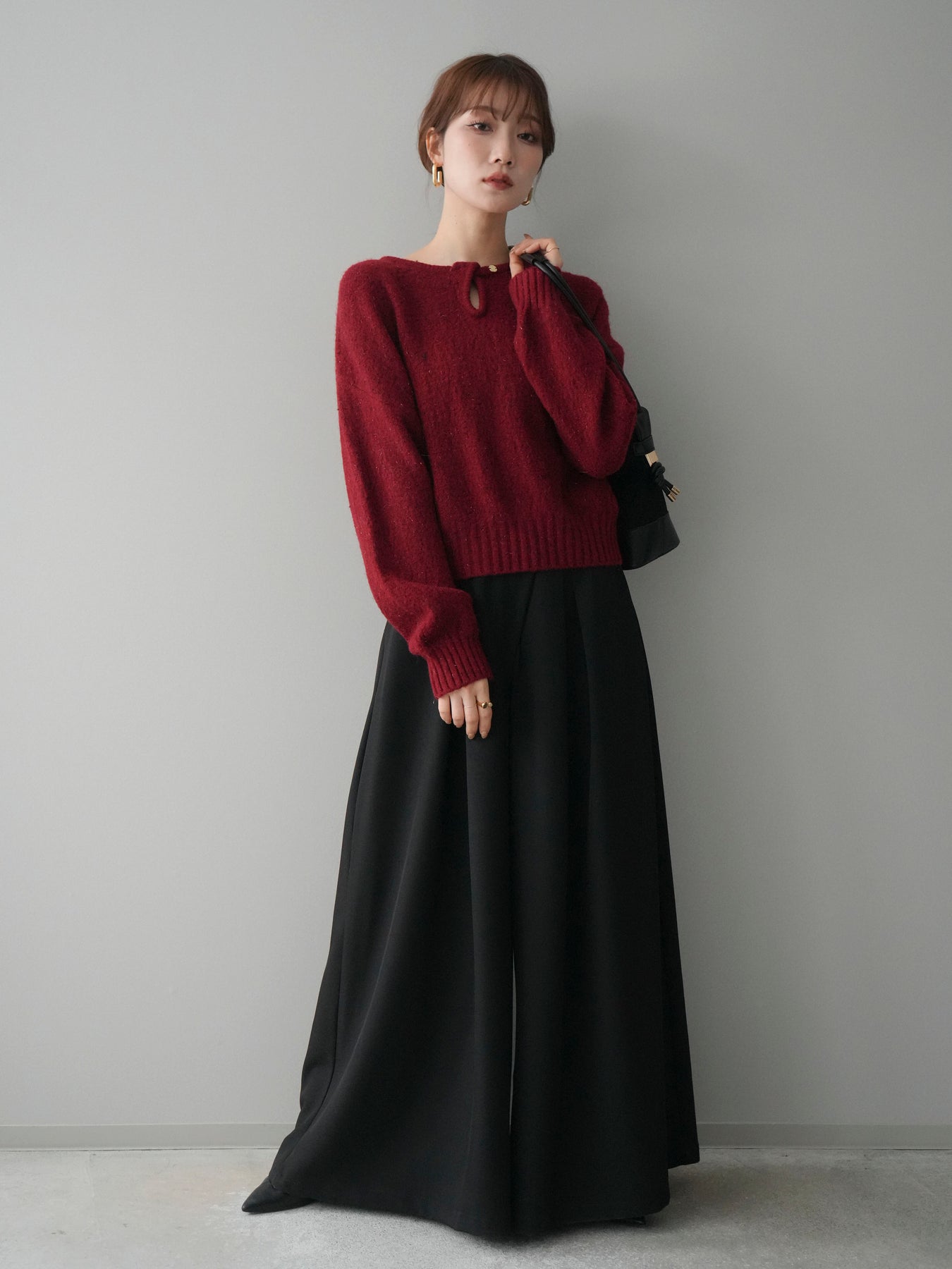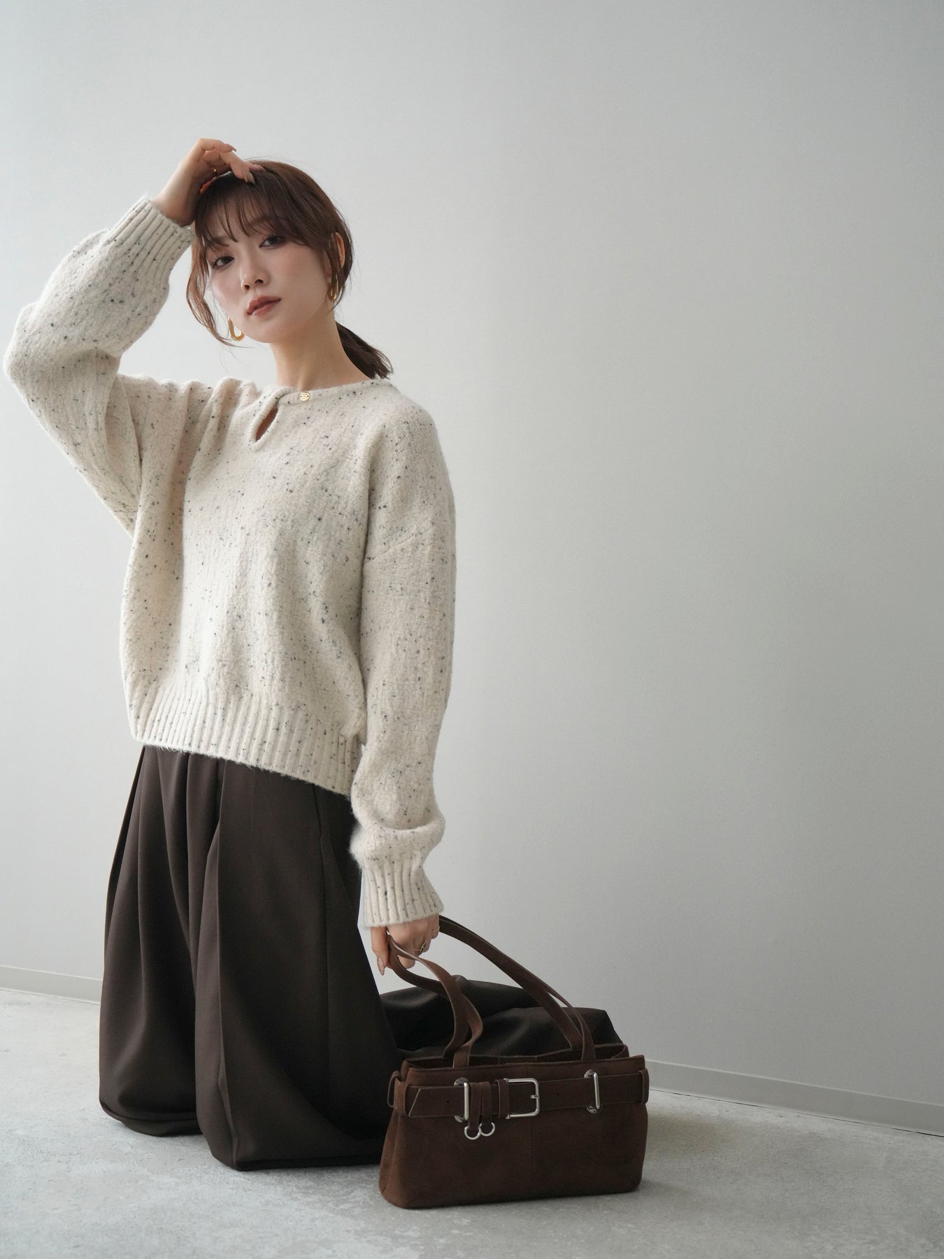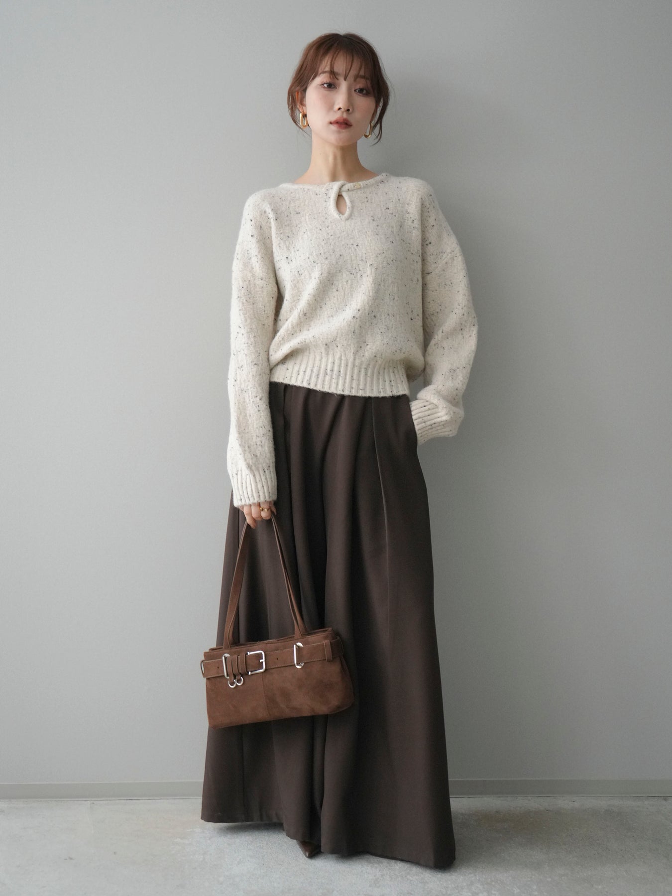 [SET]ツイストネックラメネップヤーンニットプルオーバー+テープベルトタックバギーパンツ(2set)