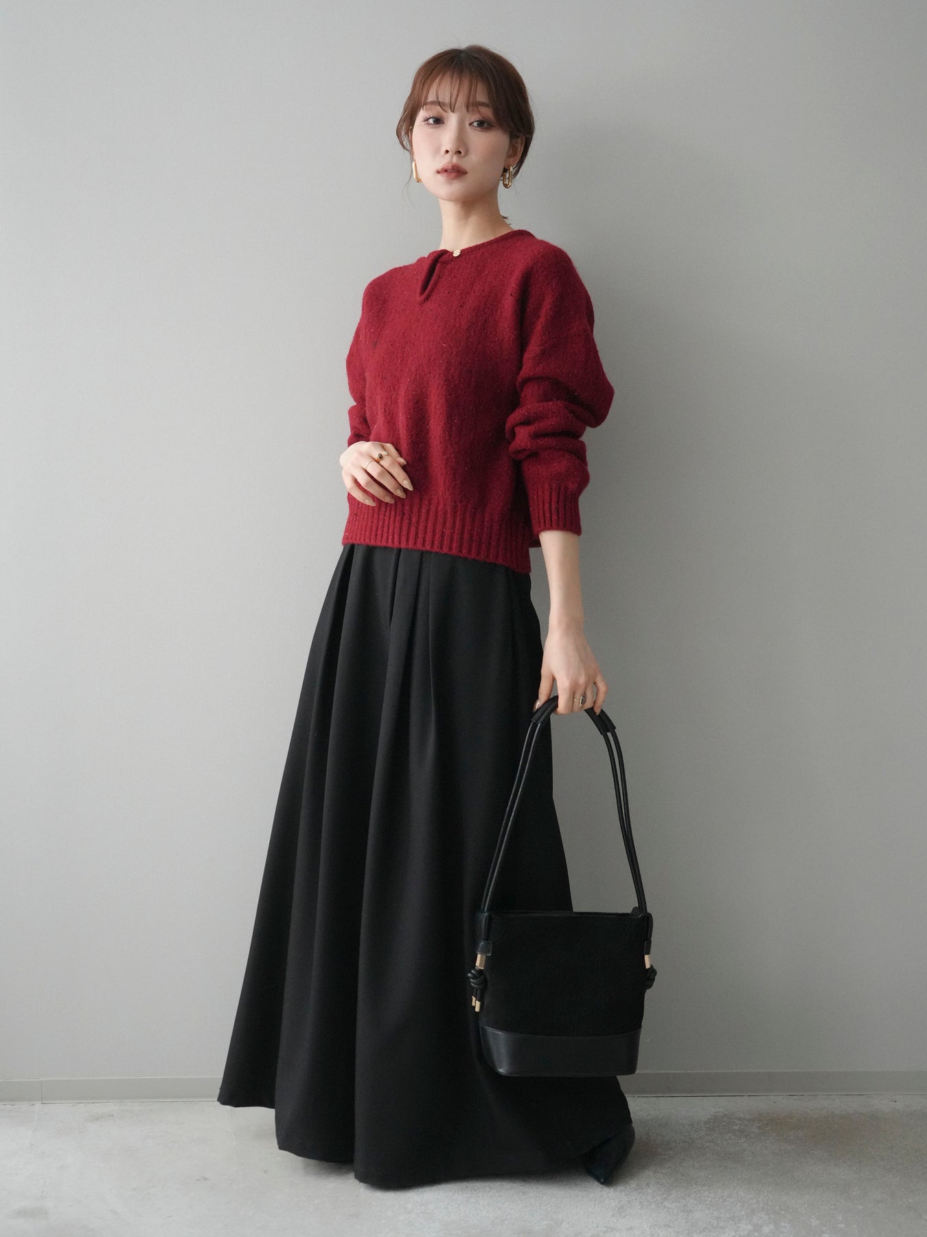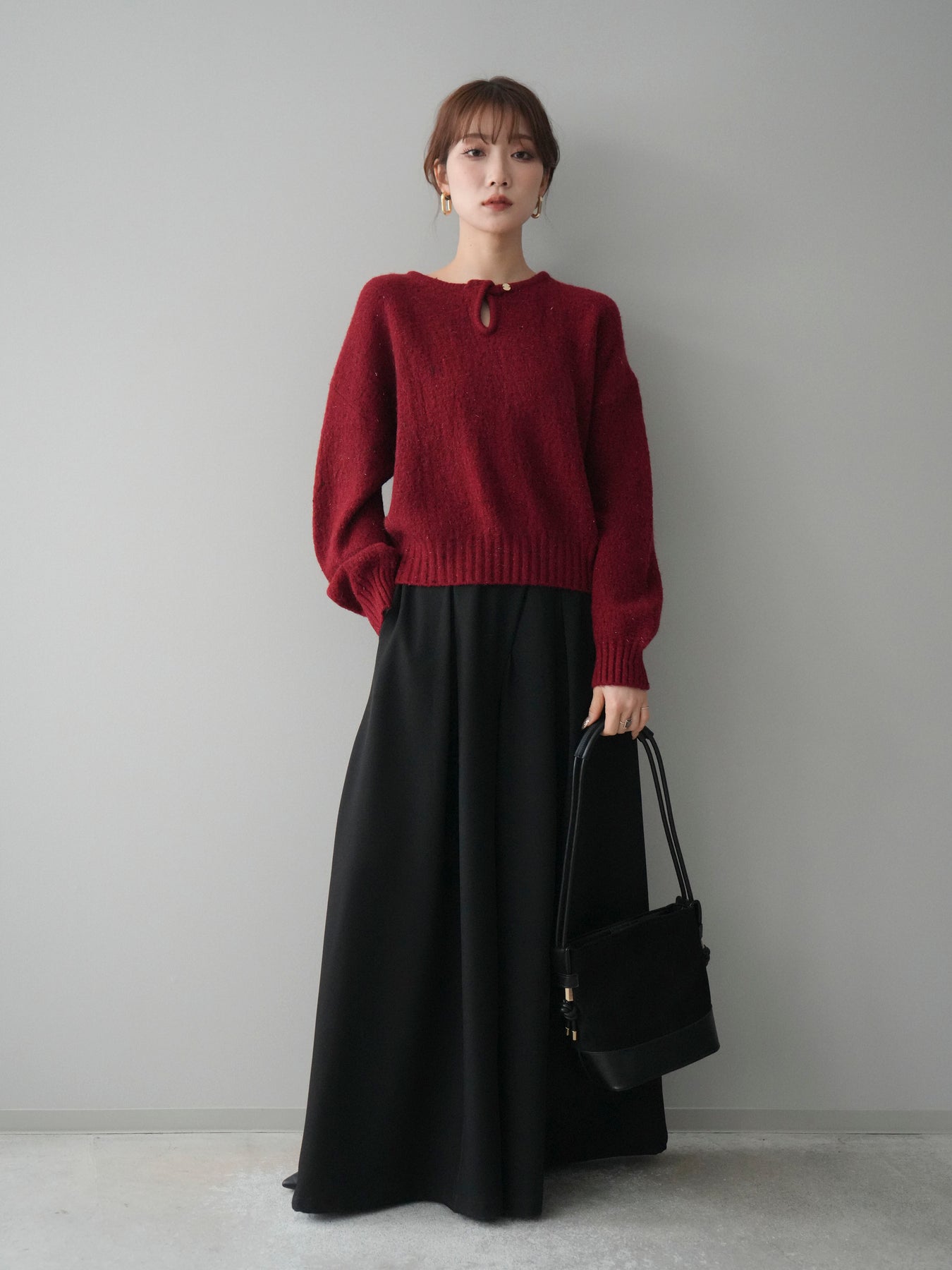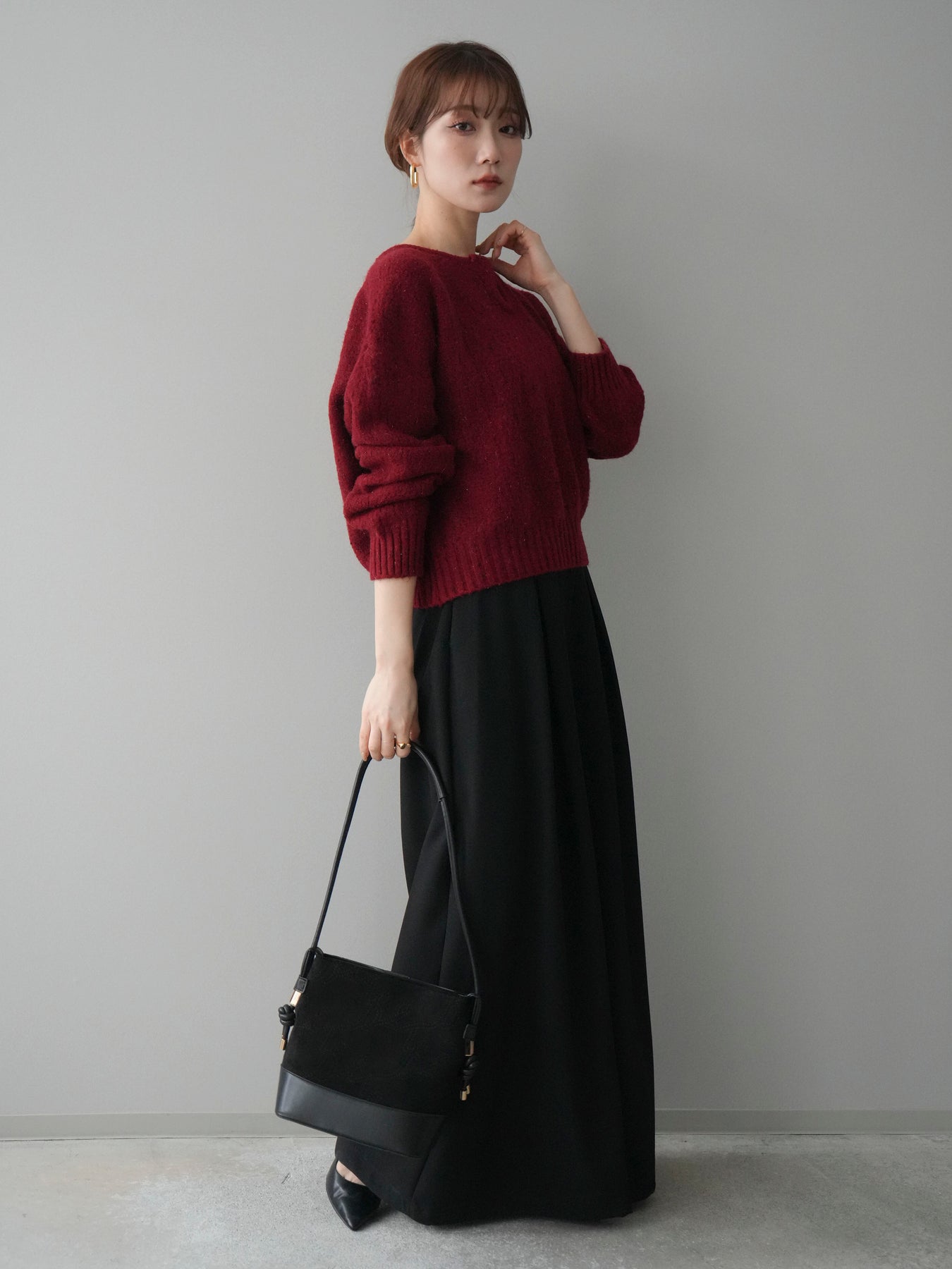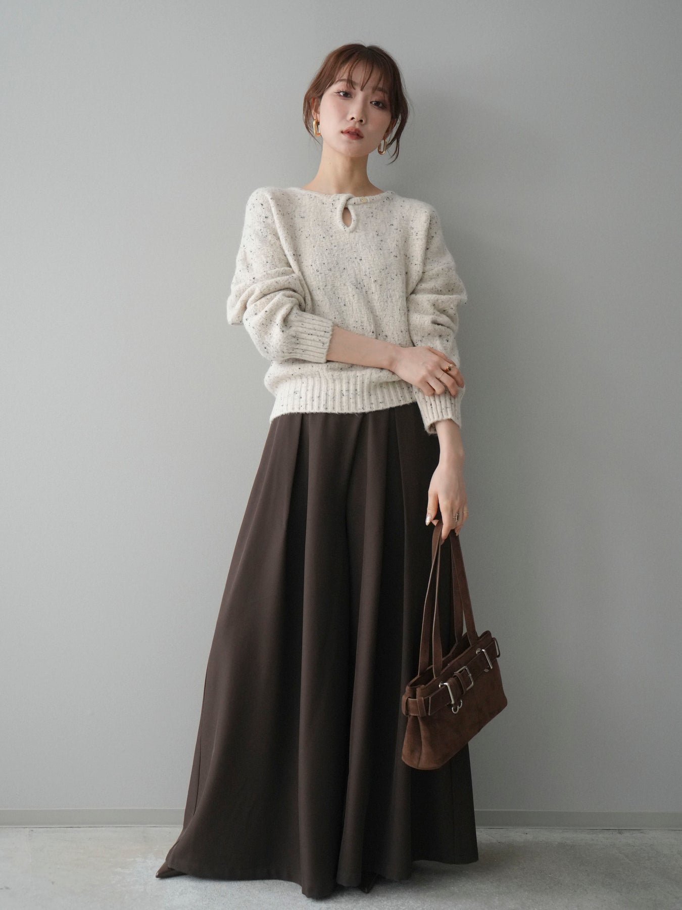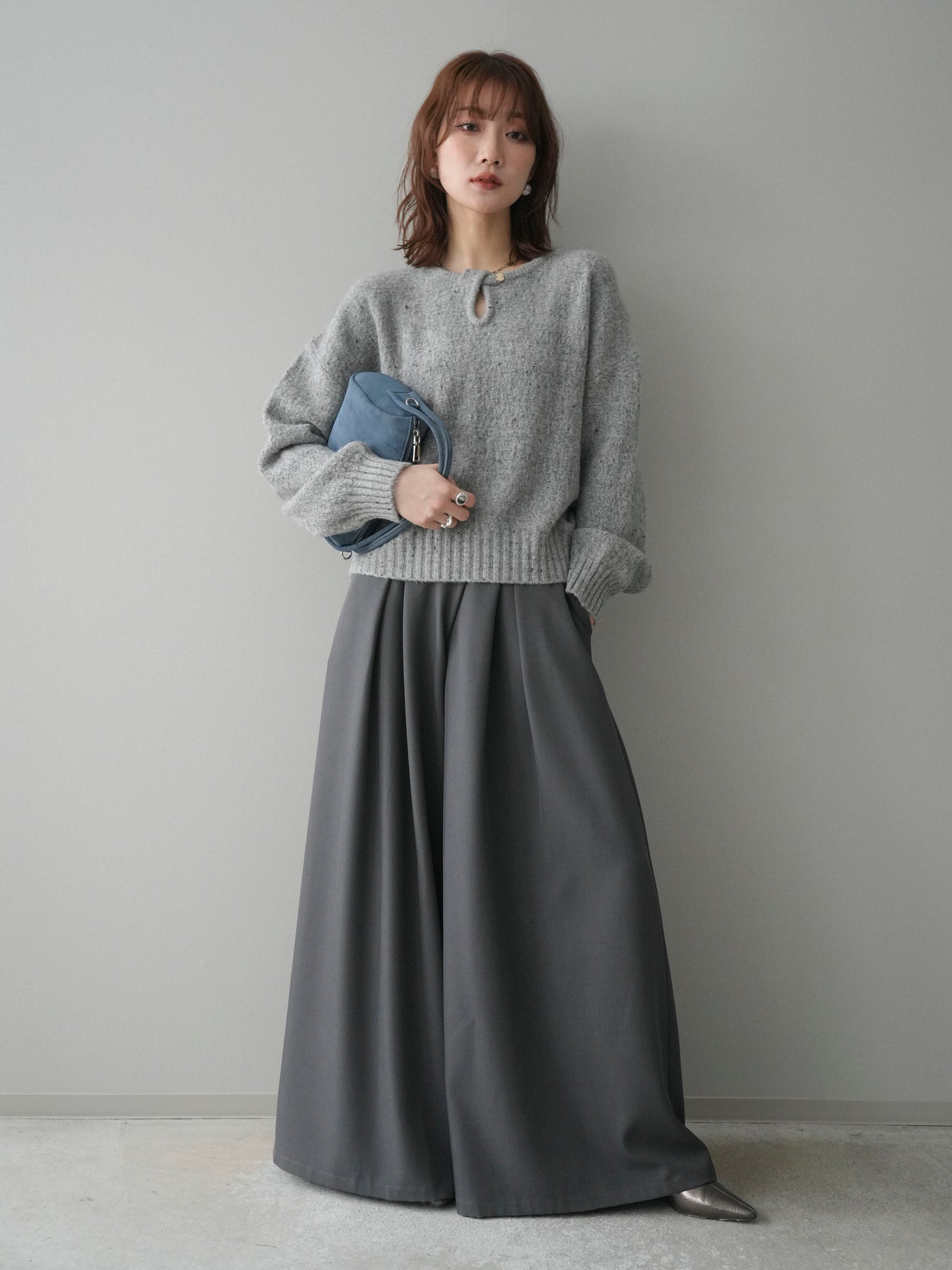 [SET]ツイストネックラメネップヤーンニットプルオーバー+テープベルトタックバギーパンツ(2set)