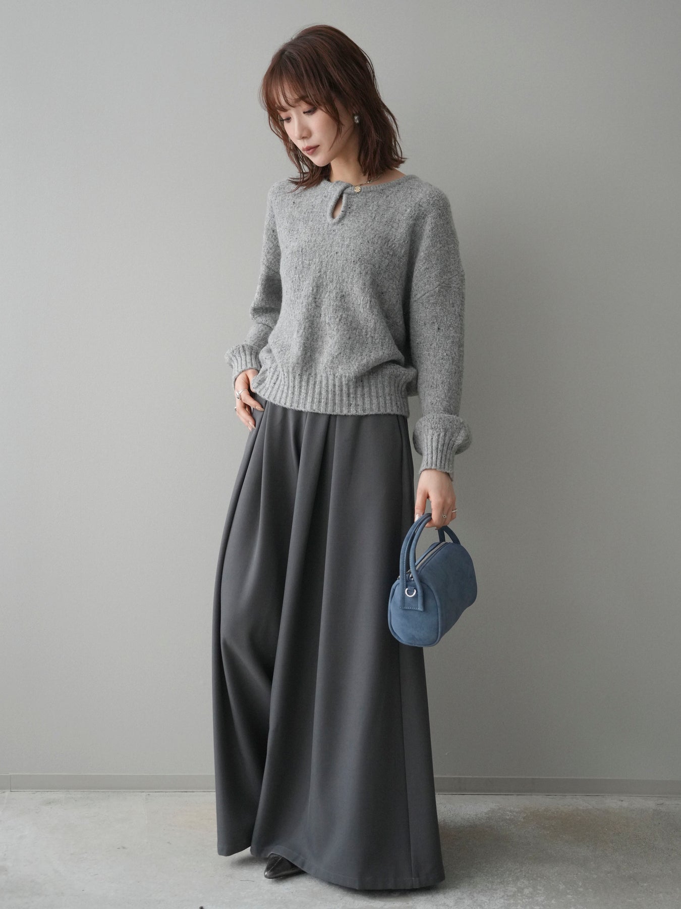 フロントに入ったタックが美しいドレープを生み出す、存在感のあるバギーパンツ。 たっぷりとした分量感が動くたびに表情を変え、スタイリングに奥行きを与えます。 ウエストまわりはすっきりとまとめつつ、腰から裾にかけて自然に広がるシルエットが魅力。 テープベルトがさりげないアクセントとなり、シンプルなトップスと合わせてもバランスよく決まります。 きれいめからカジュアルまで幅広く取り入れやすく、シーズンを通して活躍する一本です。