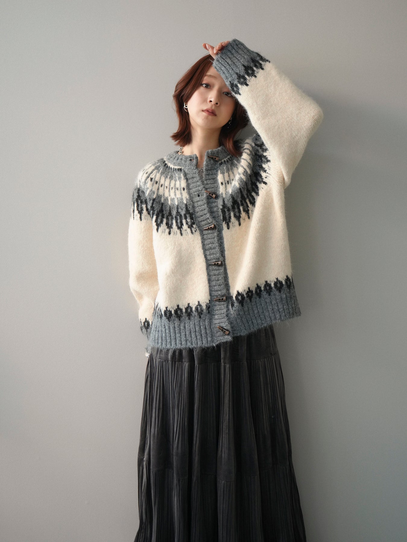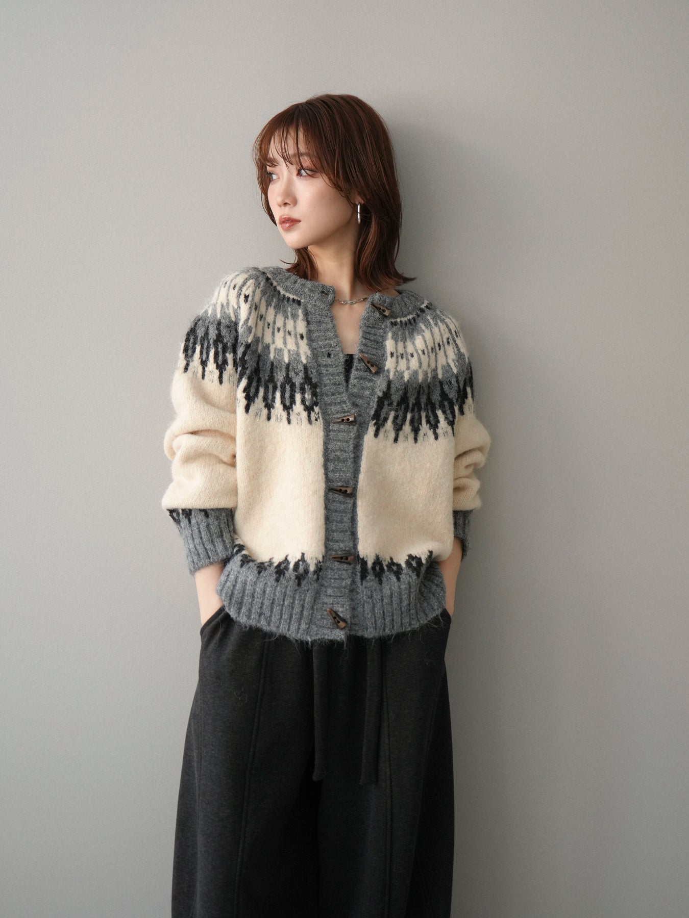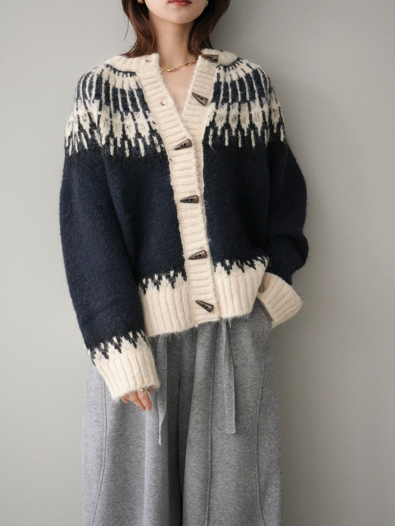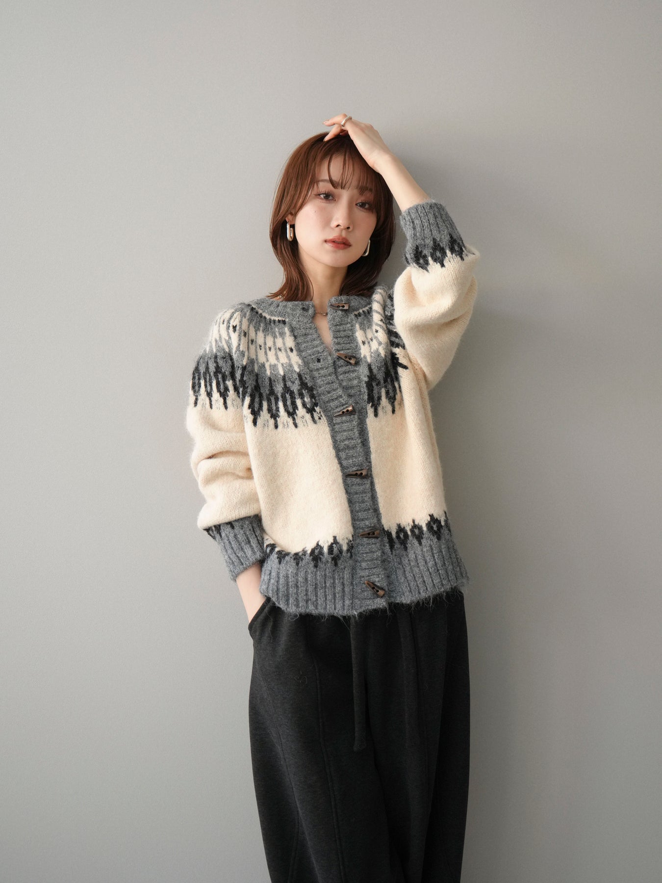 クラシカルな雰囲気漂う求心柄が目を引くニットカーディガン。 首元から広がる編み柄がスタイリングのアクセントとなり、コーディネートに存在感をプラスします。 フロントにはトグルボタンをあしらい、温かみのある表情と程よいカジュアル感を演出。 ニットならではの柔らかな風合いで、羽織るだけでシーズンムードを高めてくれます。 デニムやスカートなど幅広いアイテムと合わせやすく、デイリーに活躍する一着です。