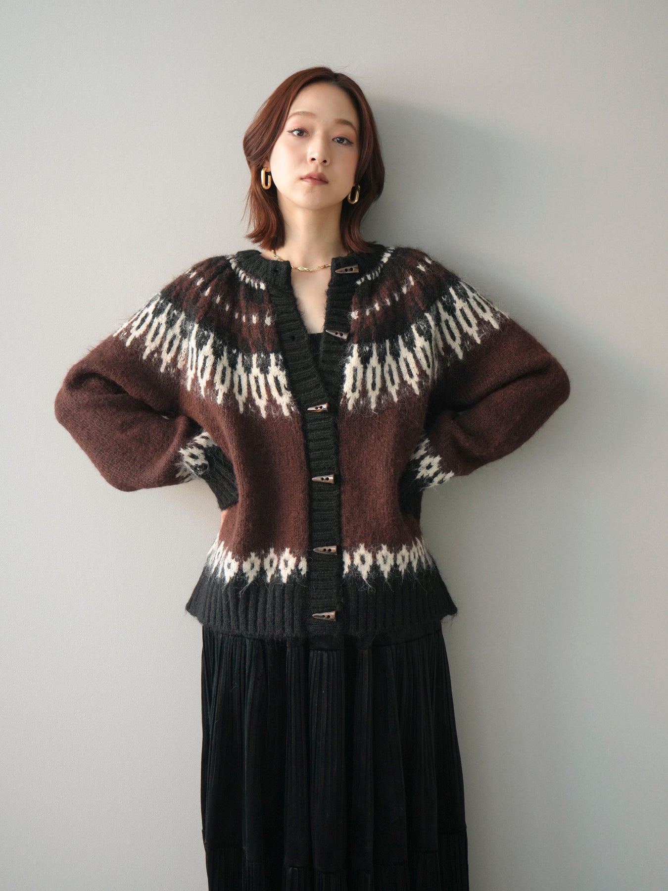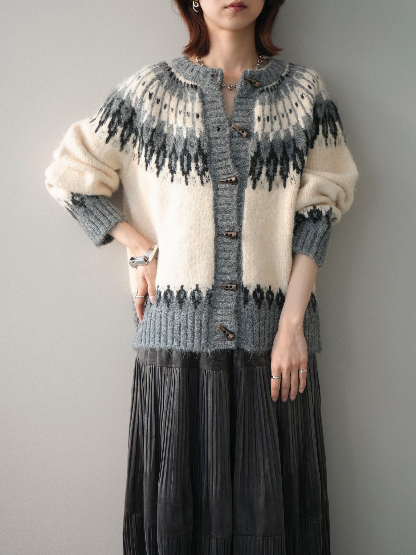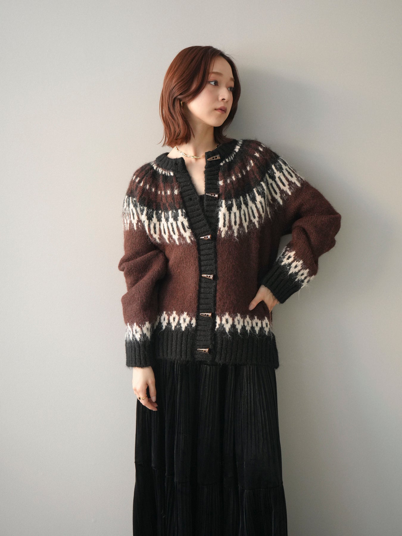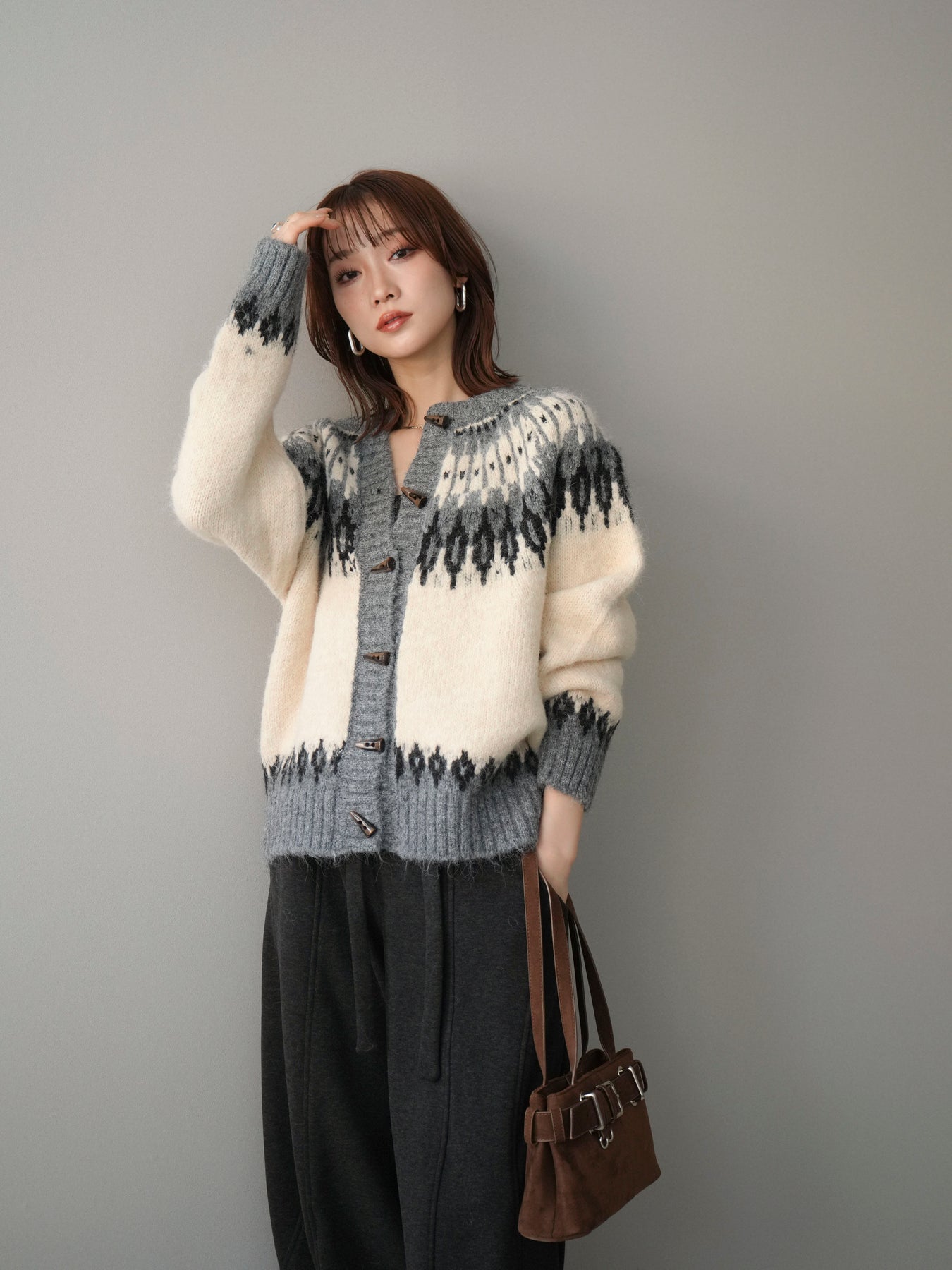 クラシカルな雰囲気漂う求心柄が目を引くニットカーディガン。 首元から広がる編み柄がスタイリングのアクセントとなり、コーディネートに存在感をプラスします。 フロントにはトグルボタンをあしらい、温かみのある表情と程よいカジュアル感を演出。 ニットならではの柔らかな風合いで、羽織るだけでシーズンムードを高めてくれます。 デニムやスカートなど幅広いアイテムと合わせやすく、デイリーに活躍する一着です。
