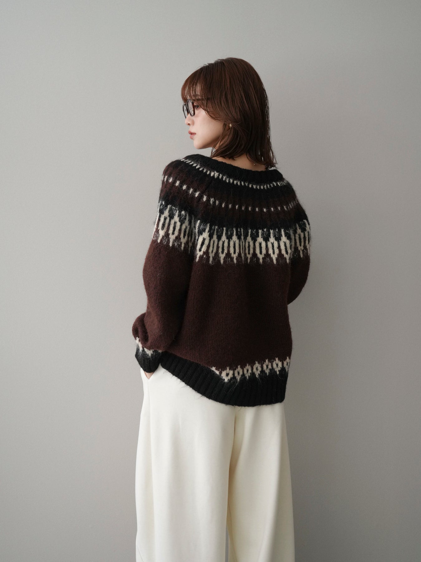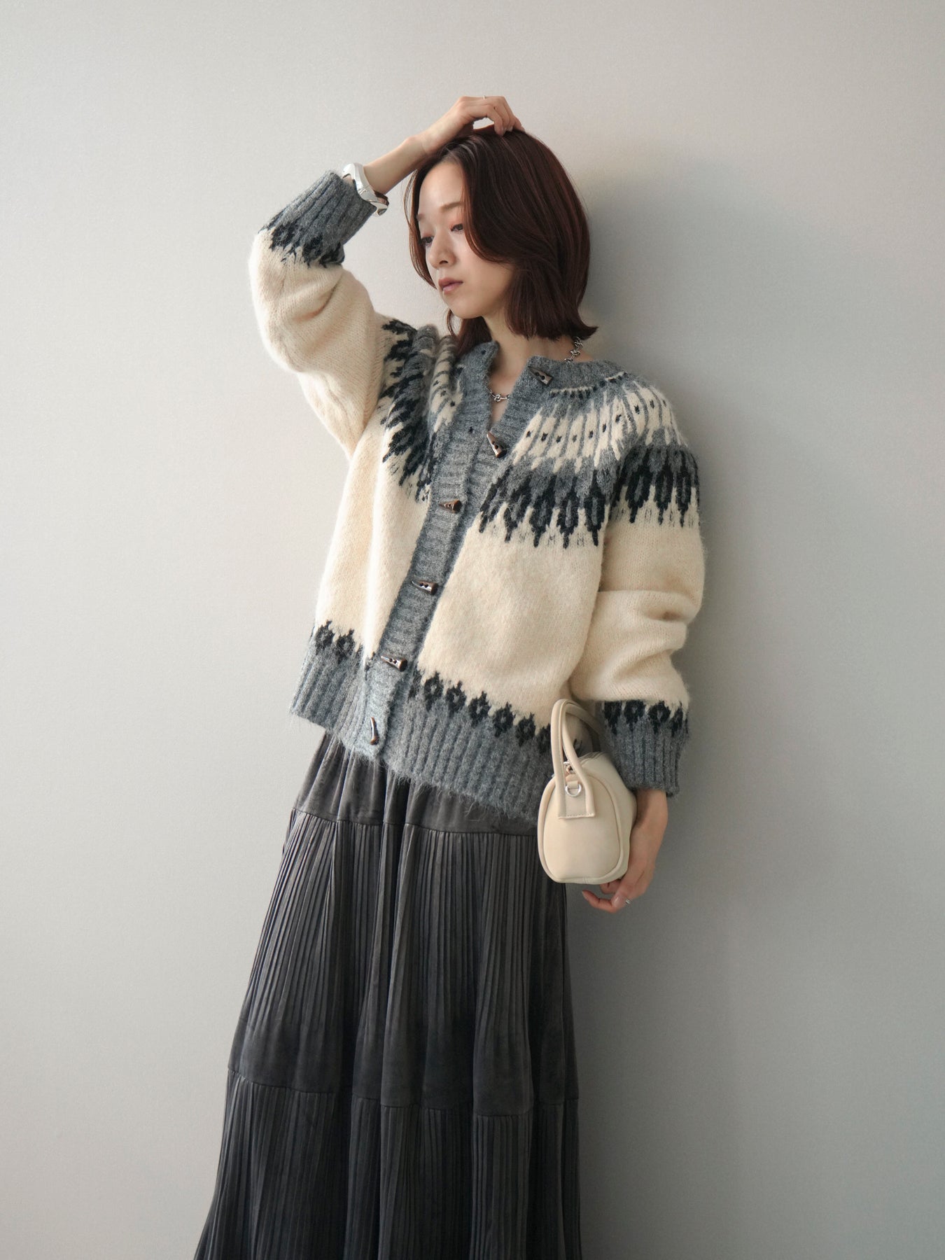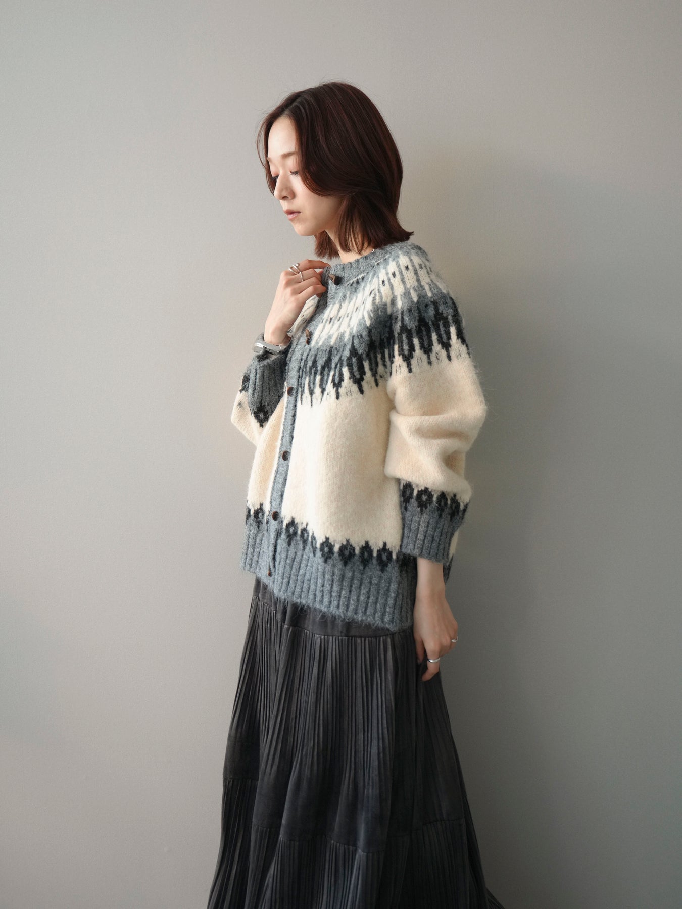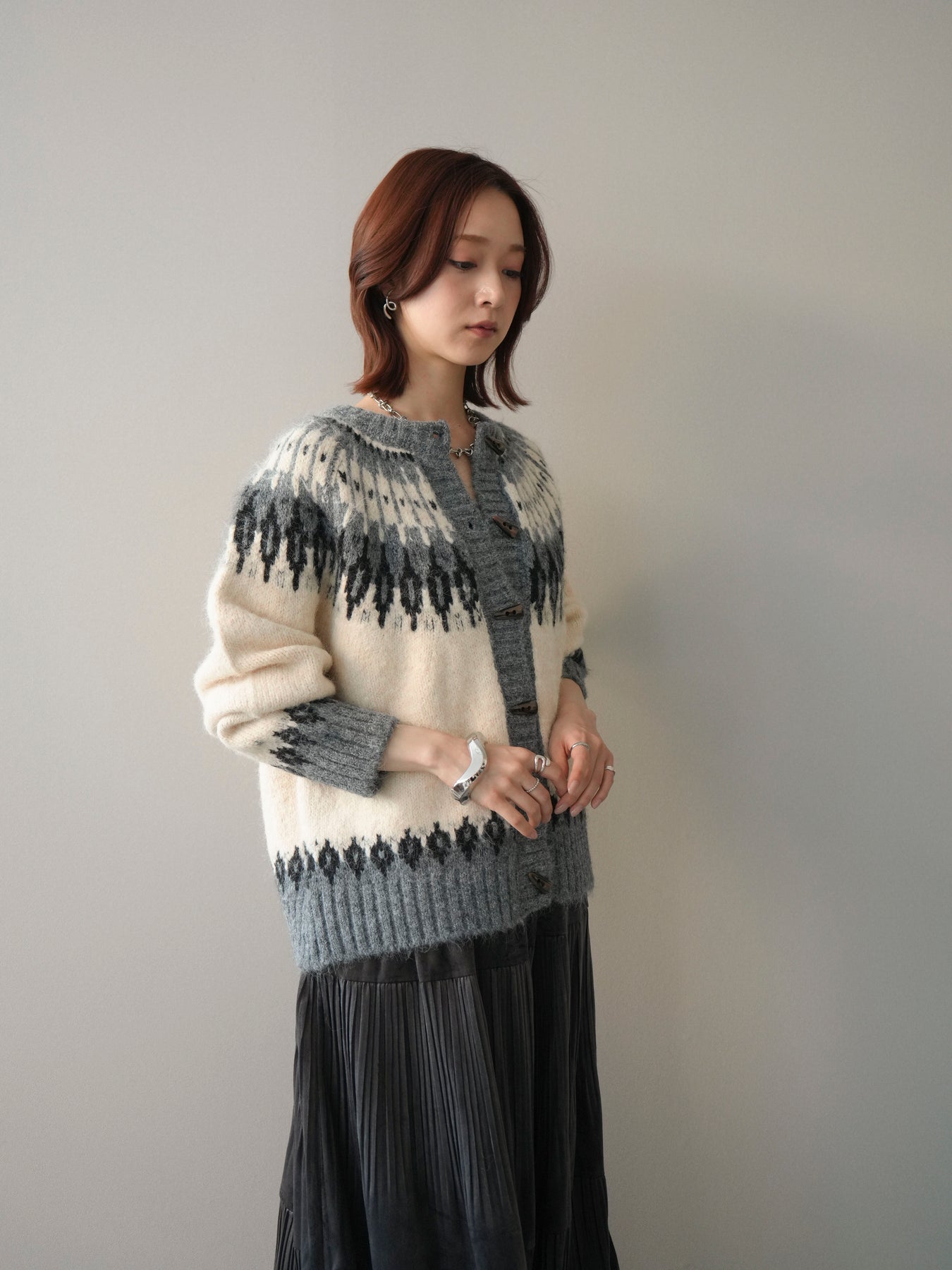 クラシカルな雰囲気漂う求心柄が目を引くニットカーディガン。 首元から広がる編み柄がスタイリングのアクセントとなり、コーディネートに存在感をプラスします。 フロントにはトグルボタンをあしらい、温かみのある表情と程よいカジュアル感を演出。 ニットならではの柔らかな風合いで、羽織るだけでシーズンムードを高めてくれます。 デニムやスカートなど幅広いアイテムと合わせやすく、デイリーに活躍する一着です。