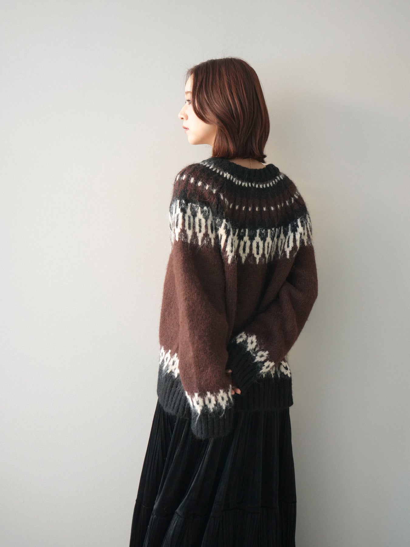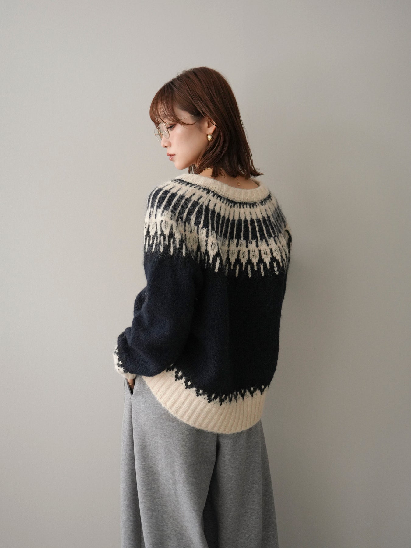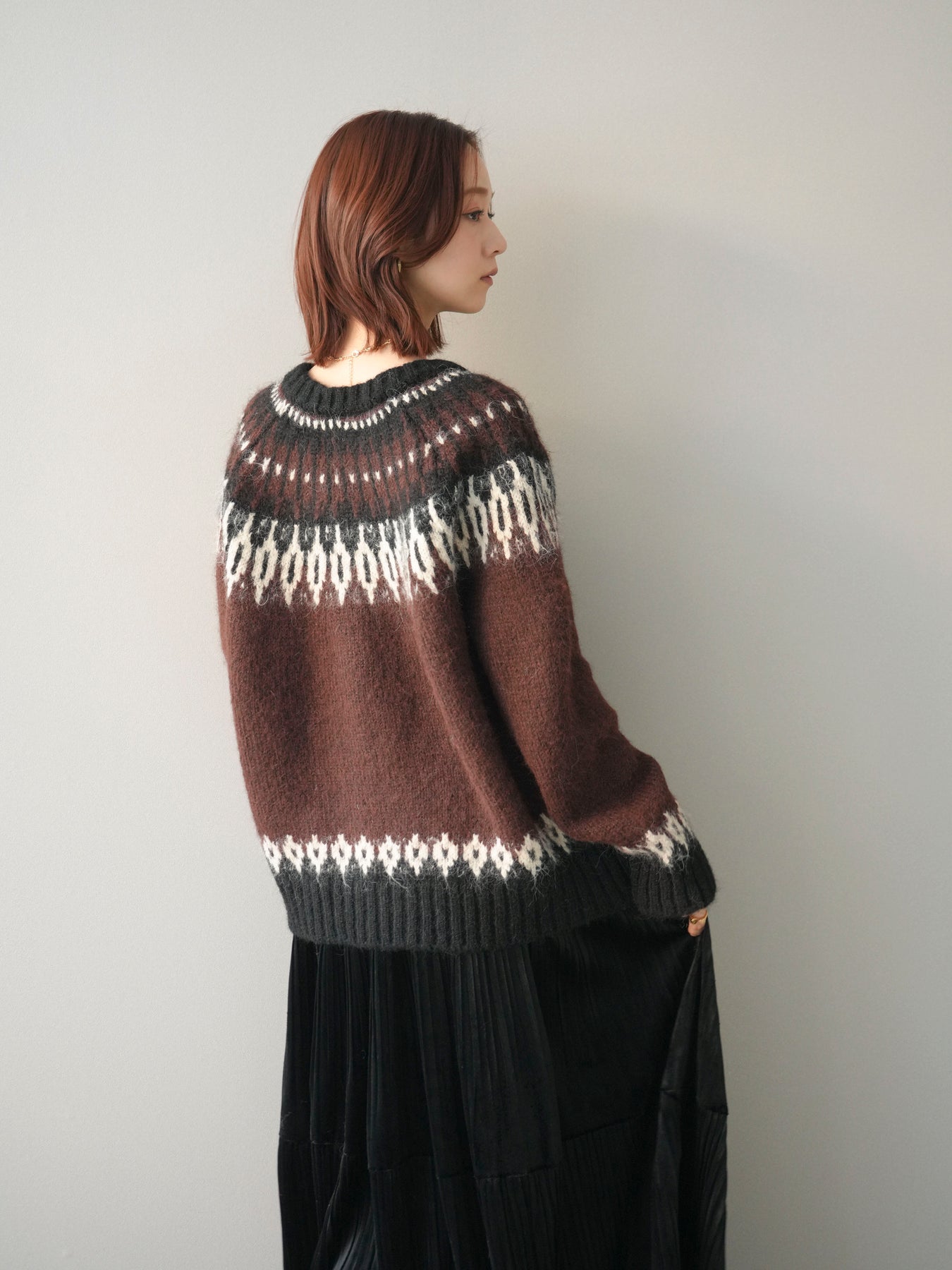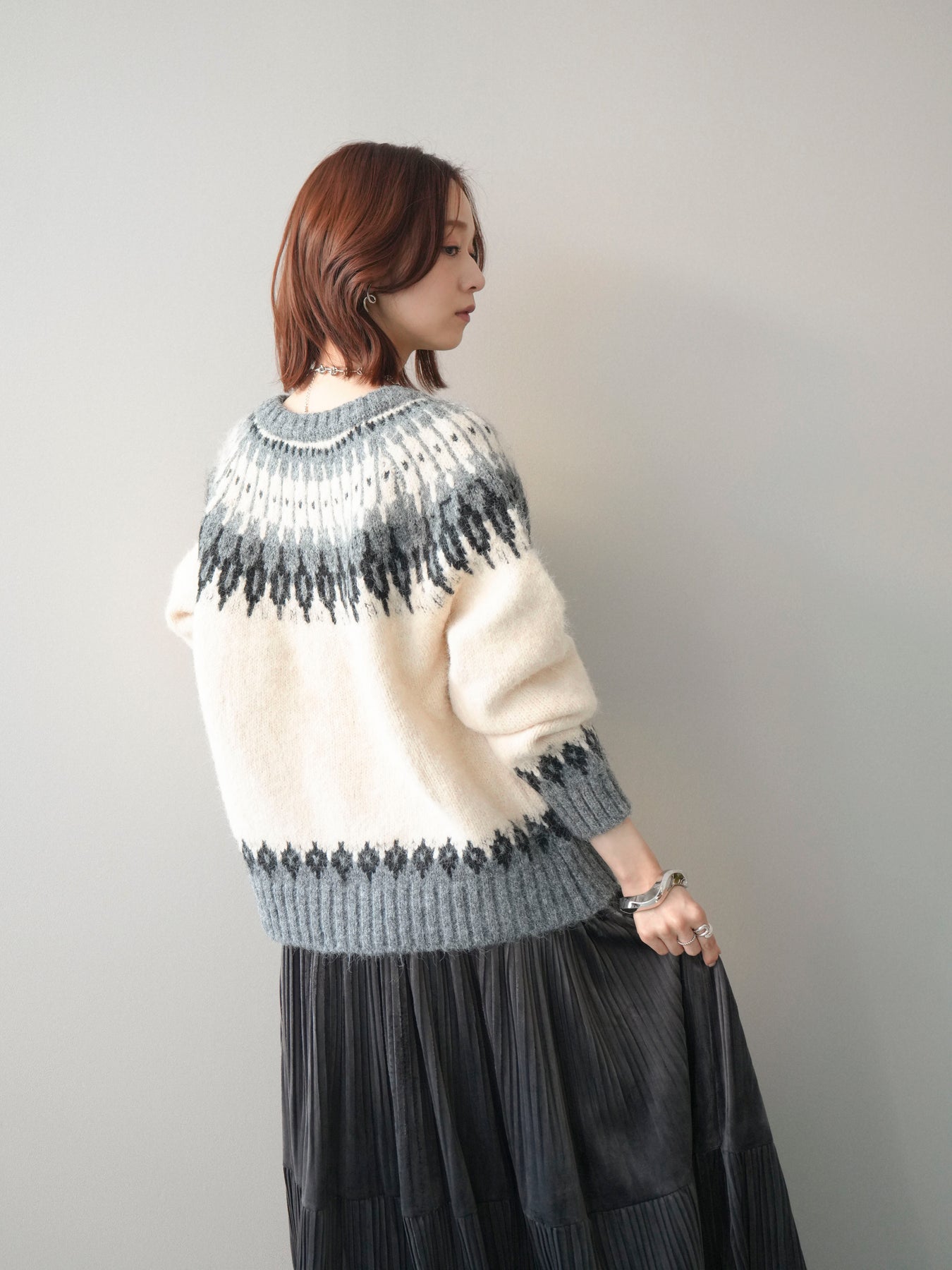 クラシカルな雰囲気漂う求心柄が目を引くニットカーディガン。 首元から広がる編み柄がスタイリングのアクセントとなり、コーディネートに存在感をプラスします。 フロントにはトグルボタンをあしらい、温かみのある表情と程よいカジュアル感を演出。 ニットならではの柔らかな風合いで、羽織るだけでシーズンムードを高めてくれます。 デニムやスカートなど幅広いアイテムと合わせやすく、デイリーに活躍する一着です。