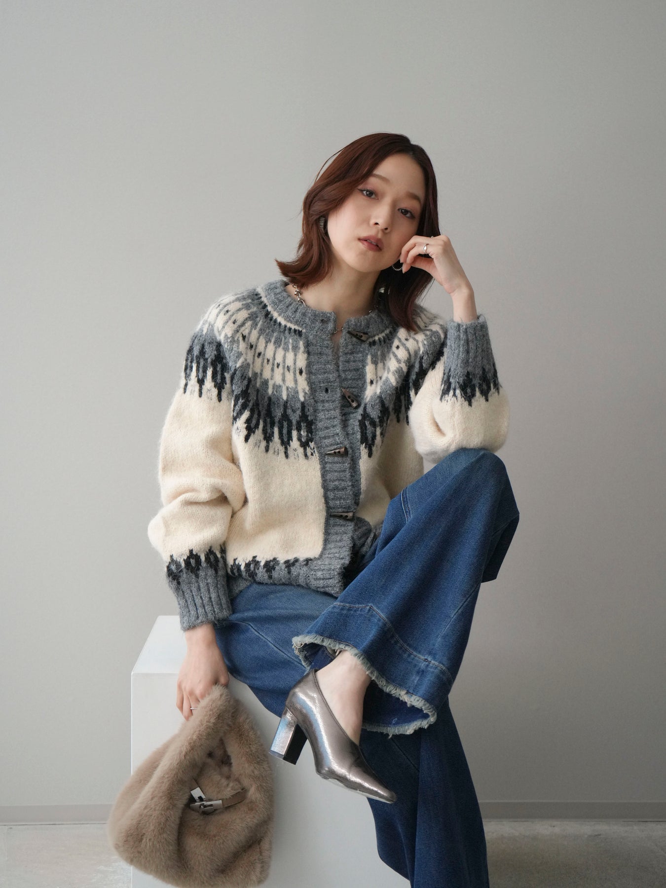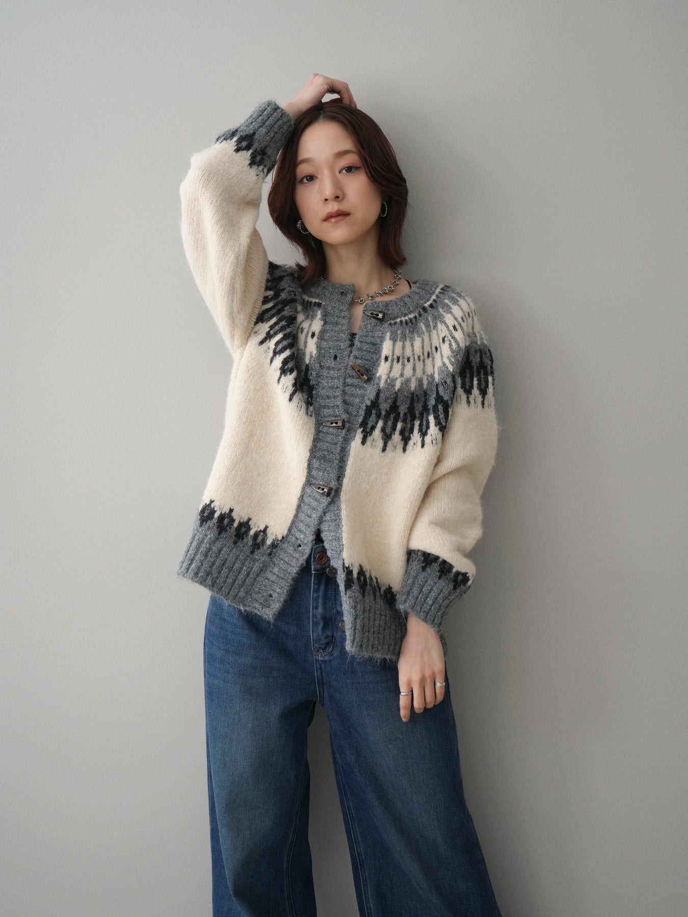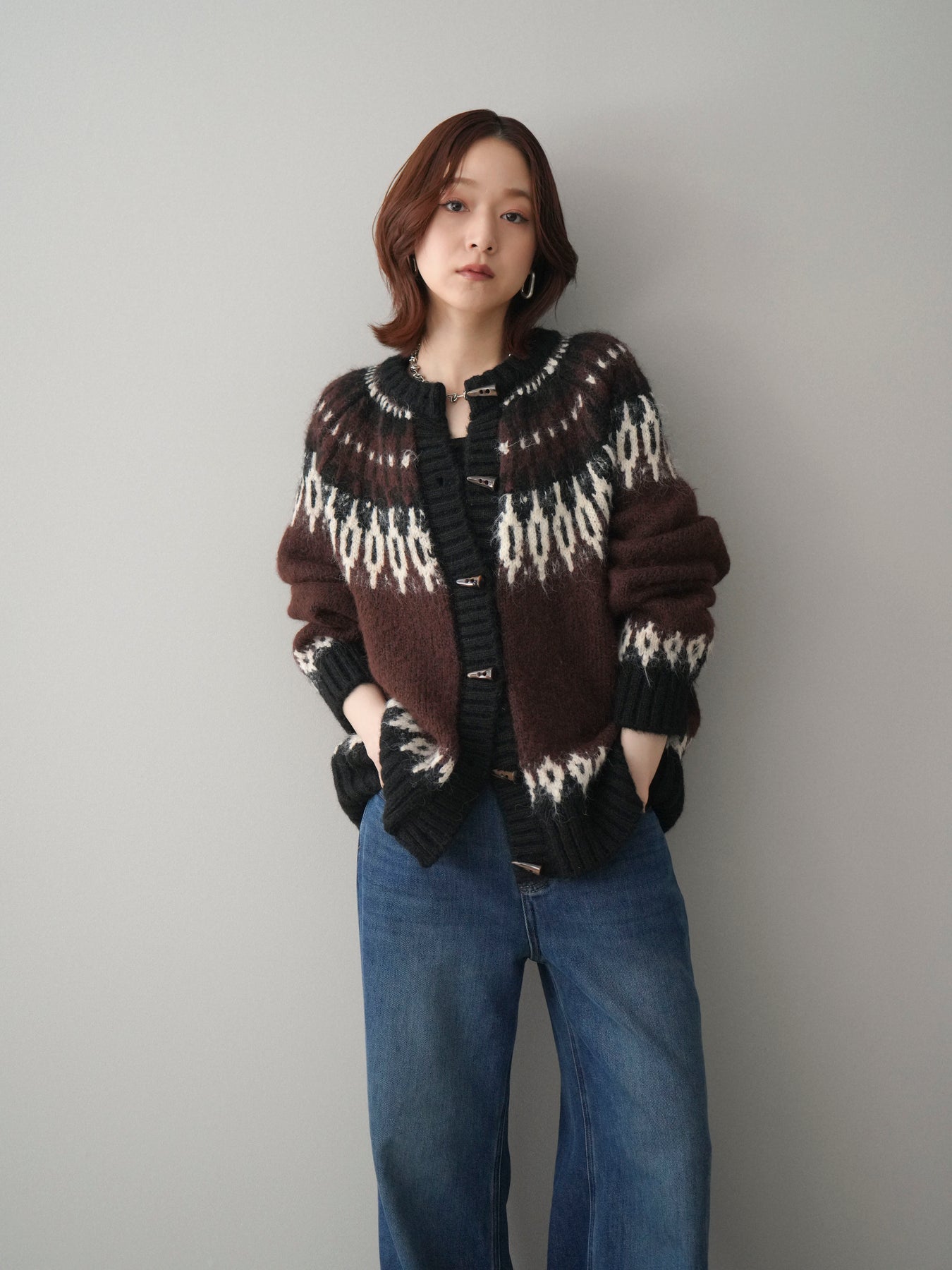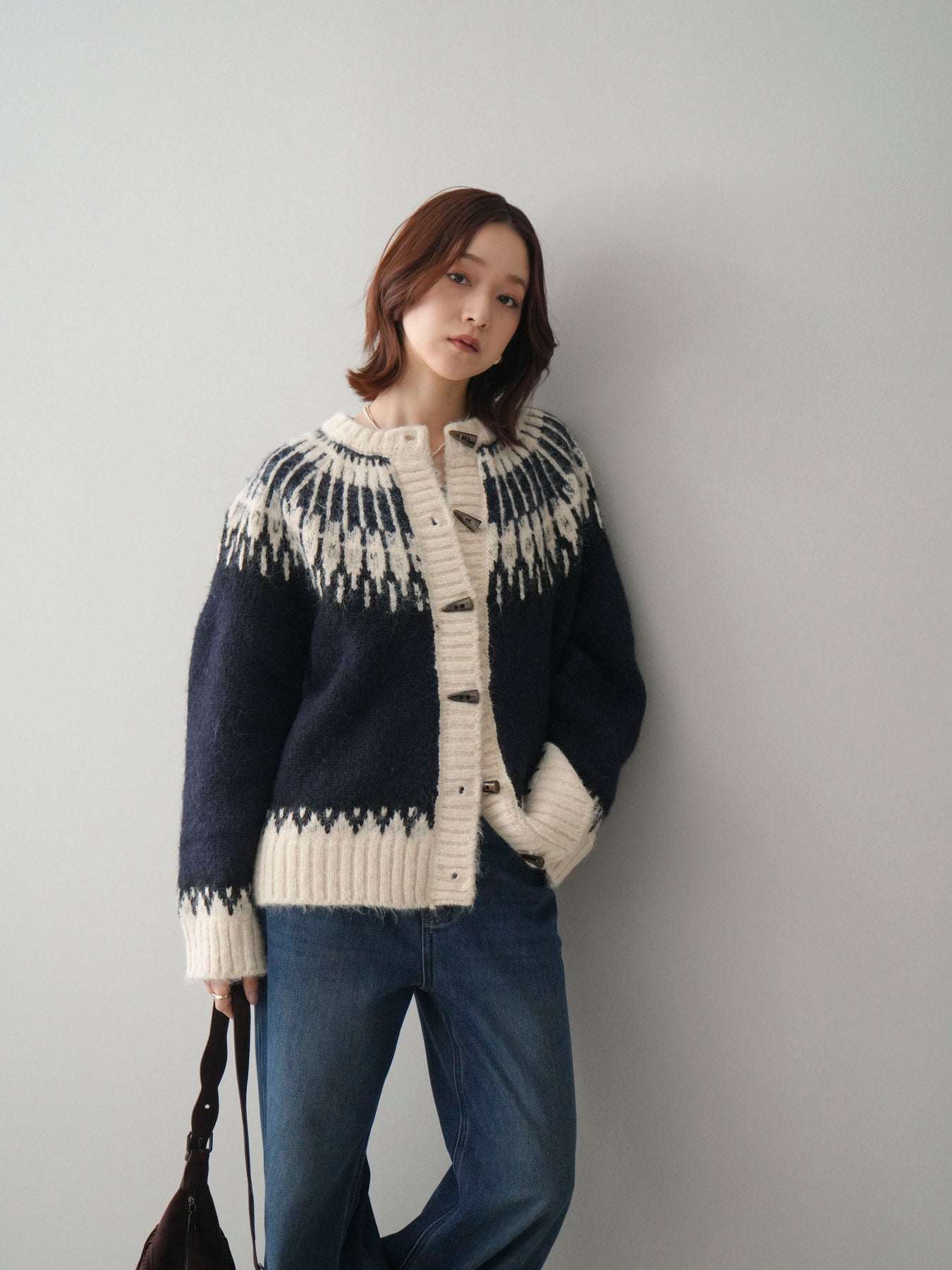 クラシカルな雰囲気漂う求心柄が目を引くニットカーディガン。 首元から広がる編み柄がスタイリングのアクセントとなり、コーディネートに存在感をプラスします。 フロントにはトグルボタンをあしらい、温かみのある表情と程よいカジュアル感を演出。 ニットならではの柔らかな風合いで、羽織るだけでシーズンムードを高めてくれます。 デニムやスカートなど幅広いアイテムと合わせやすく、デイリーに活躍する一着です。