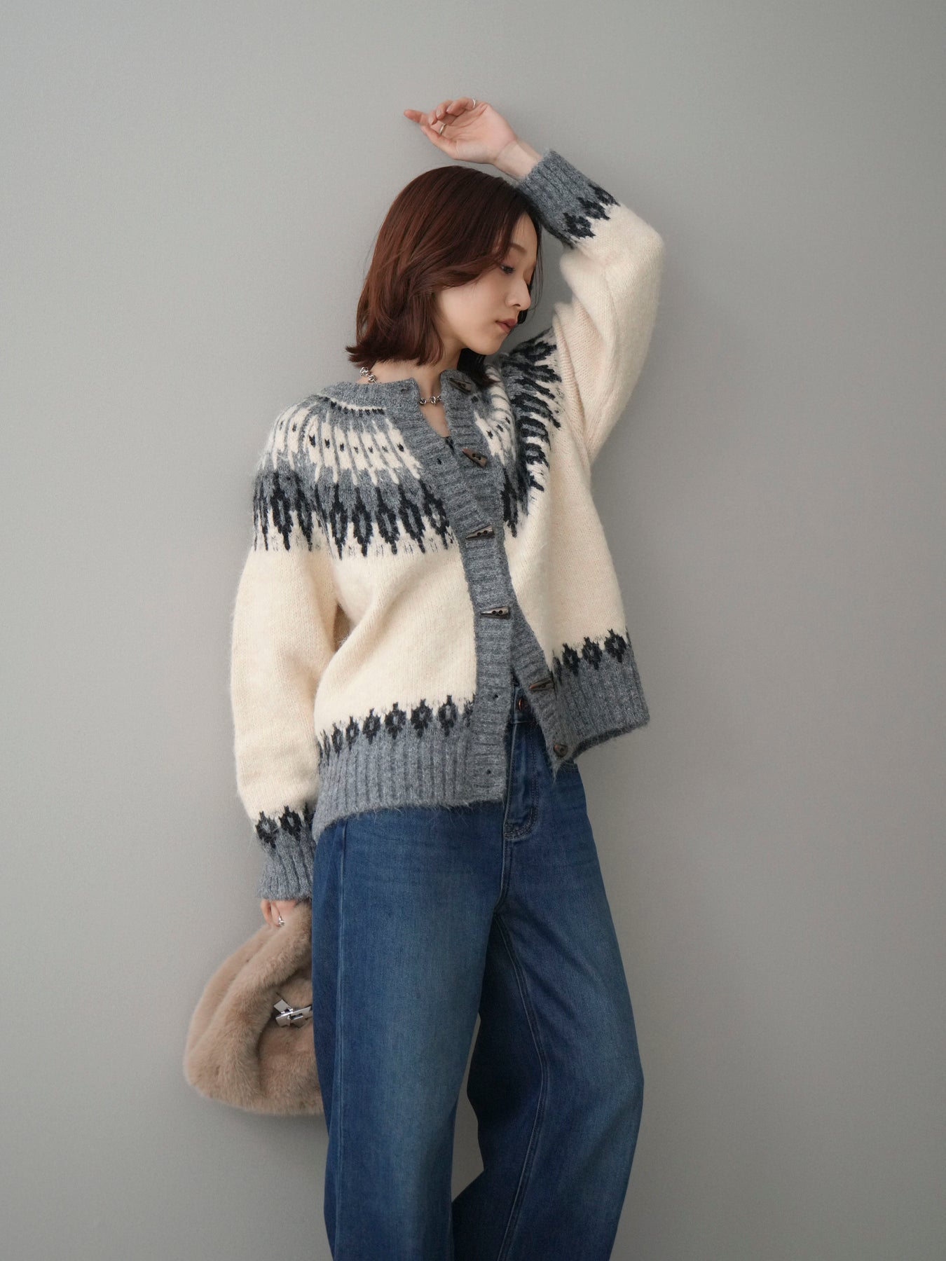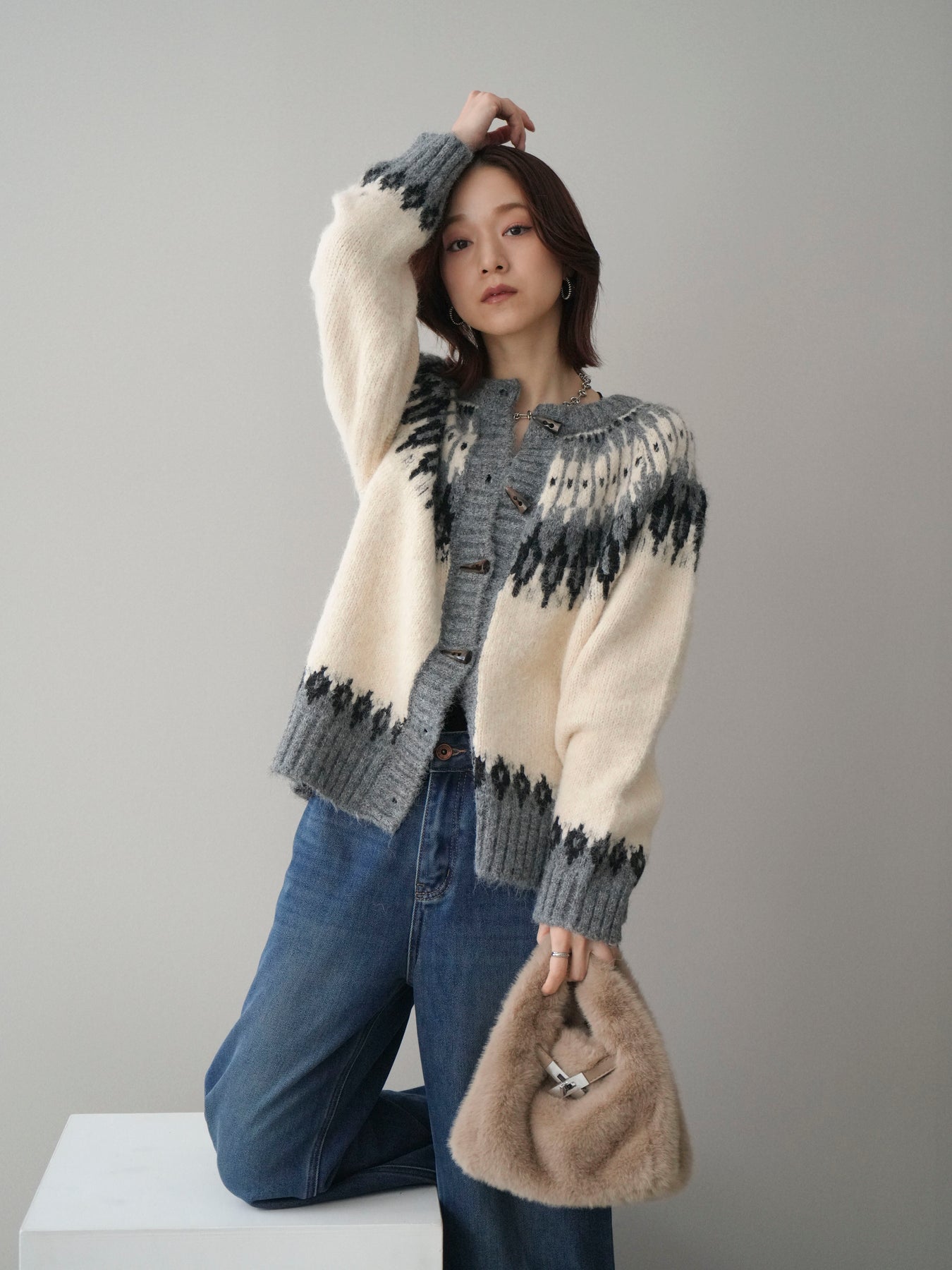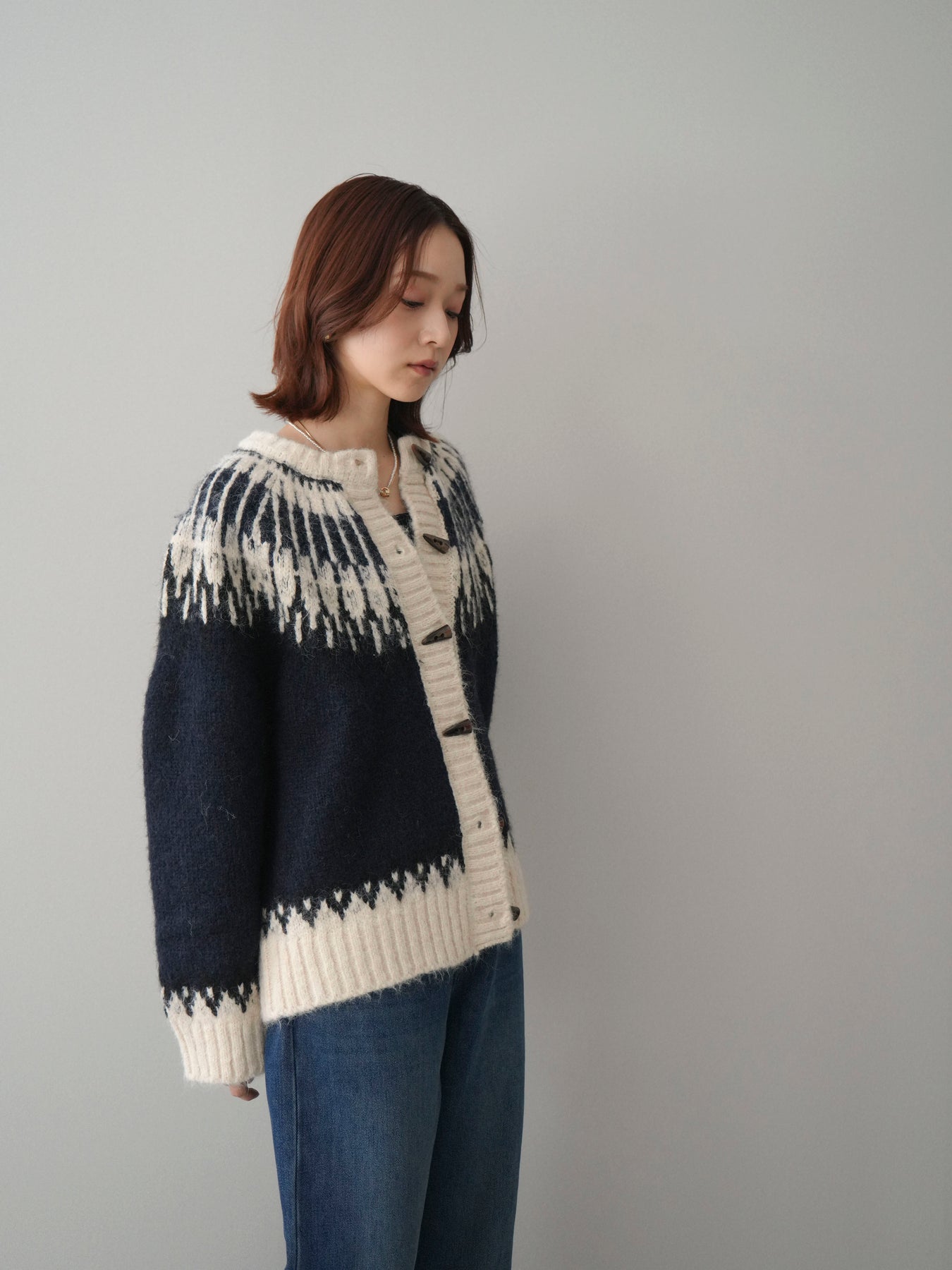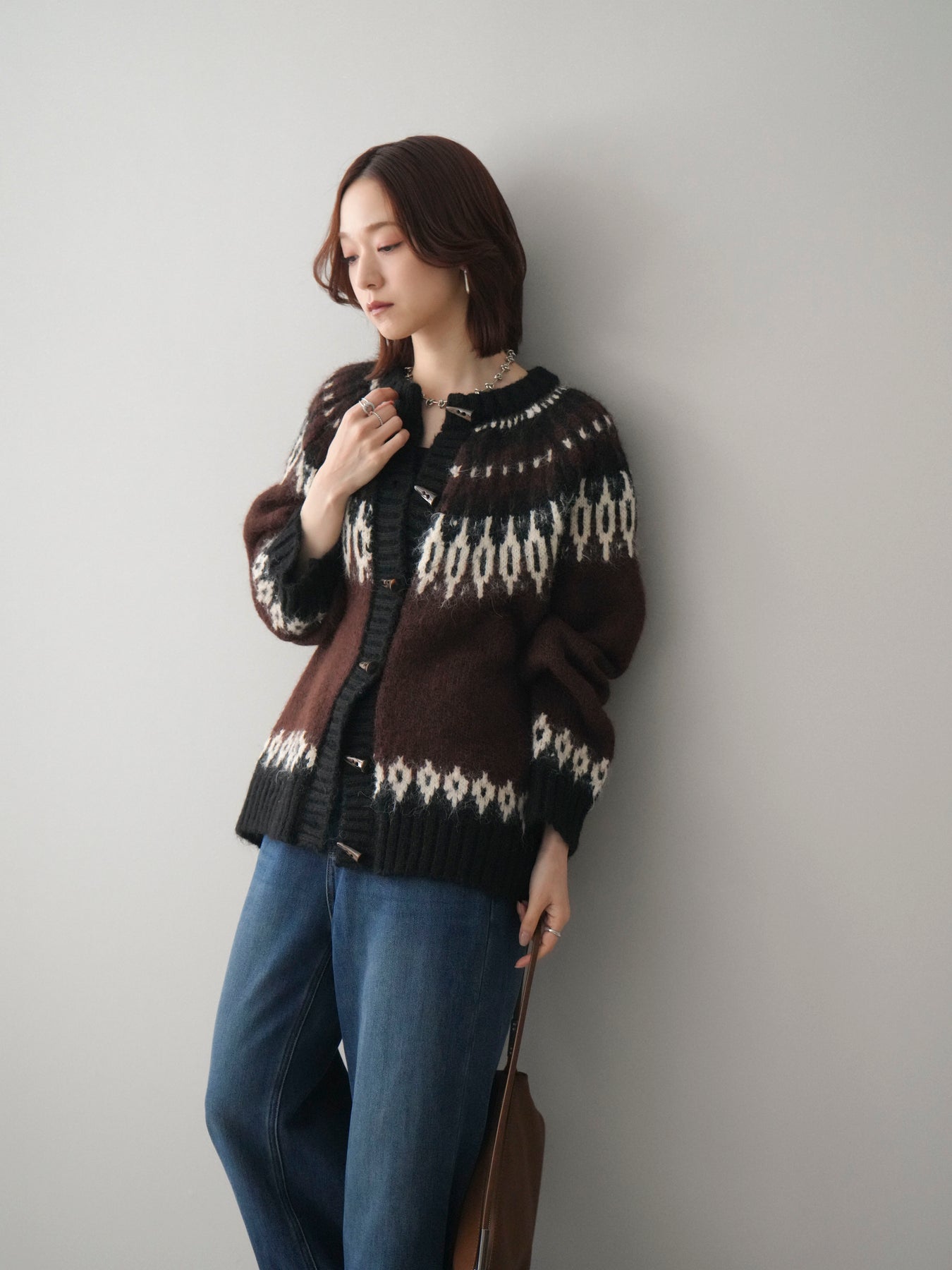 クラシカルな雰囲気漂う求心柄が目を引くニットカーディガン。 首元から広がる編み柄がスタイリングのアクセントとなり、コーディネートに存在感をプラスします。 フロントにはトグルボタンをあしらい、温かみのある表情と程よいカジュアル感を演出。 ニットならではの柔らかな風合いで、羽織るだけでシーズンムードを高めてくれます。 デニムやスカートなど幅広いアイテムと合わせやすく、デイリーに活躍する一着です。