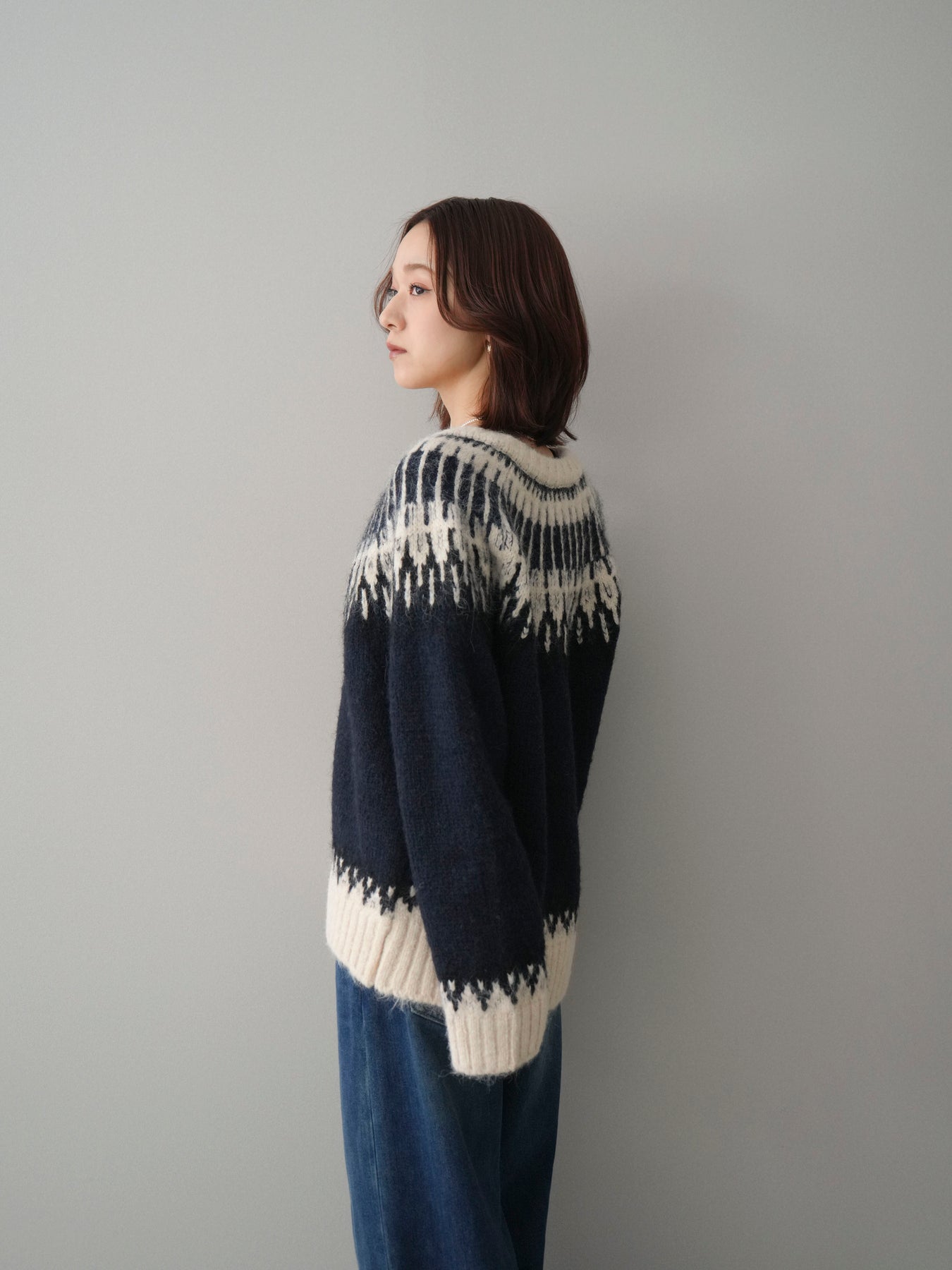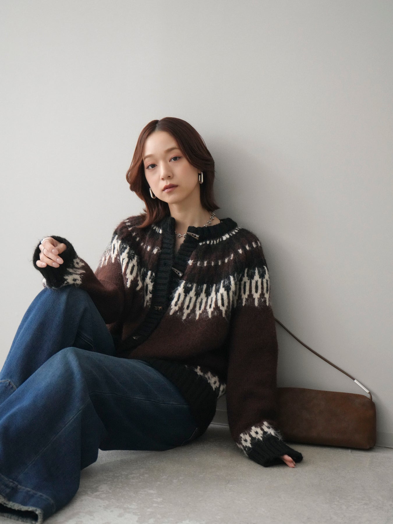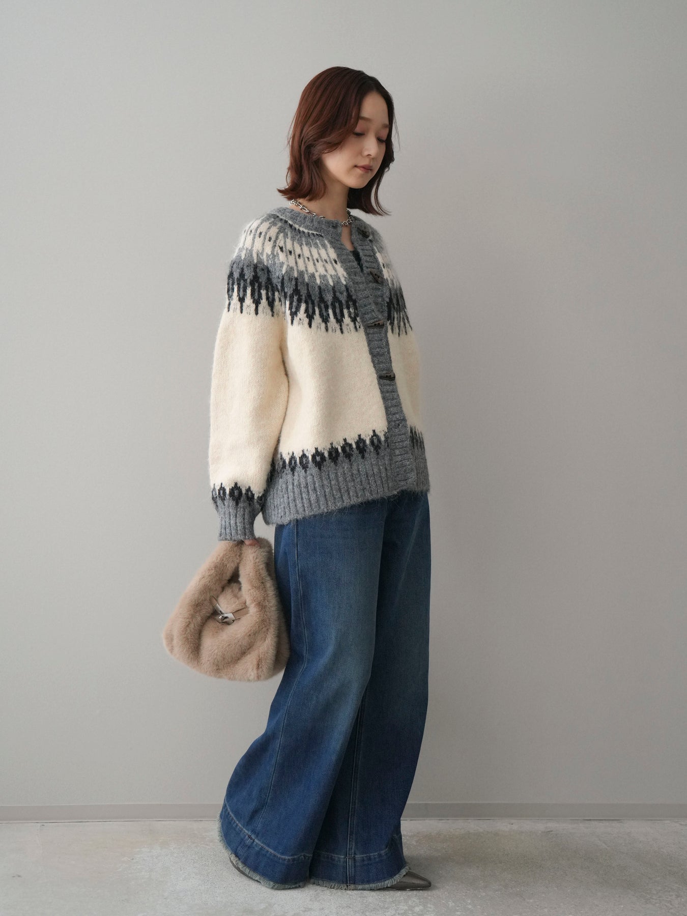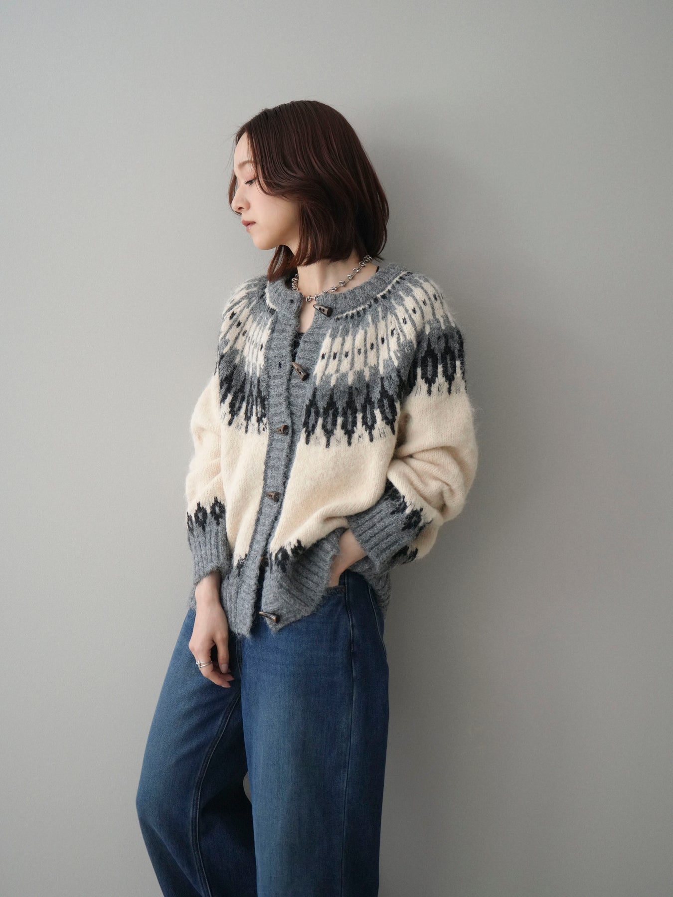クラシカルな雰囲気漂う求心柄が目を引くニットカーディガン。 首元から広がる編み柄がスタイリングのアクセントとなり、コーディネートに存在感をプラスします。 フロントにはトグルボタンをあしらい、温かみのある表情と程よいカジュアル感を演出。 ニットならではの柔らかな風合いで、羽織るだけでシーズンムードを高めてくれます。 デニムやスカートなど幅広いアイテムと合わせやすく、デイリーに活躍する一着です。