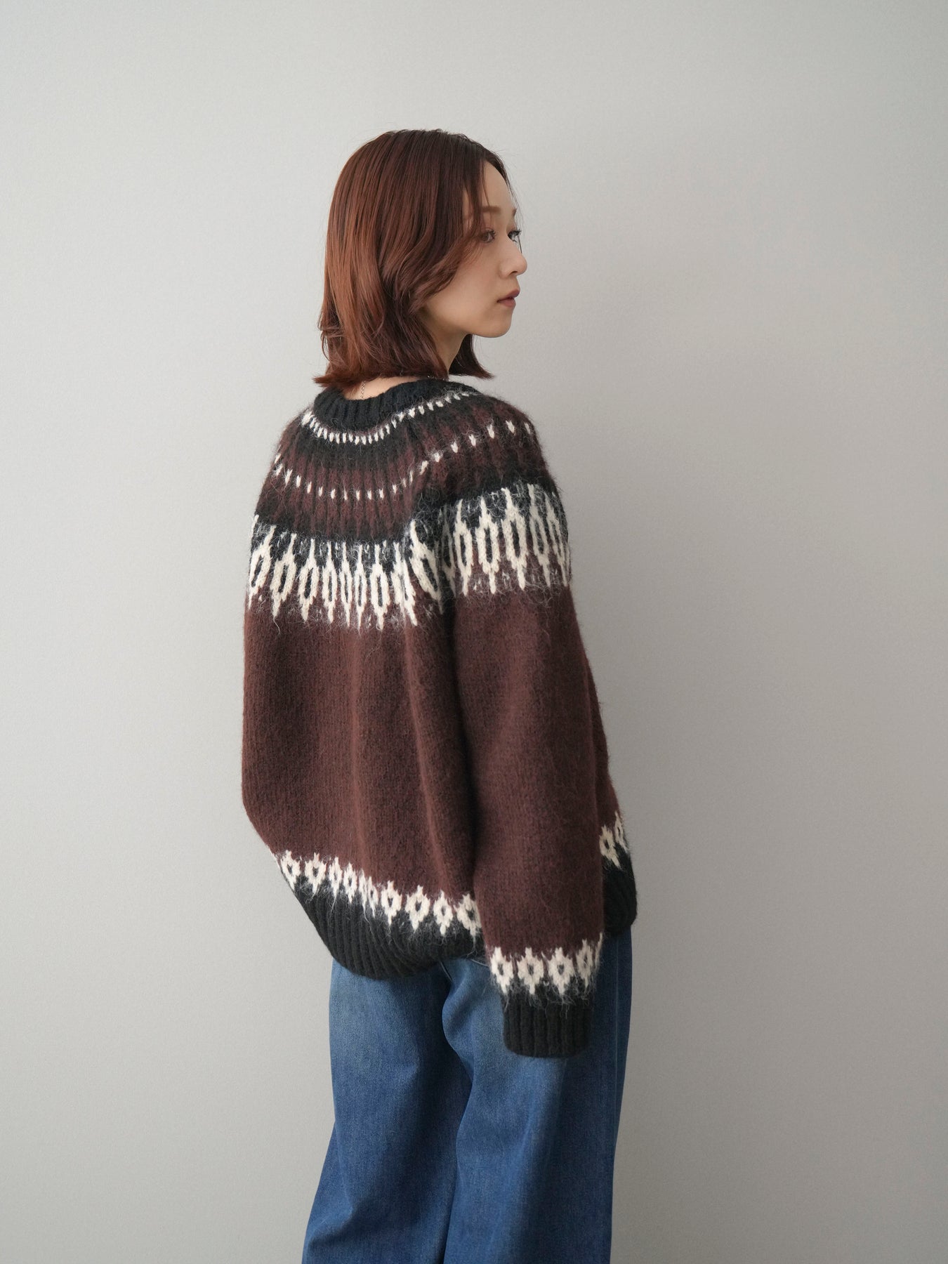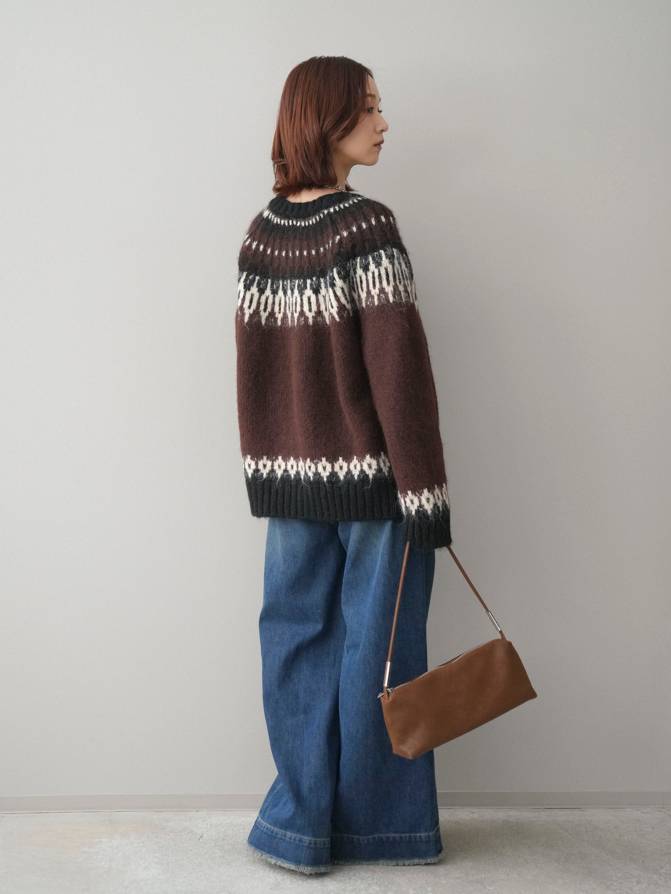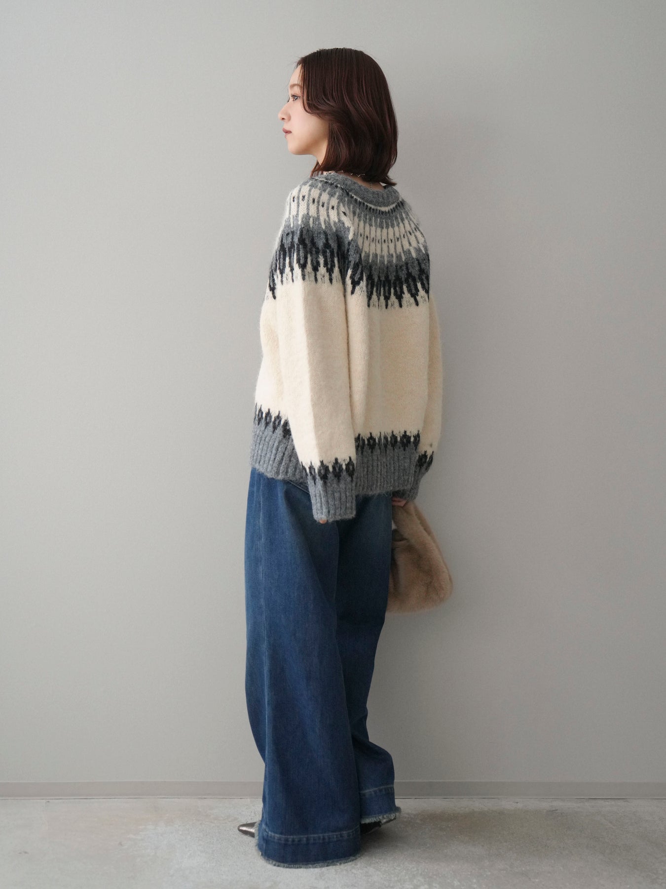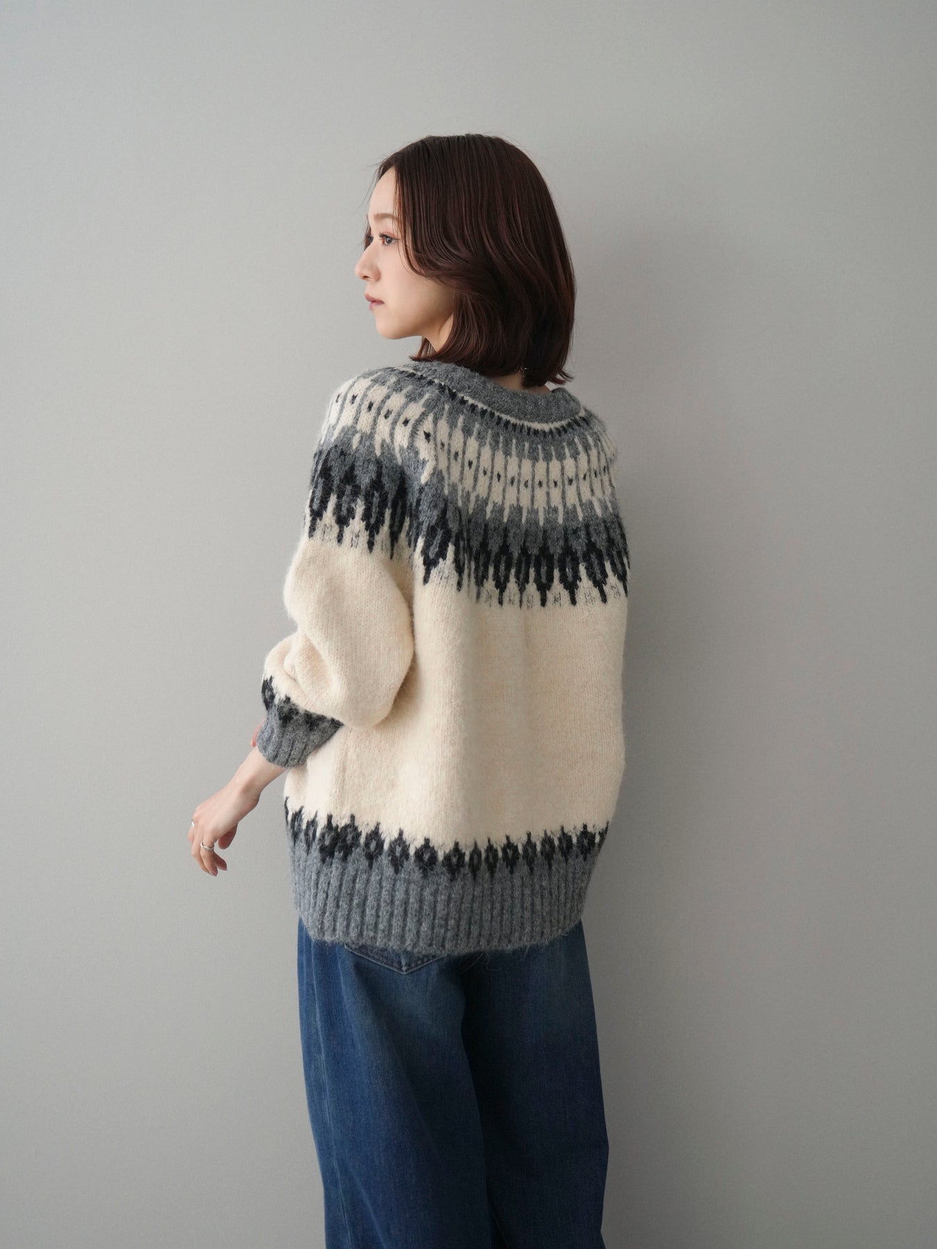 クラシカルな雰囲気漂う求心柄が目を引くニットカーディガン。 首元から広がる編み柄がスタイリングのアクセントとなり、コーディネートに存在感をプラスします。 フロントにはトグルボタンをあしらい、温かみのある表情と程よいカジュアル感を演出。 ニットならではの柔らかな風合いで、羽織るだけでシーズンムードを高めてくれます。 デニムやスカートなど幅広いアイテムと合わせやすく、デイリーに活躍する一着です。