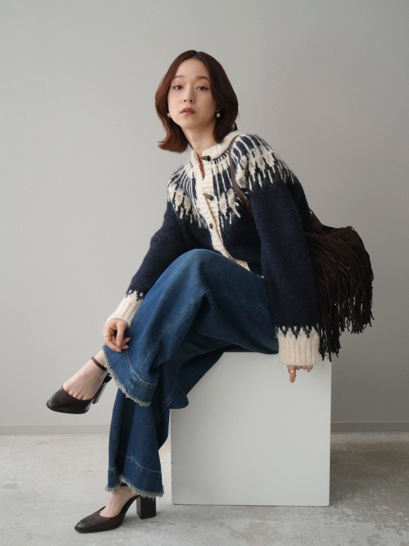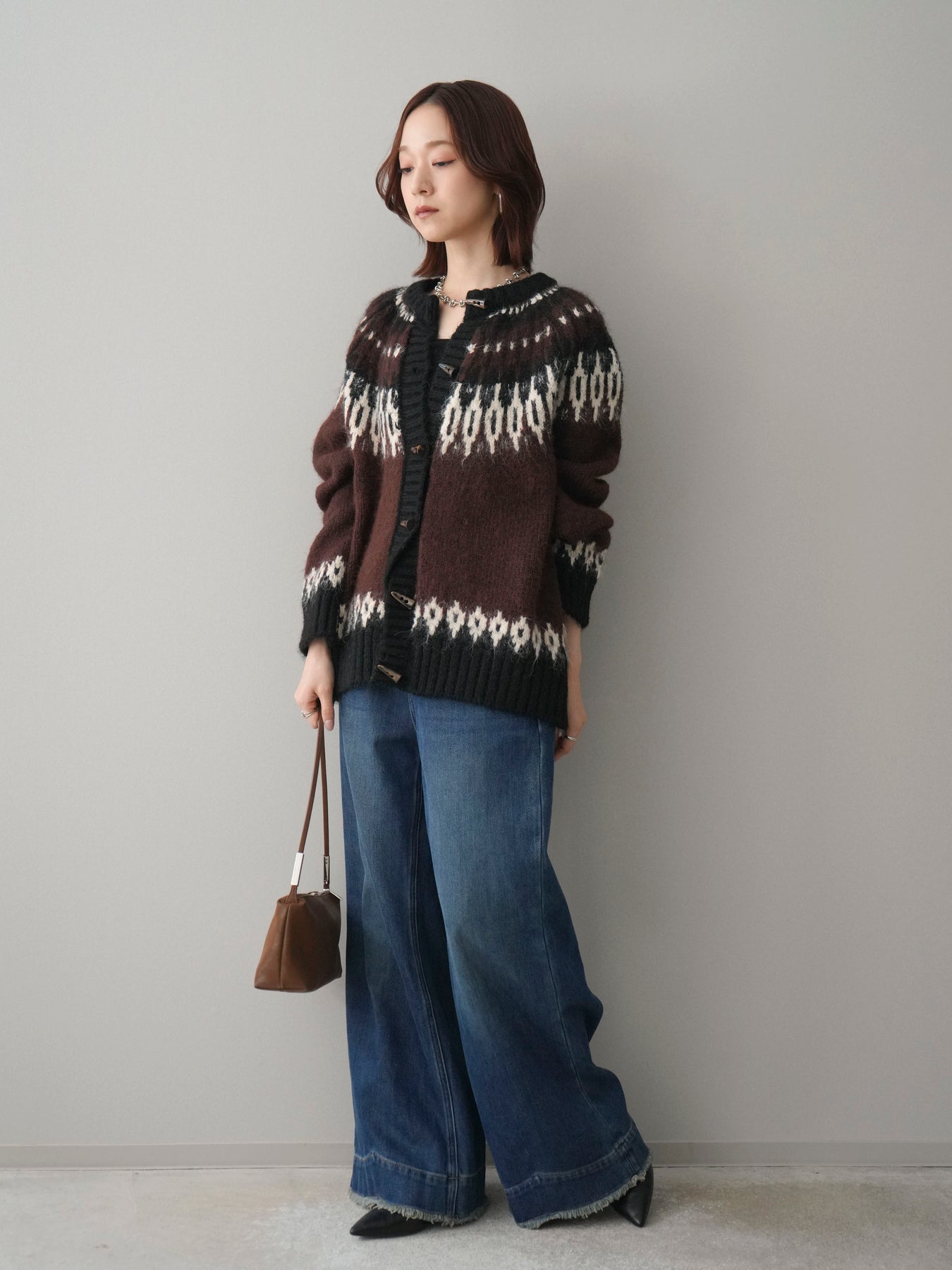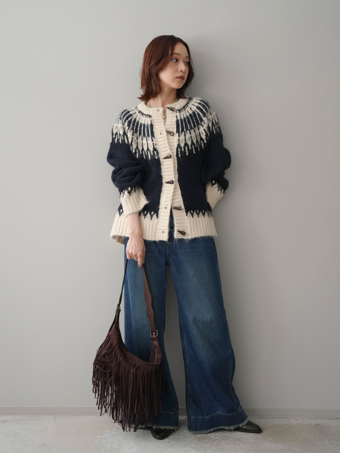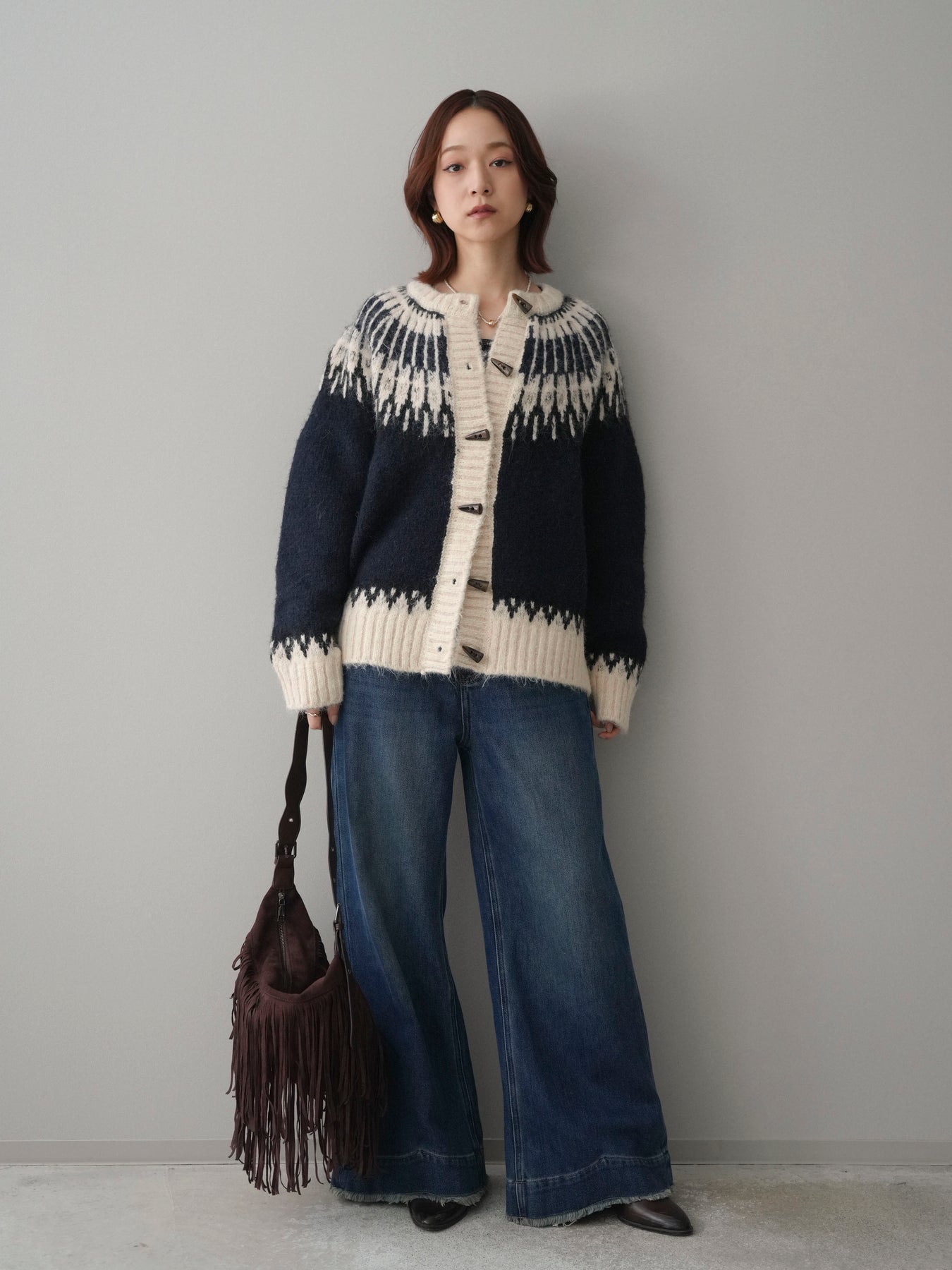 [SET]トグルボタン求心柄ニットカーディガン+裏起毛裾フリンジワイドデニムパンツ(2set)