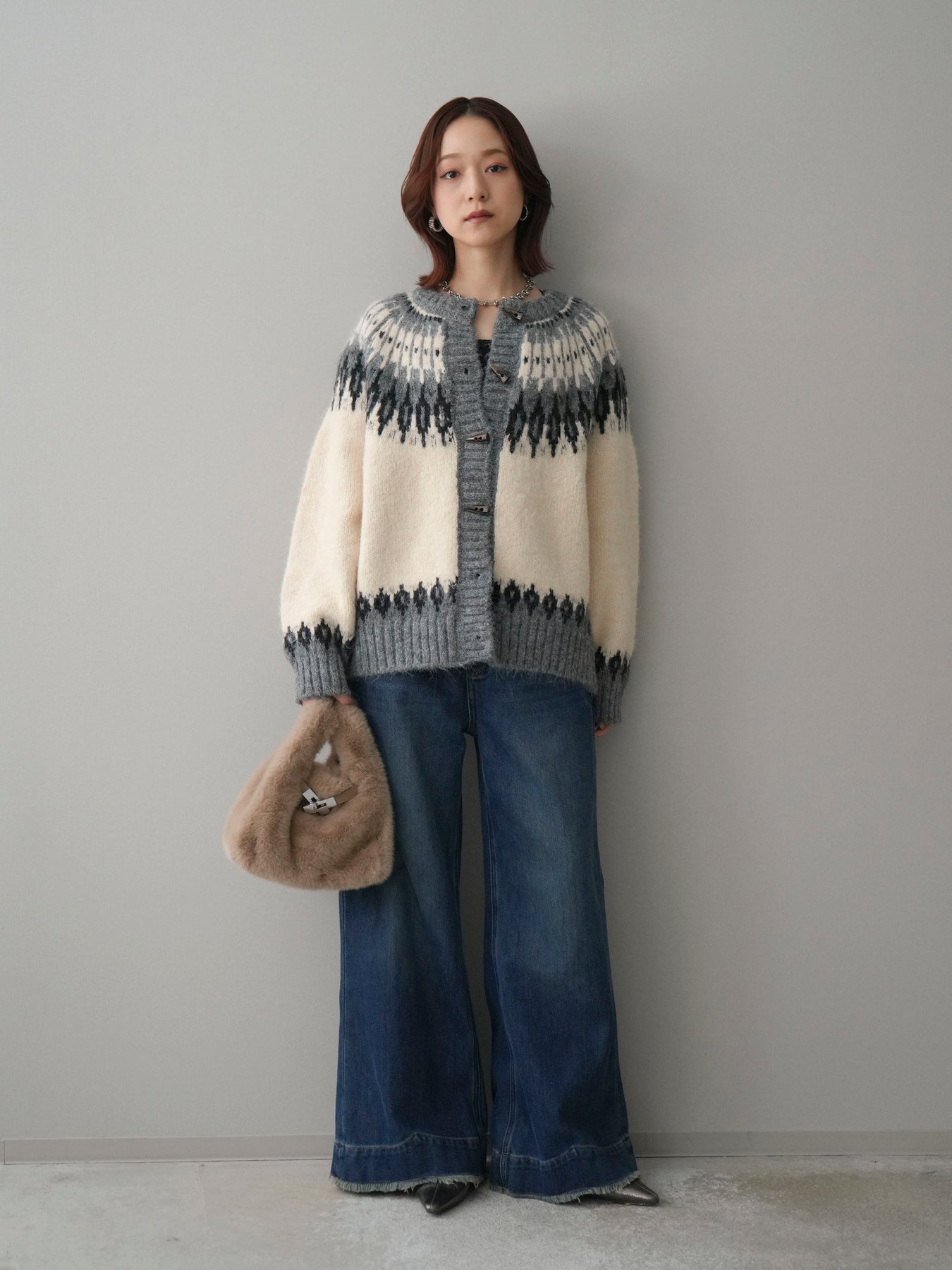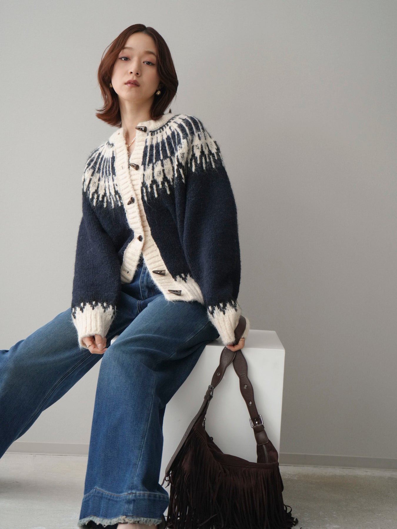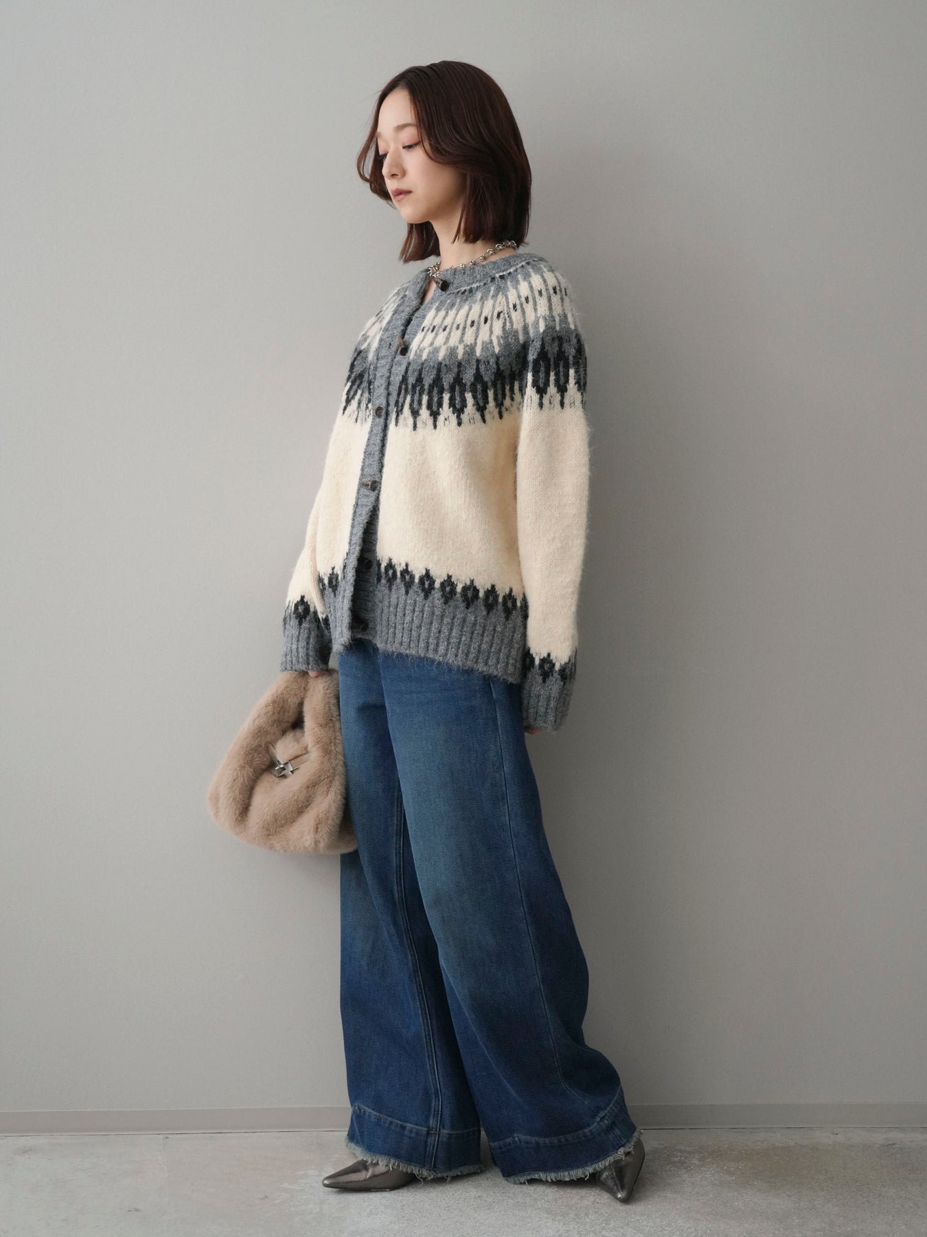 [SET]トグルボタン求心柄ニットカーディガン+裏起毛裾フリンジワイドデニムパンツ(2set)