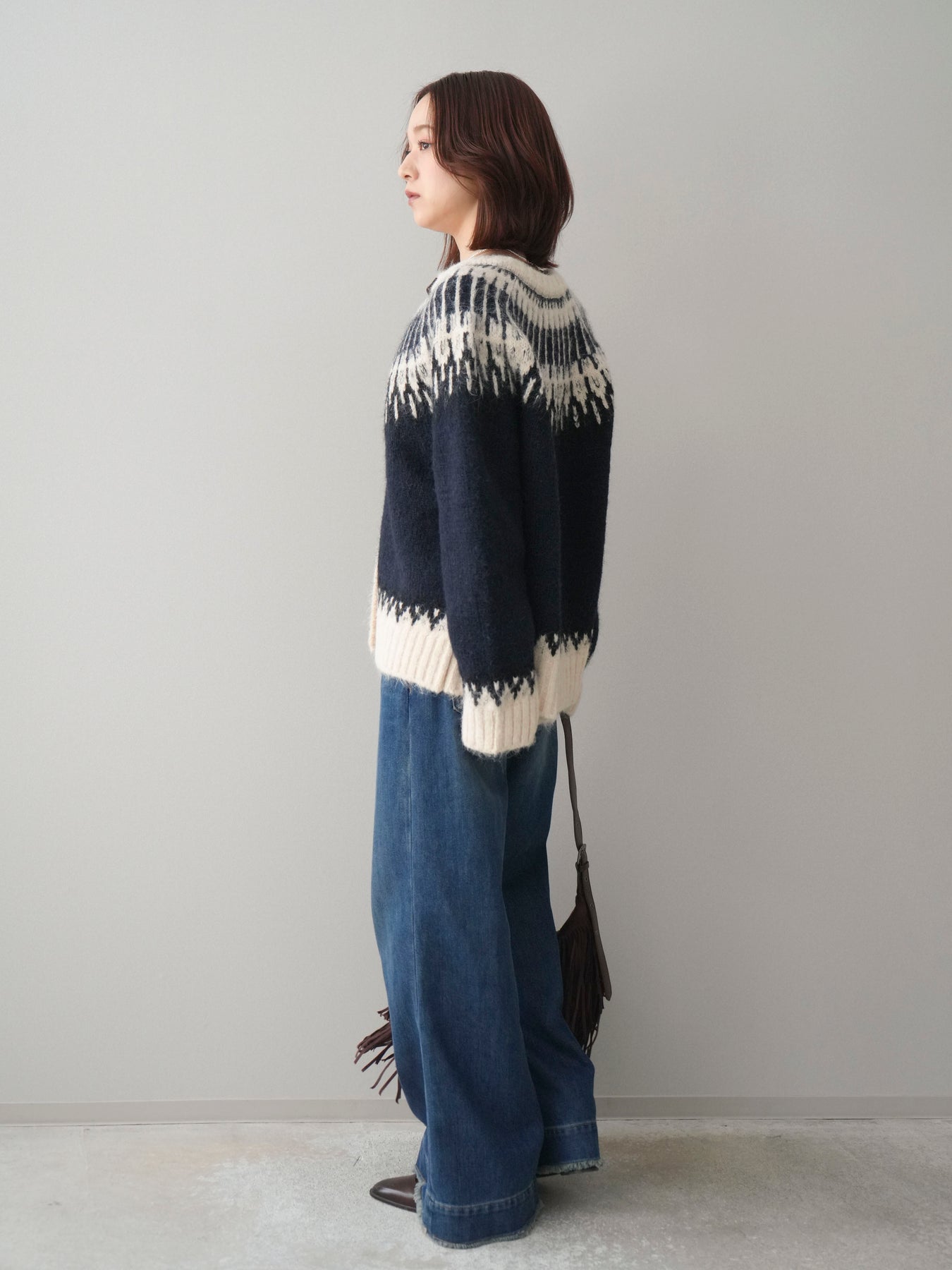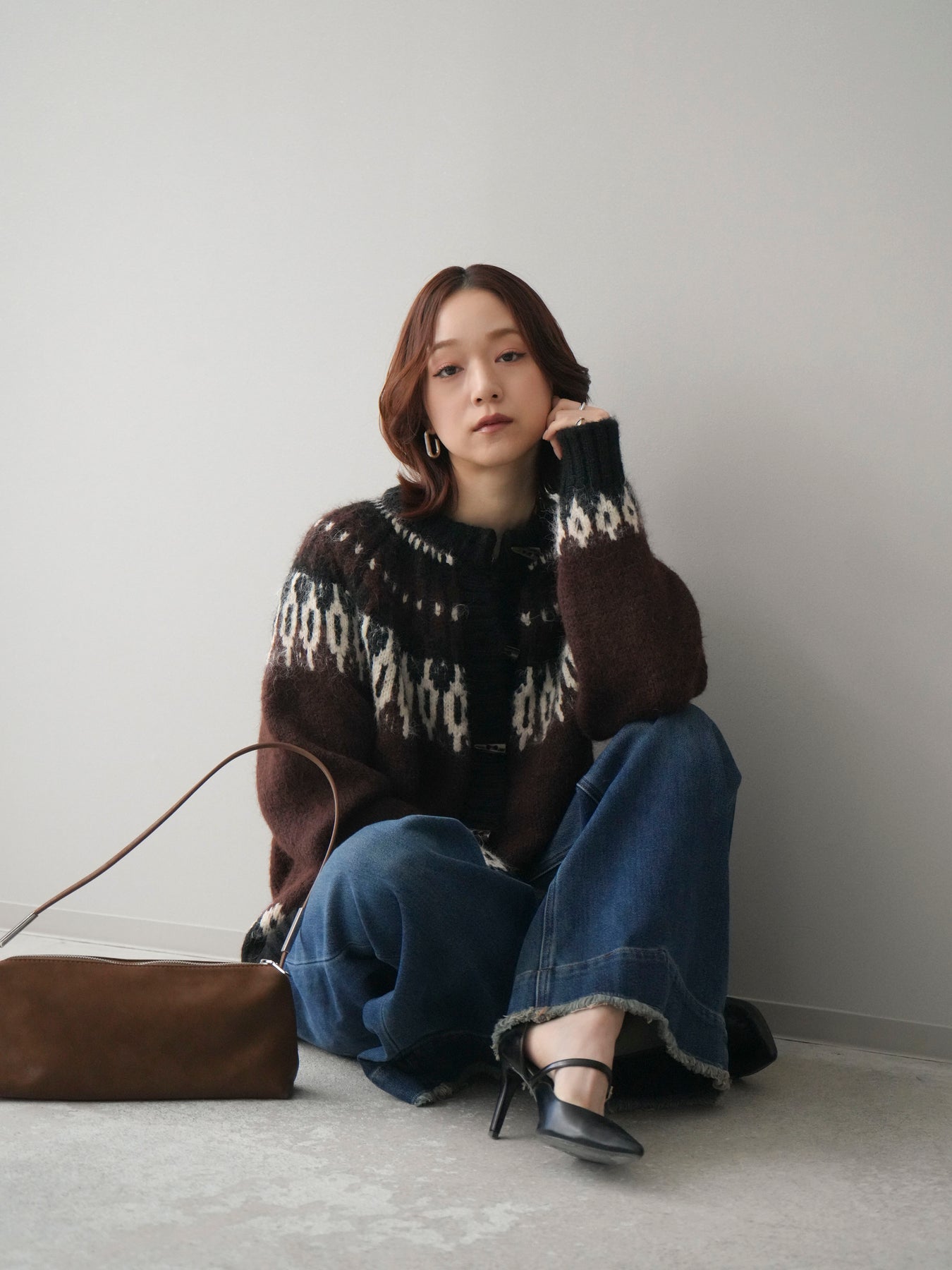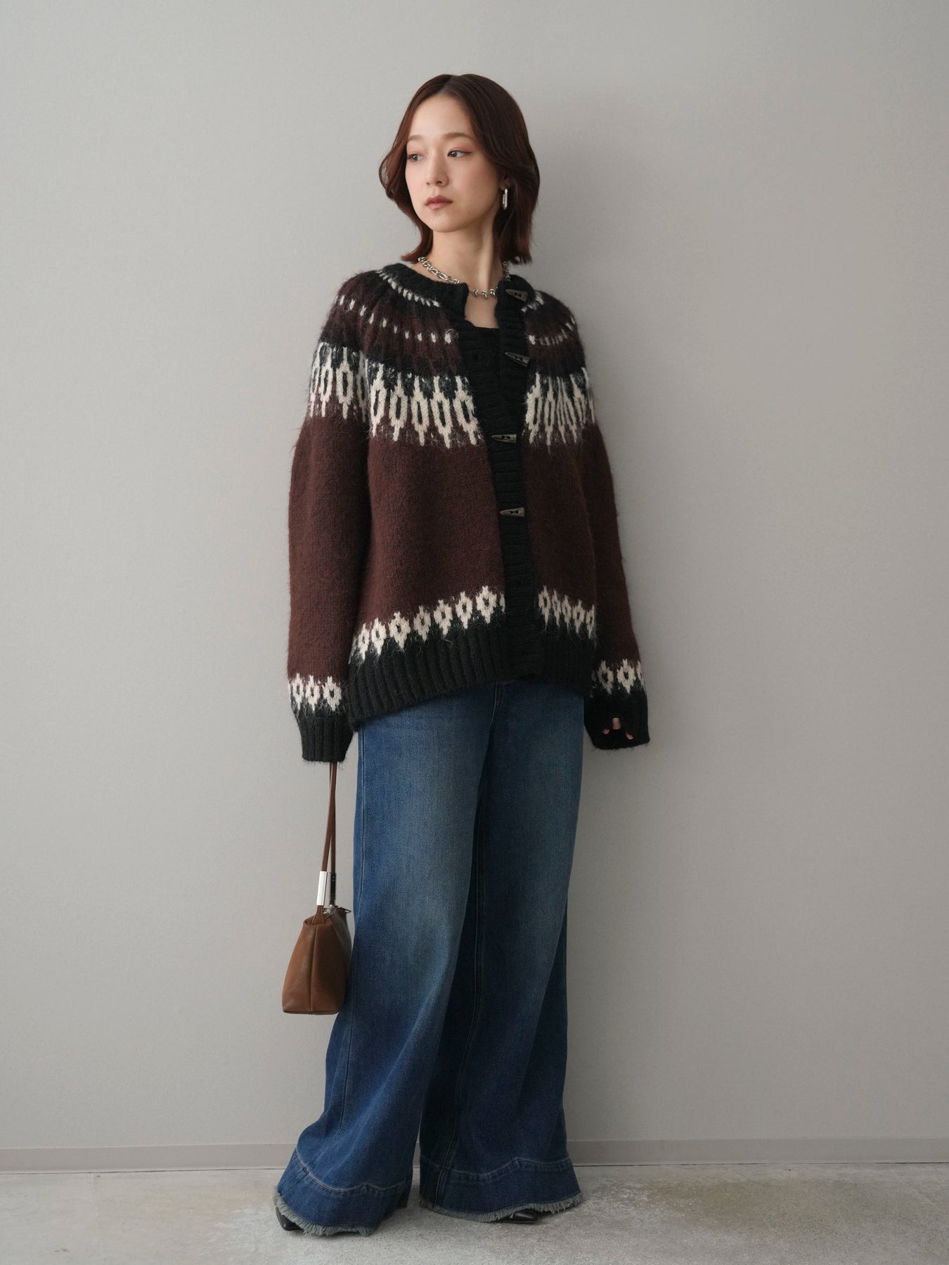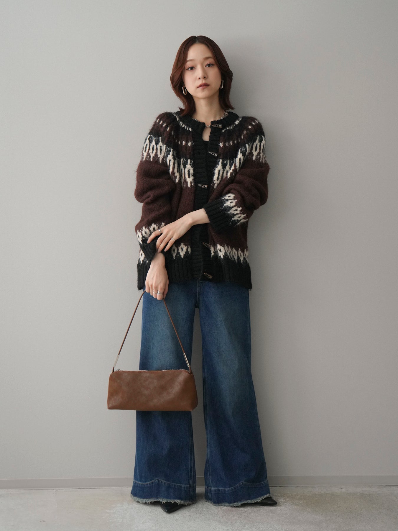 [SET]トグルボタン求心柄ニットカーディガン+裏起毛裾フリンジワイドデニムパンツ(2set)
