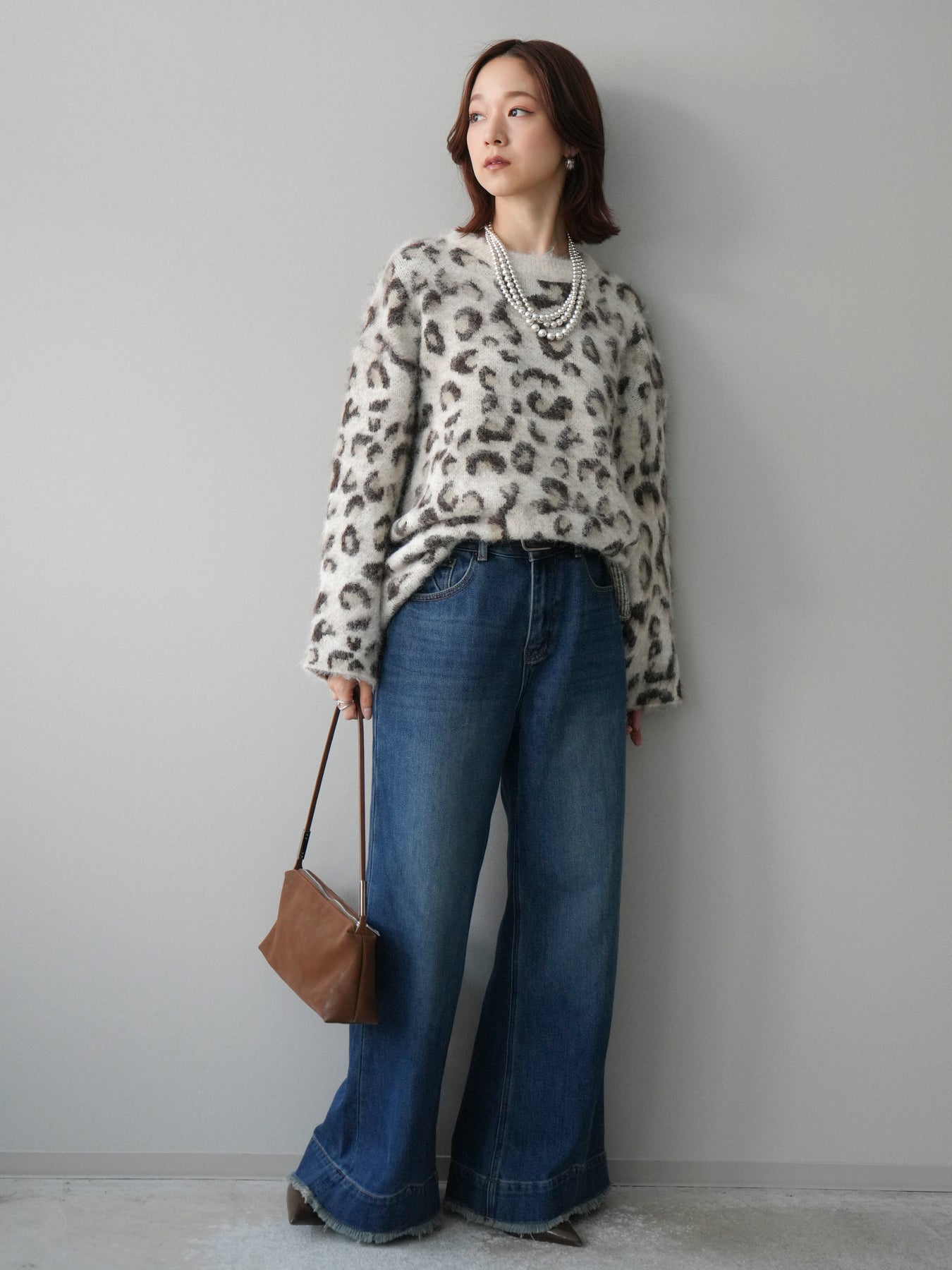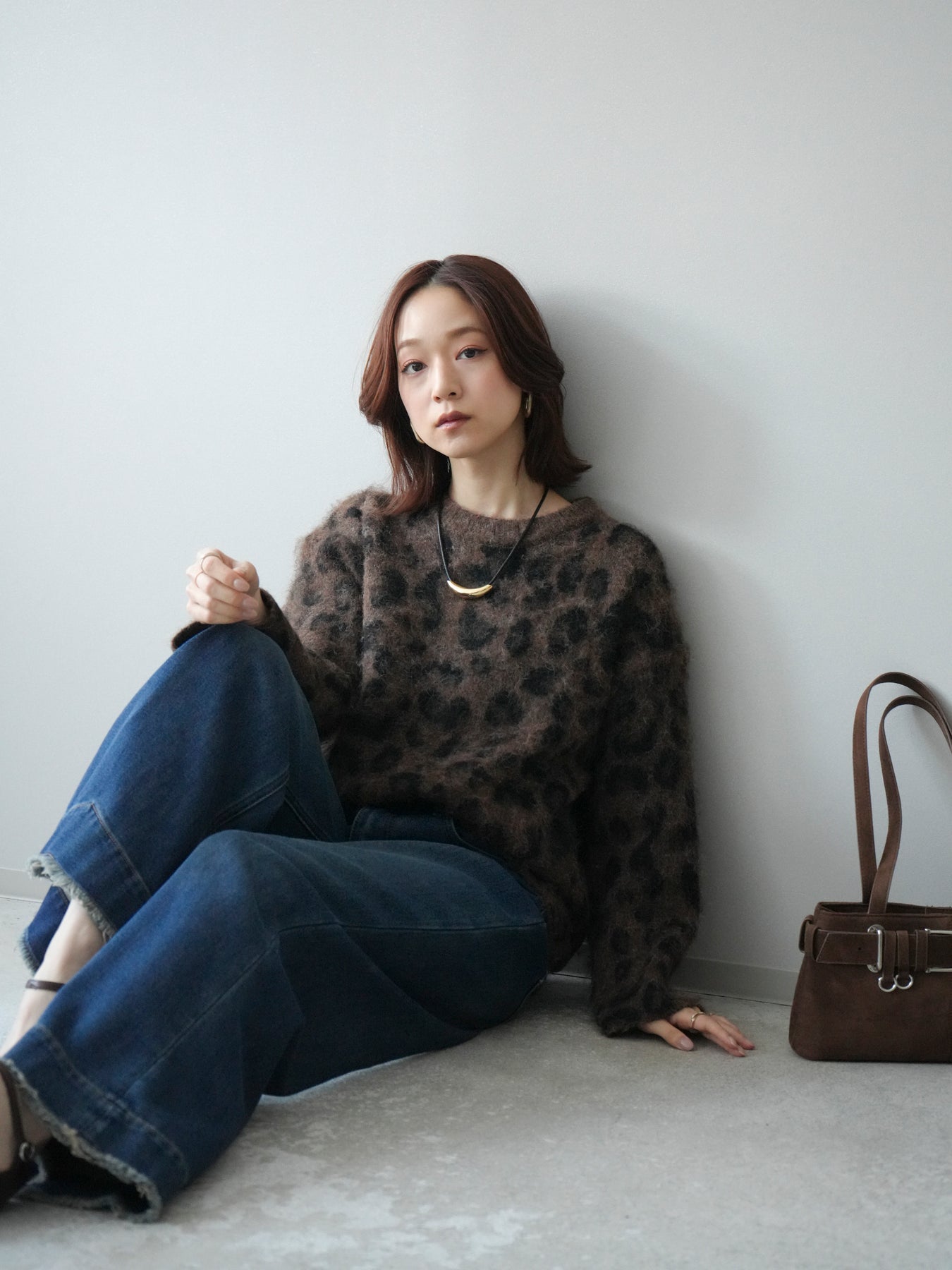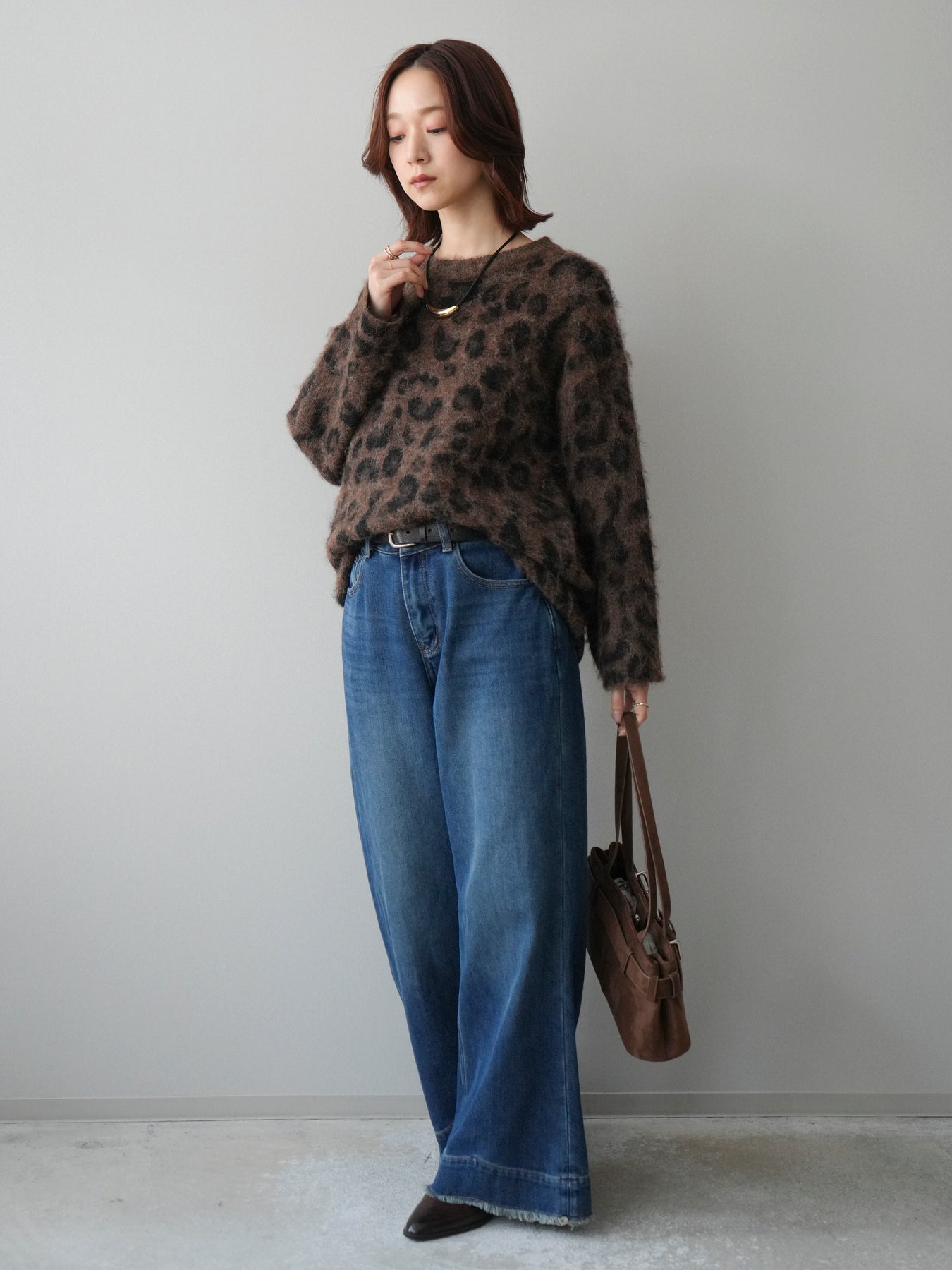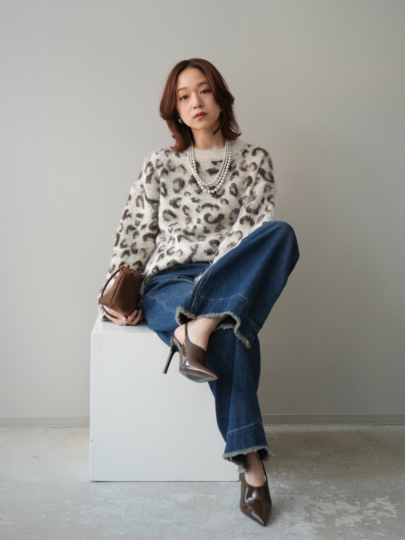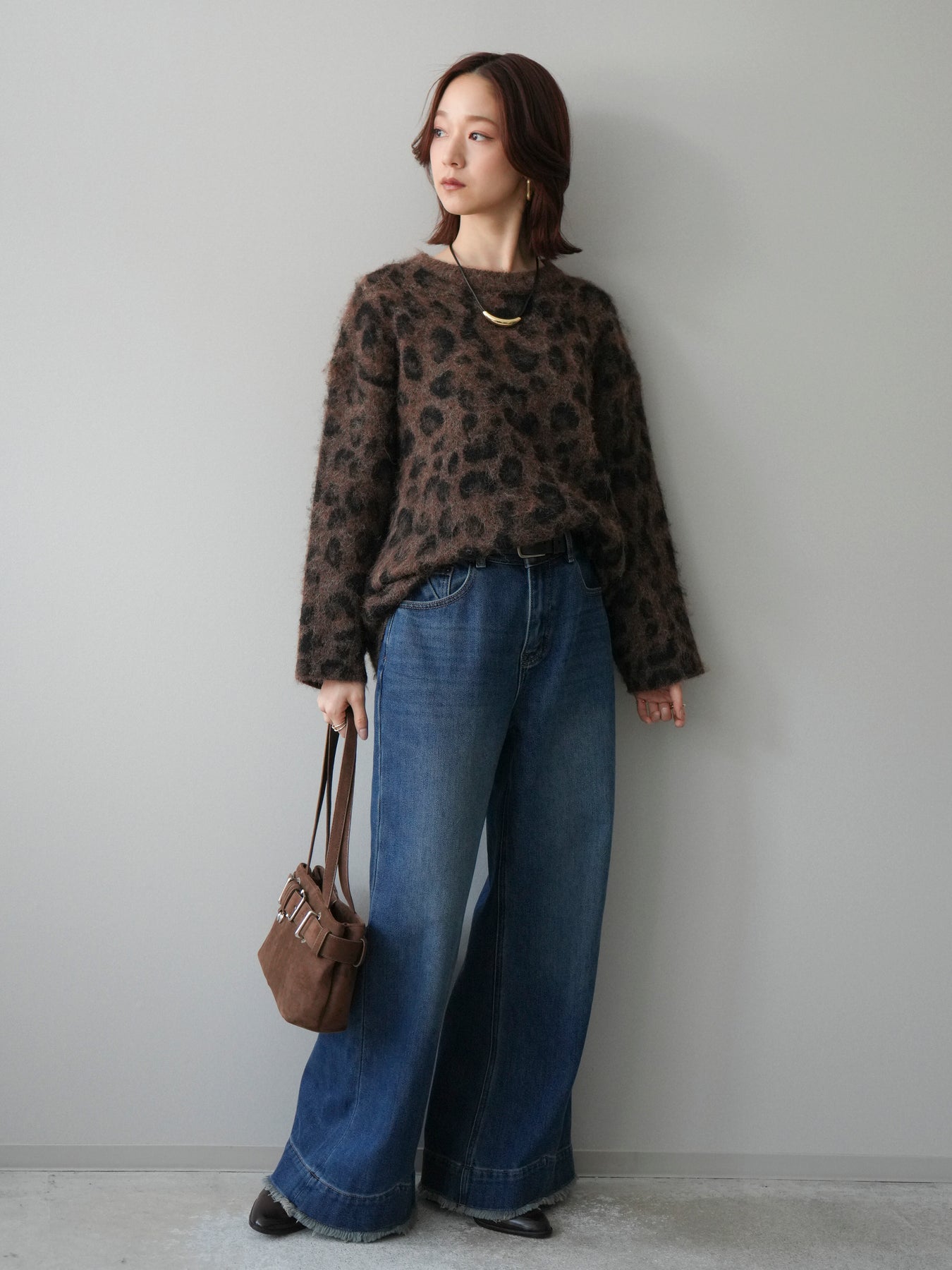 [SET]レオパードシャギーニットプルオーバー+裏起毛裾フリンジワイドデニムパンツ(2set)