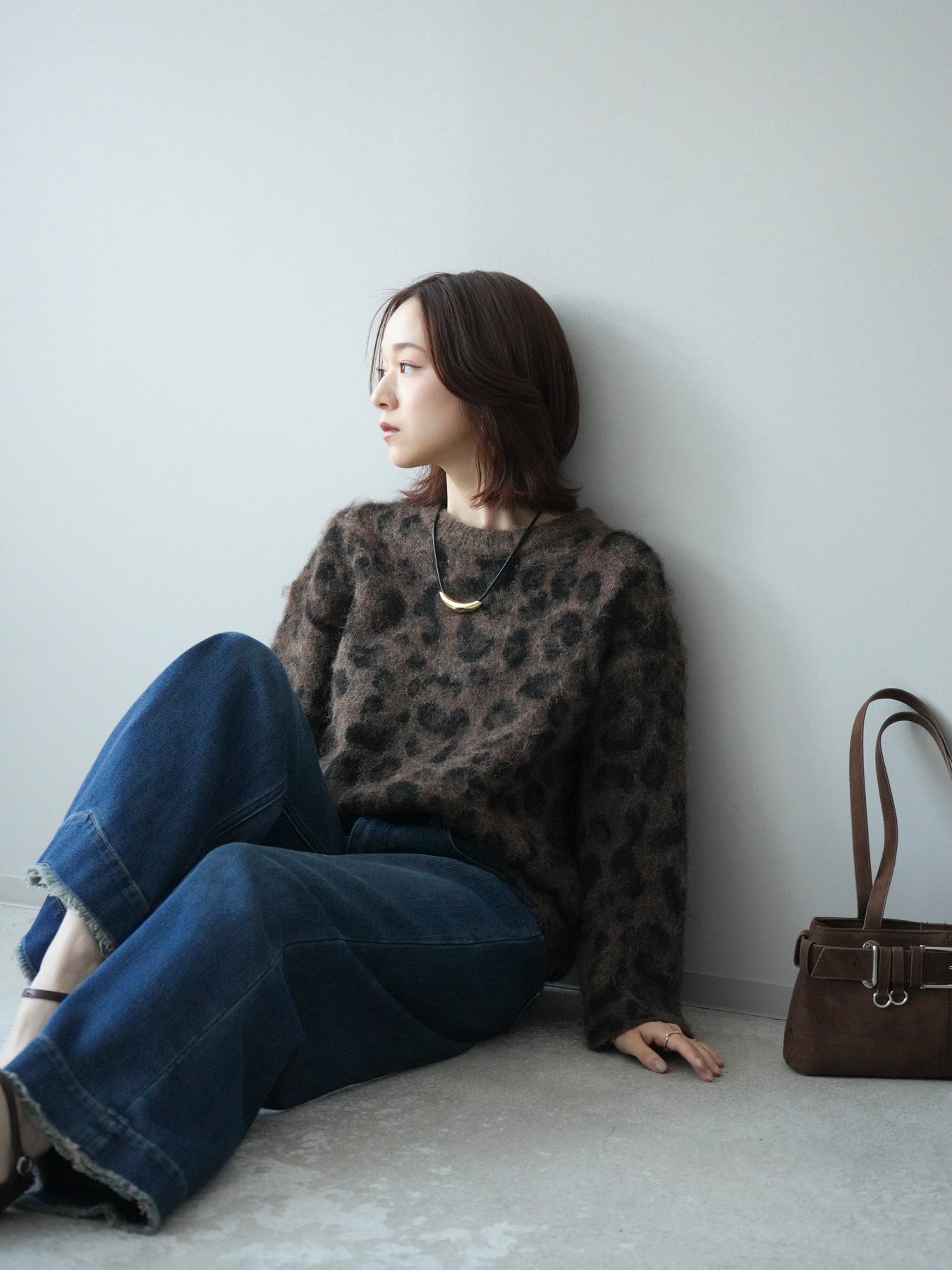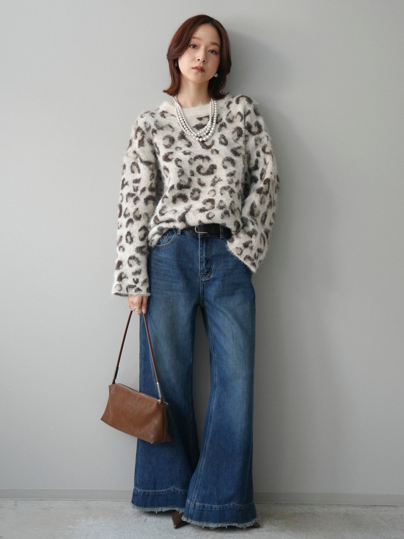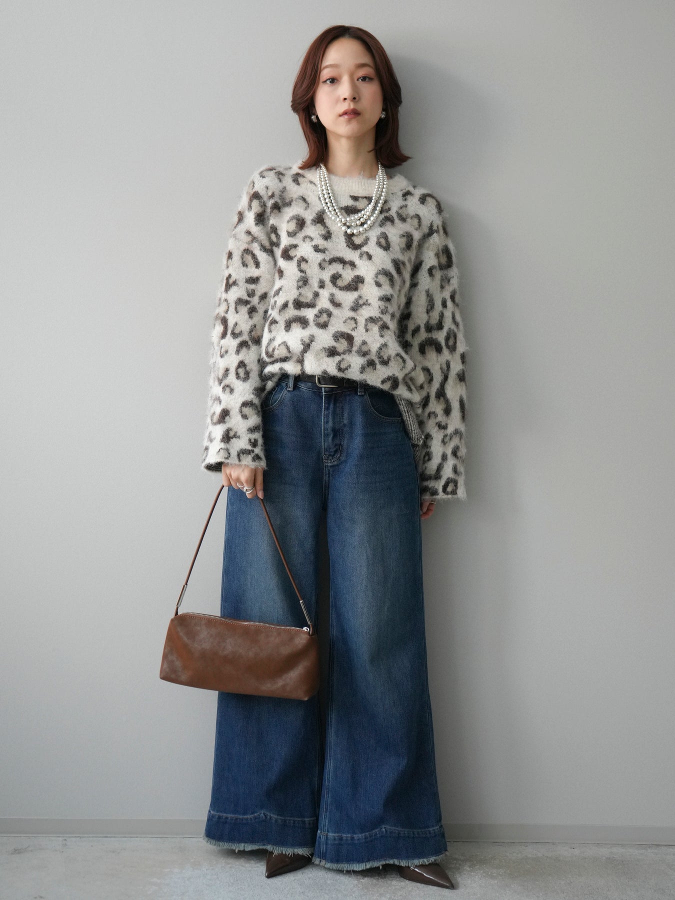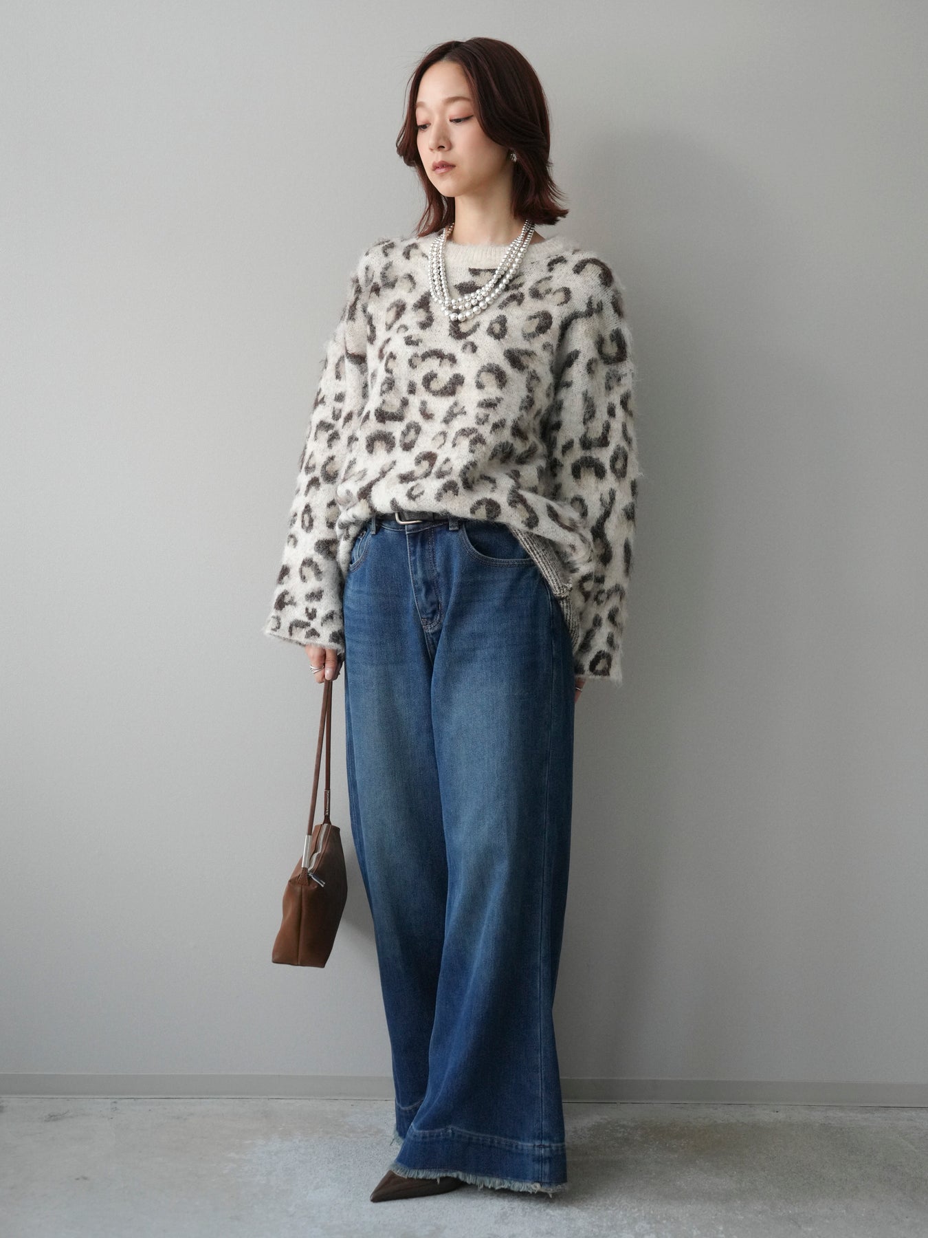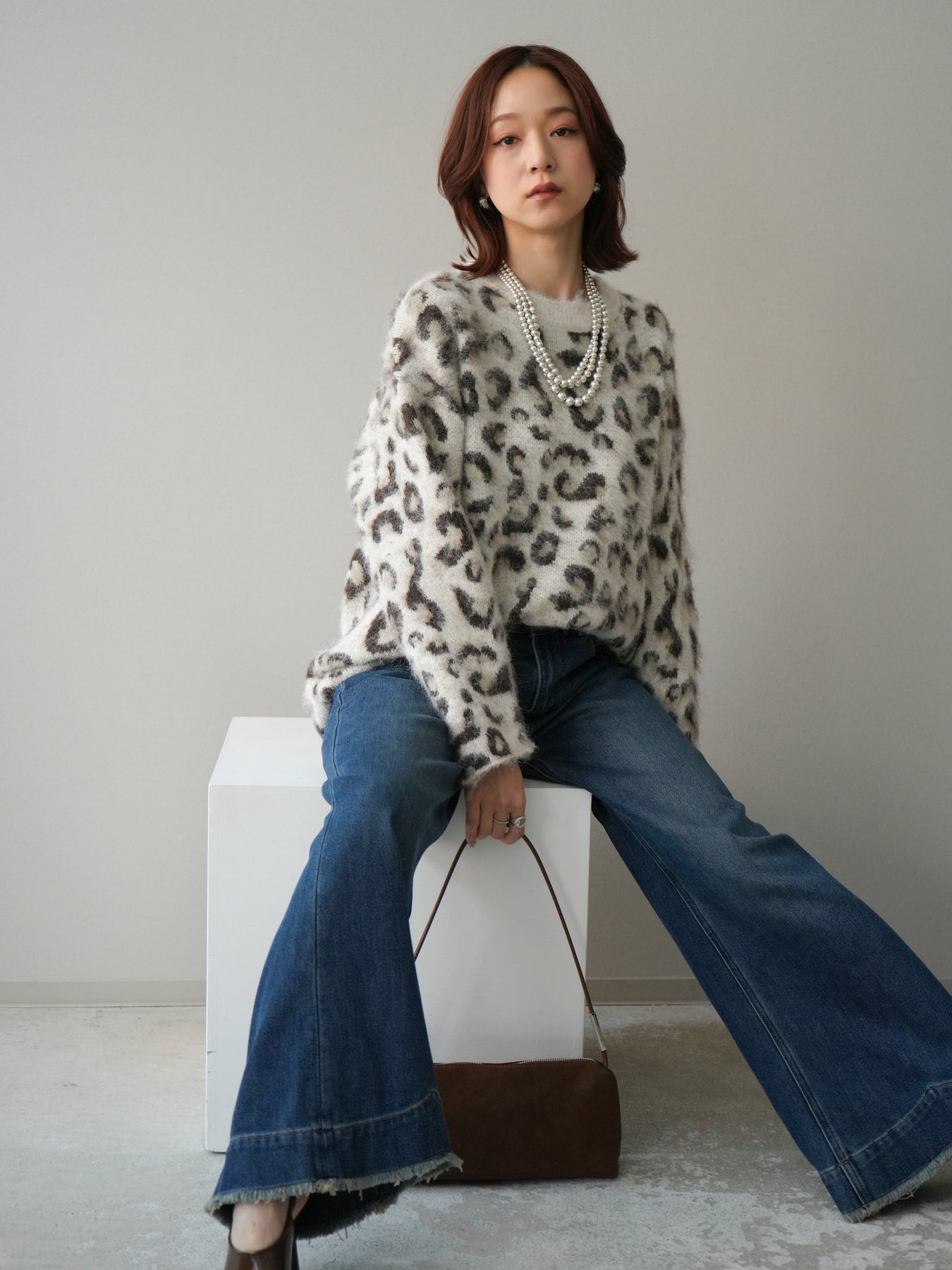[SET]レオパードシャギーニットプルオーバー+裏起毛裾フリンジワイドデニムパンツ(2set)