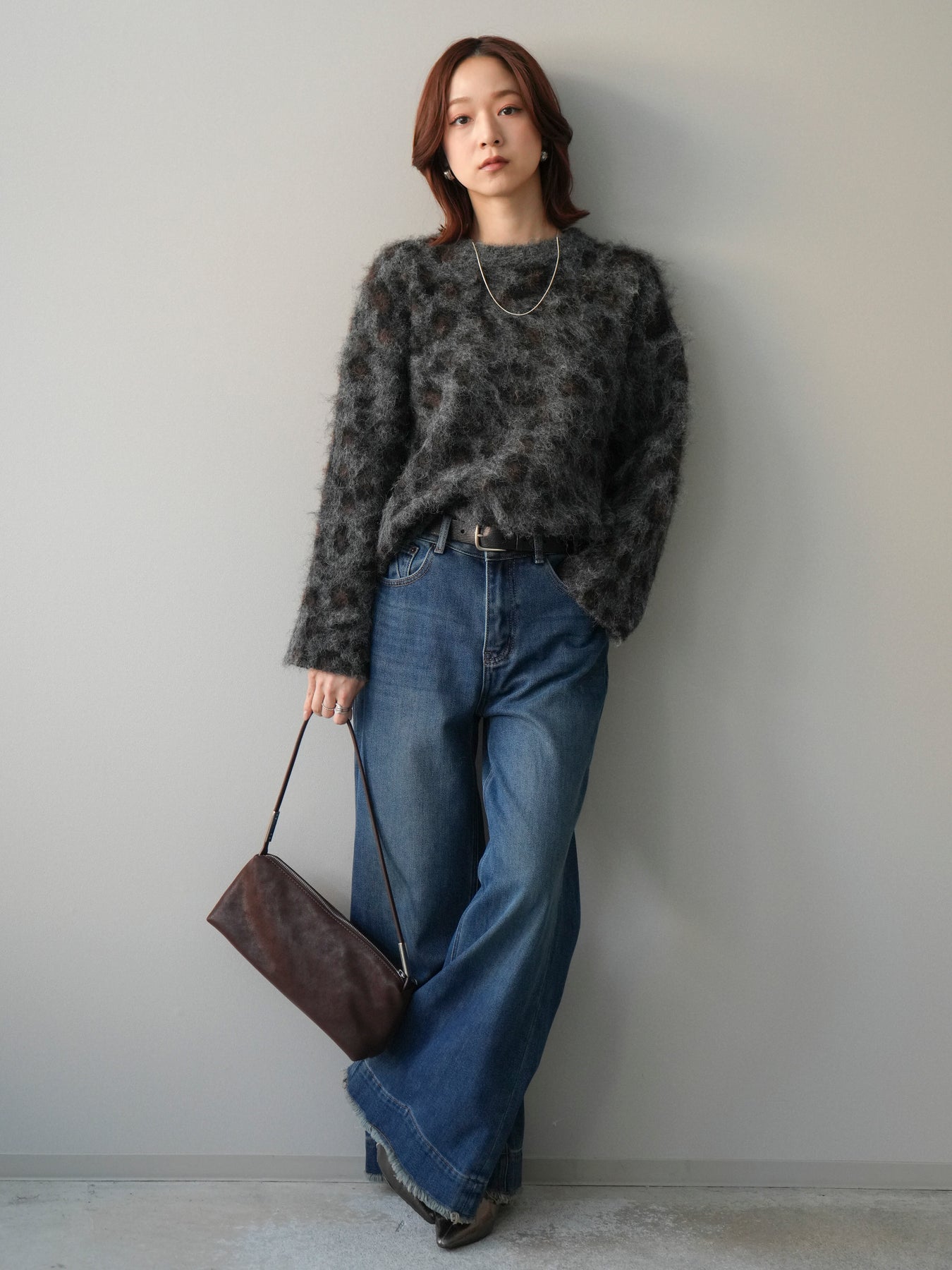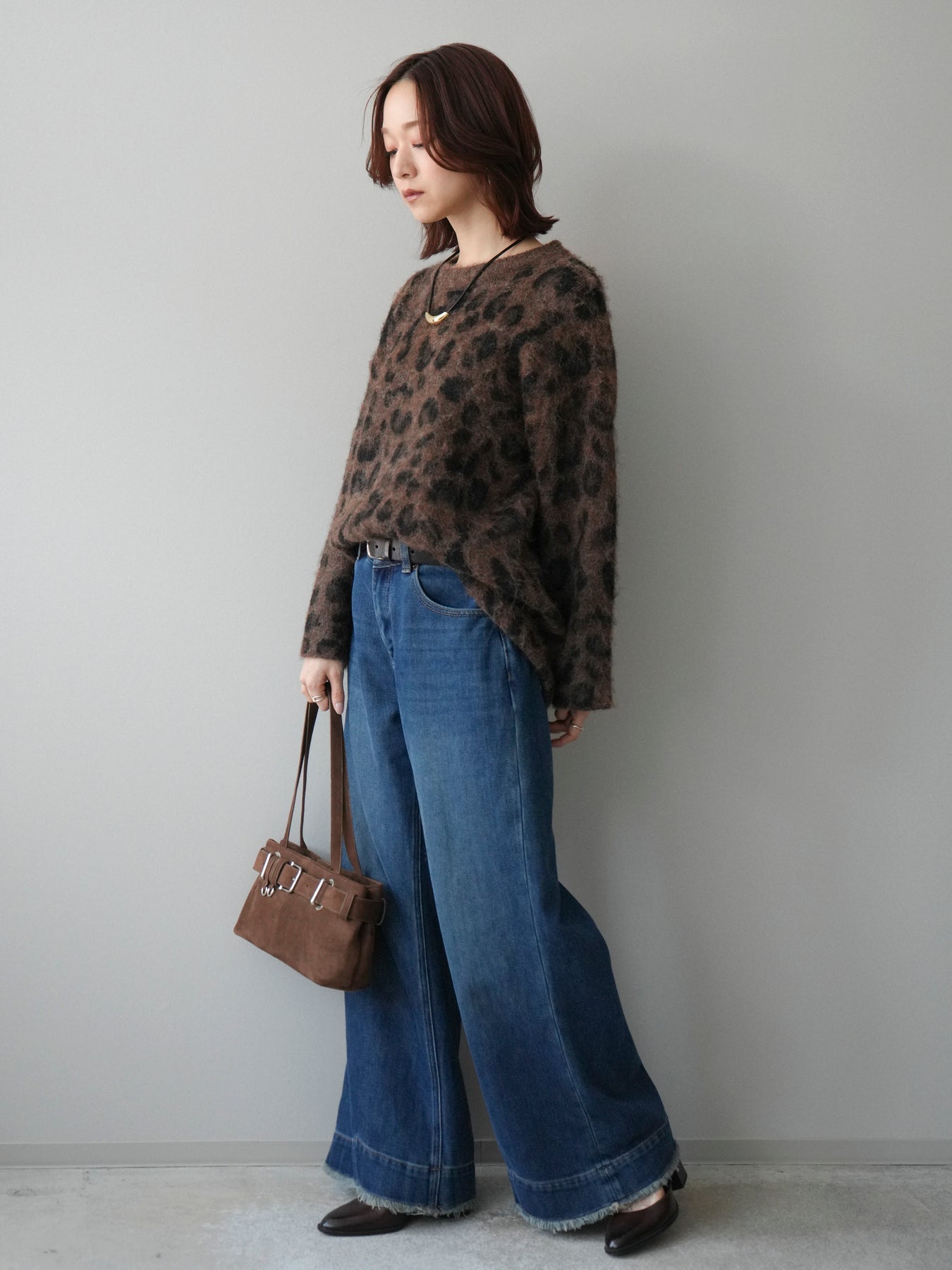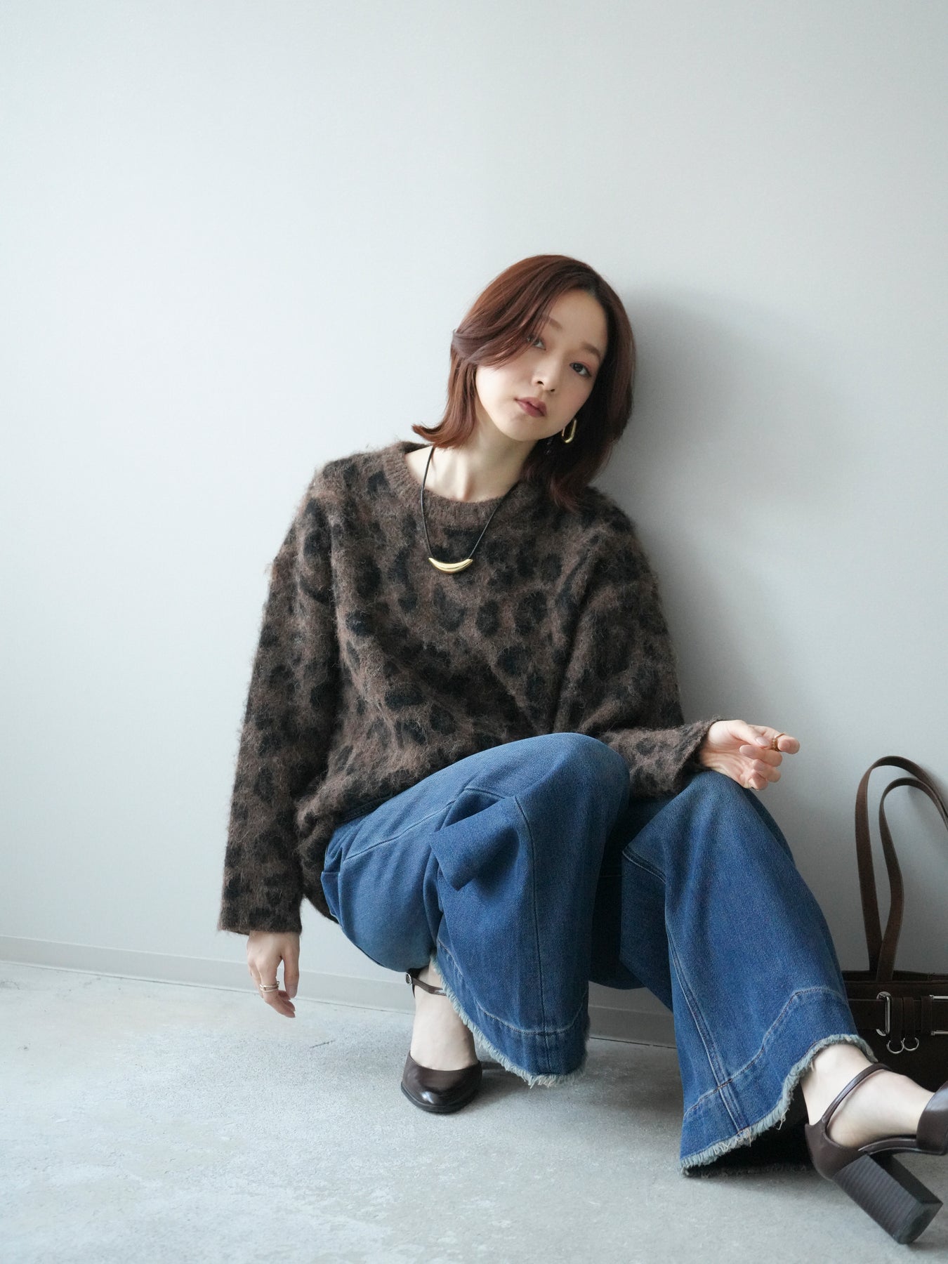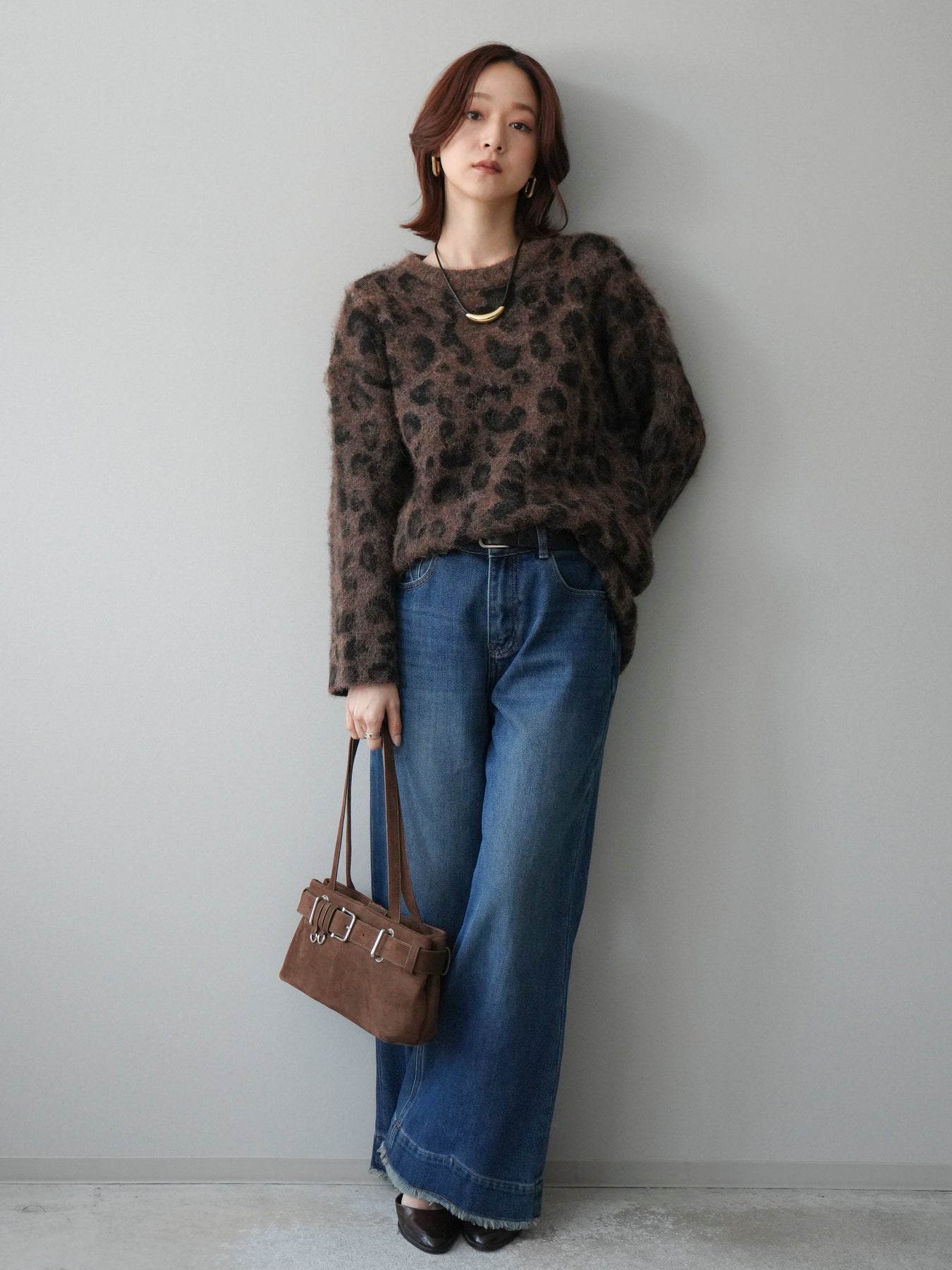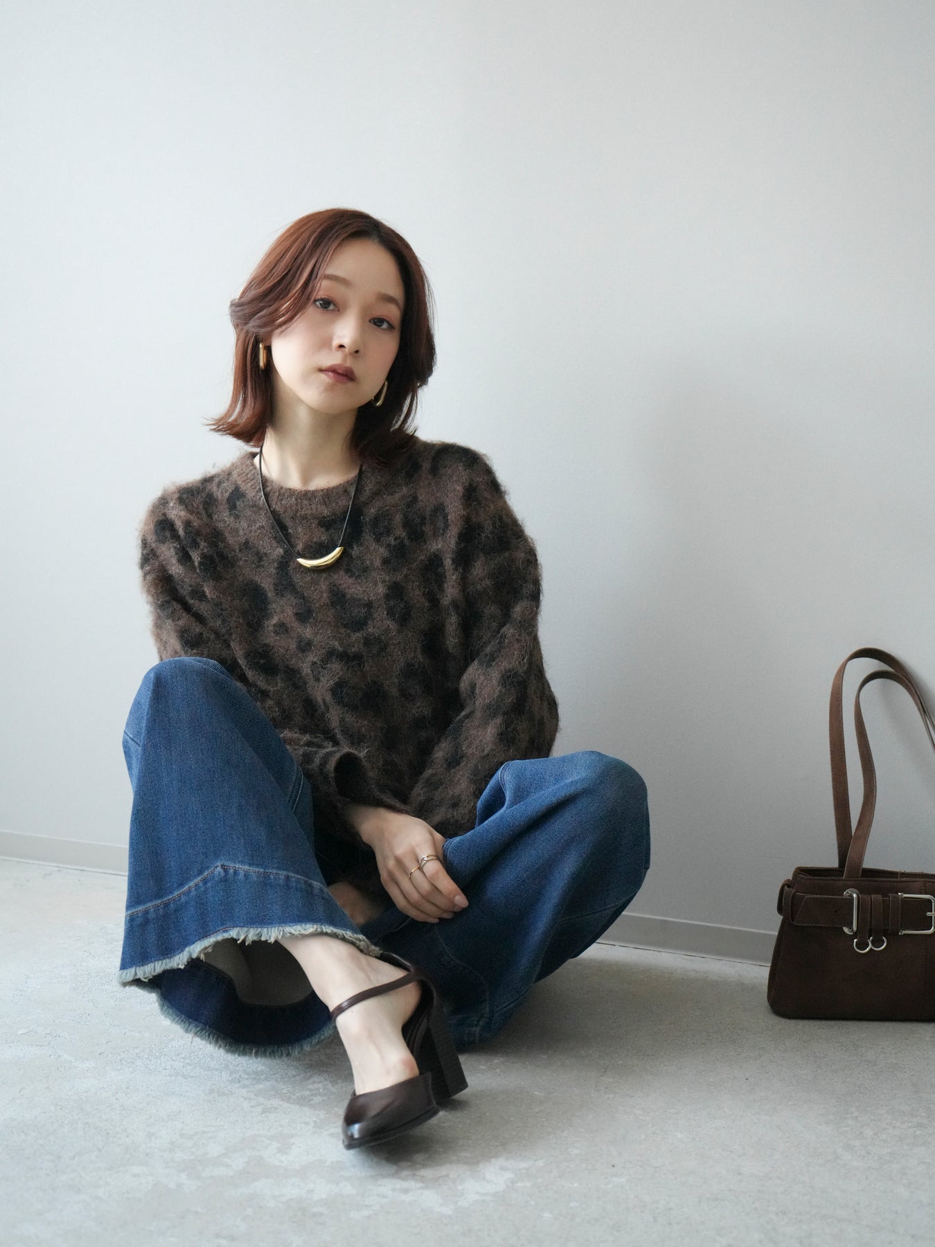 [SET]レオパードシャギーニットプルオーバー+裏起毛裾フリンジワイドデニムパンツ(2set)