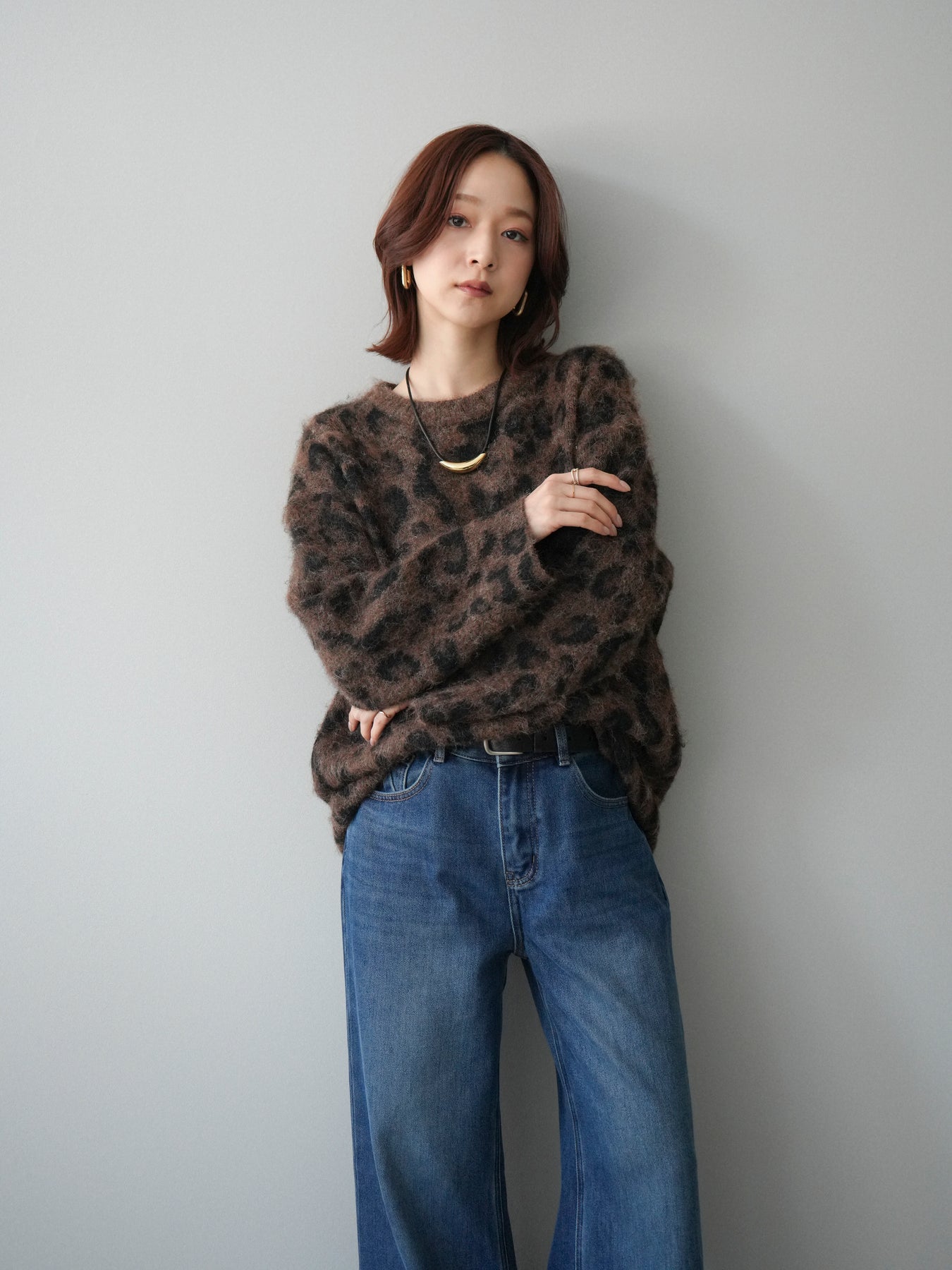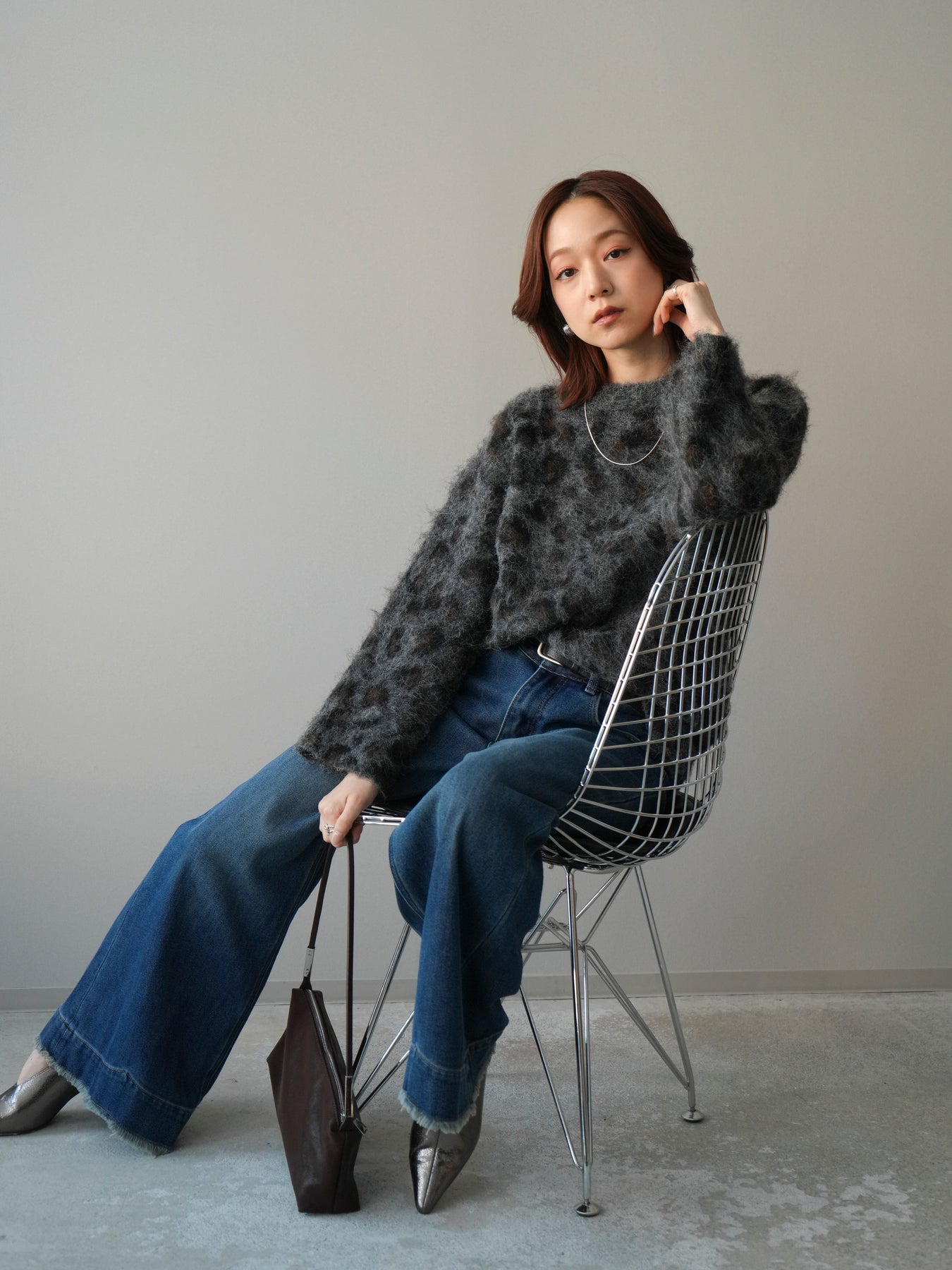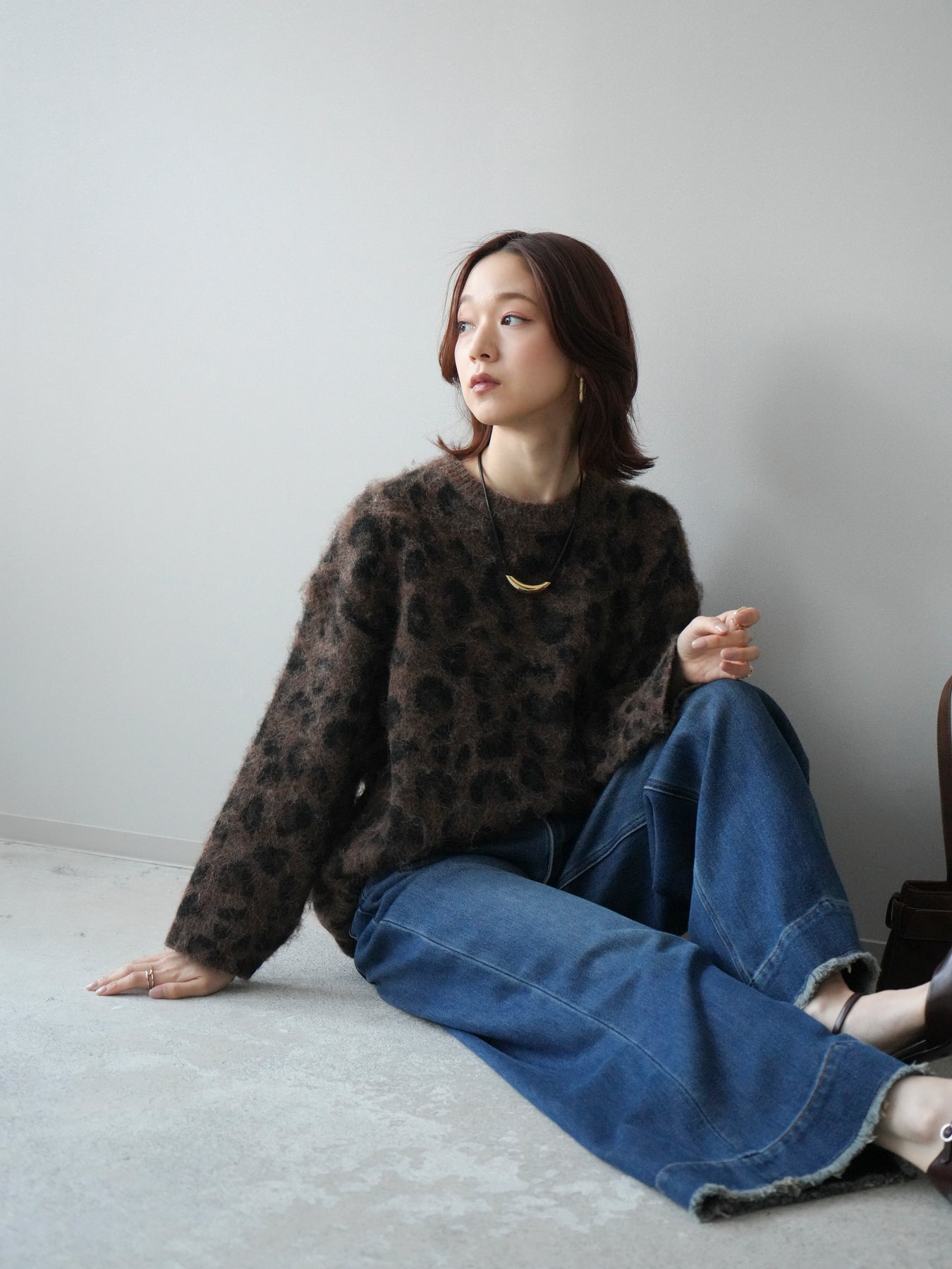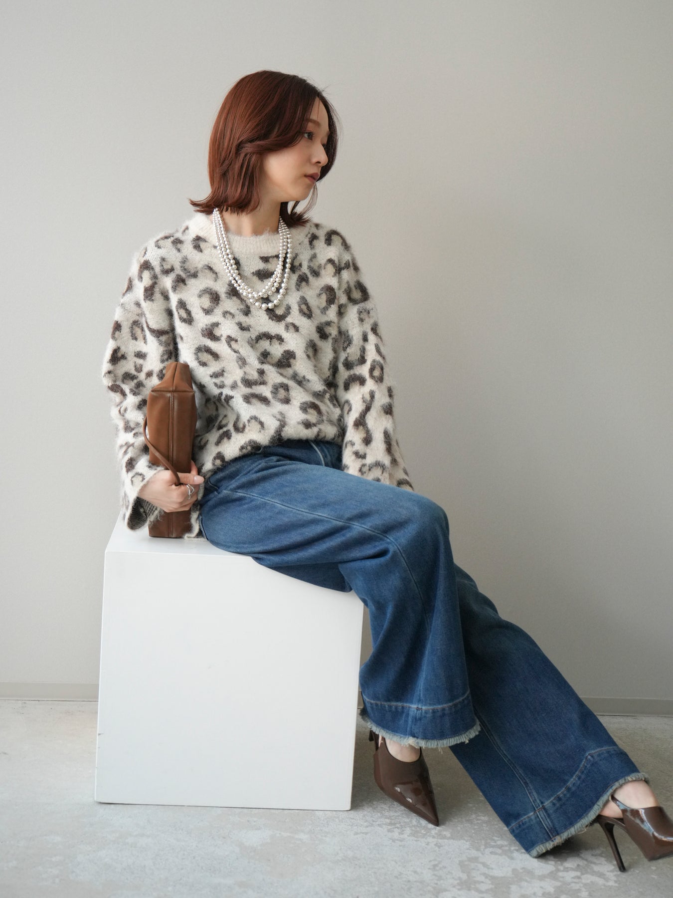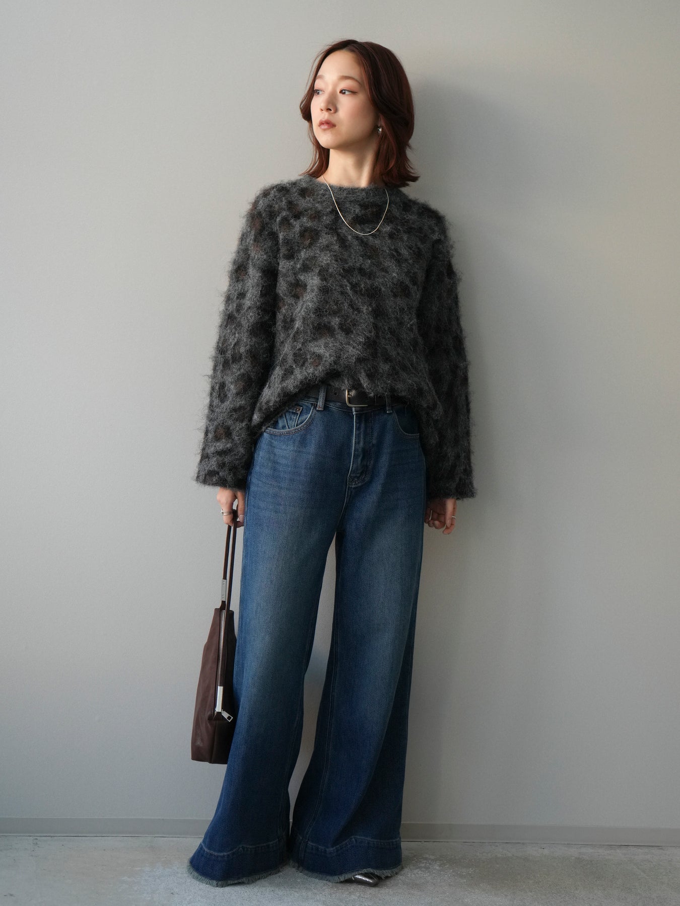 [SET]レオパードシャギーニットプルオーバー+裏起毛裾フリンジワイドデニムパンツ(2set)