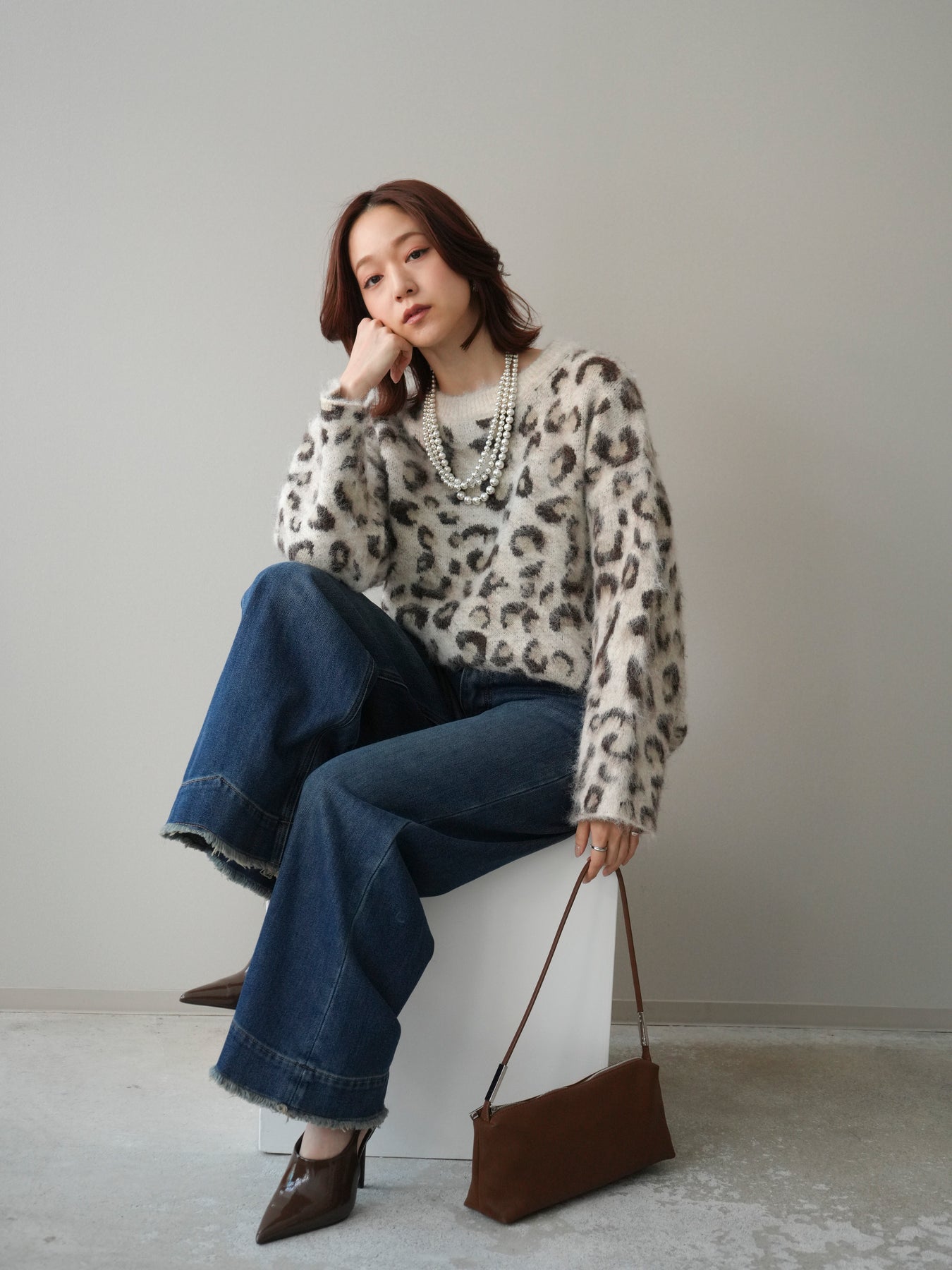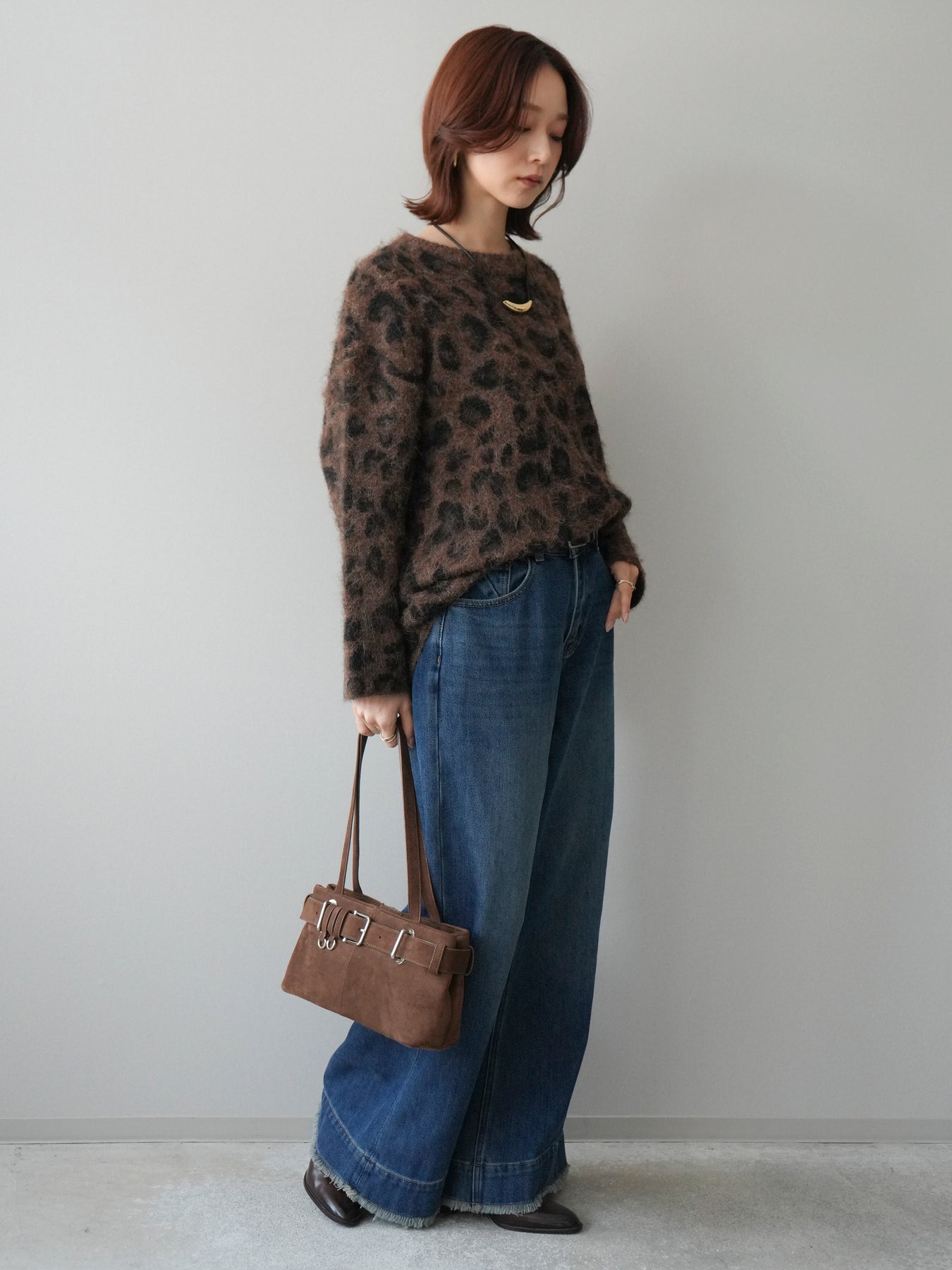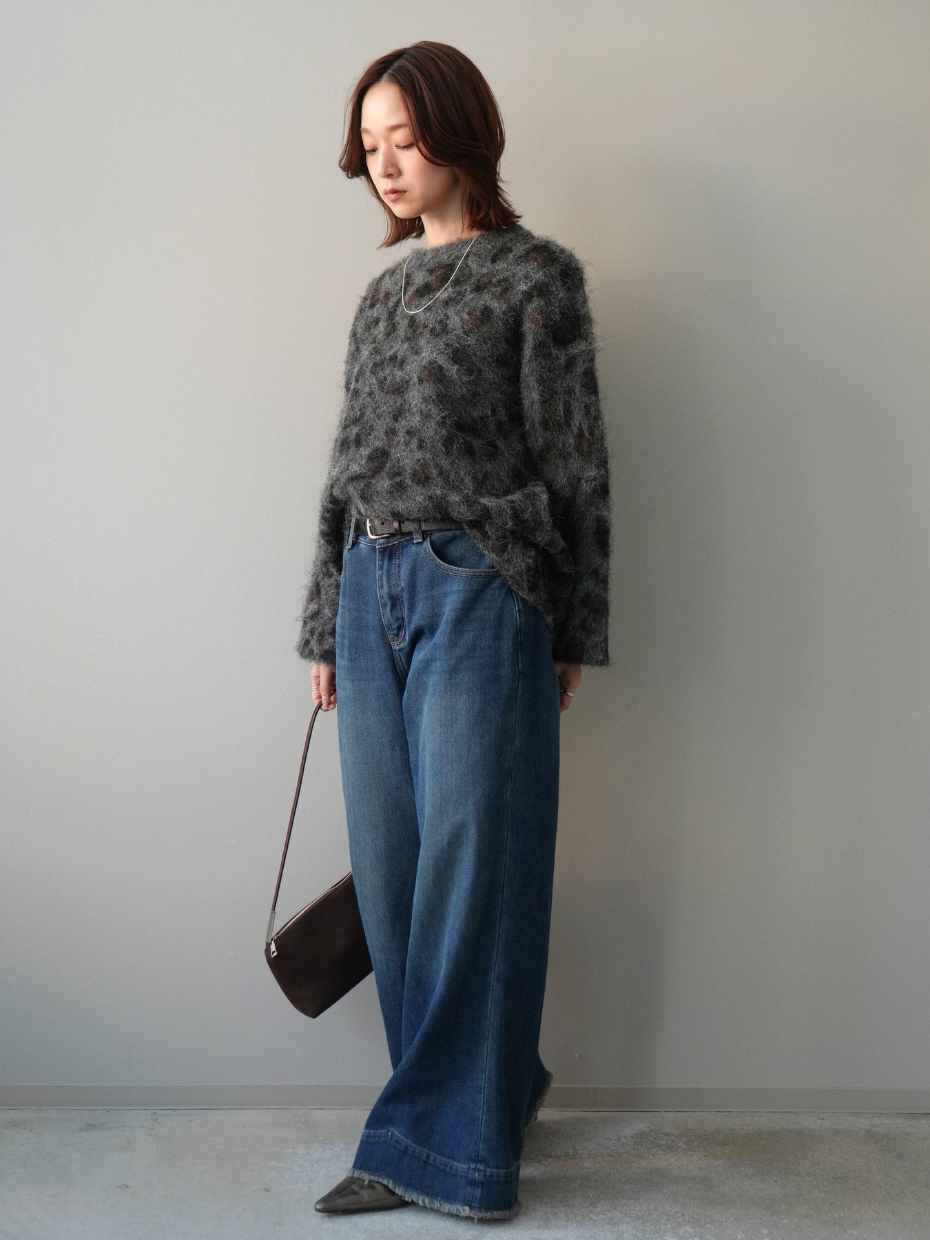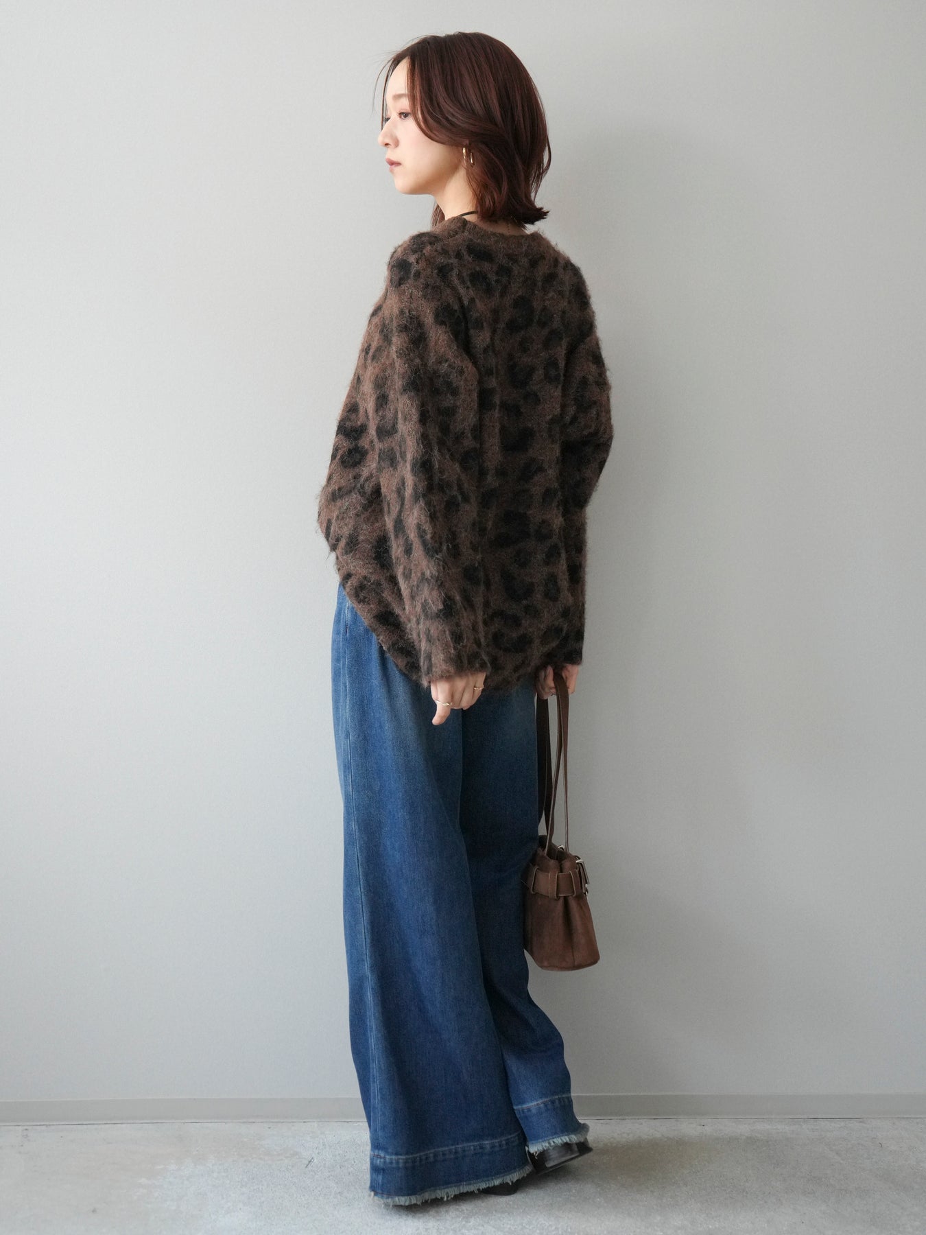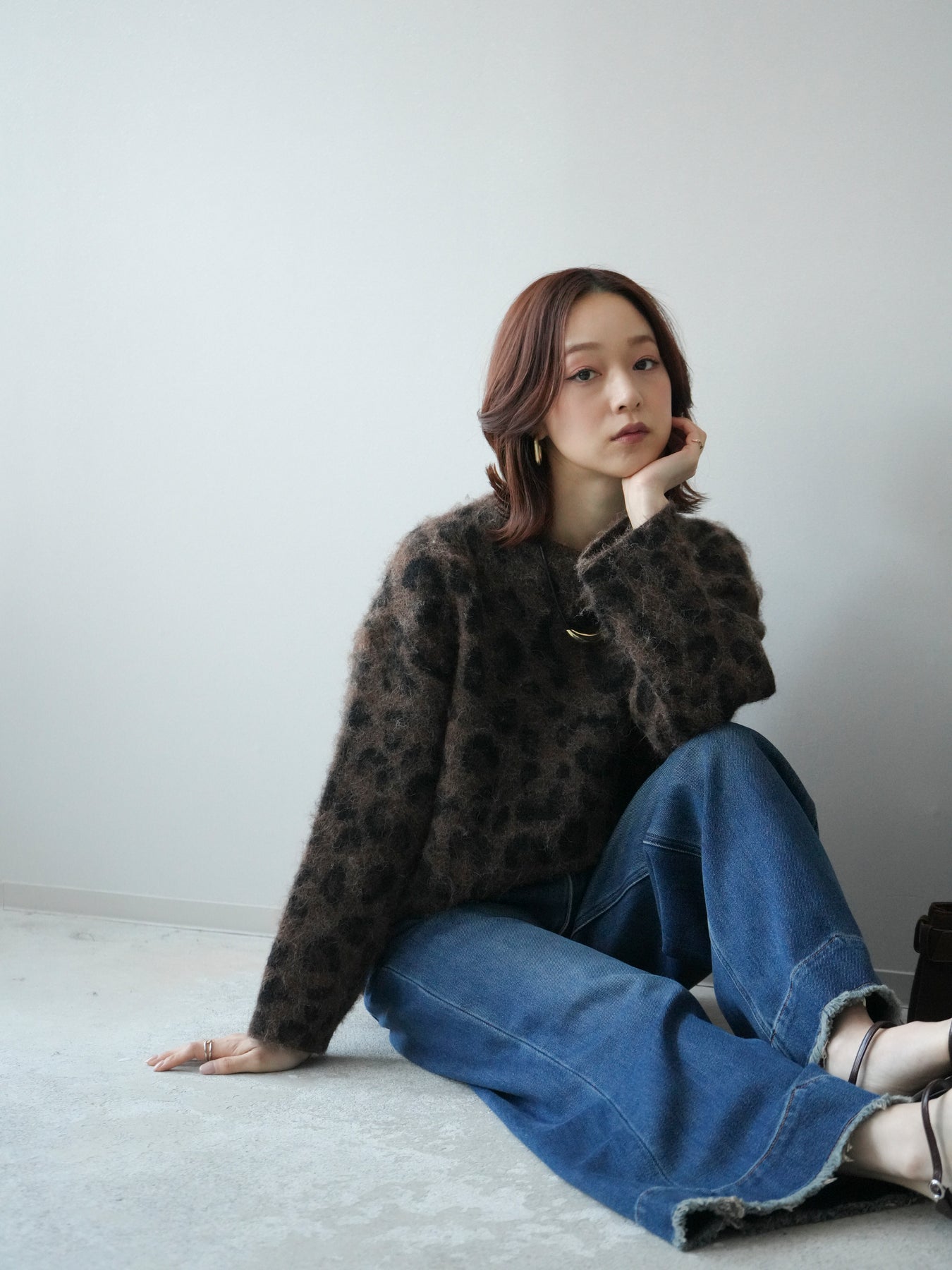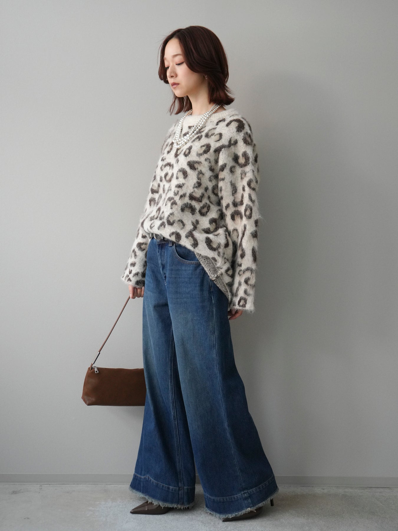 [SET]レオパードシャギーニットプルオーバー+裏起毛裾フリンジワイドデニムパンツ(2set)