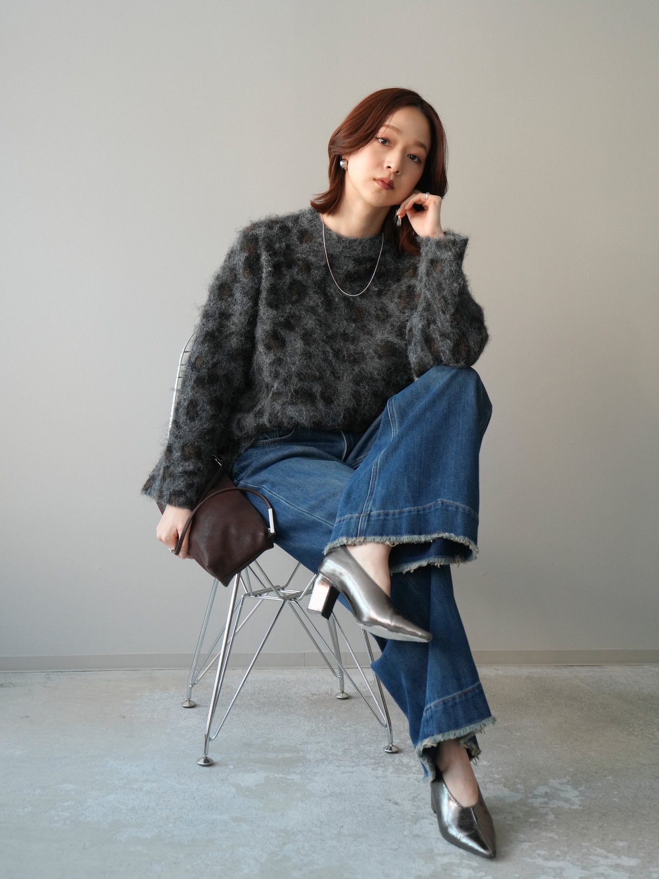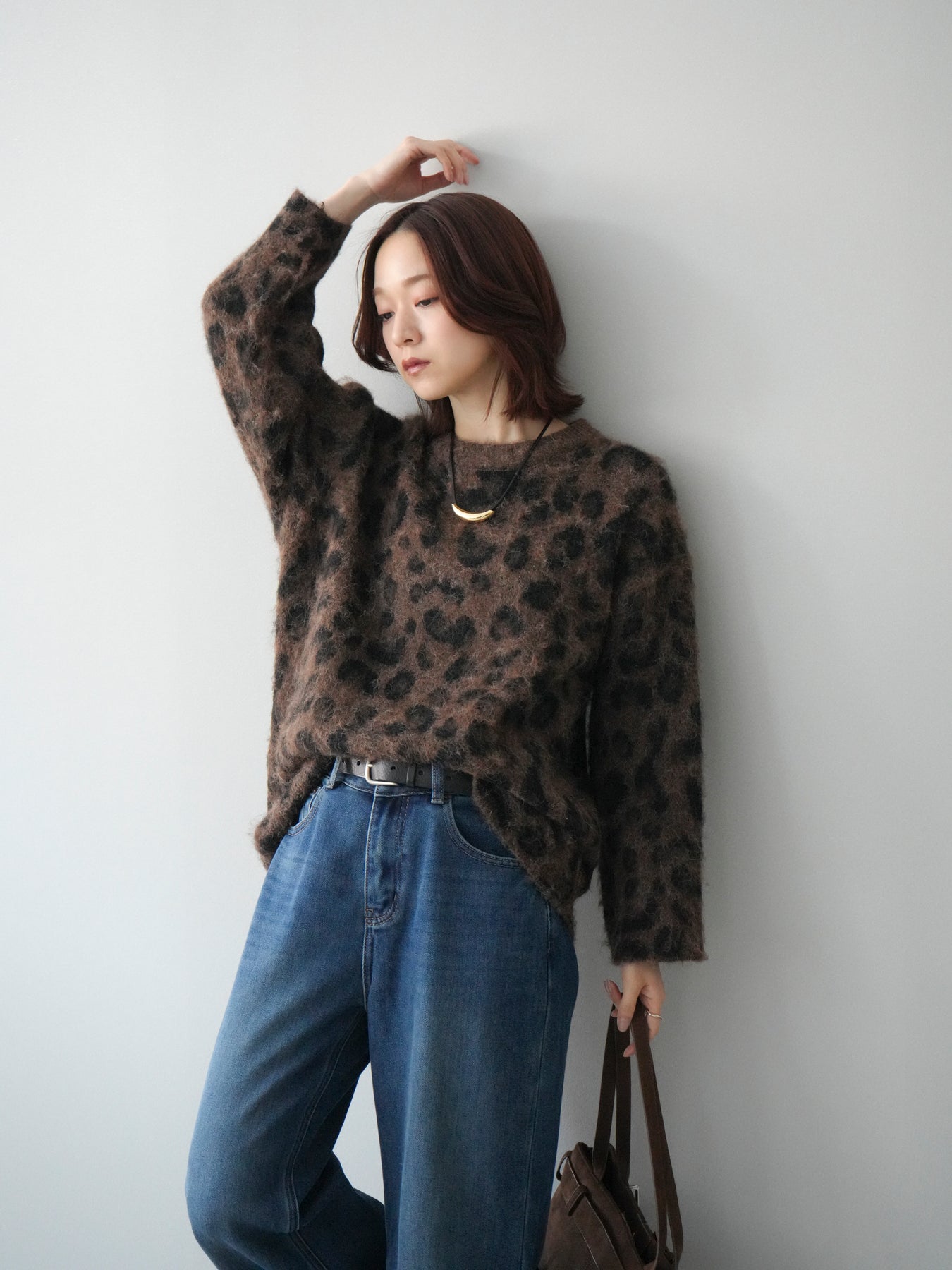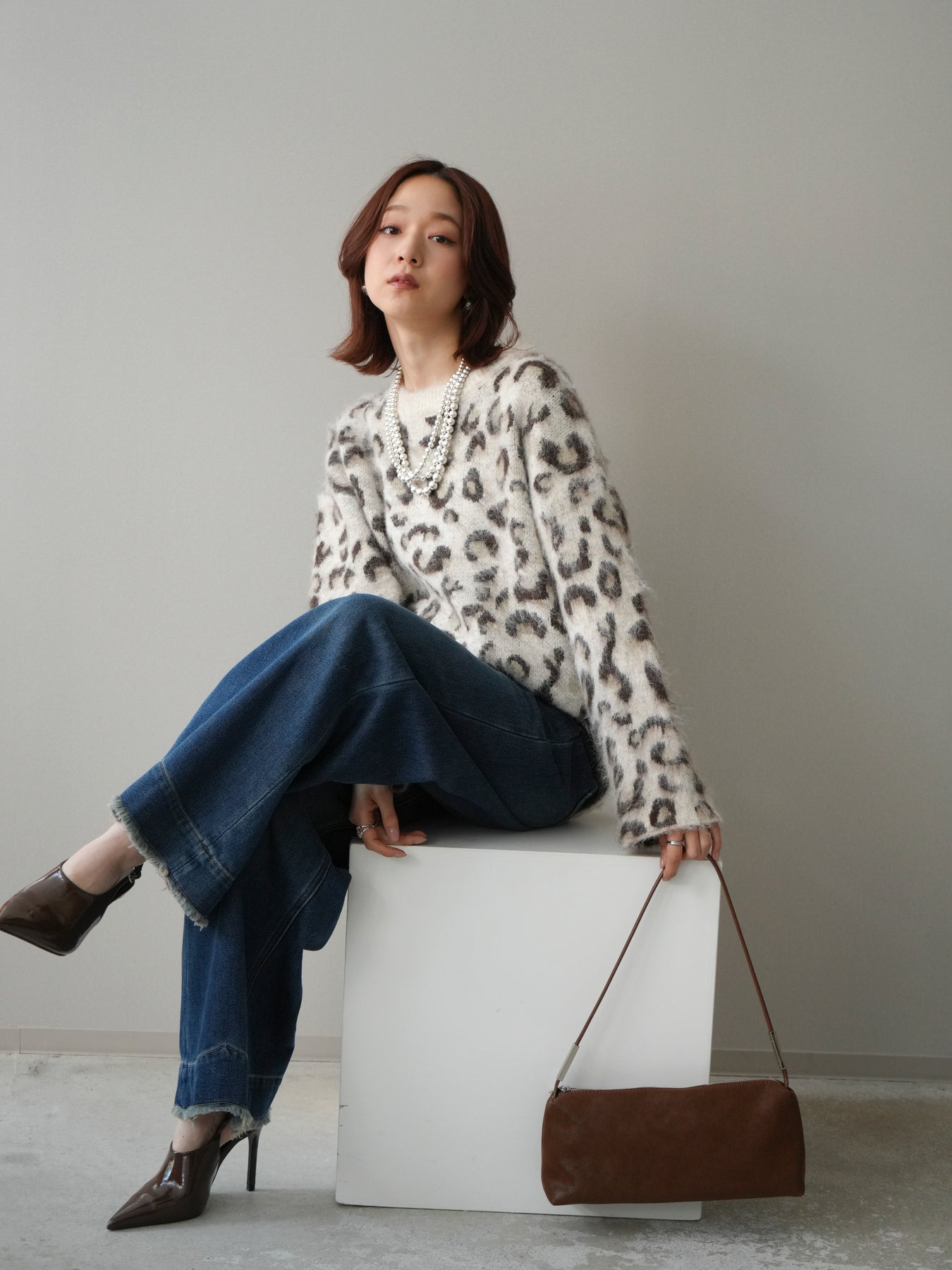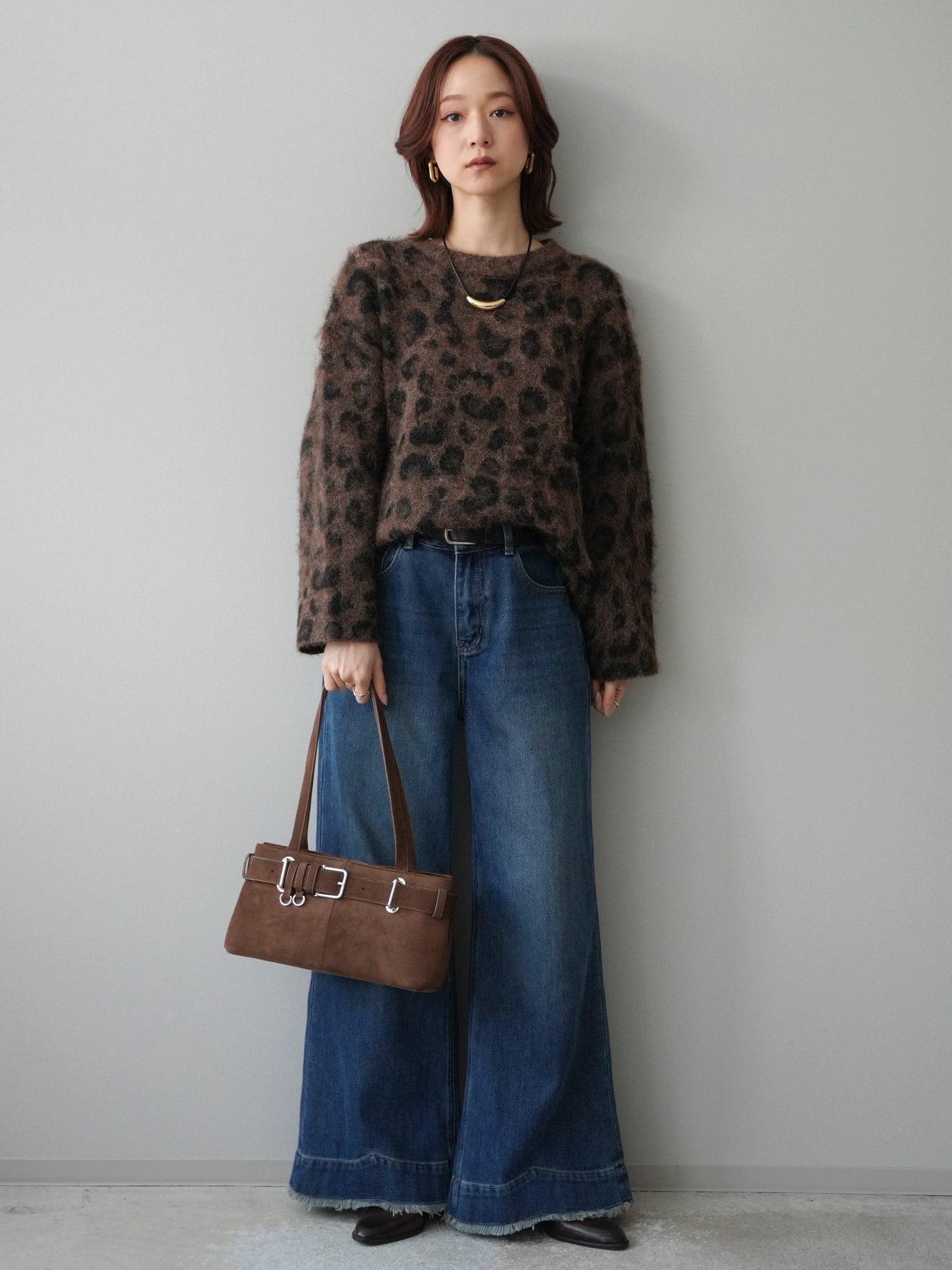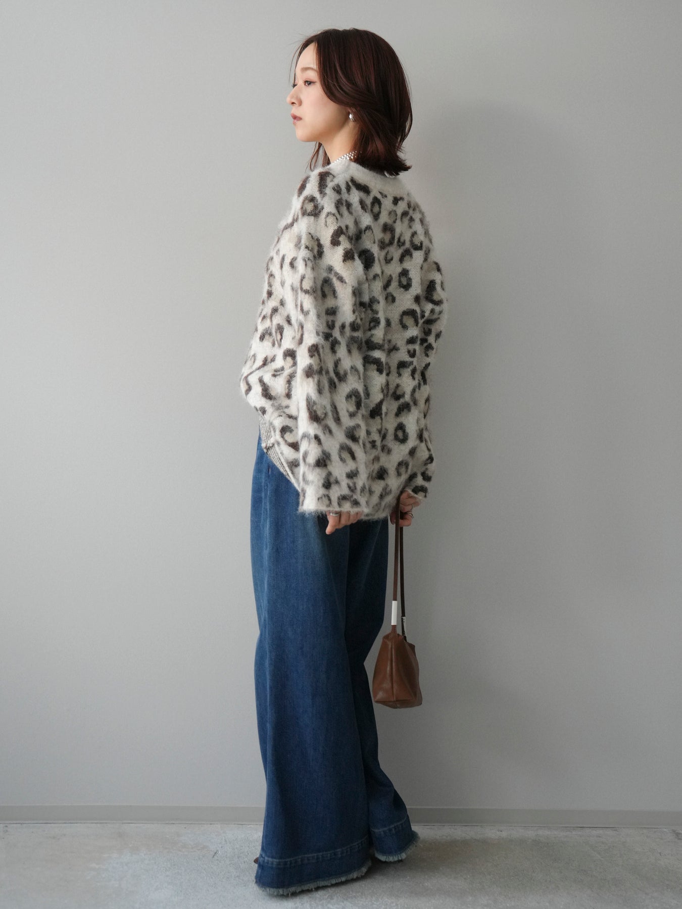 [SET]レオパードシャギーニットプルオーバー+裏起毛裾フリンジワイドデニムパンツ(2set)