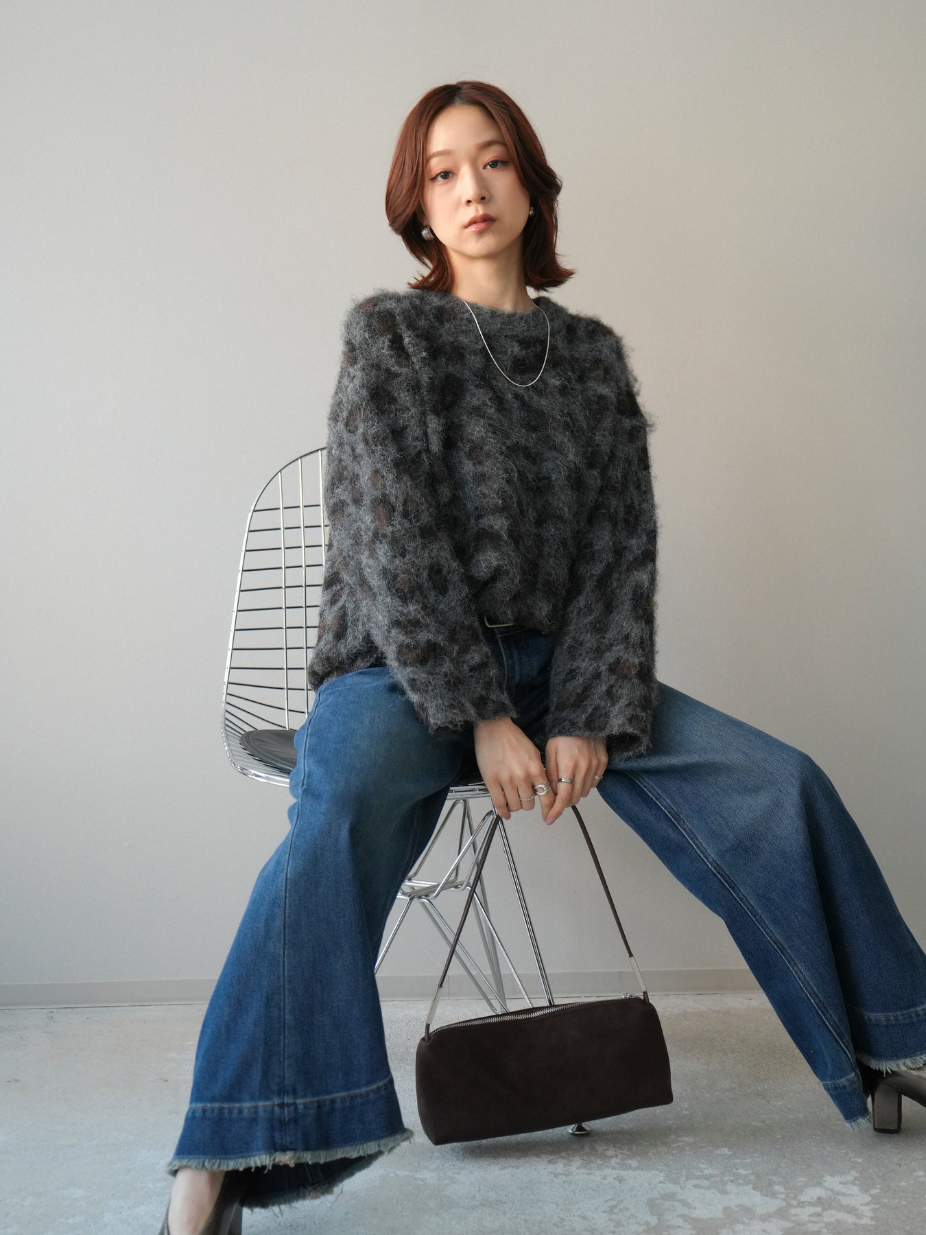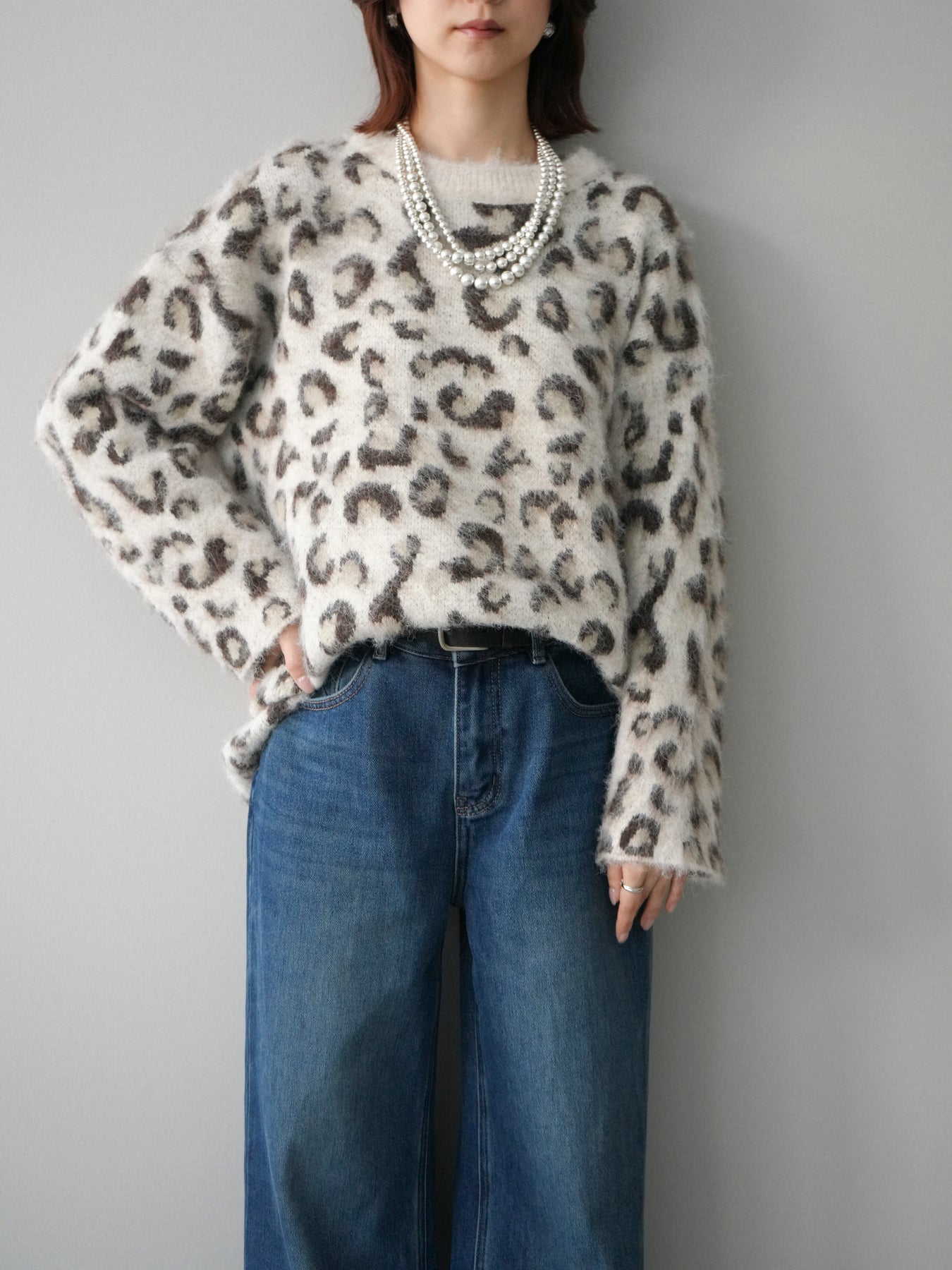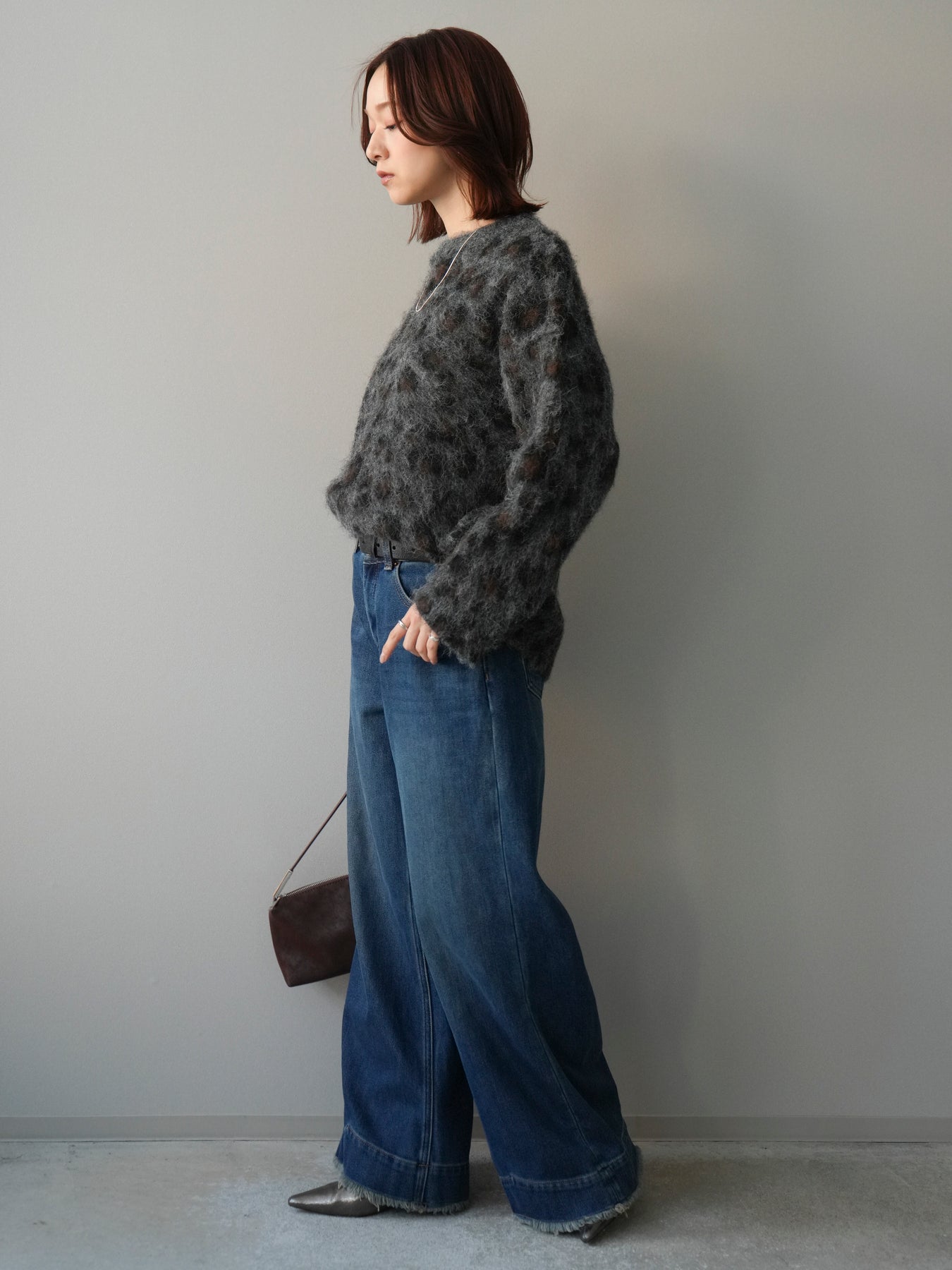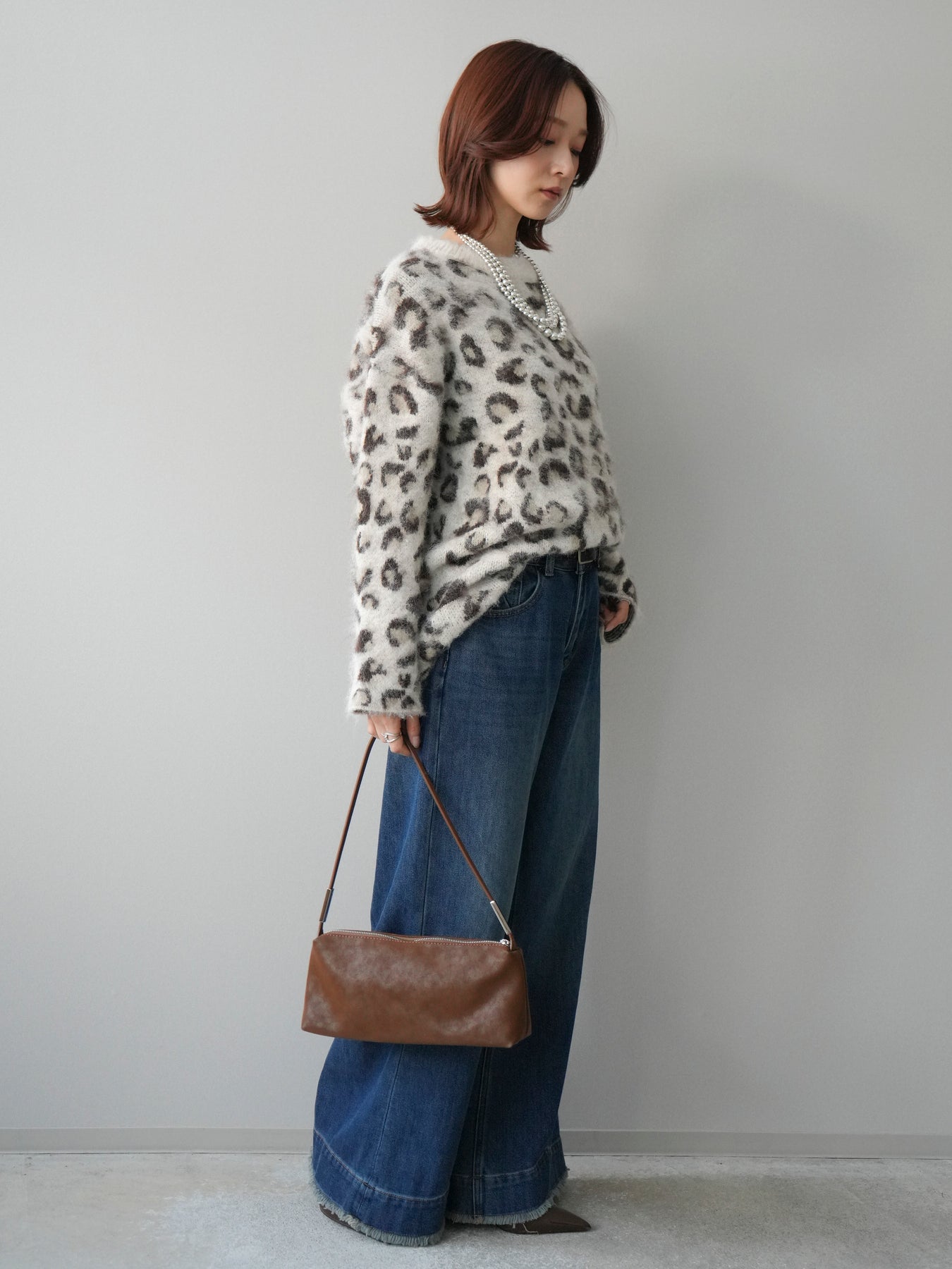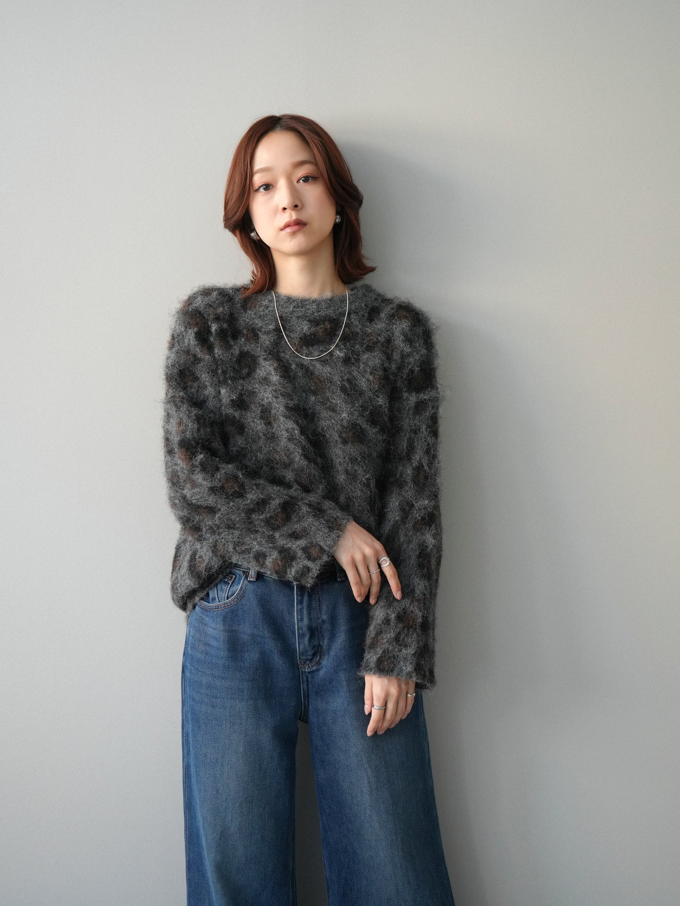 [SET]レオパードシャギーニットプルオーバー+裏起毛裾フリンジワイドデニムパンツ(2set)