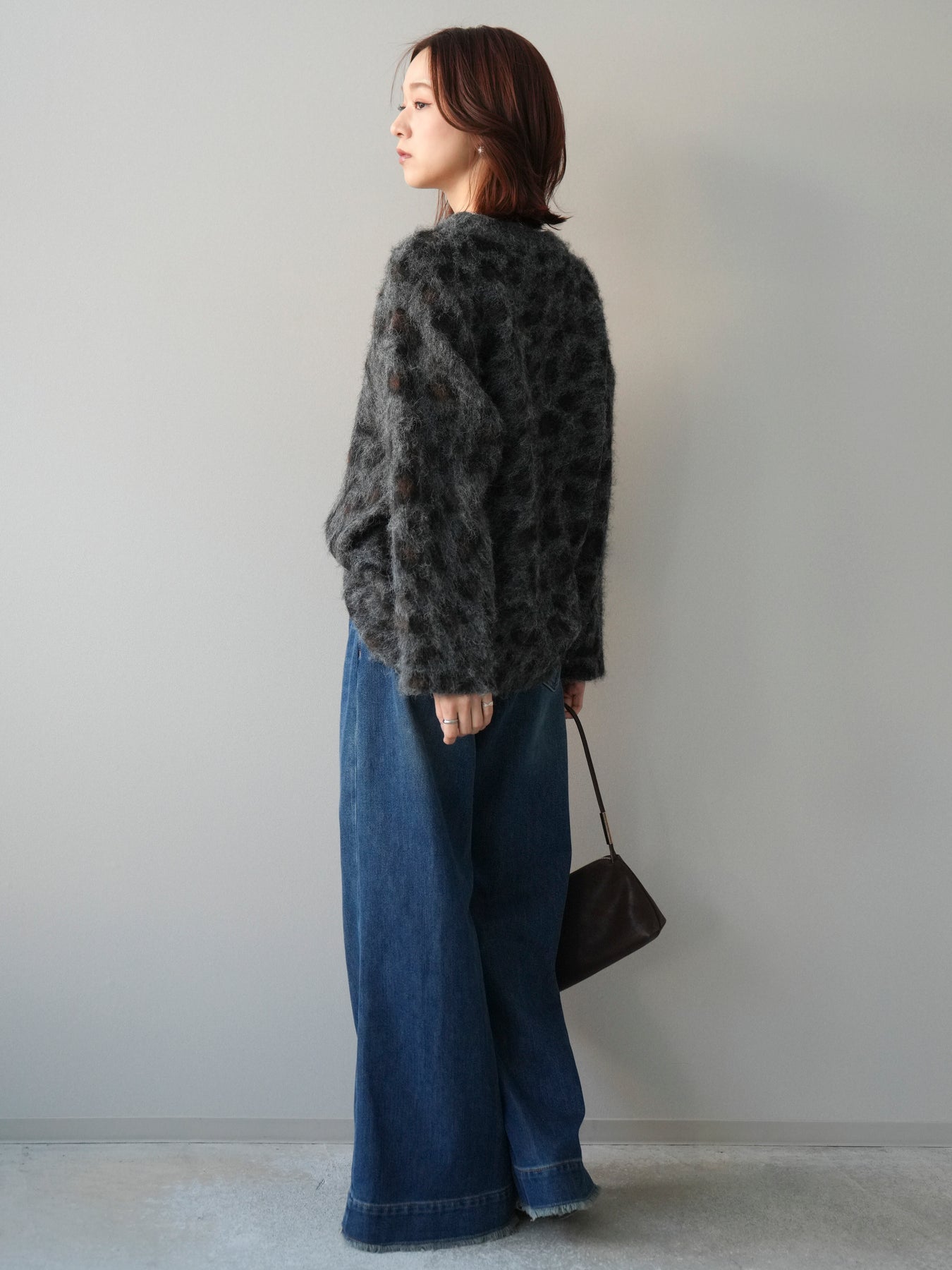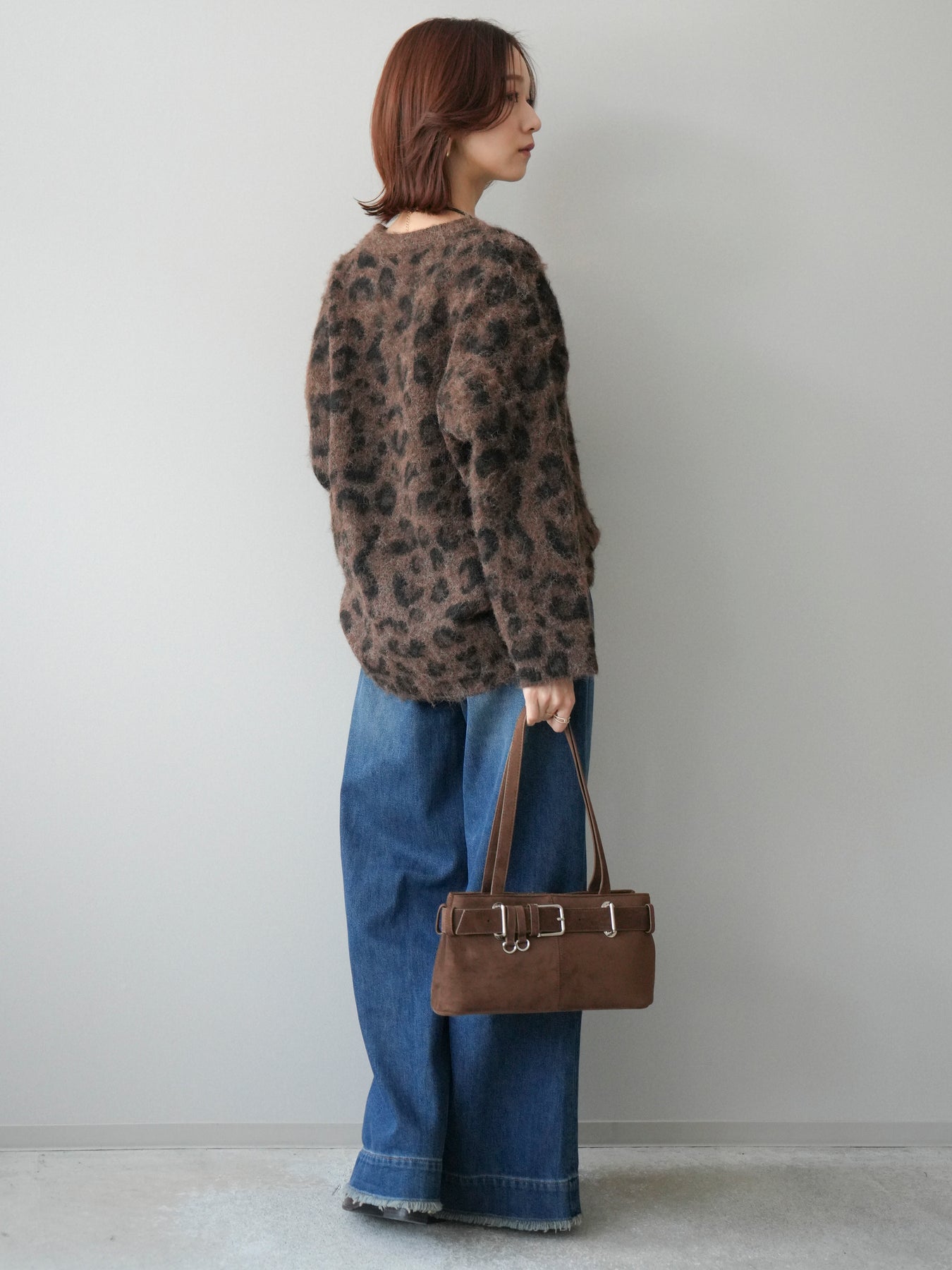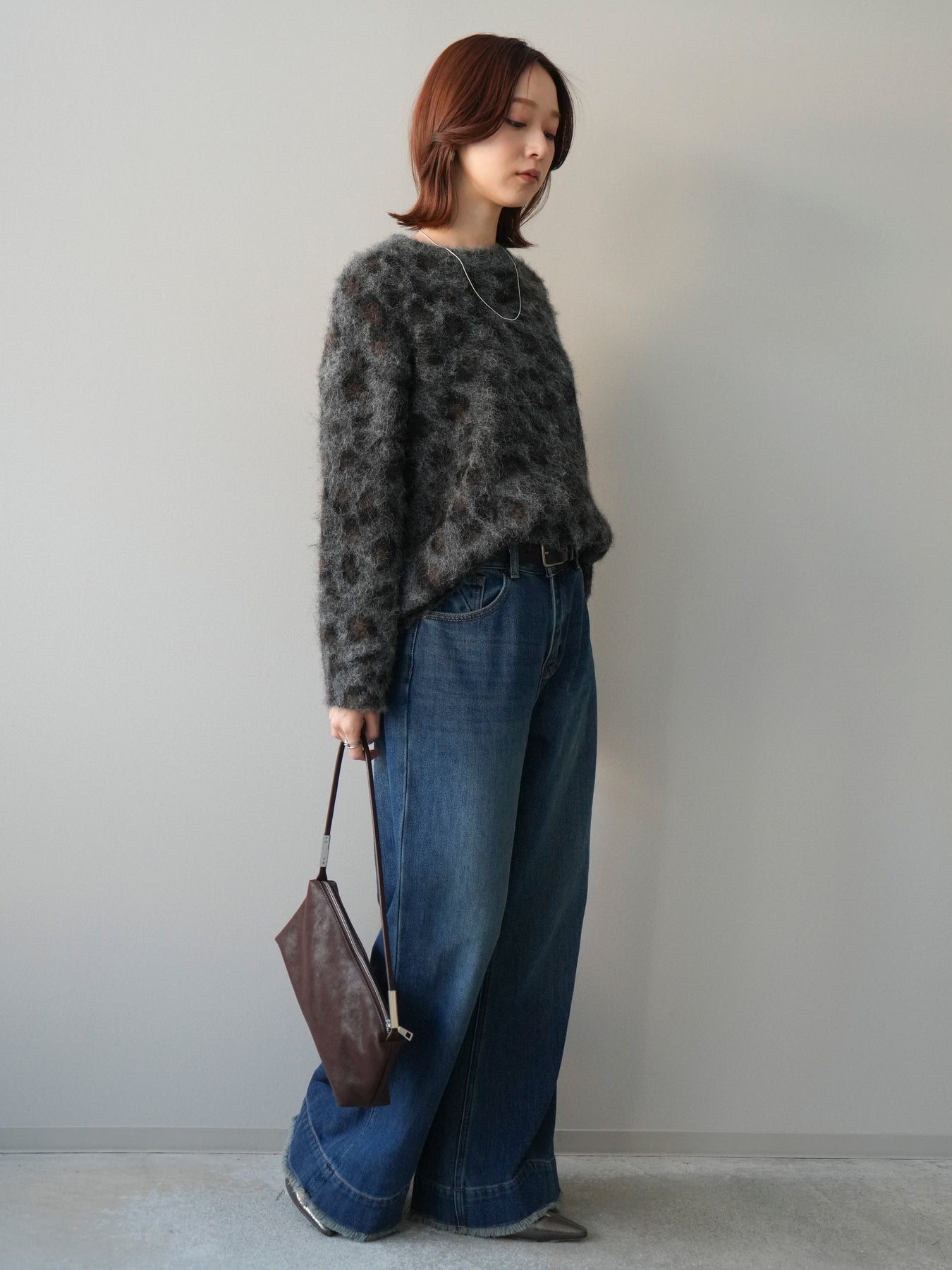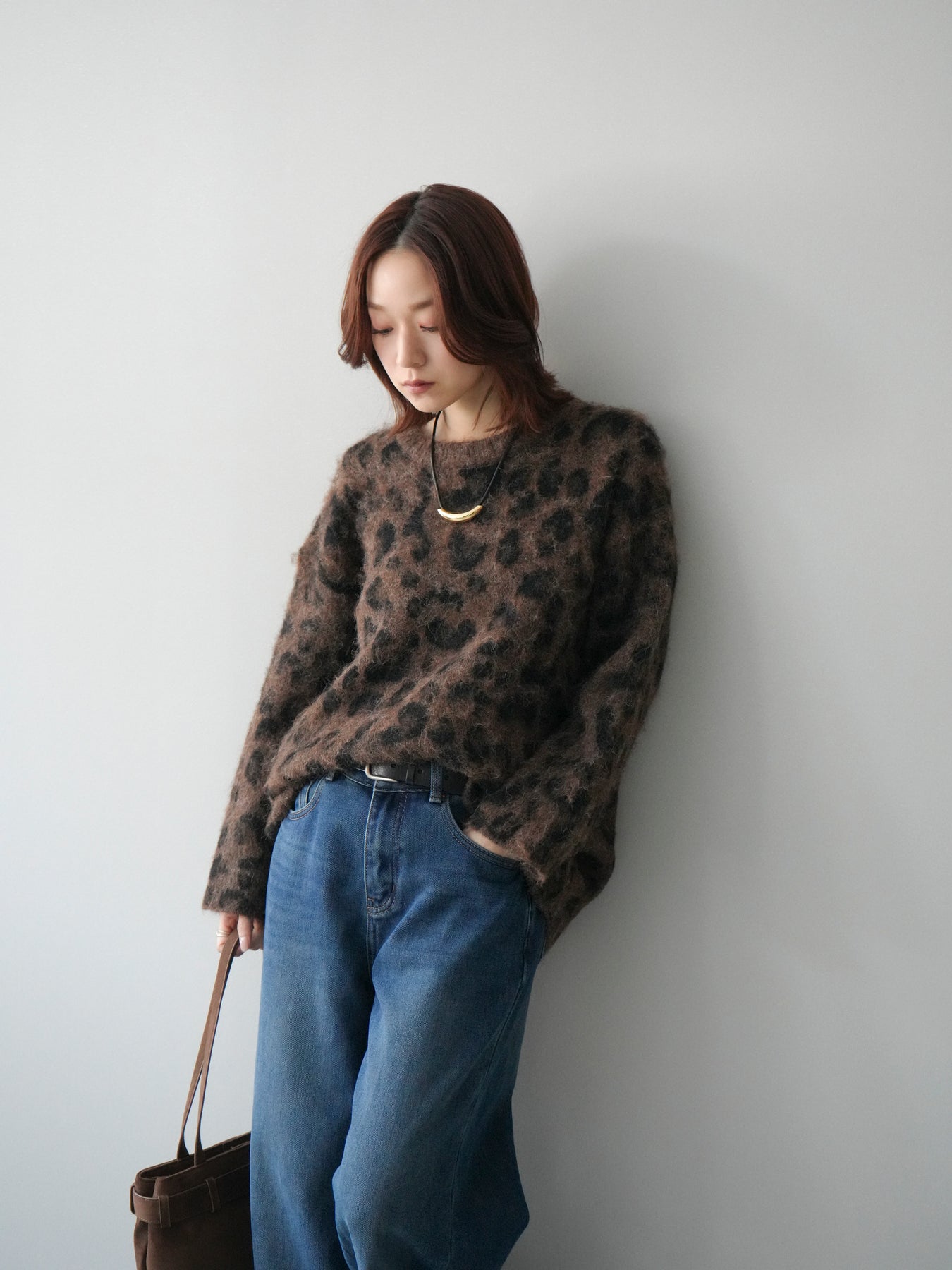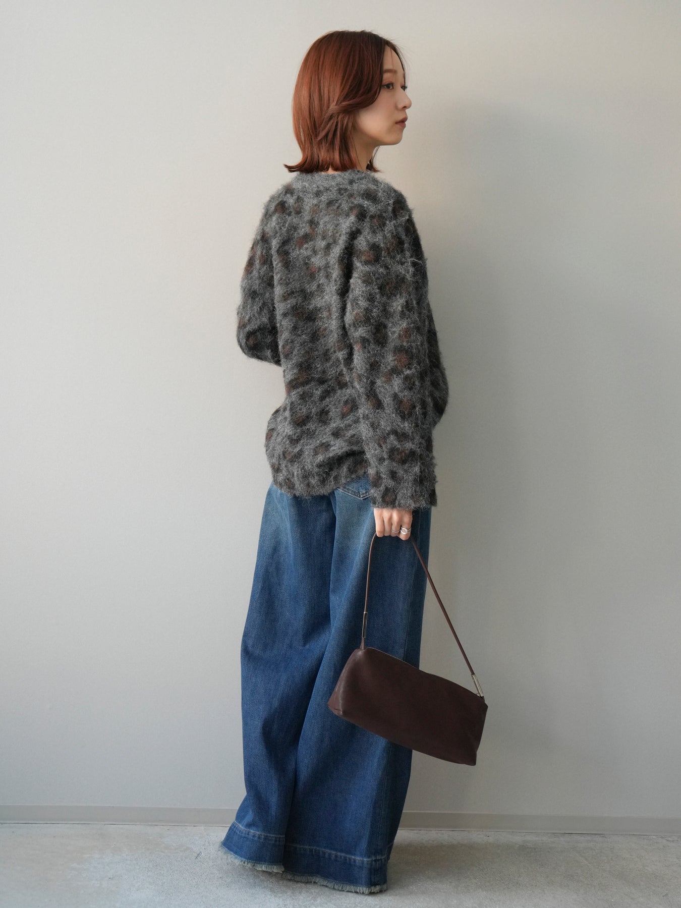[SET]レオパードシャギーニットプルオーバー+裏起毛裾フリンジワイドデニムパンツ(2set)