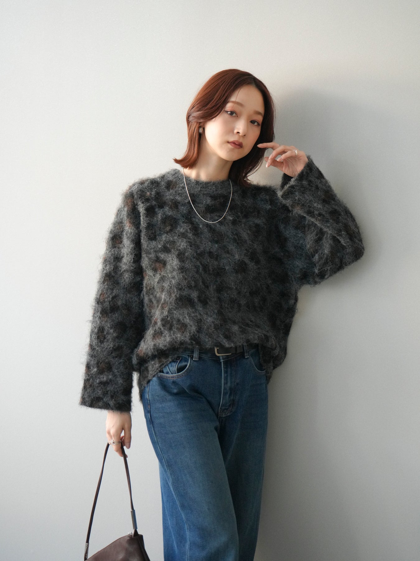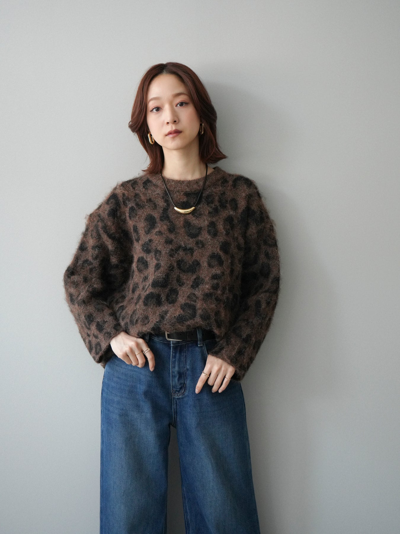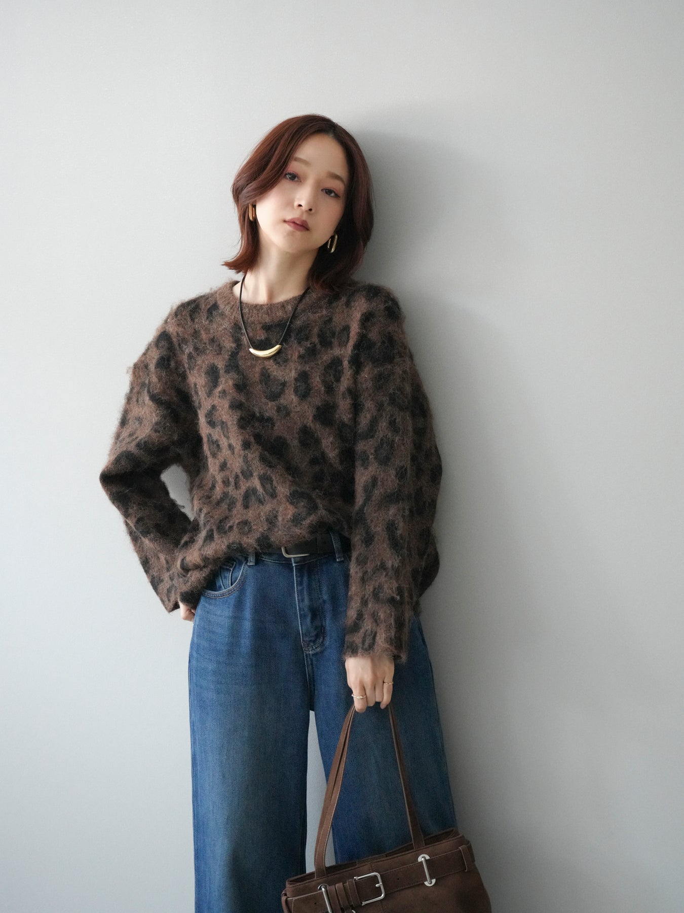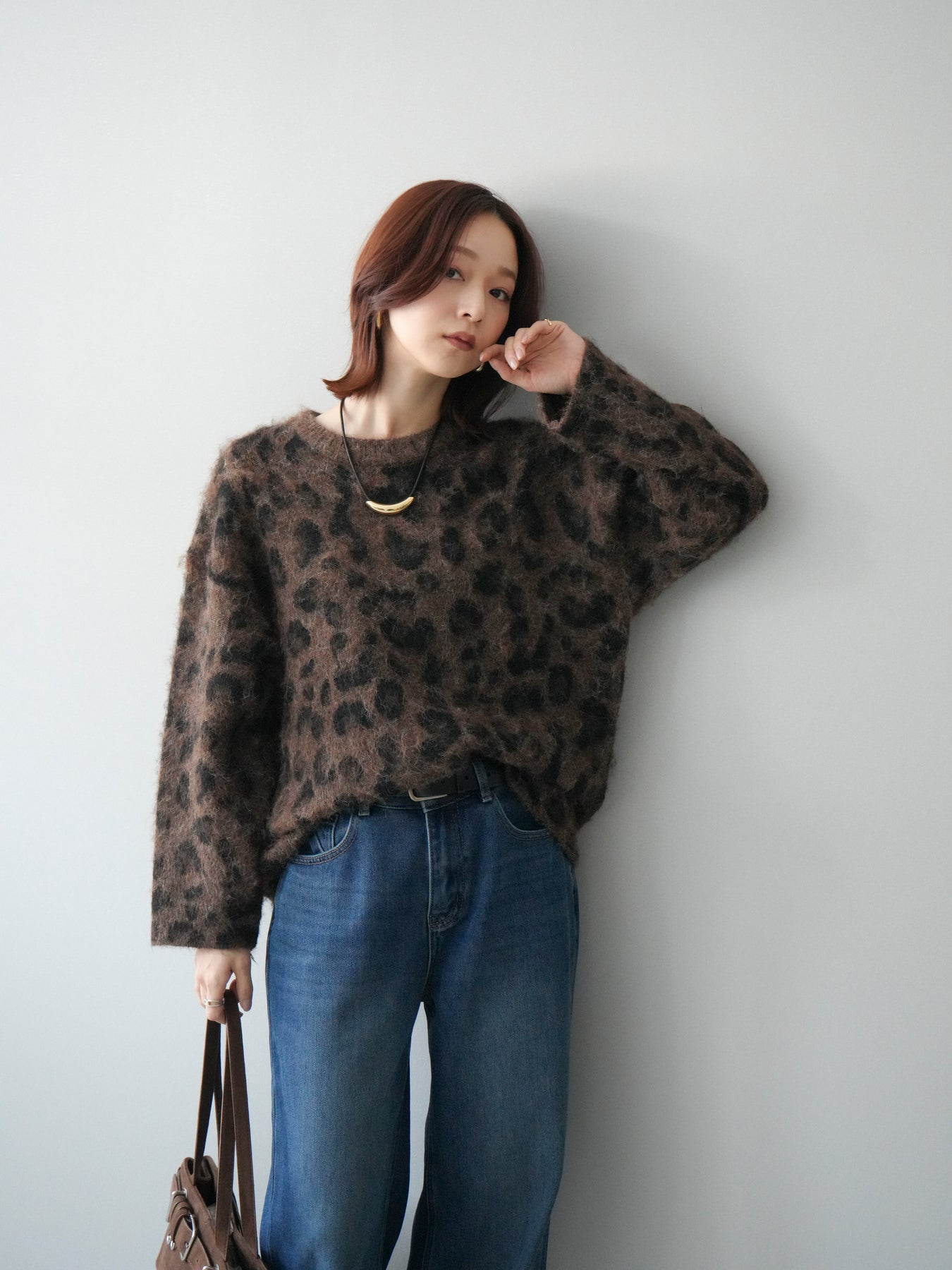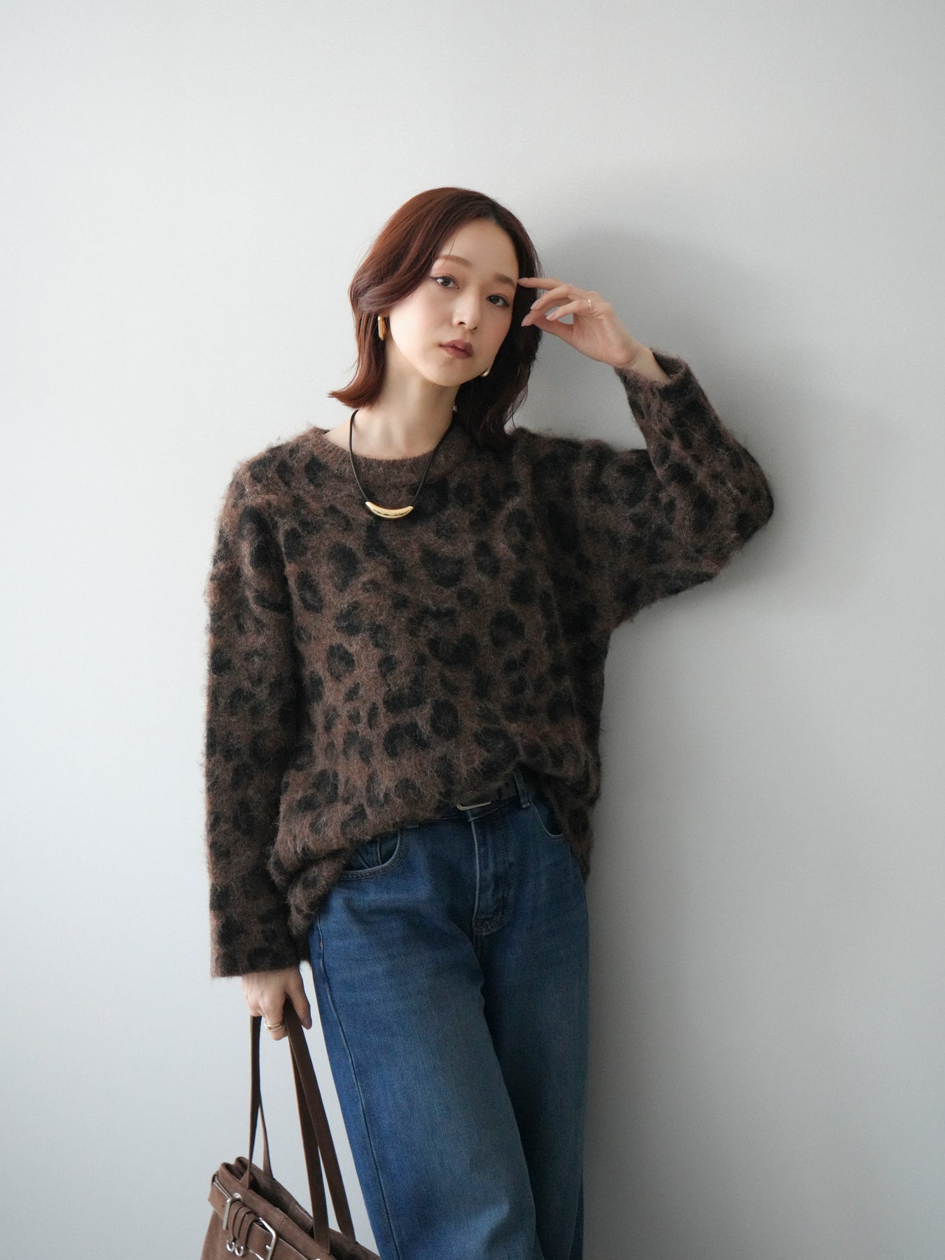 ふんわりとしたシャギー素材に、レオパード柄を落とし込んだ存在感のあるニットプルオーバー。 毛足のある表情豊かな編み地が、シーズンムードを高めながらコーディネートの主役として映えます。 程よくラフな雰囲気がありつつも、柄のバランスが取りやすく、取り入れるだけでスタイリングにこなれ感をプラス。 シンプルなボトムと合わせるだけで、洗練されたカジュアルスタイルが完成します。 デイリーコーデにアクセントを加えたいときにおすすめの一着です。