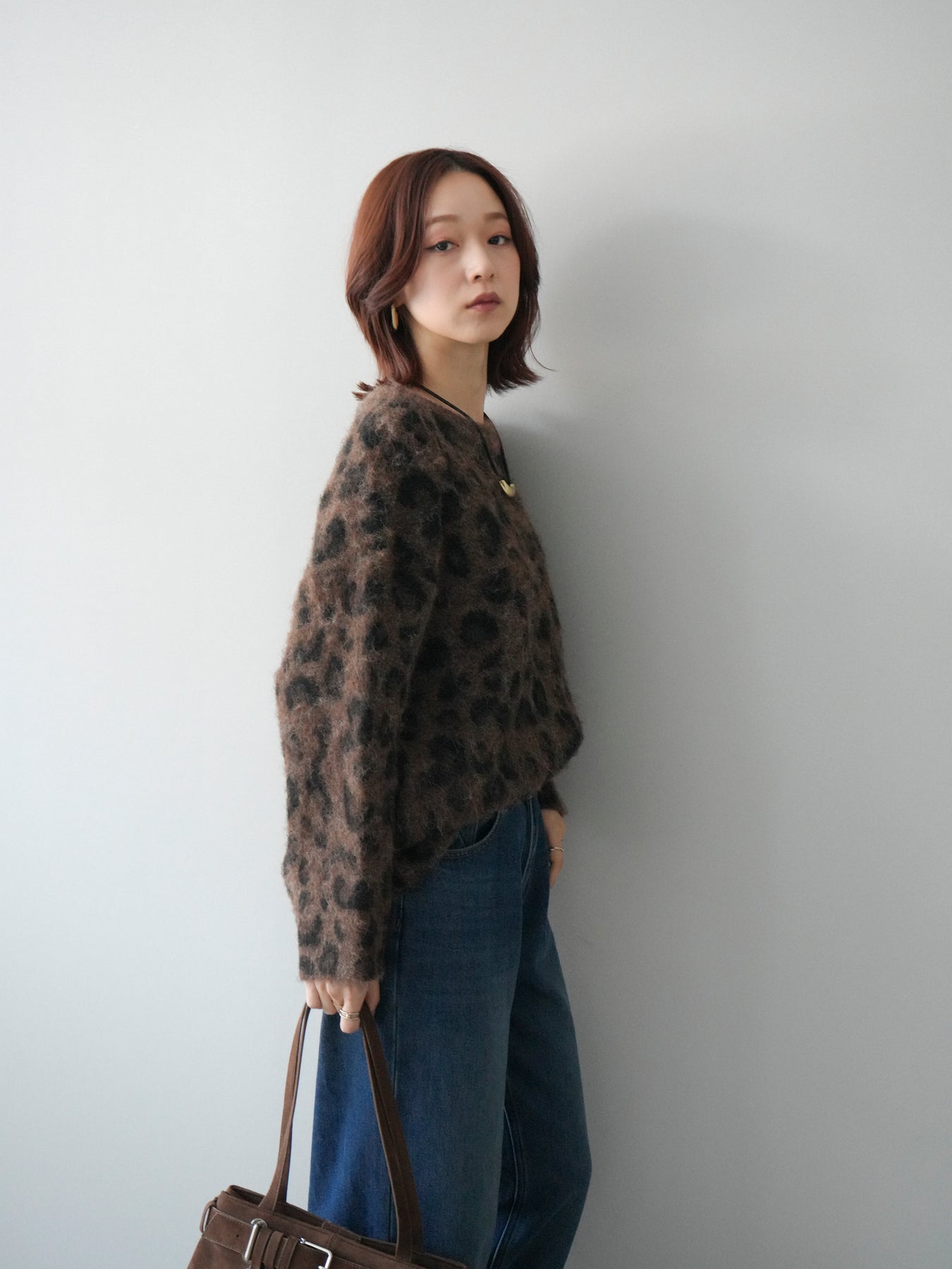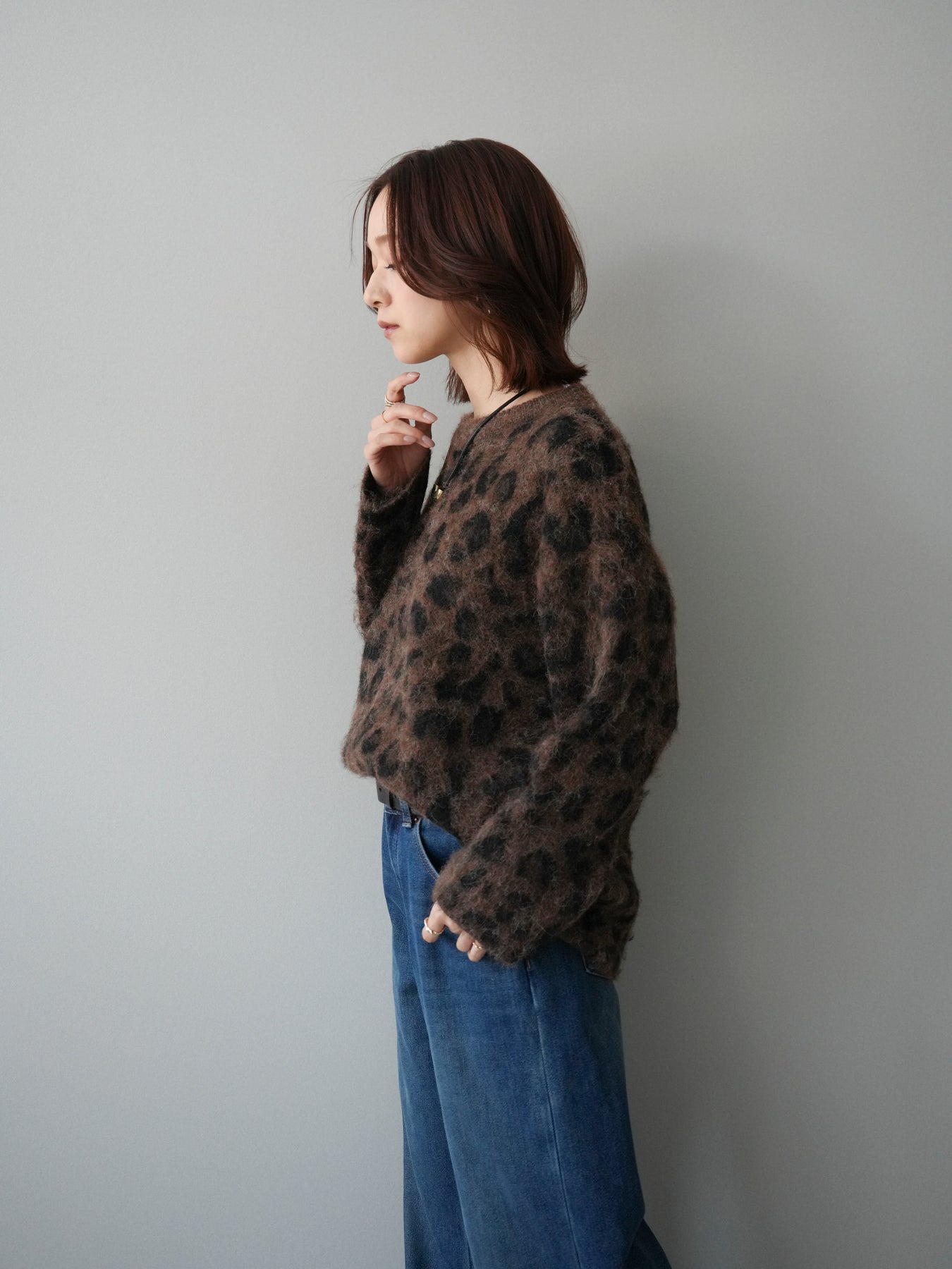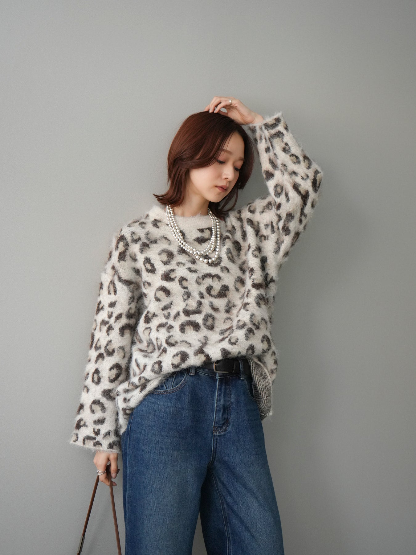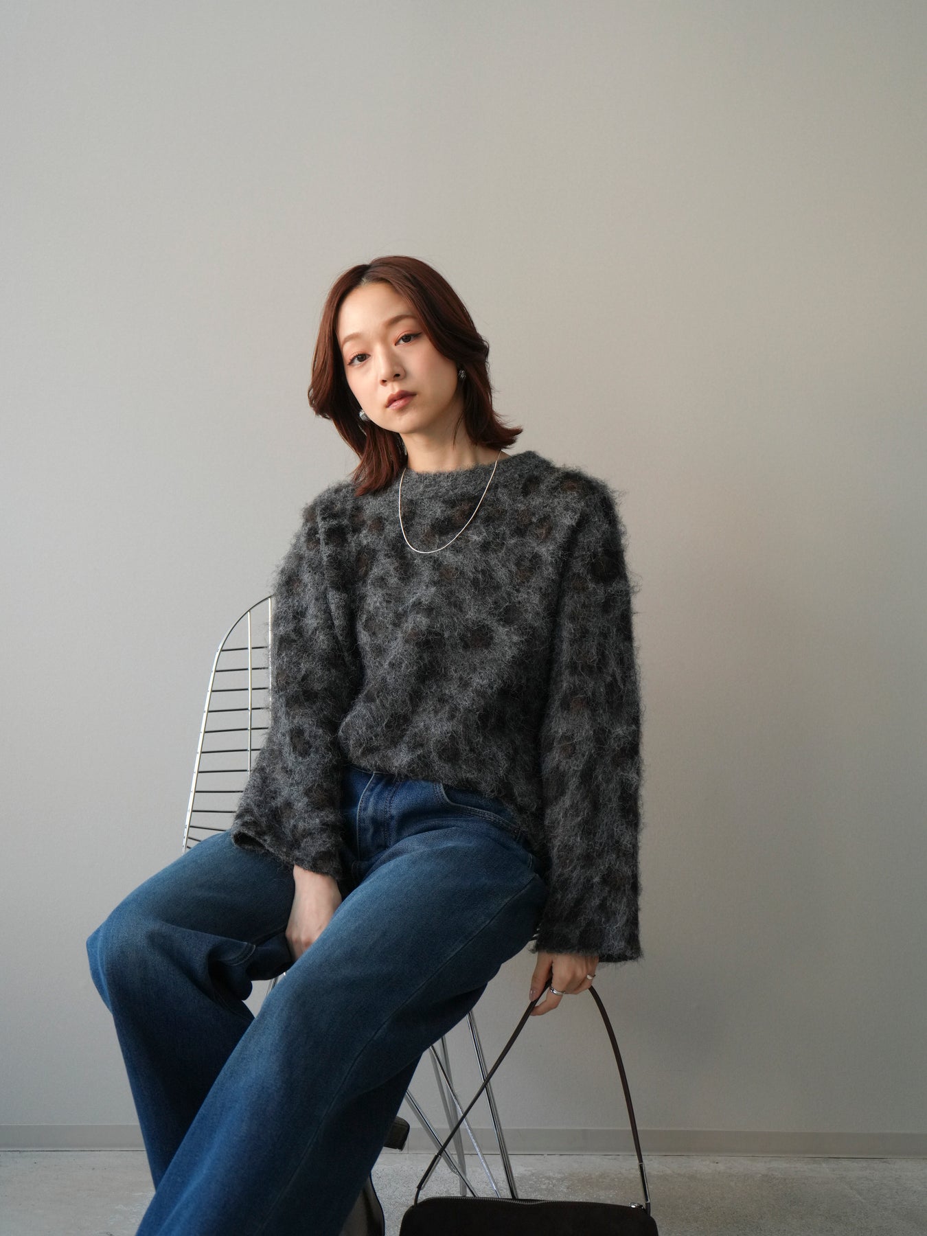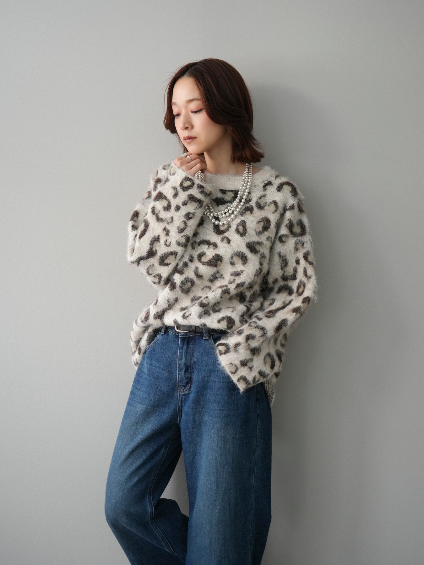 ふんわりとしたシャギー素材に、レオパード柄を落とし込んだ存在感のあるニットプルオーバー。 毛足のある表情豊かな編み地が、シーズンムードを高めながらコーディネートの主役として映えます。 程よくラフな雰囲気がありつつも、柄のバランスが取りやすく、取り入れるだけでスタイリングにこなれ感をプラス。 シンプルなボトムと合わせるだけで、洗練されたカジュアルスタイルが完成します。 デイリーコーデにアクセントを加えたいときにおすすめの一着です。
