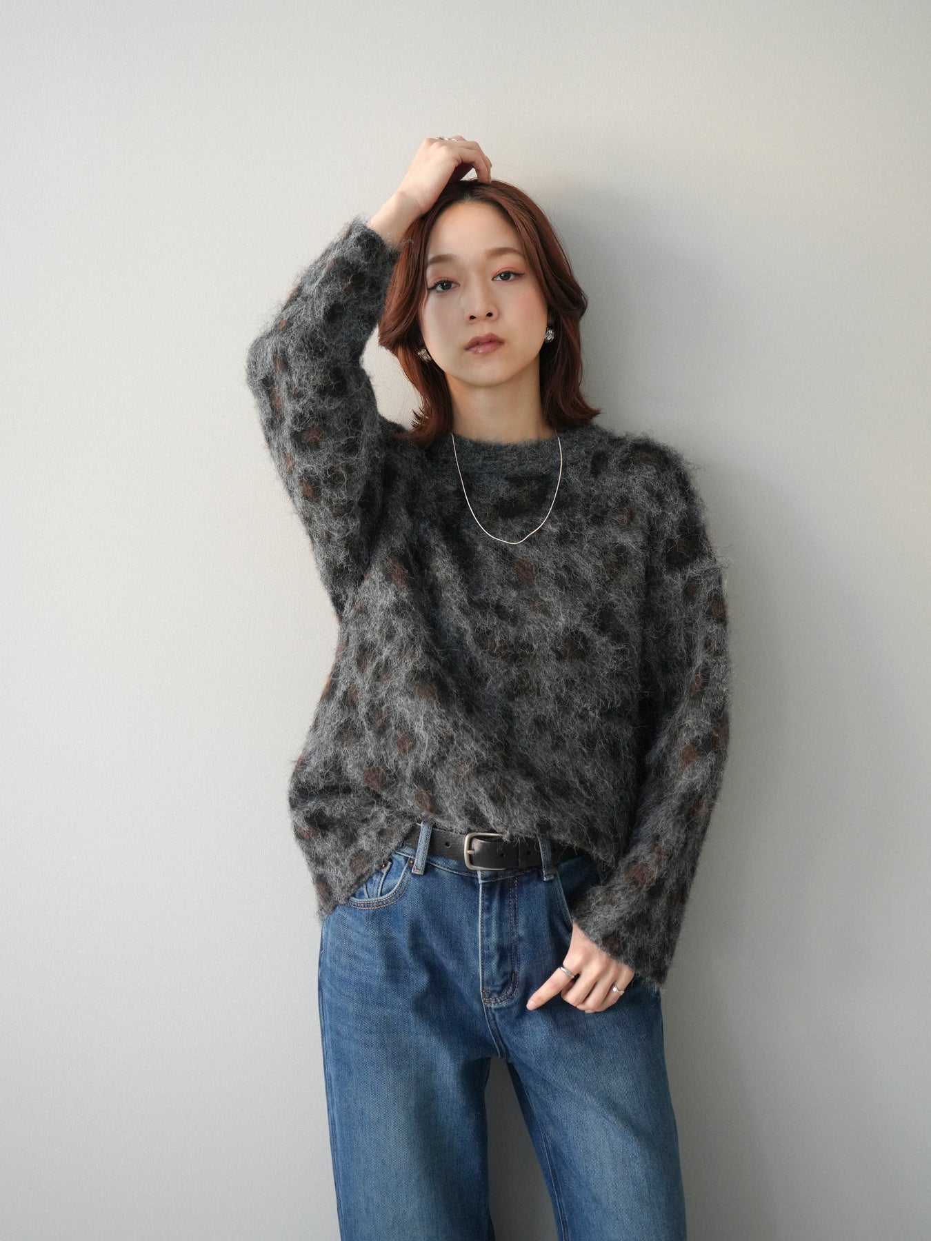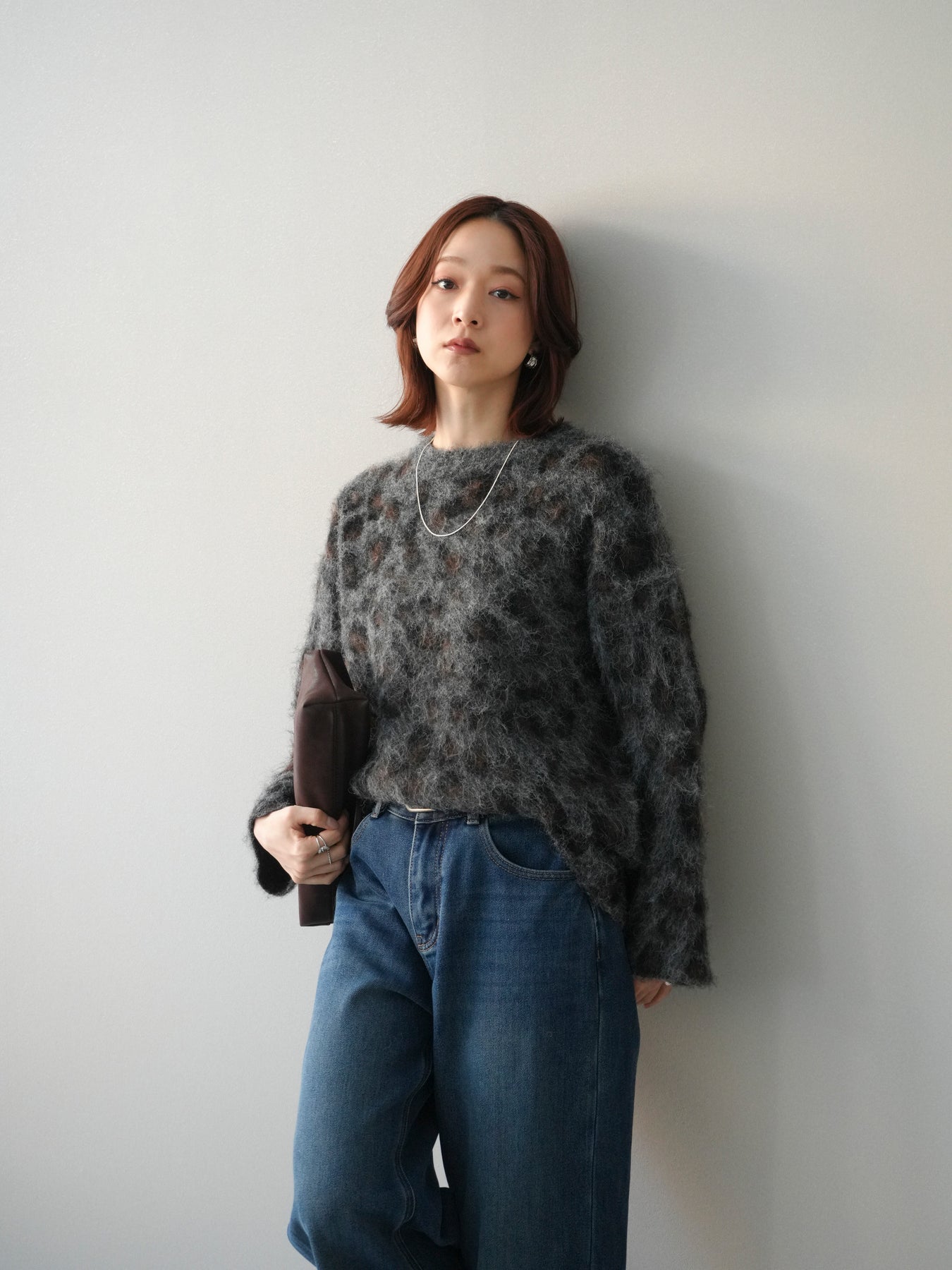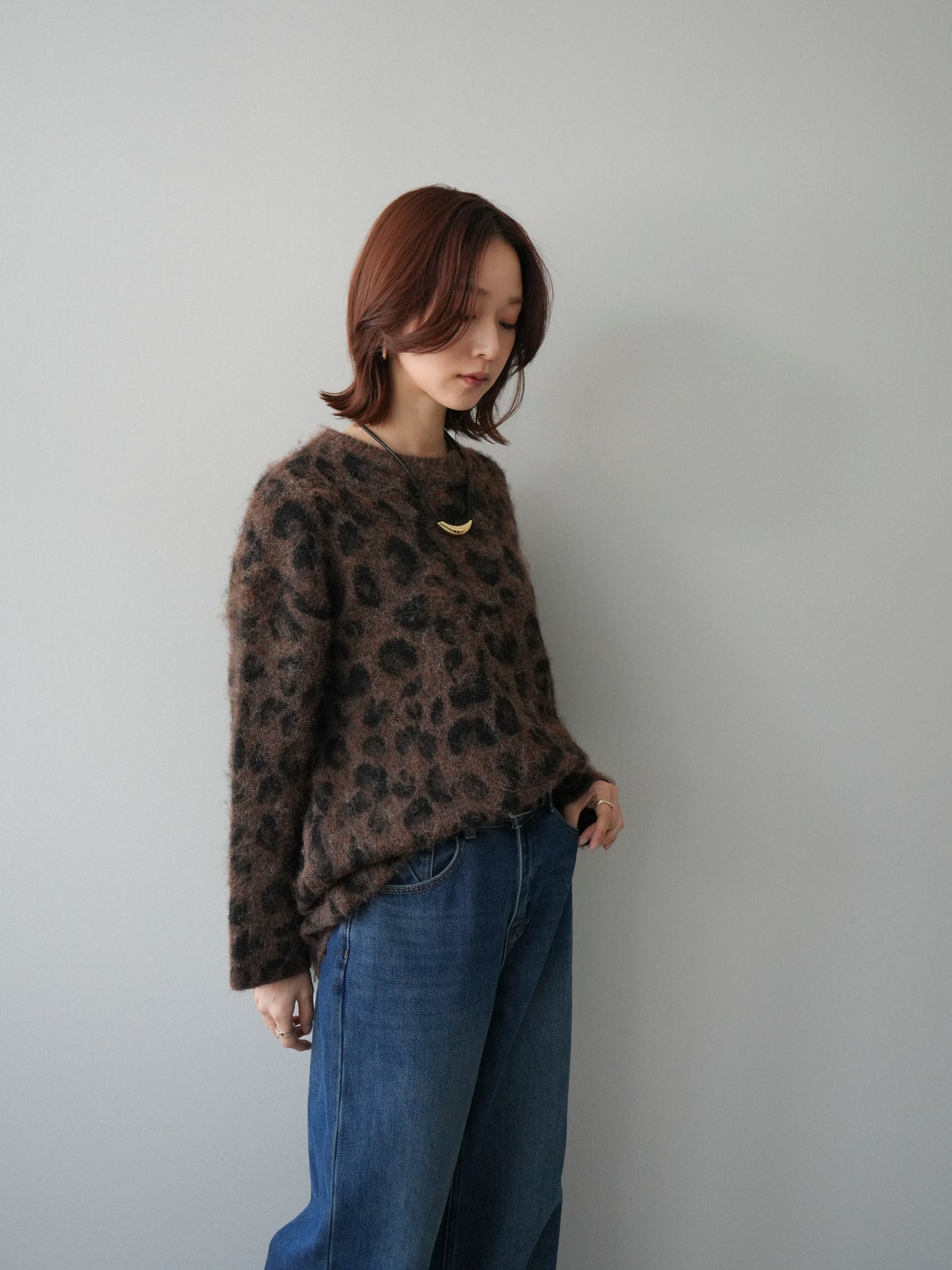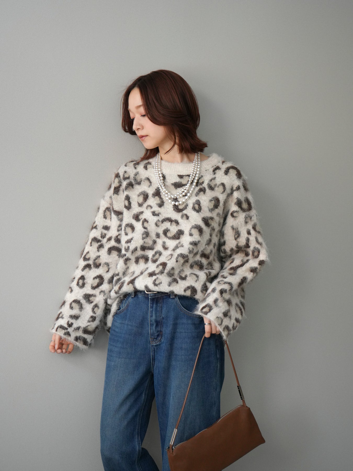 ふんわりとしたシャギー素材に、レオパード柄を落とし込んだ存在感のあるニットプルオーバー。 毛足のある表情豊かな編み地が、シーズンムードを高めながらコーディネートの主役として映えます。 程よくラフな雰囲気がありつつも、柄のバランスが取りやすく、取り入れるだけでスタイリングにこなれ感をプラス。 シンプルなボトムと合わせるだけで、洗練されたカジュアルスタイルが完成します。 デイリーコーデにアクセントを加えたいときにおすすめの一着です。