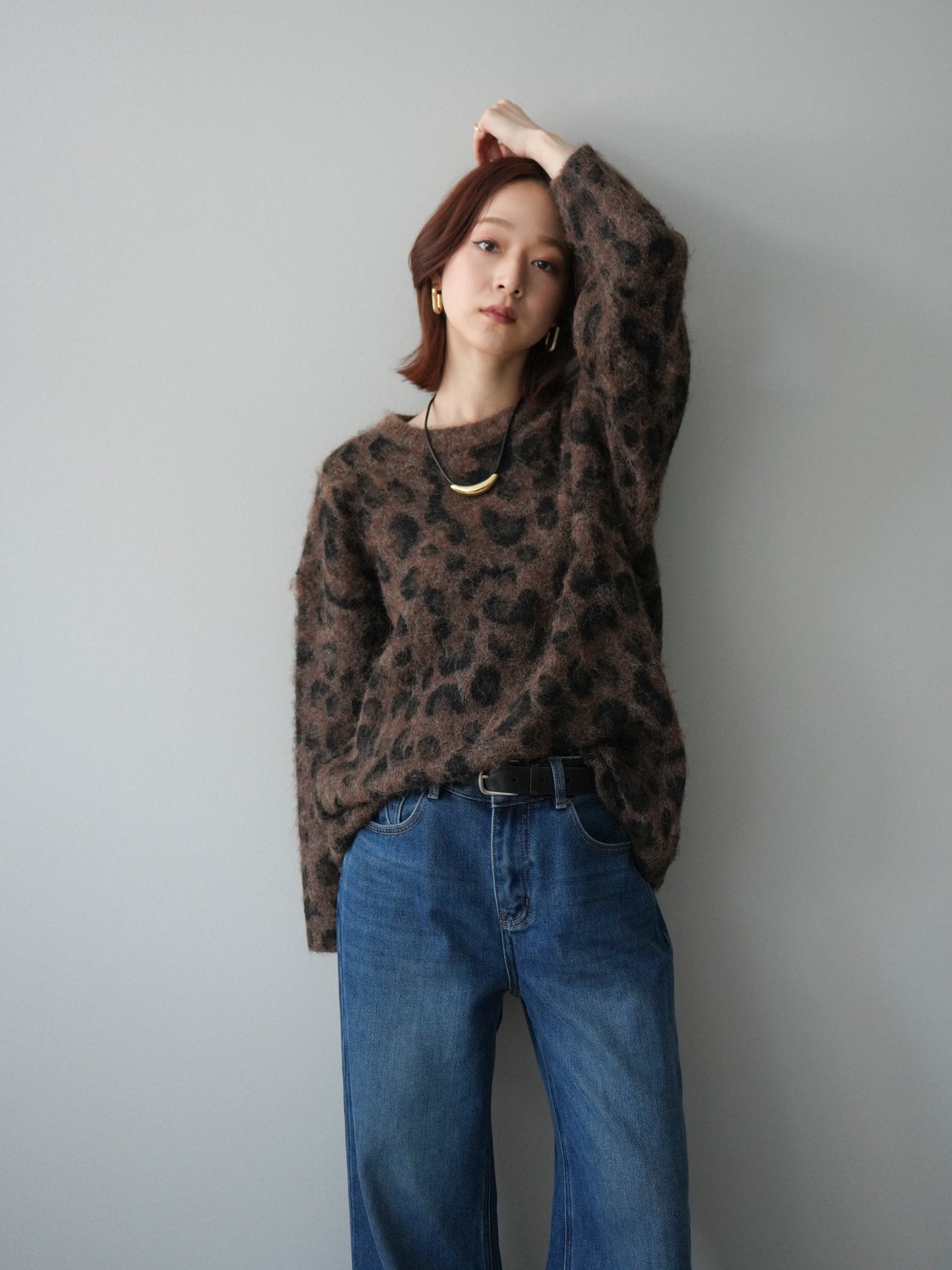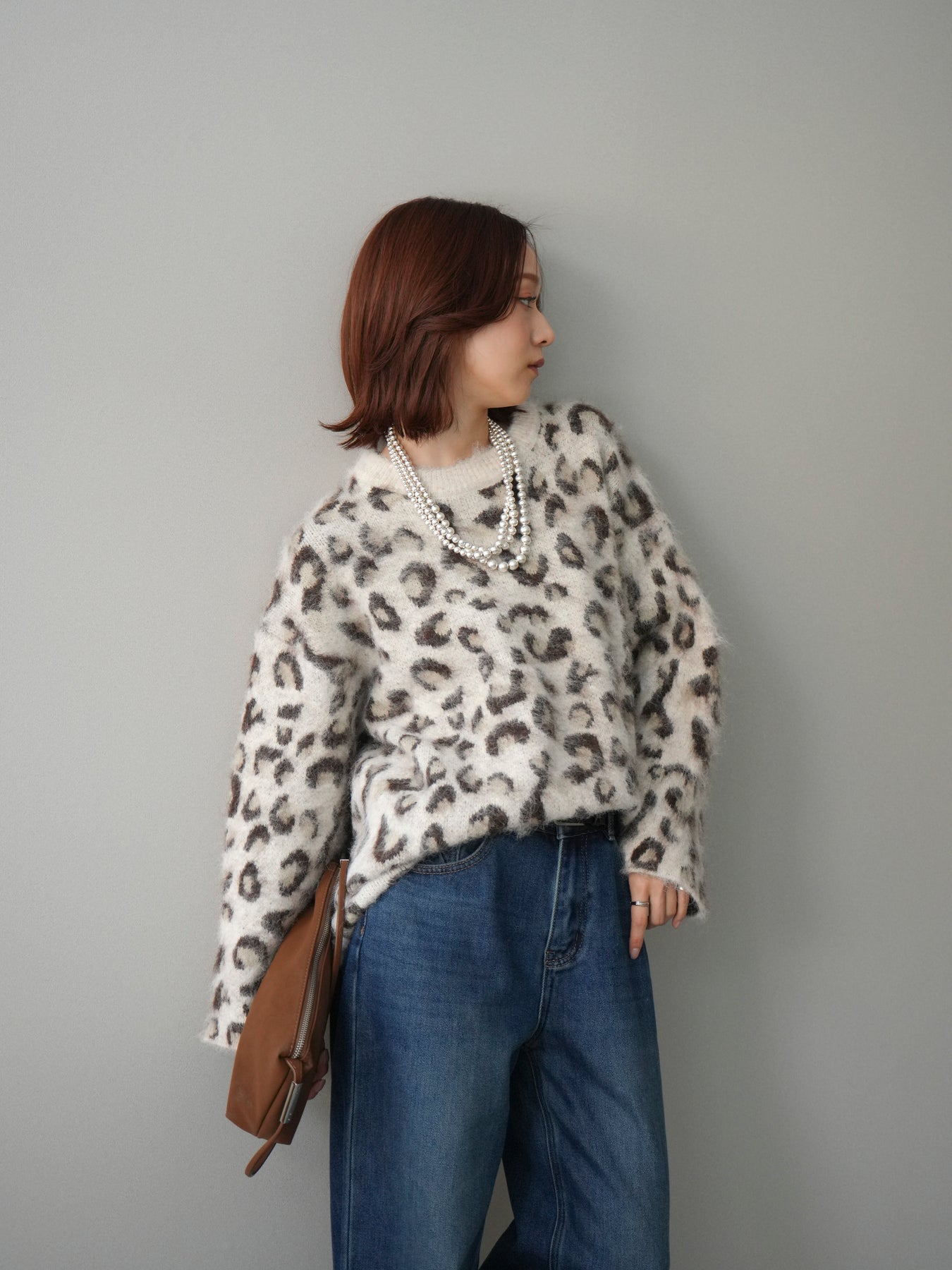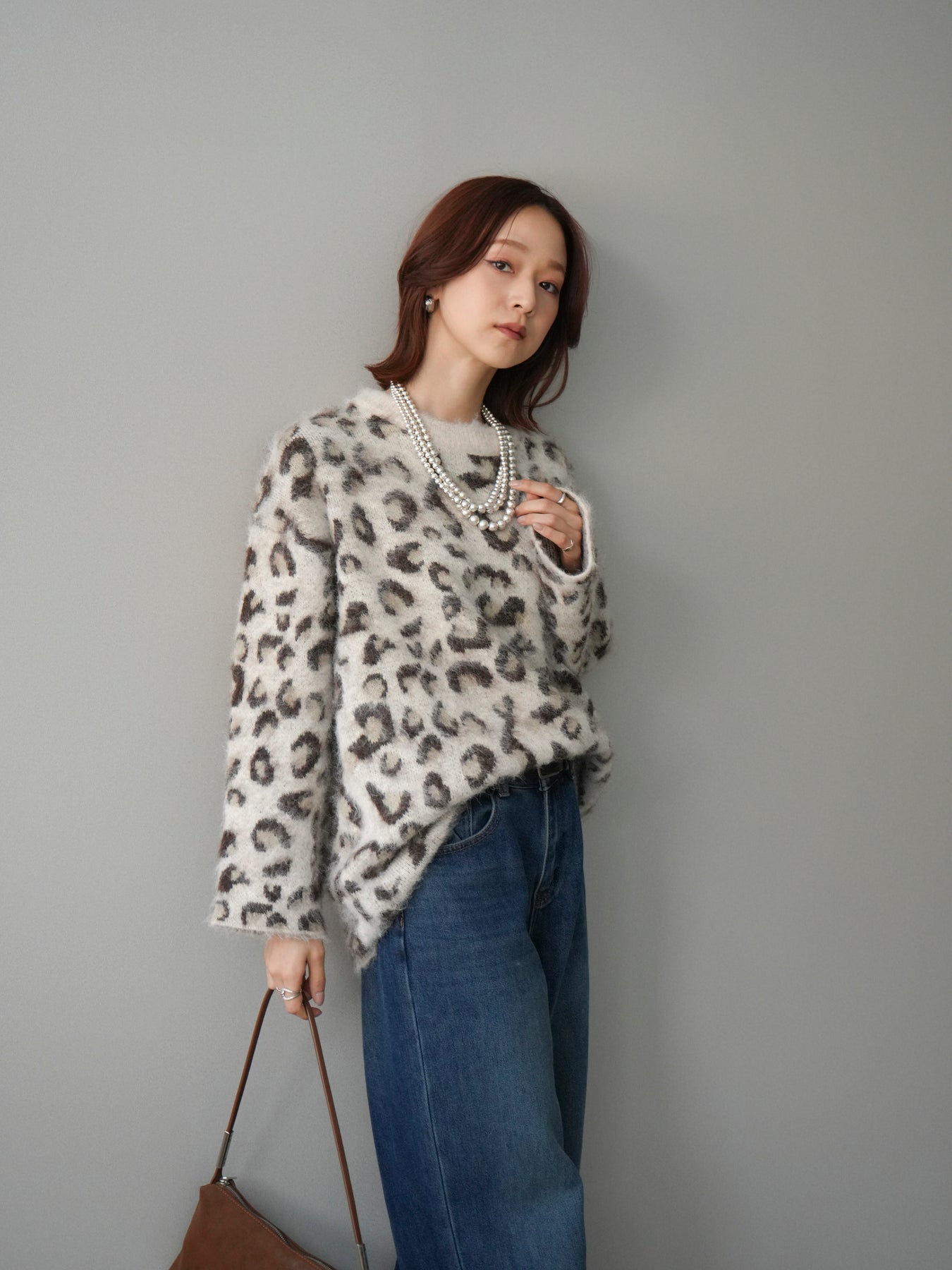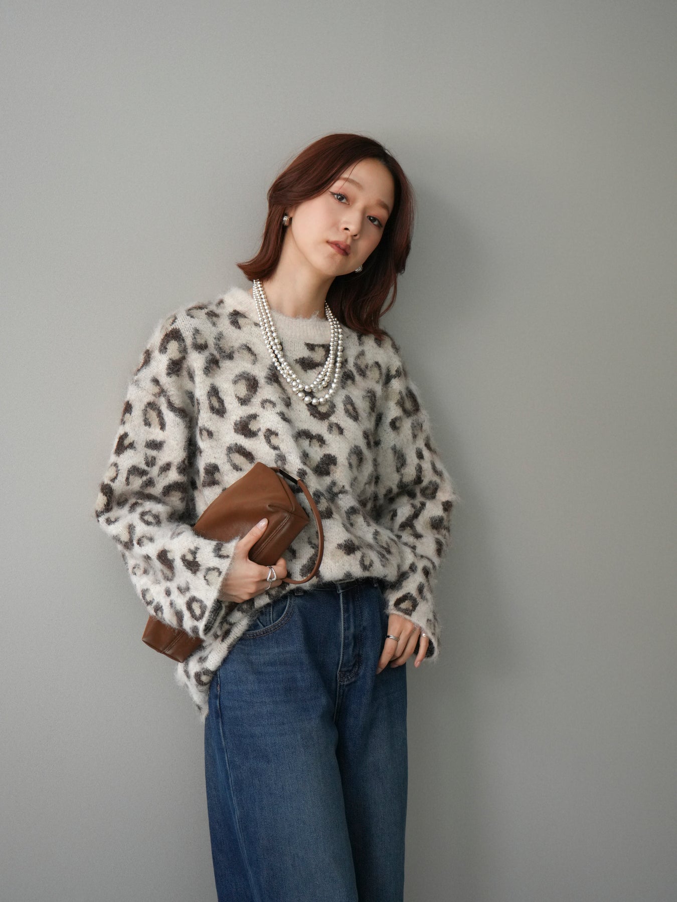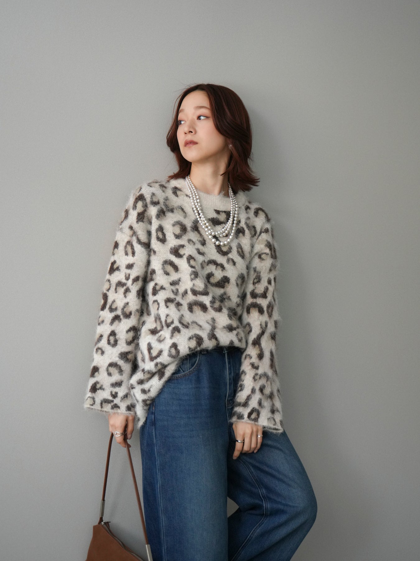 ふんわりとしたシャギー素材に、レオパード柄を落とし込んだ存在感のあるニットプルオーバー。 毛足のある表情豊かな編み地が、シーズンムードを高めながらコーディネートの主役として映えます。 程よくラフな雰囲気がありつつも、柄のバランスが取りやすく、取り入れるだけでスタイリングにこなれ感をプラス。 シンプルなボトムと合わせるだけで、洗練されたカジュアルスタイルが完成します。 デイリーコーデにアクセントを加えたいときにおすすめの一着です。