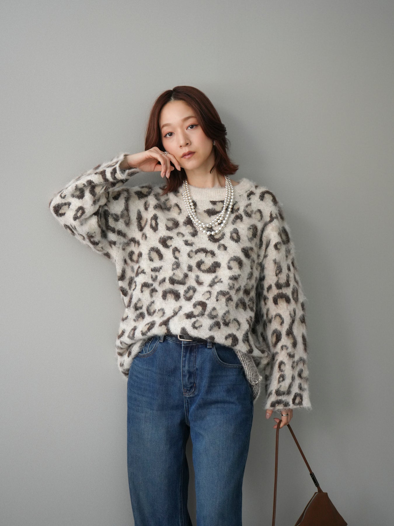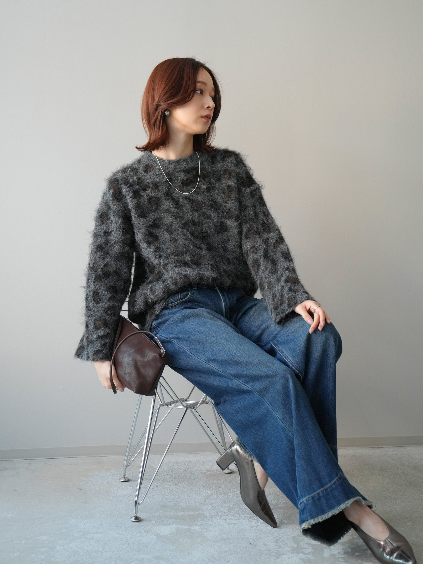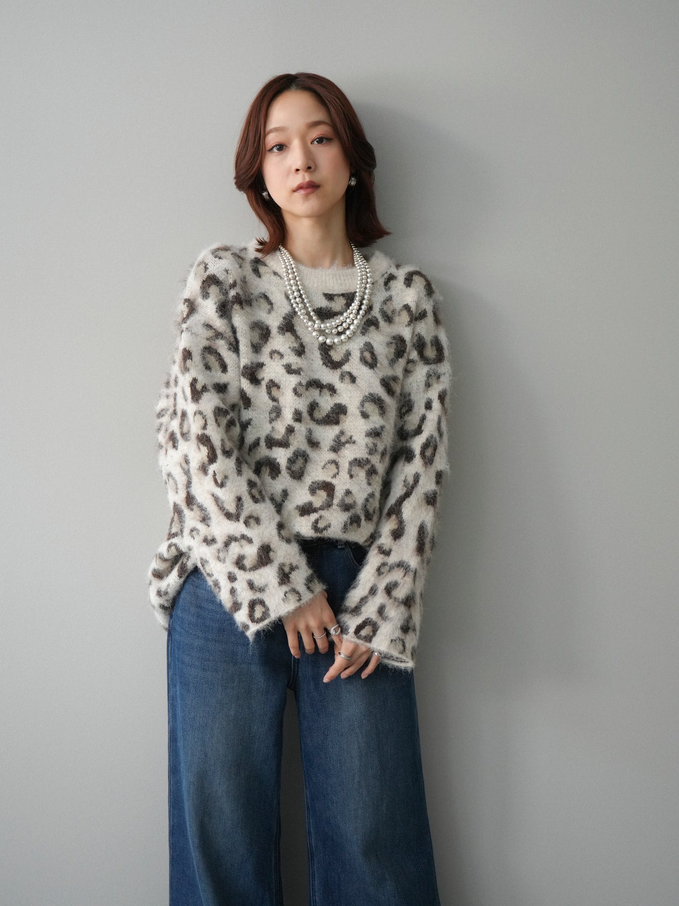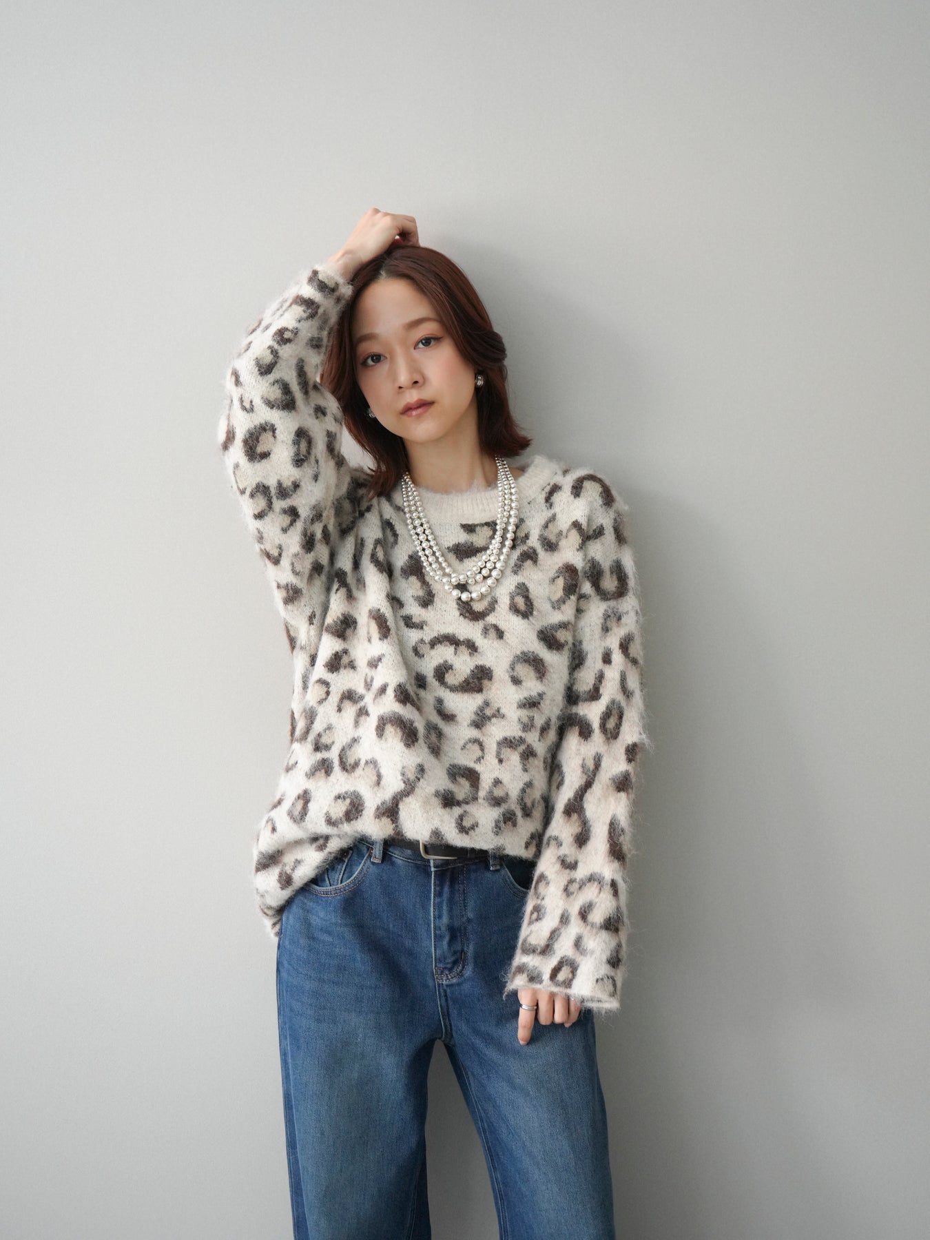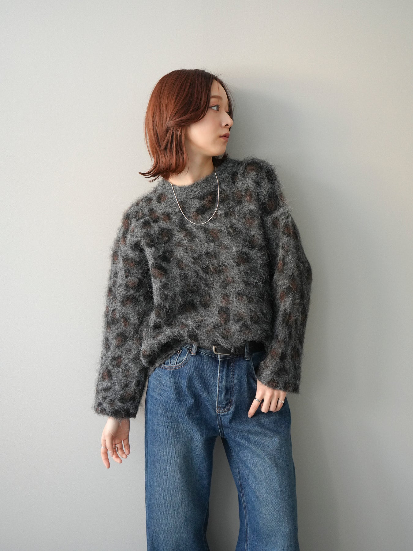 ふんわりとしたシャギー素材に、レオパード柄を落とし込んだ存在感のあるニットプルオーバー。 毛足のある表情豊かな編み地が、シーズンムードを高めながらコーディネートの主役として映えます。 程よくラフな雰囲気がありつつも、柄のバランスが取りやすく、取り入れるだけでスタイリングにこなれ感をプラス。 シンプルなボトムと合わせるだけで、洗練されたカジュアルスタイルが完成します。 デイリーコーデにアクセントを加えたいときにおすすめの一着です。