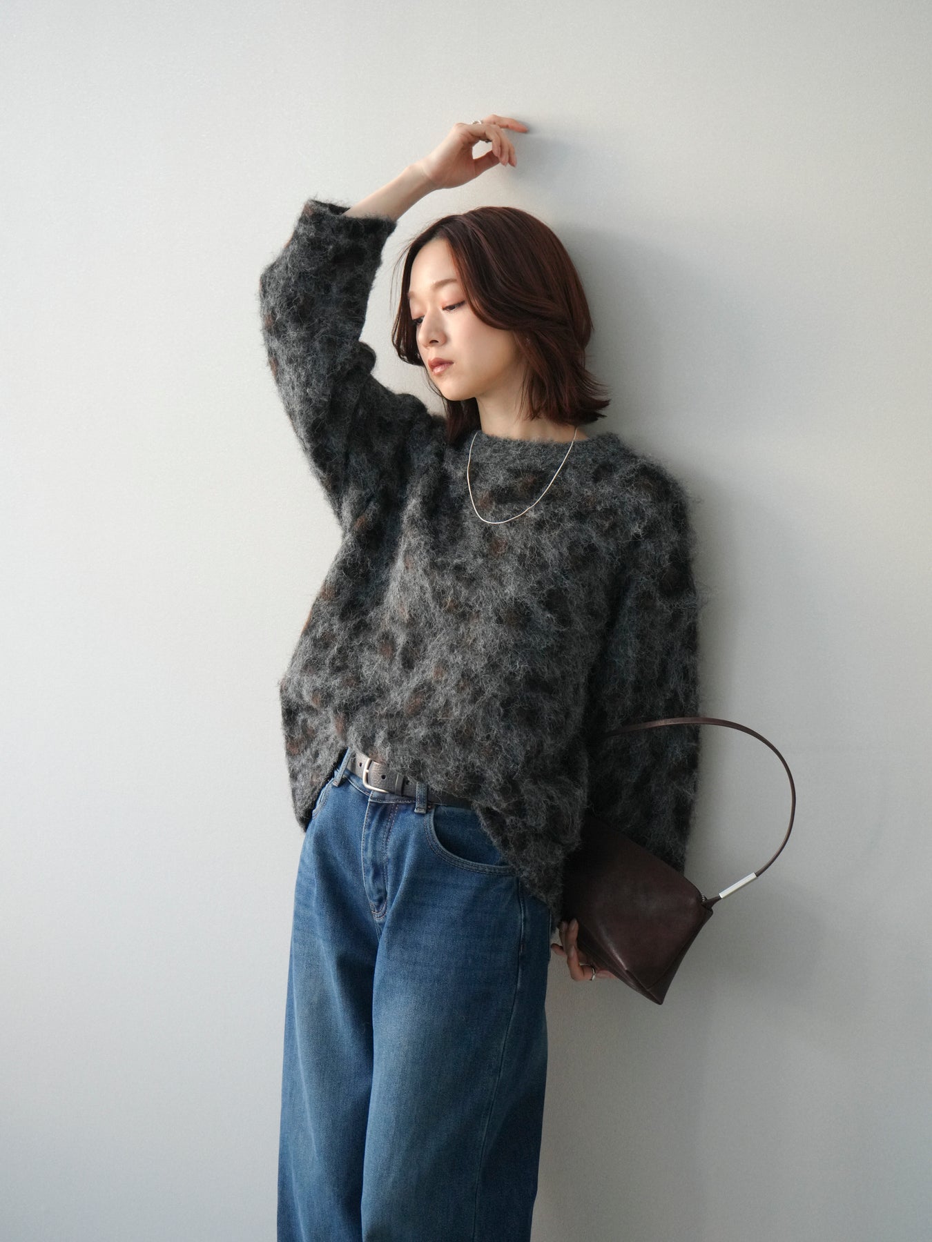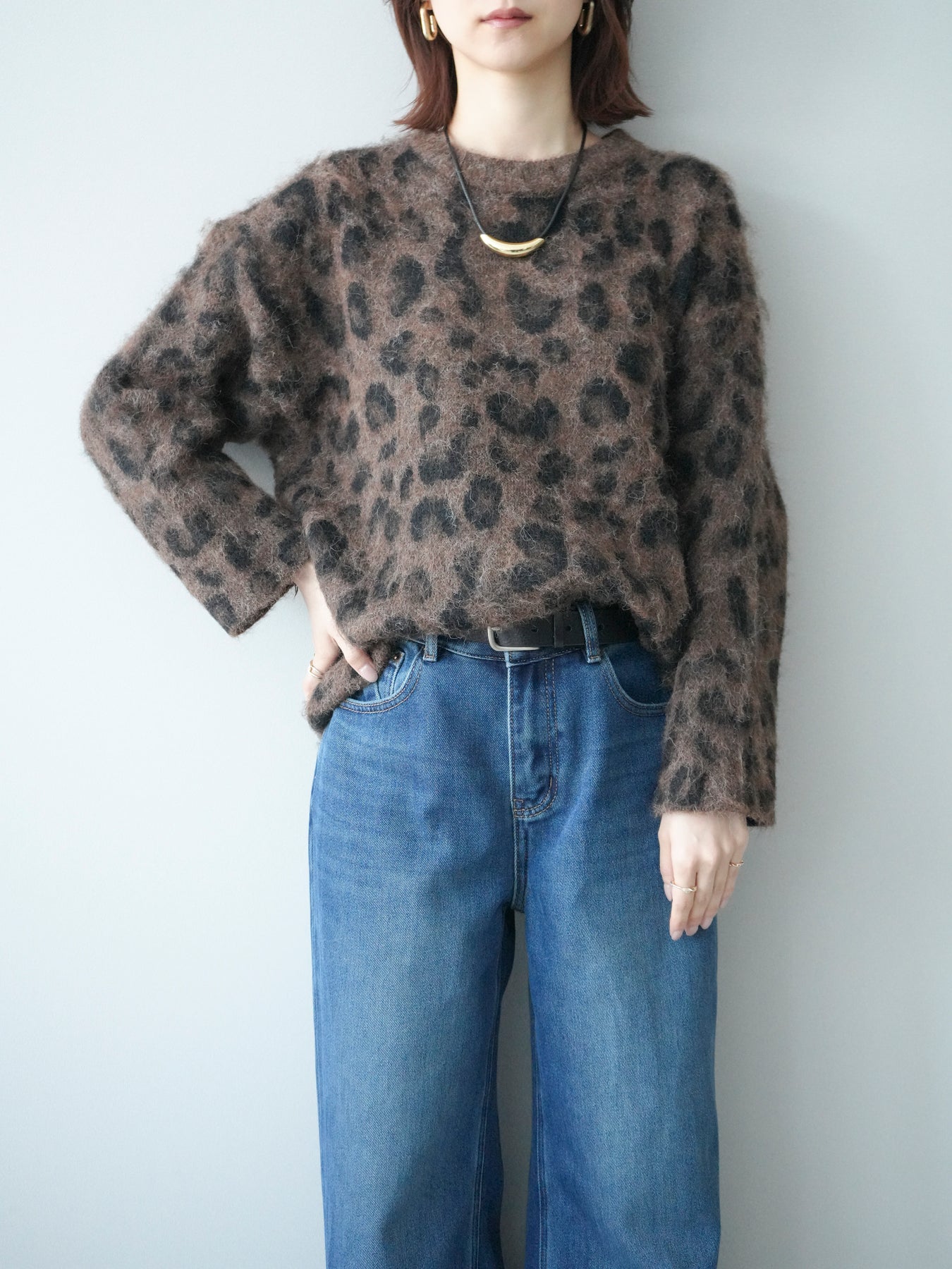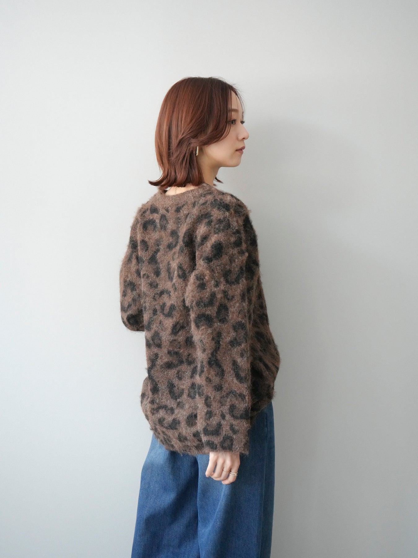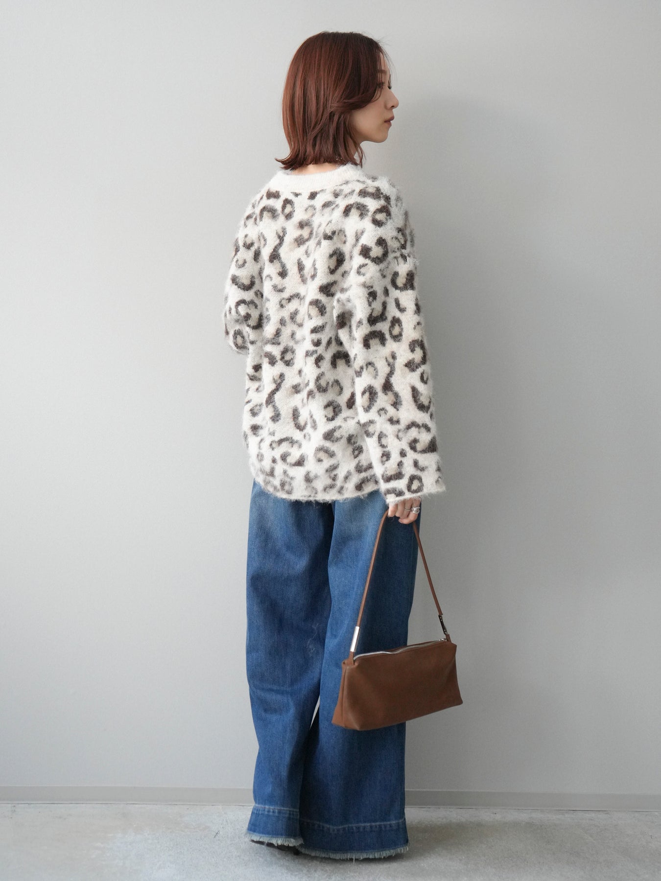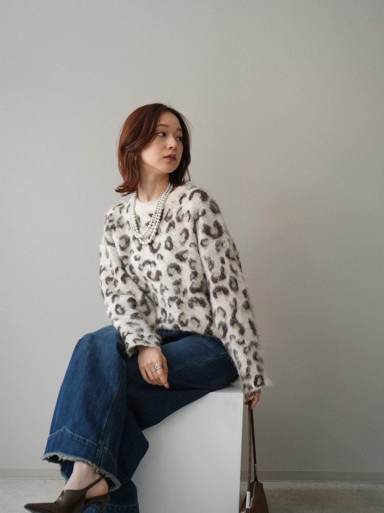 ふんわりとしたシャギー素材に、レオパード柄を落とし込んだ存在感のあるニットプルオーバー。 毛足のある表情豊かな編み地が、シーズンムードを高めながらコーディネートの主役として映えます。 程よくラフな雰囲気がありつつも、柄のバランスが取りやすく、取り入れるだけでスタイリングにこなれ感をプラス。 シンプルなボトムと合わせるだけで、洗練されたカジュアルスタイルが完成します。 デイリーコーデにアクセントを加えたいときにおすすめの一着です。