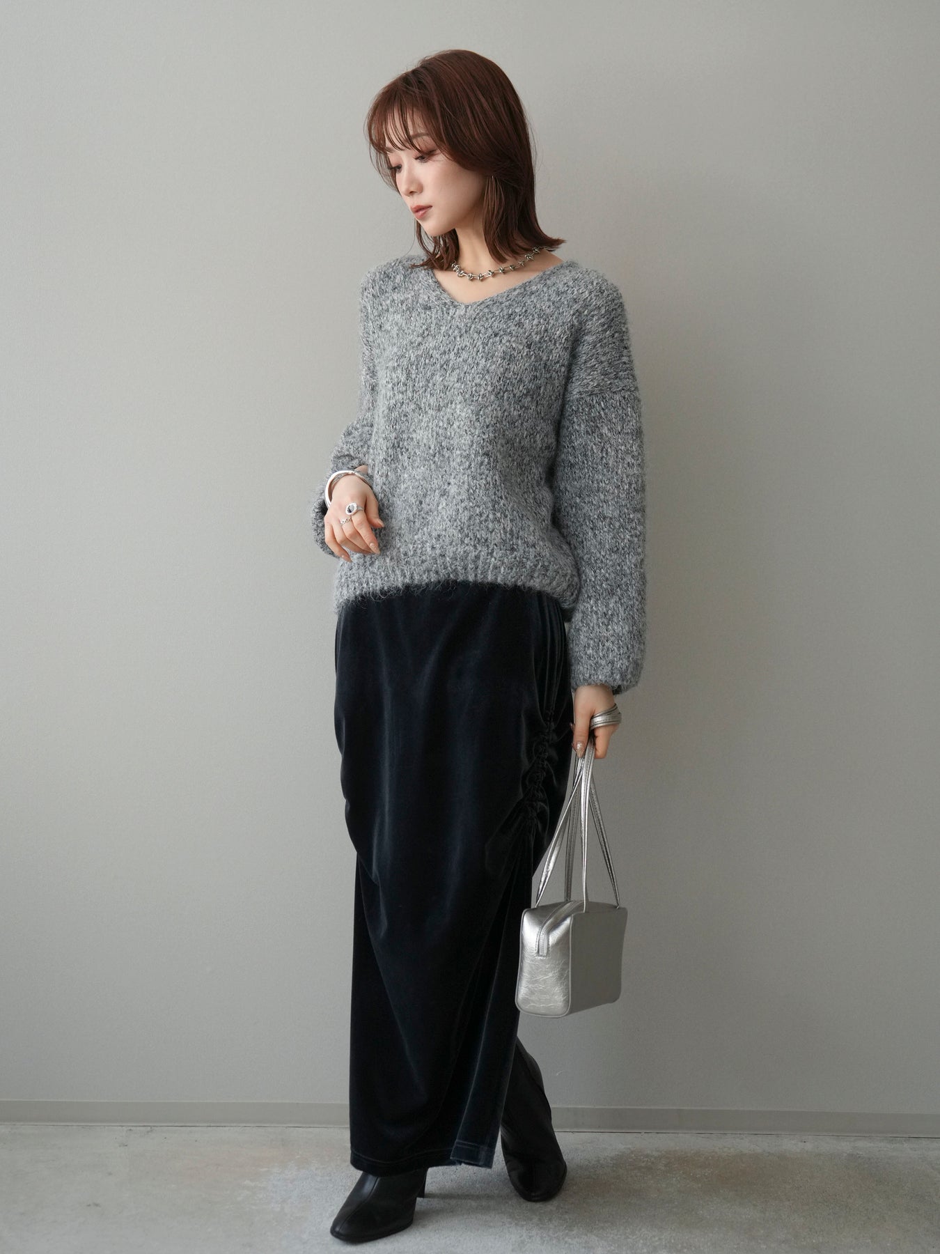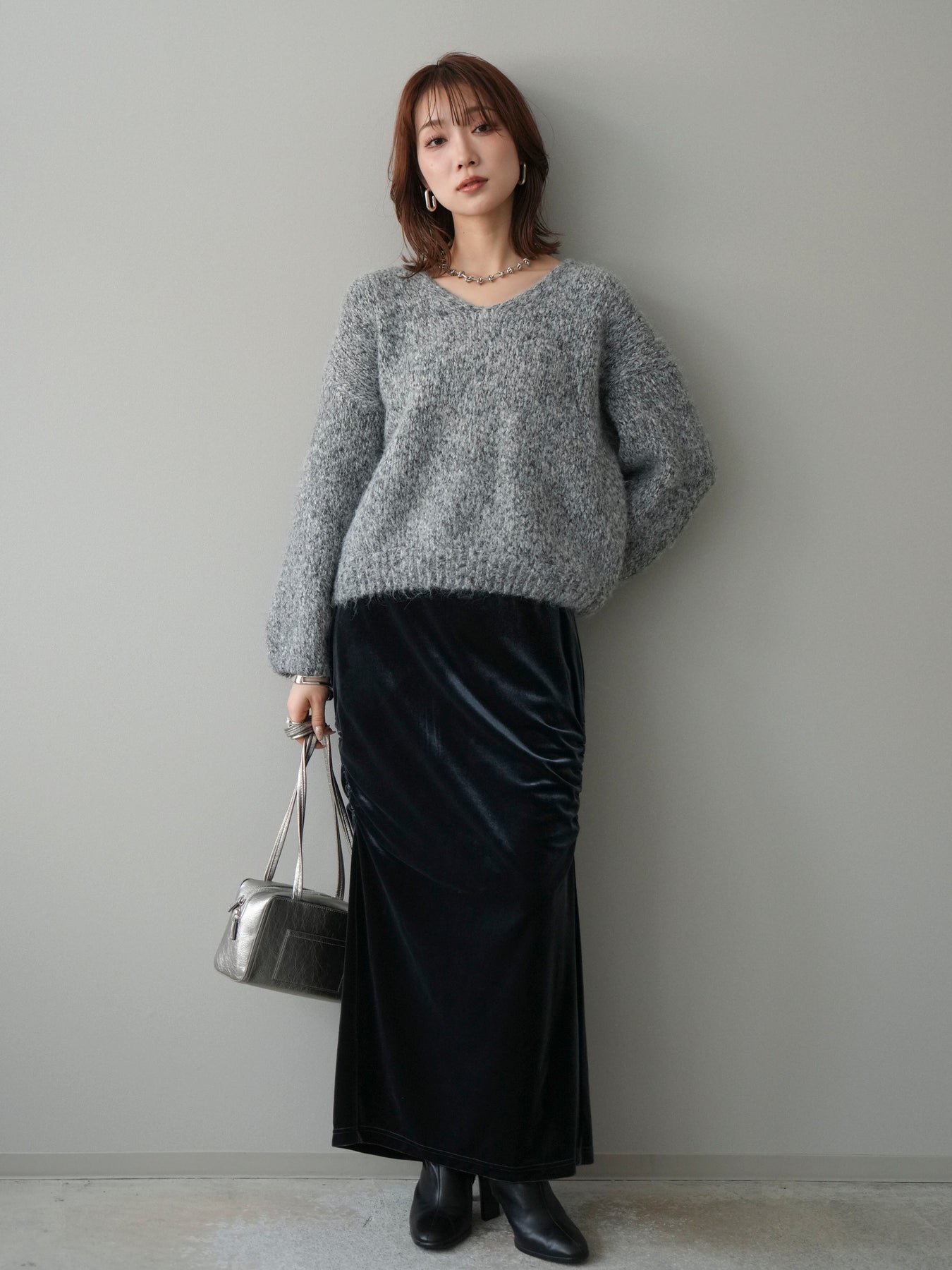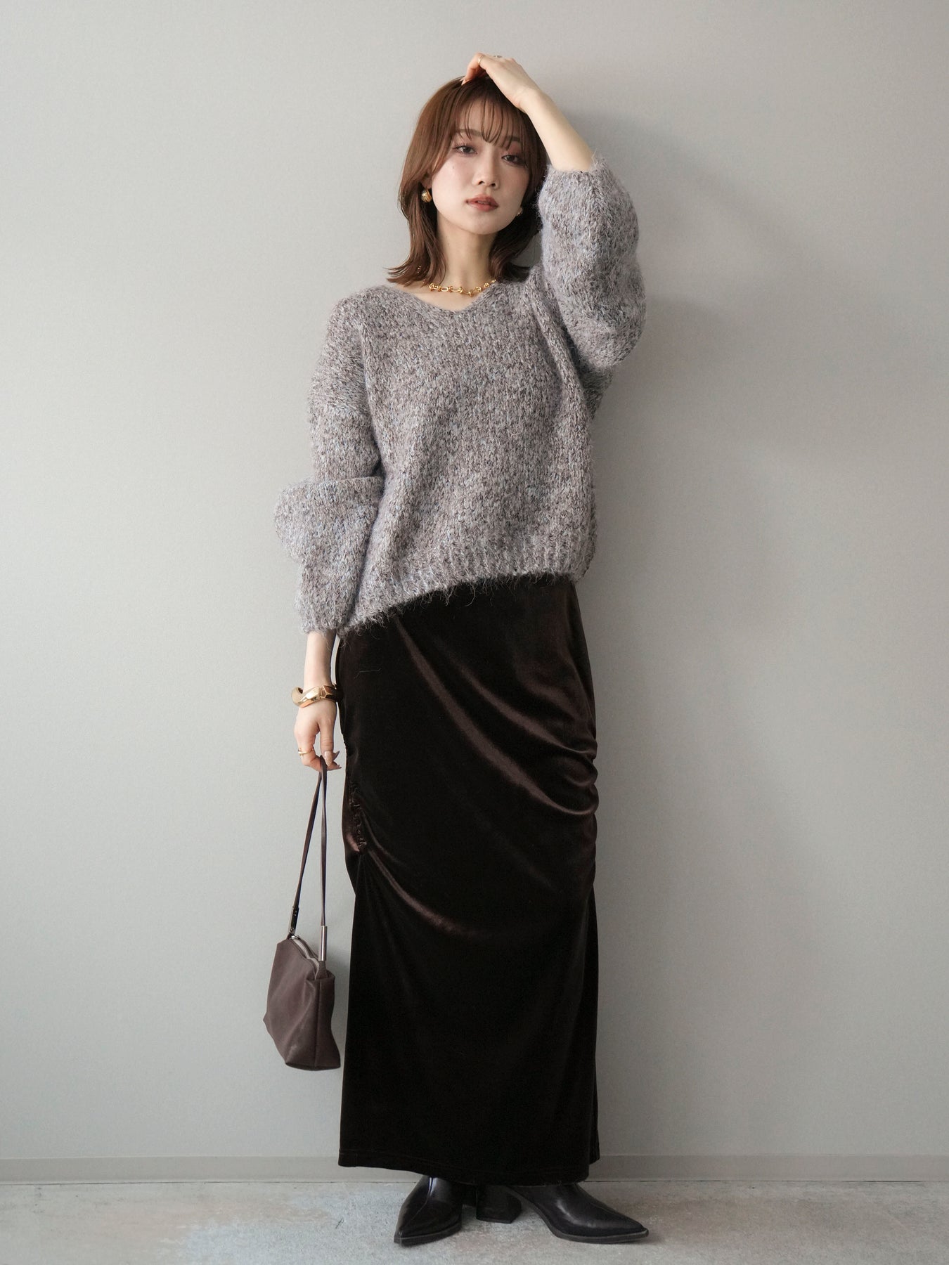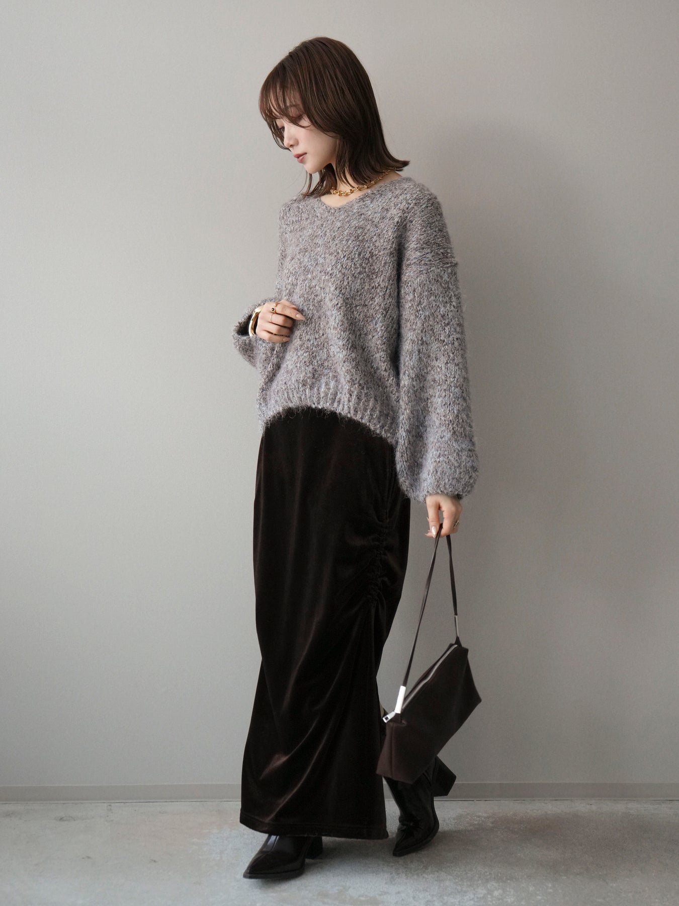 [SET]Vネックミックスヤーンニットプルオーバー+ギャザーベロアスカート(2set)
