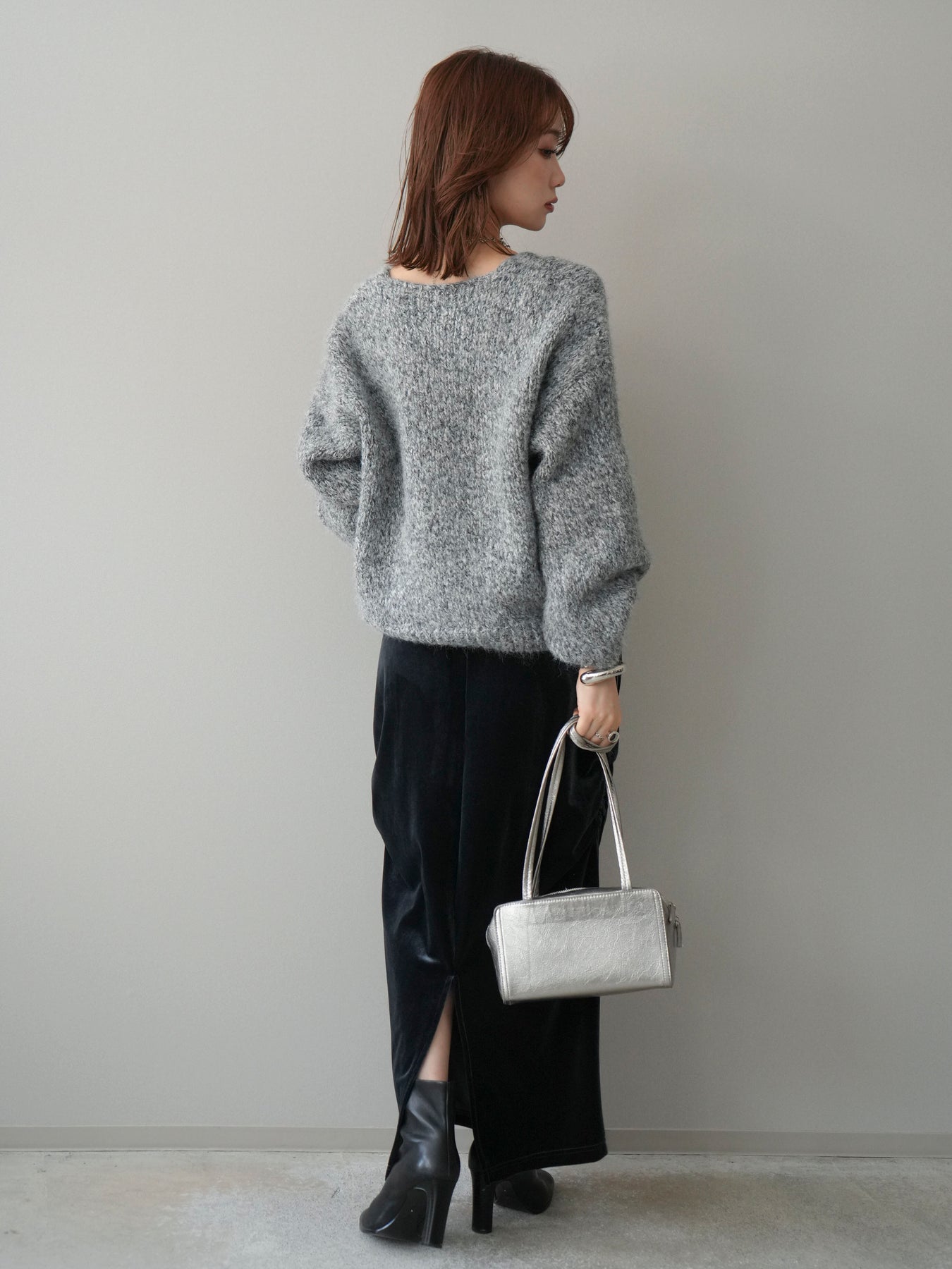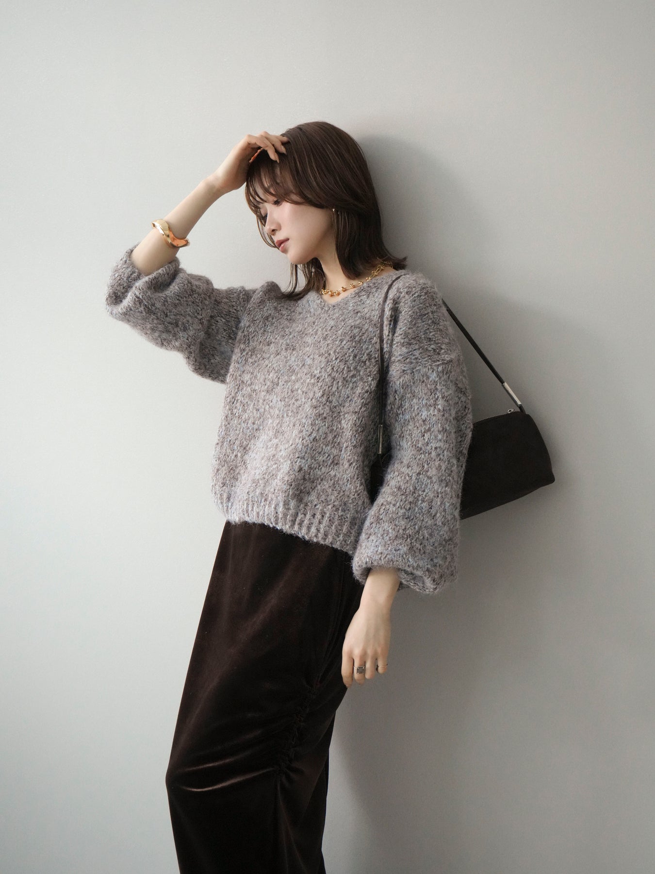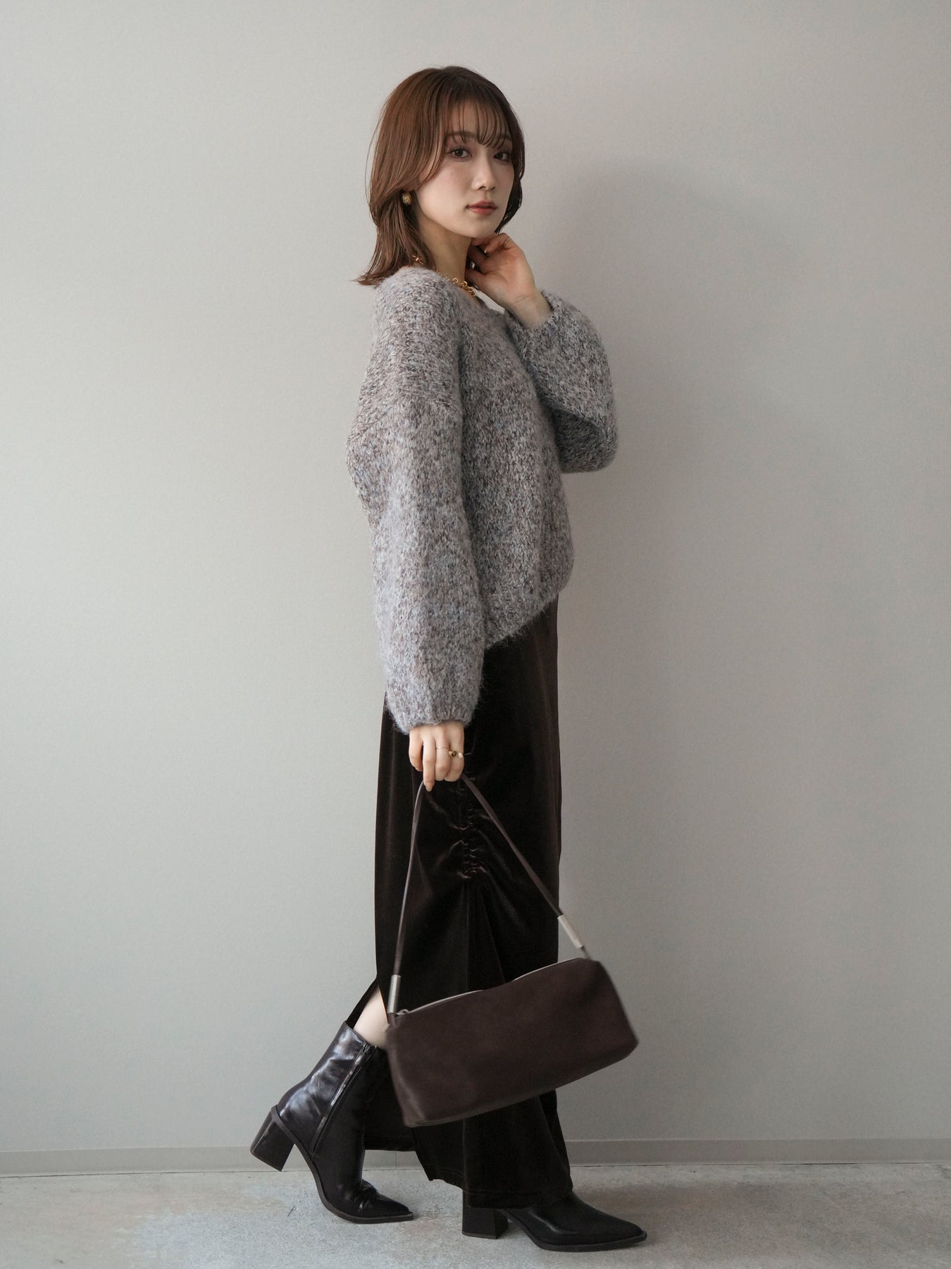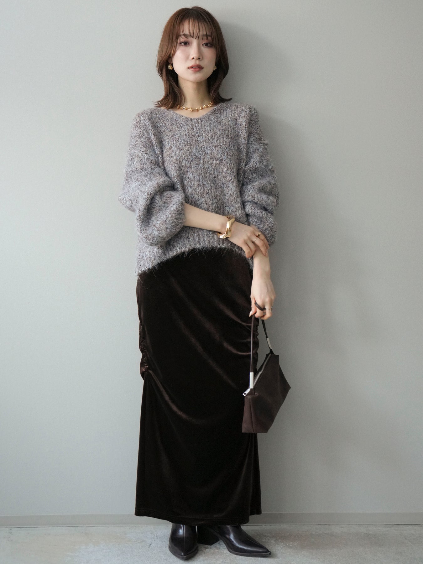 [SET]Vネックミックスヤーンニットプルオーバー+ギャザーベロアスカート(2set)