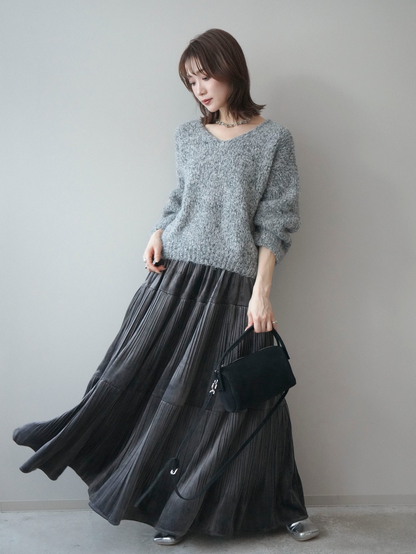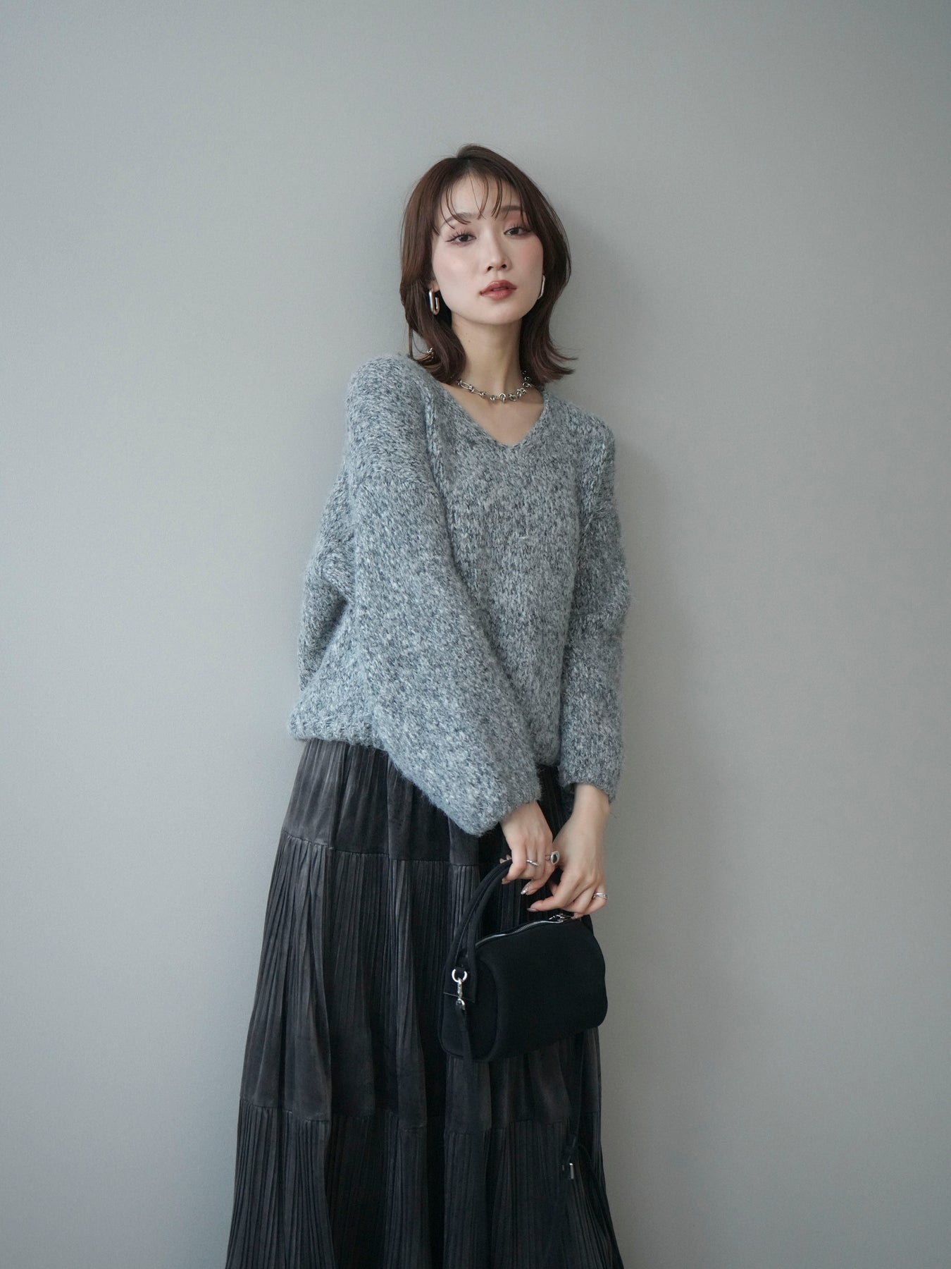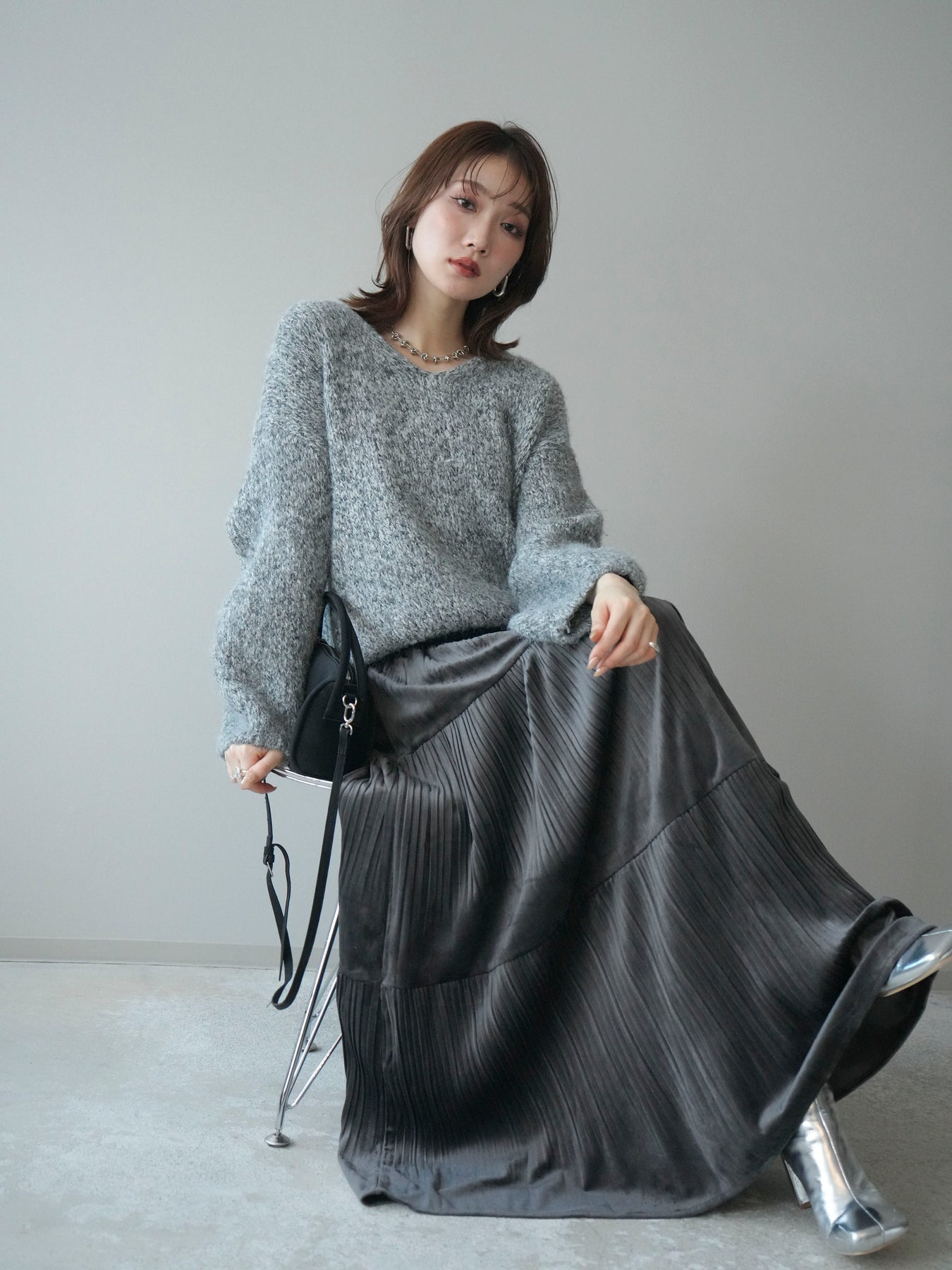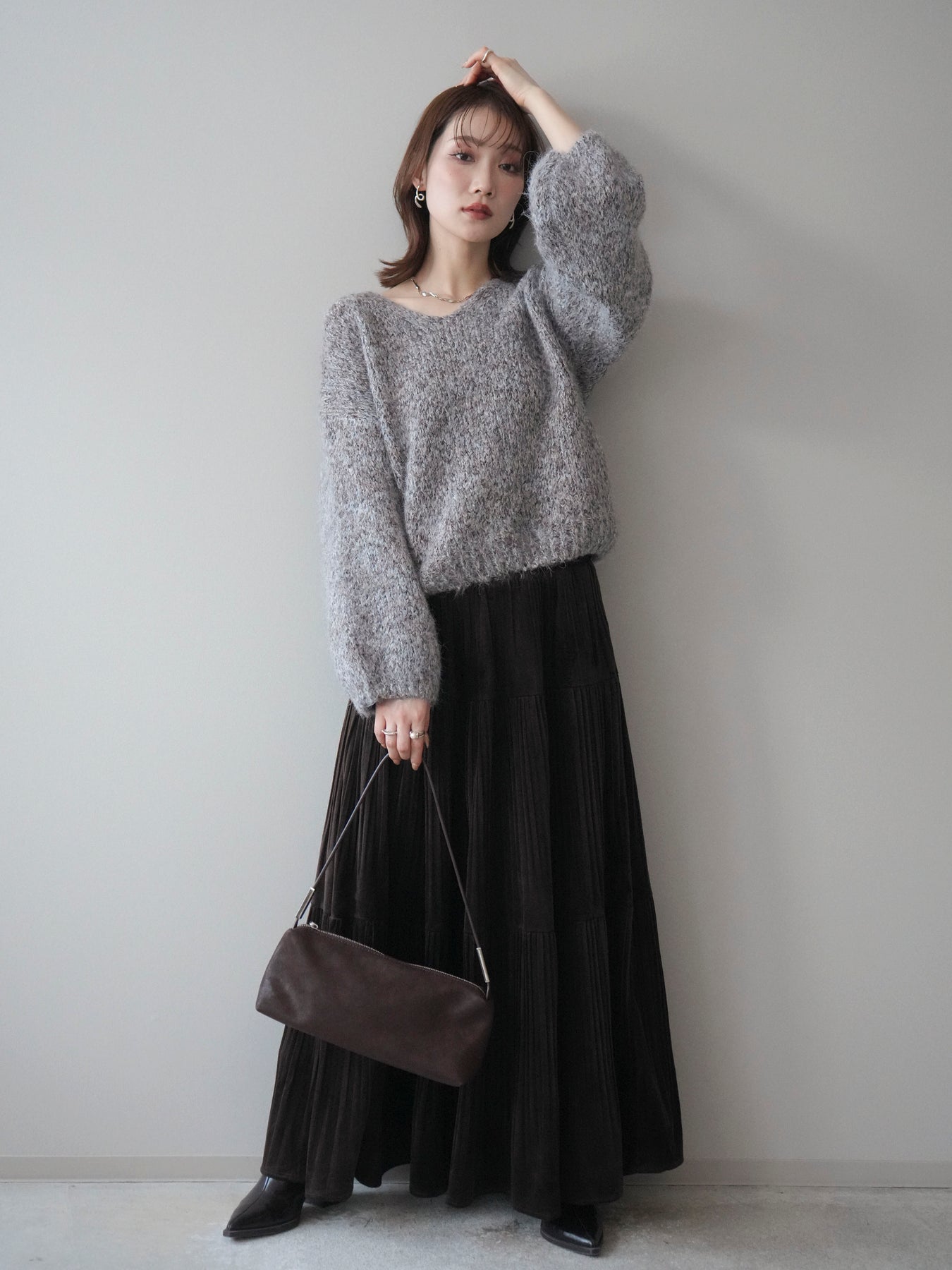 [SET]Vネックミックスヤーンニットプルオーバー+ベロアティアードワッシャースカート(2set)