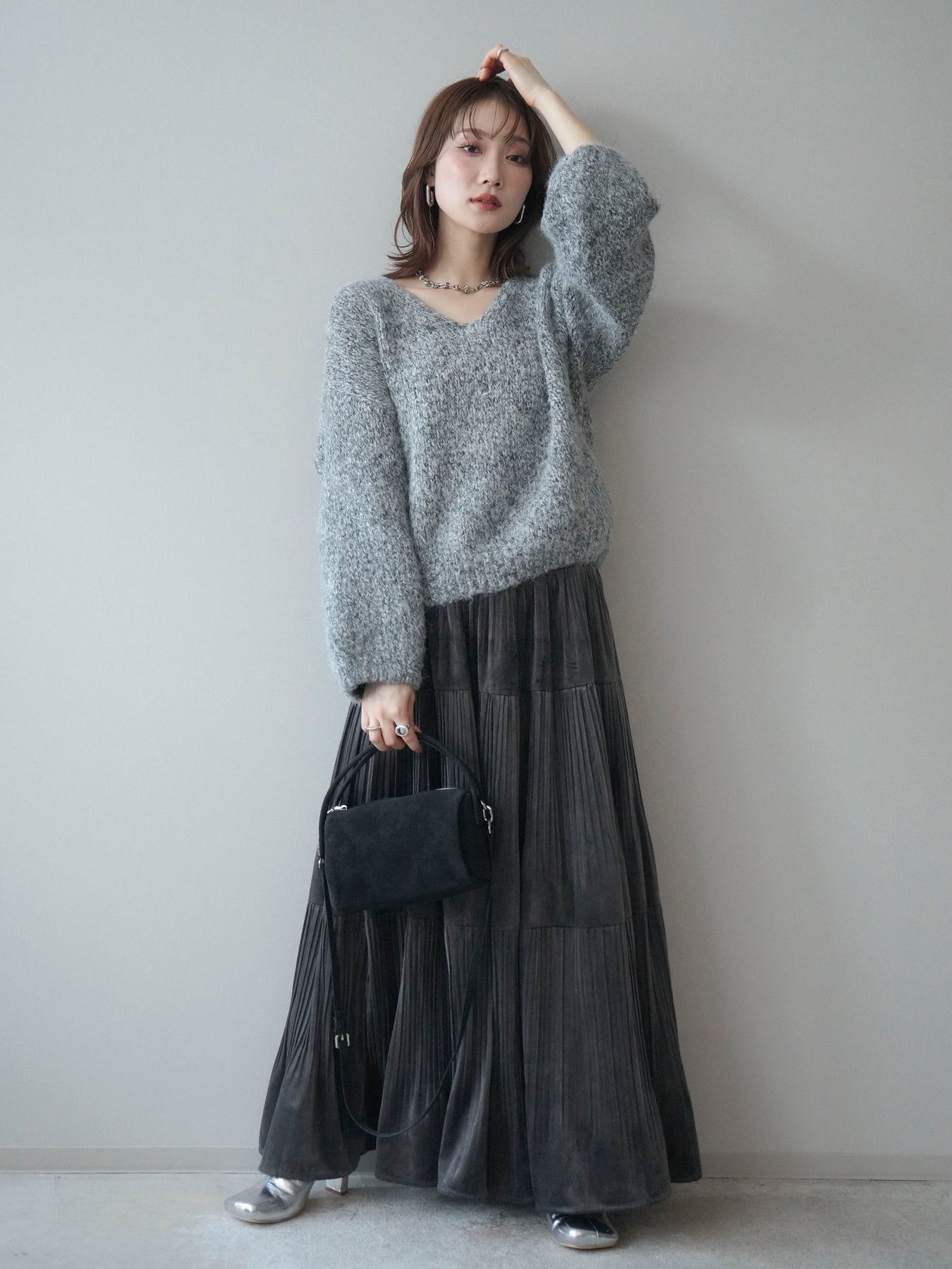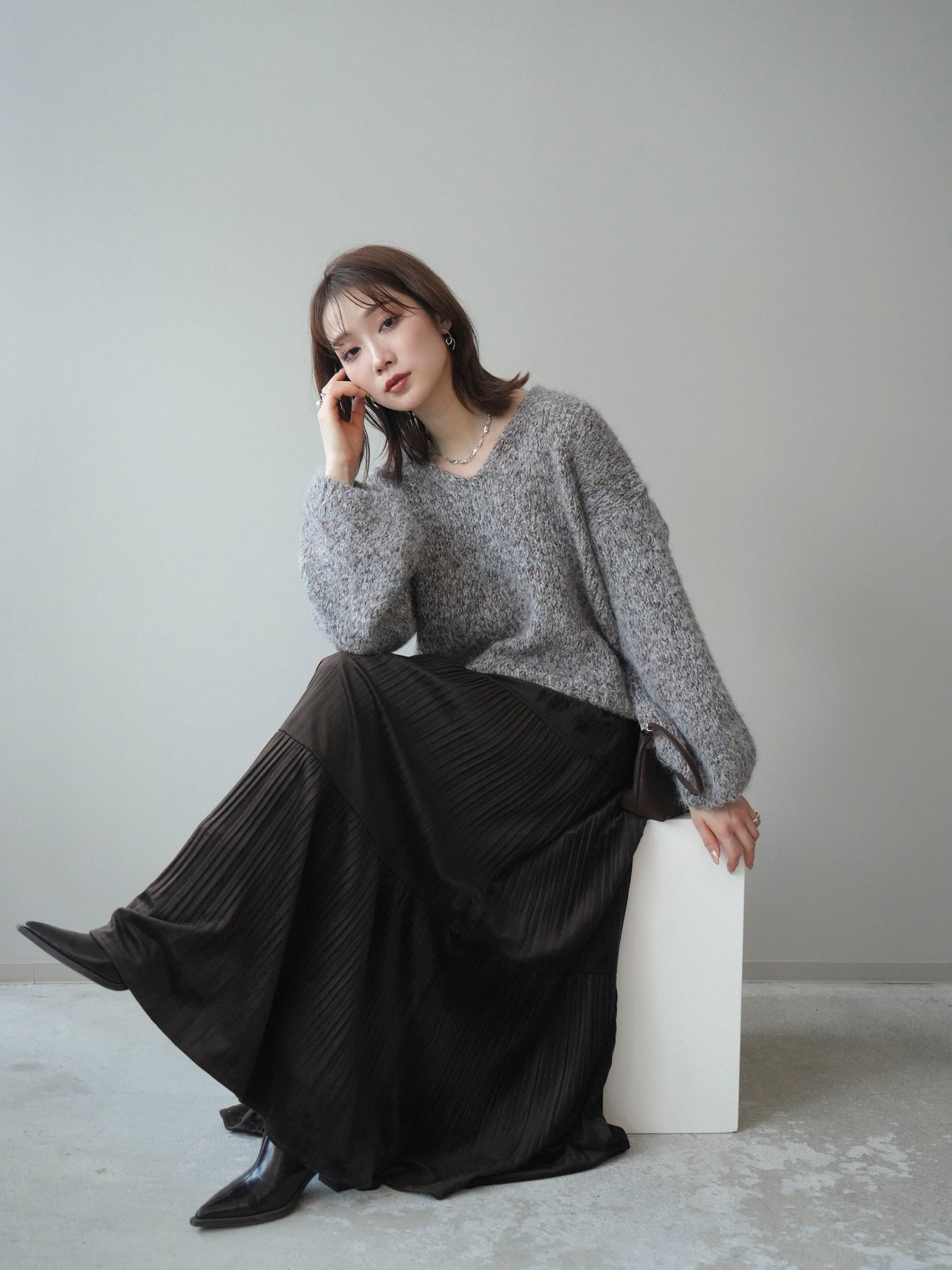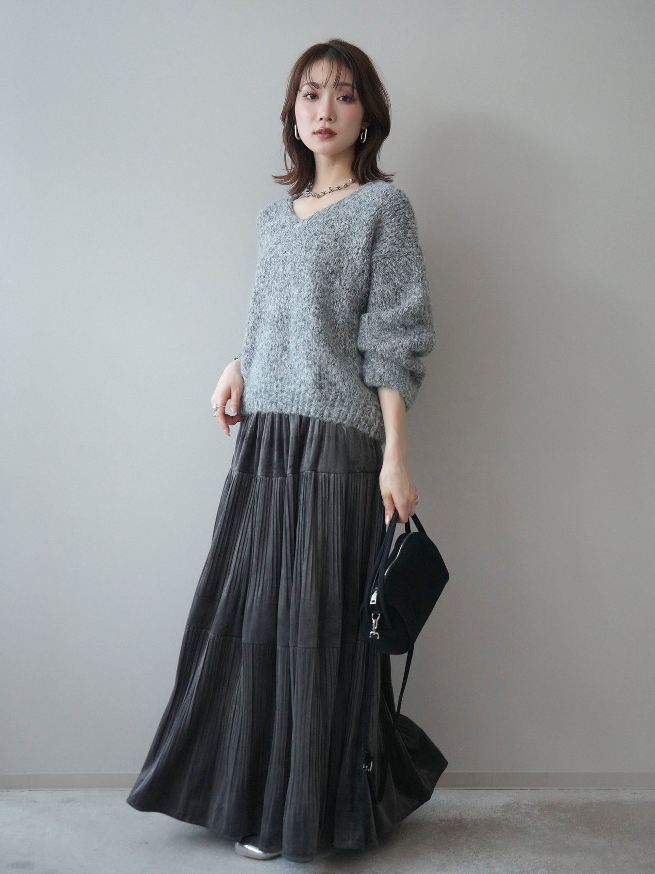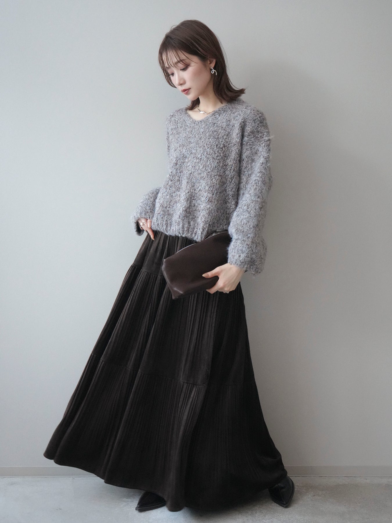[SET]Vネックミックスヤーンニットプルオーバー+ベロアティアードワッシャースカート(2set)