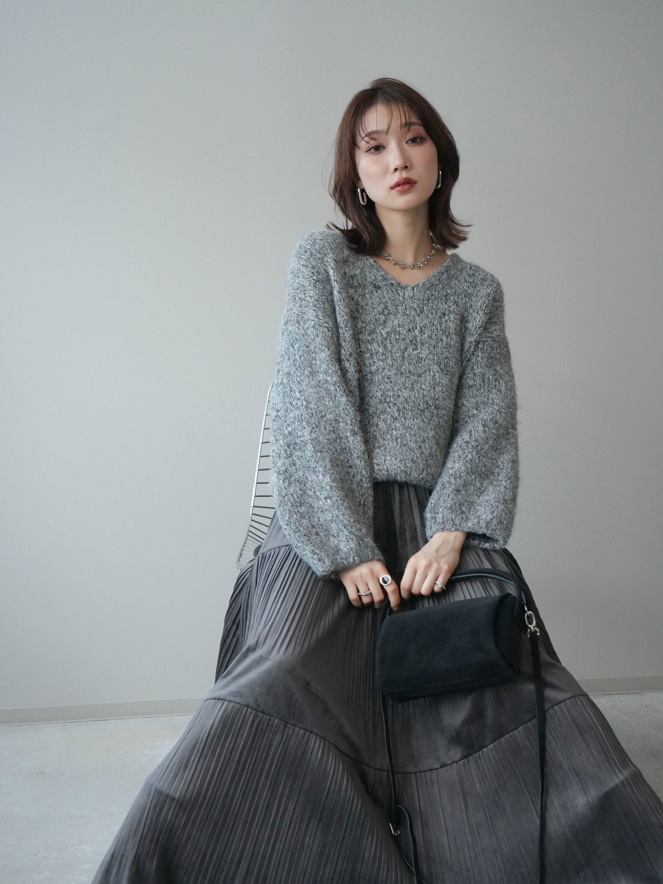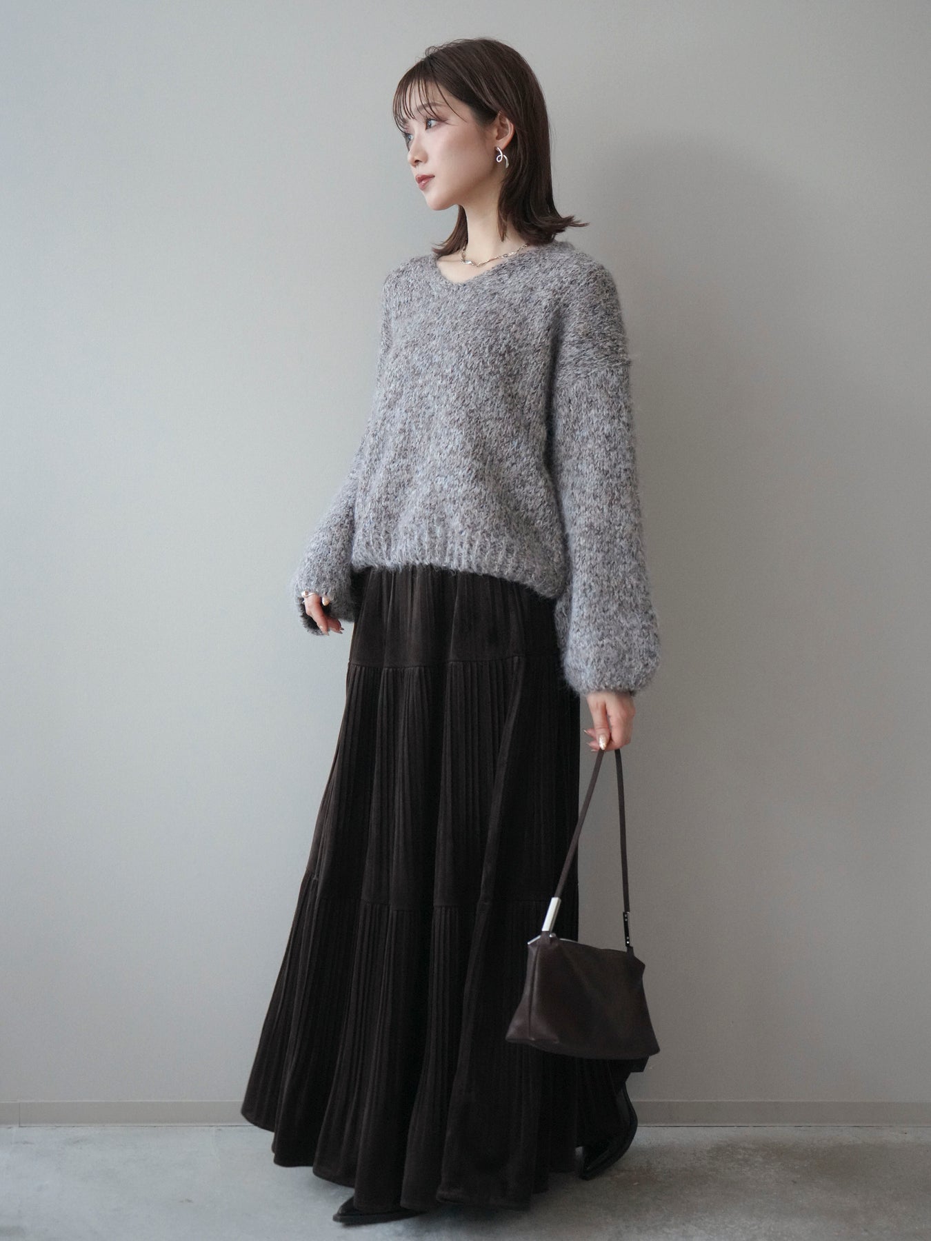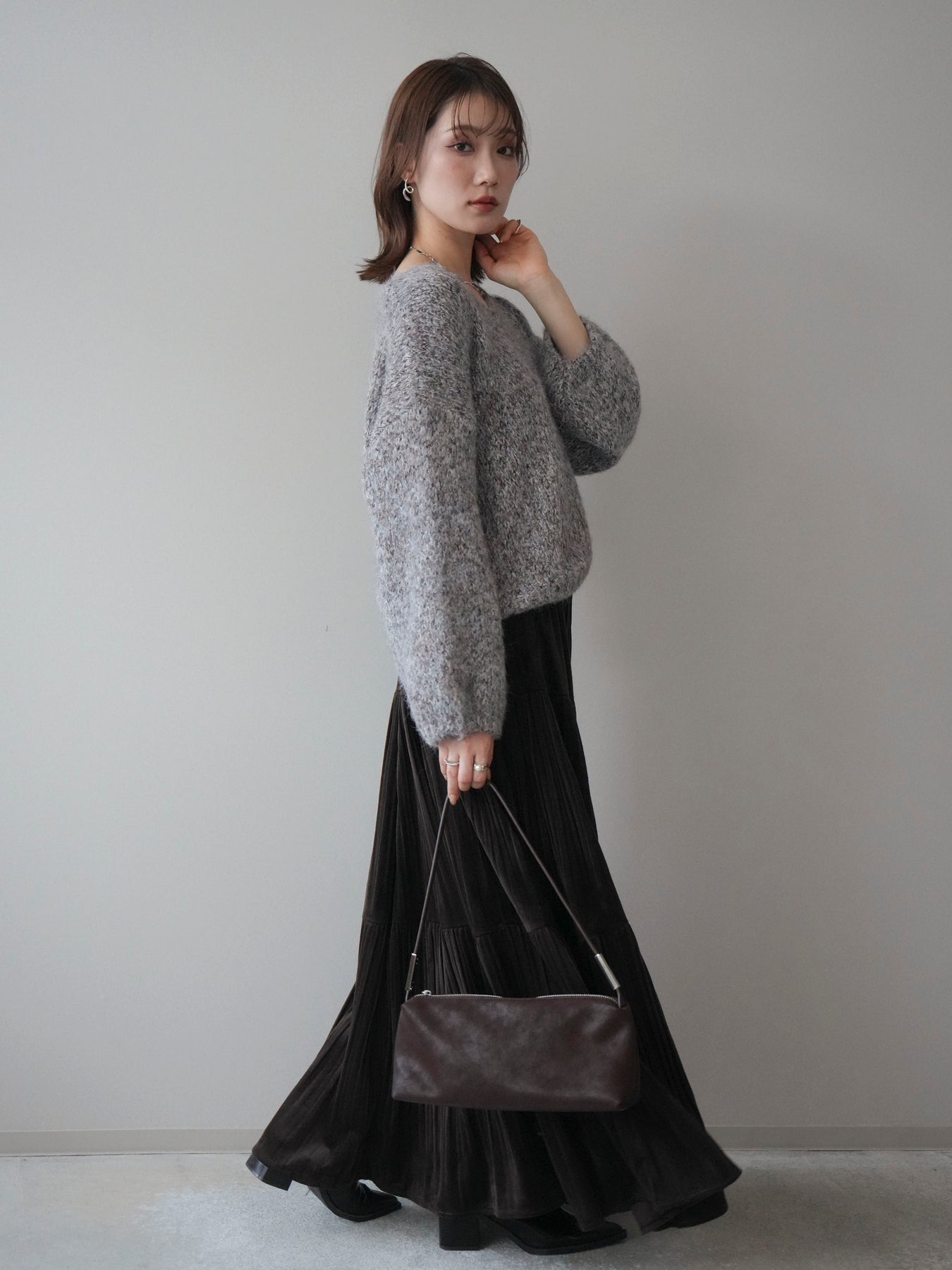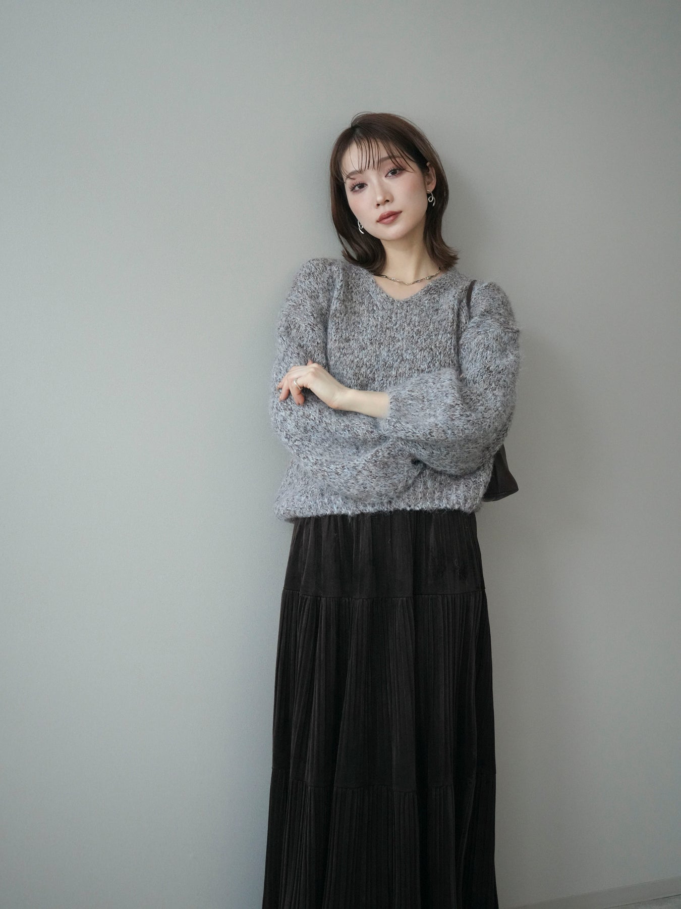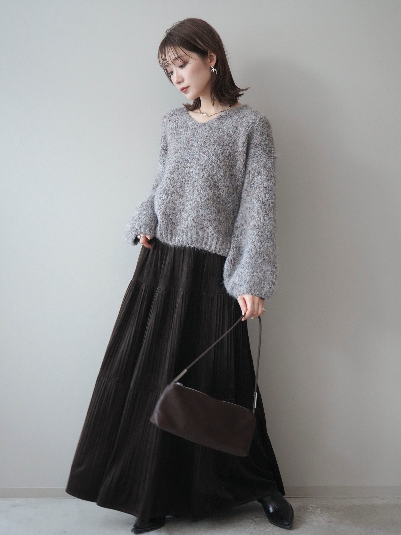 [SET]Vネックミックスヤーンニットプルオーバー+ベロアティアードワッシャースカート(2set)