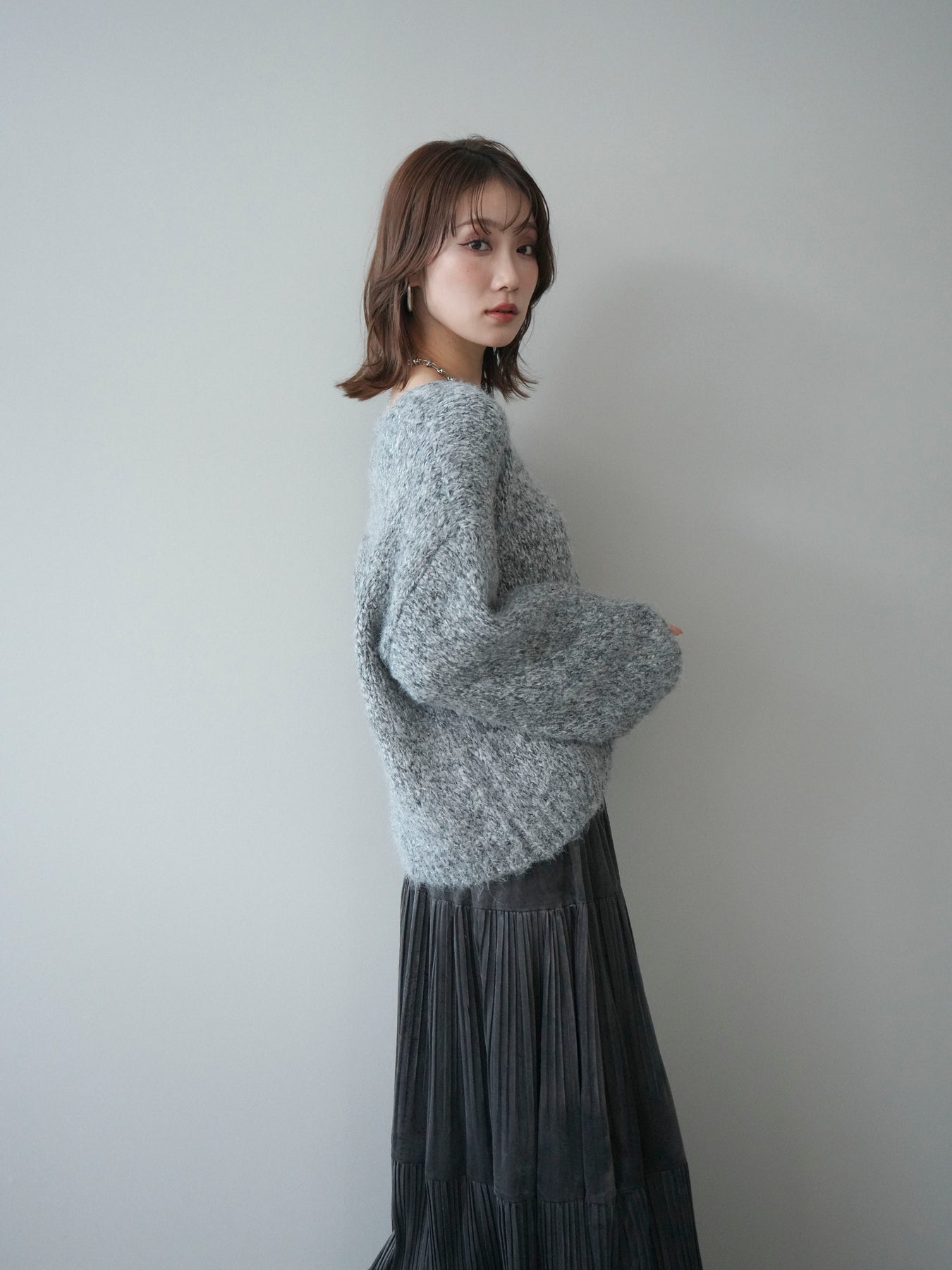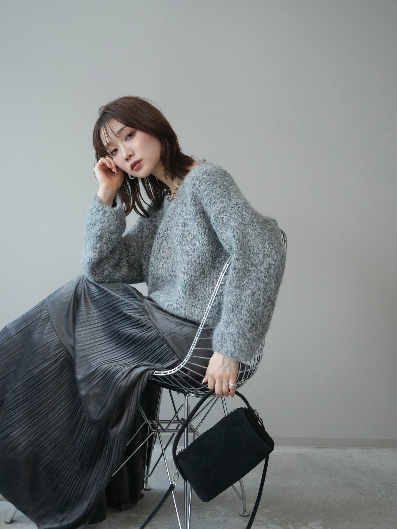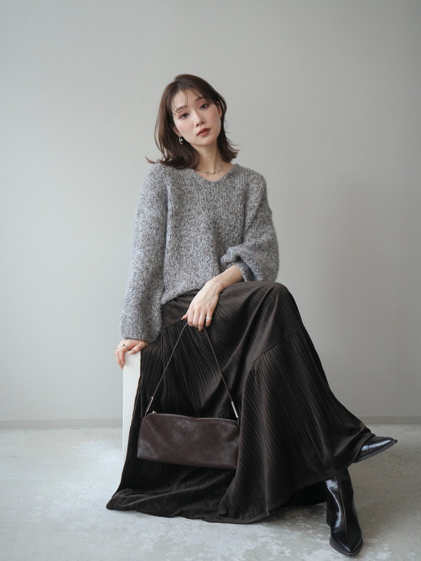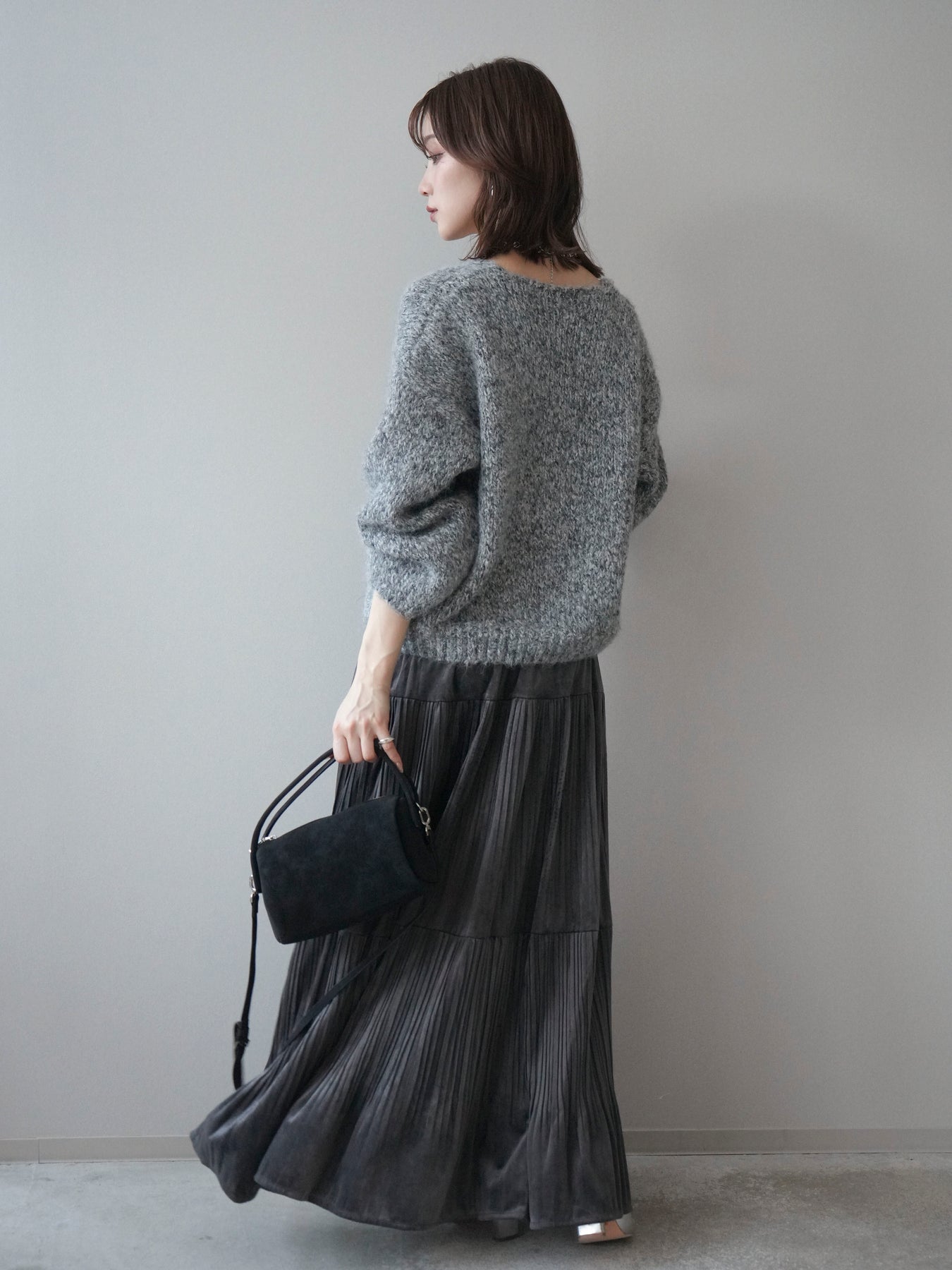 [SET]Vネックミックスヤーンニットプルオーバー+ベロアティアードワッシャースカート(2set)