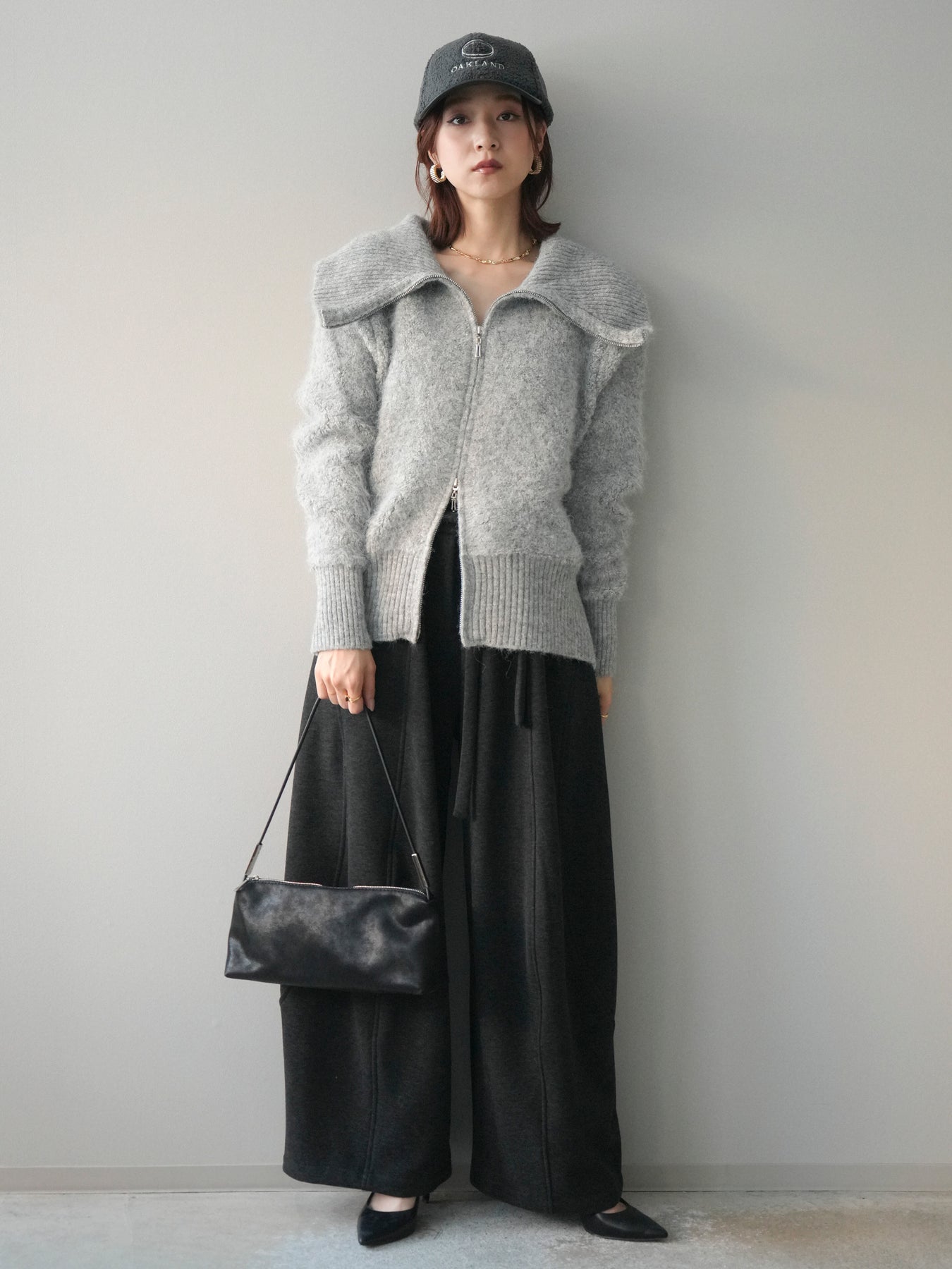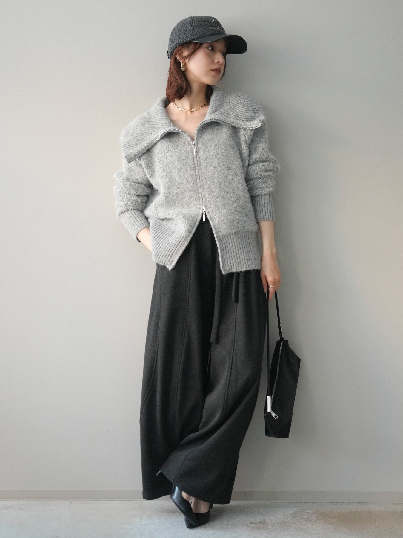 [SET]リブ襟ブークレZIPニットカーディガン+ウエストベルトカーブラインスエットパンツ(2set)