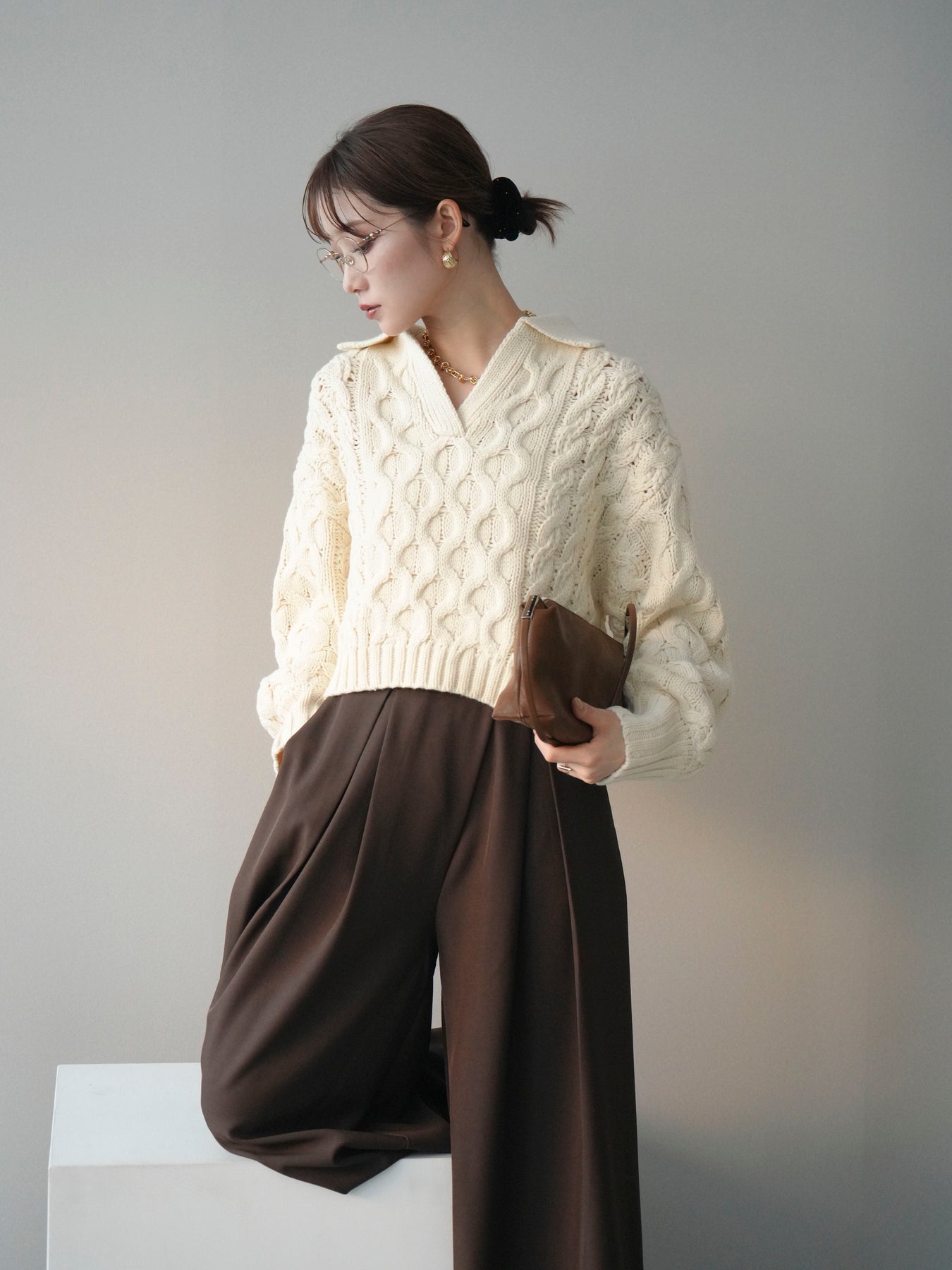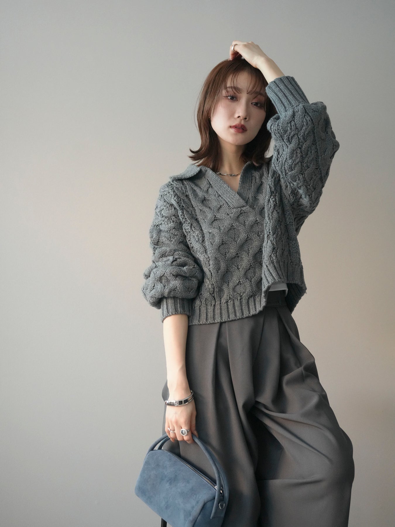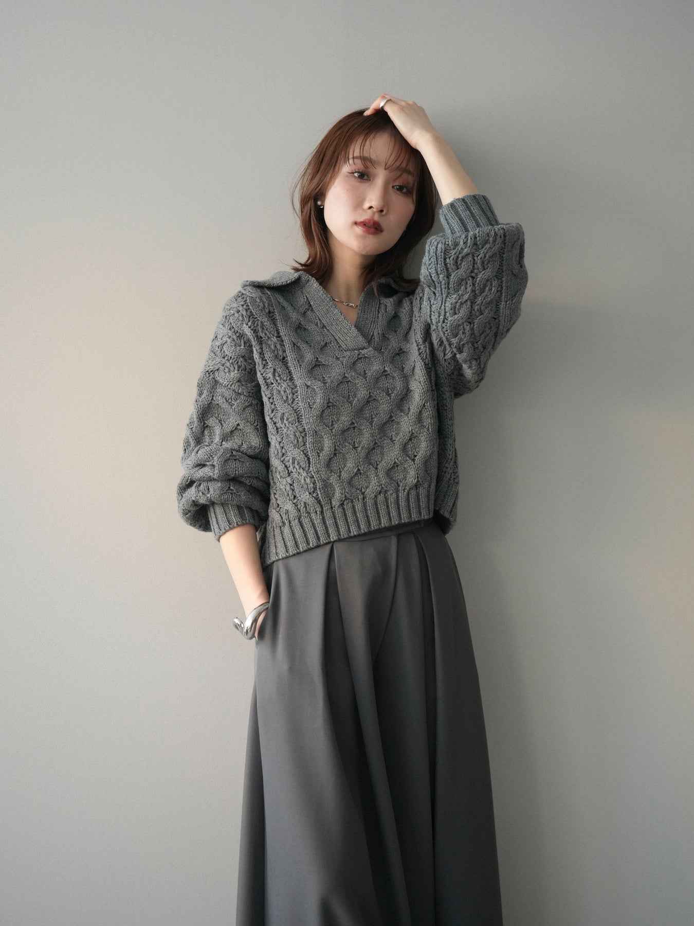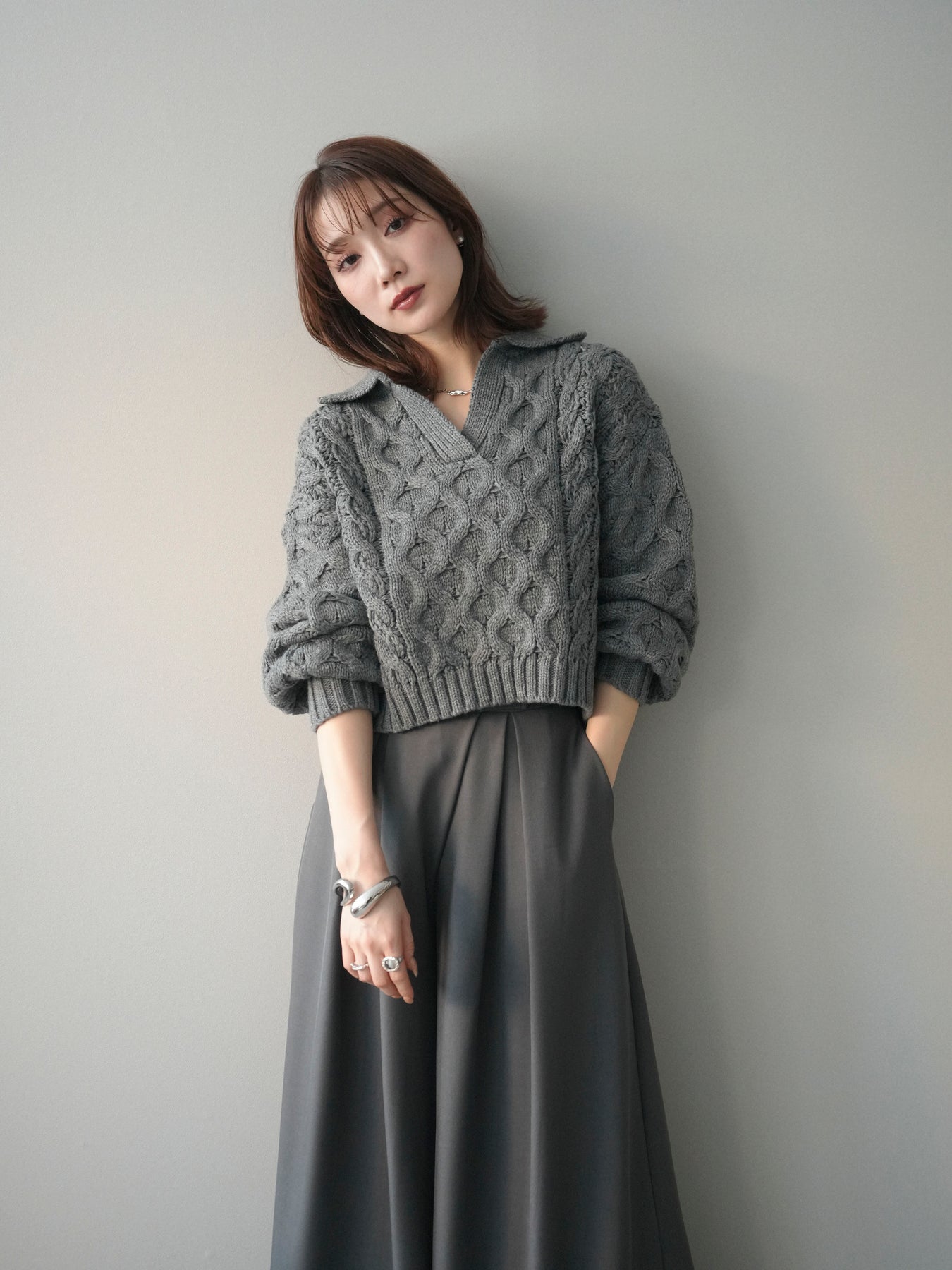 立体感のあるバルキーなケーブル編みが目を引くニットプルオーバー。 表情豊かな編み柄がスタイリングに存在感を与え、シンプルなコーディネートの主役として活躍します。 開襟デザインが程よい抜け感を演出し、重たくなりがちなケーブルニットを軽やかな印象に。 コンパクトな丈感で全体のバランスが取りやすく、パンツにもスカートにも好相性です。 季節感のある素材表情とデザイン性を兼ね備えた、コーディネートを格上げしてくれる一着です。
